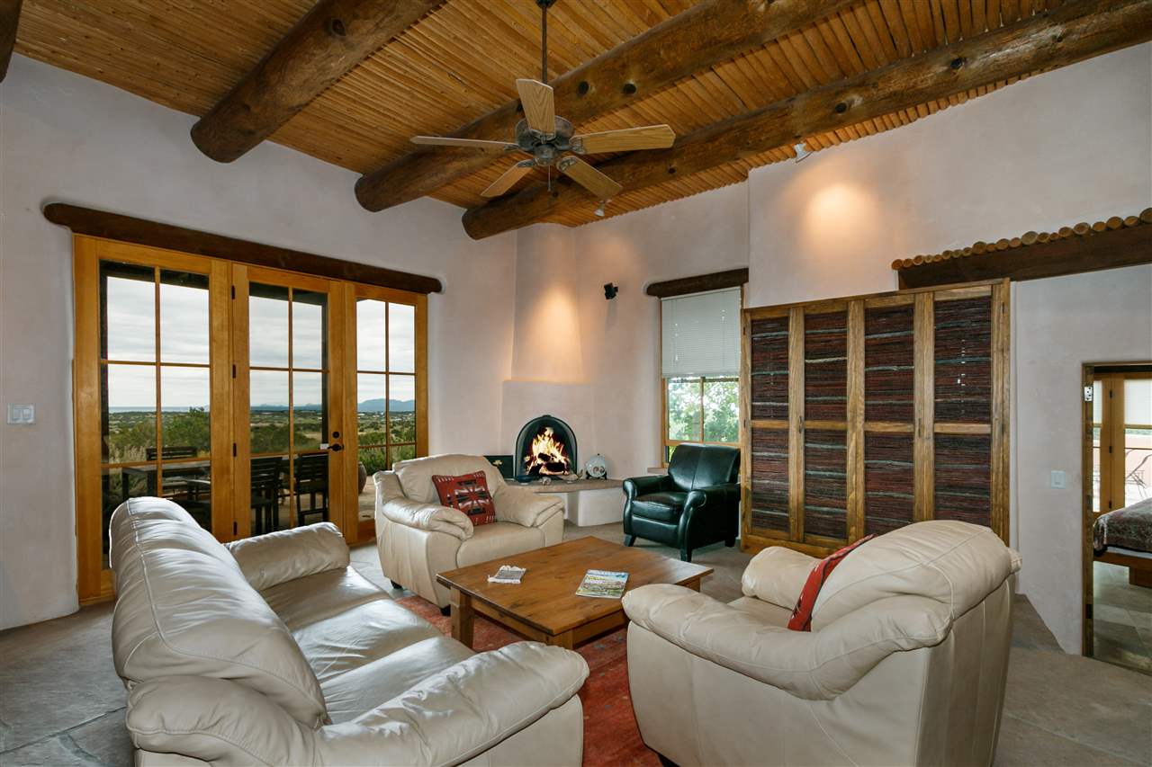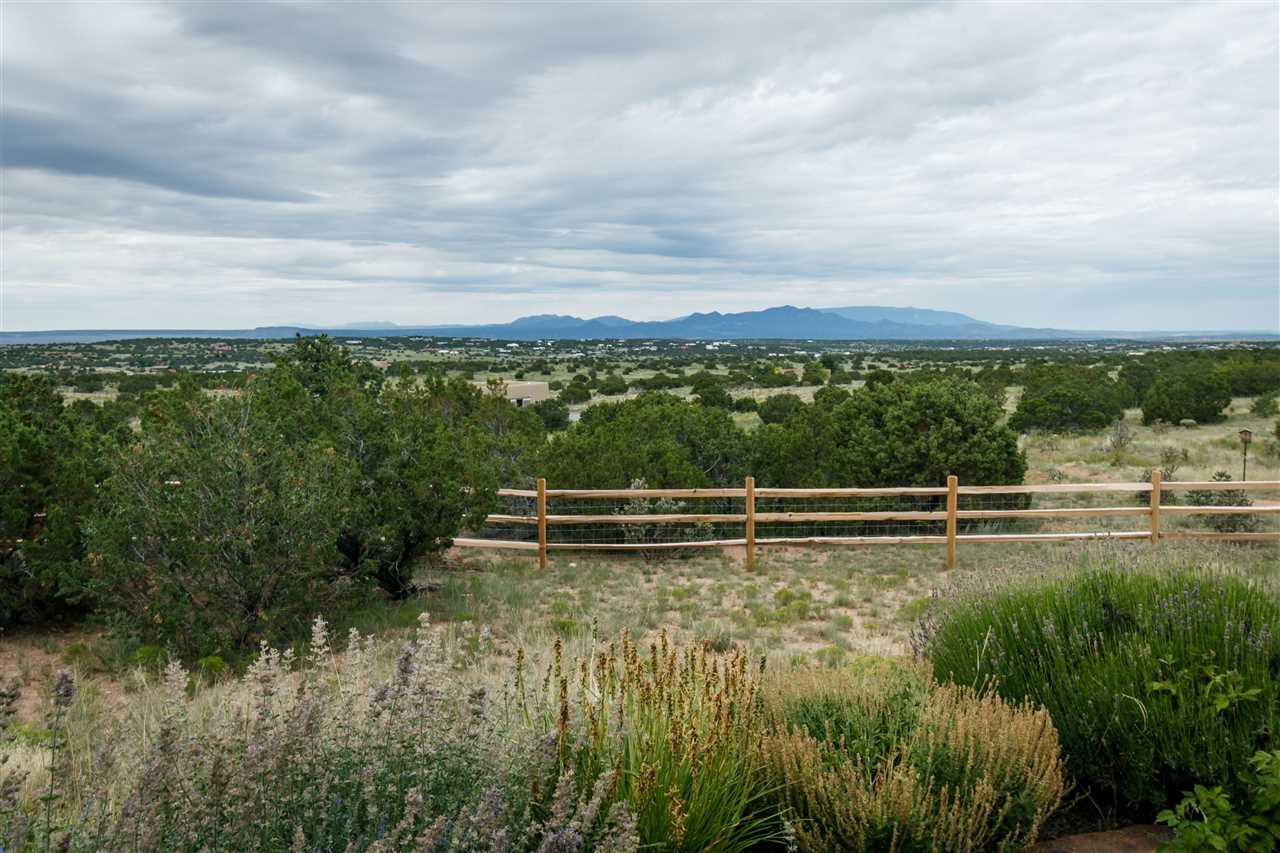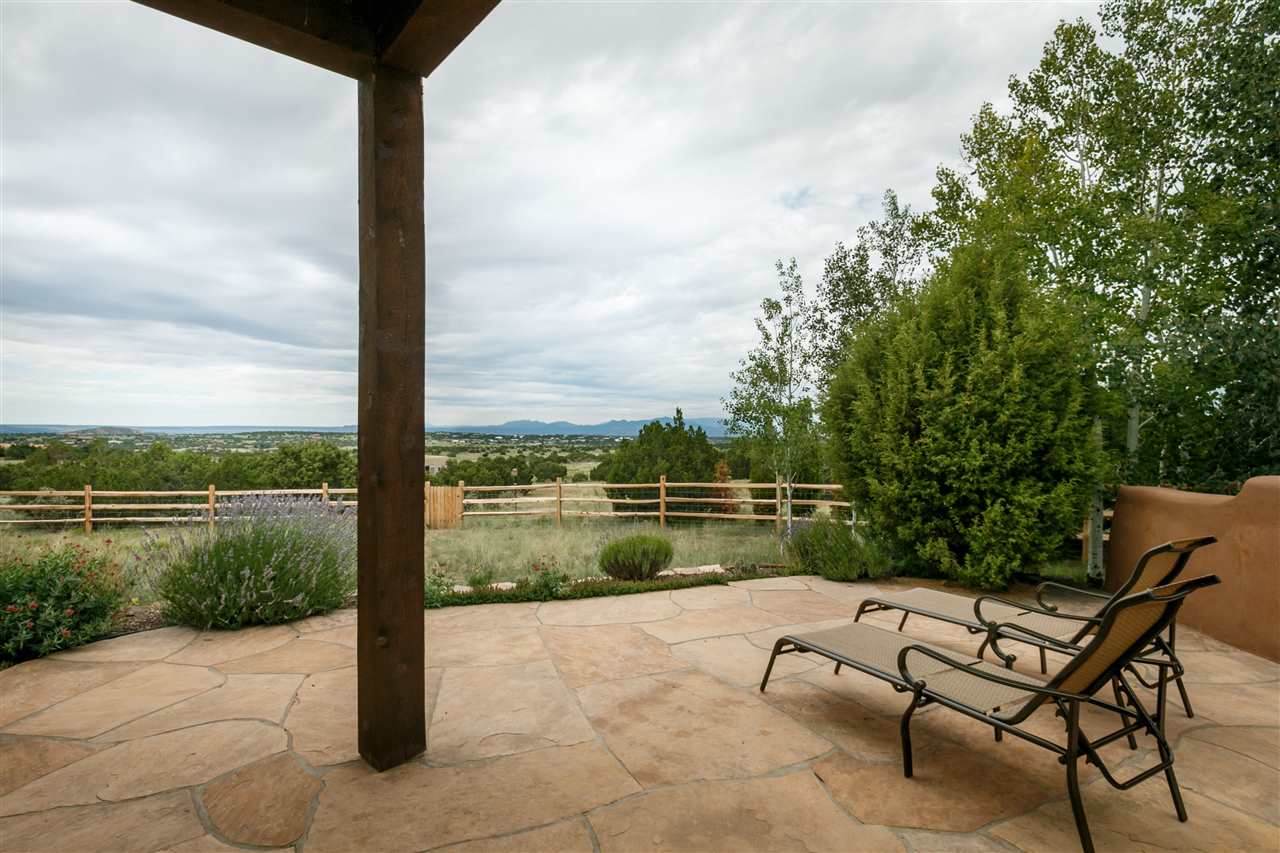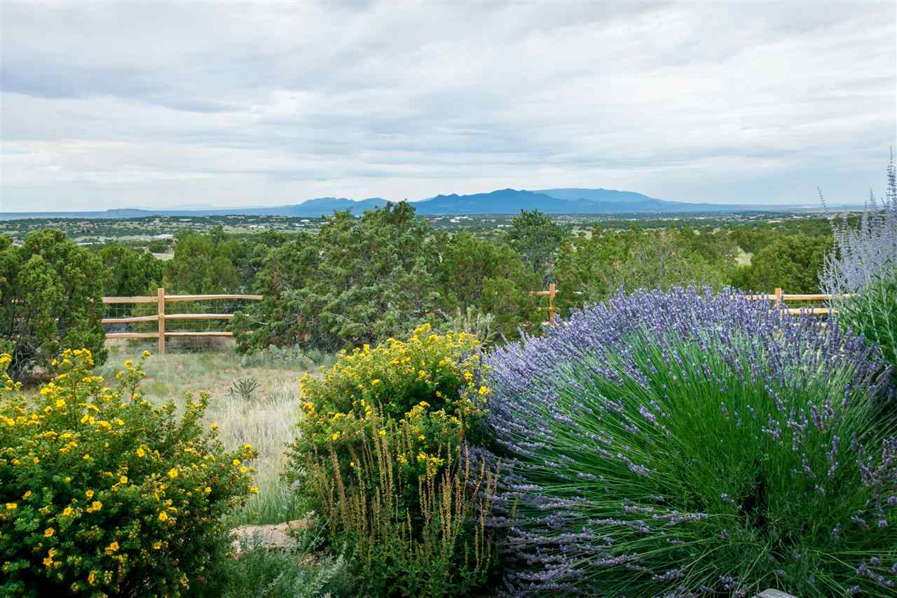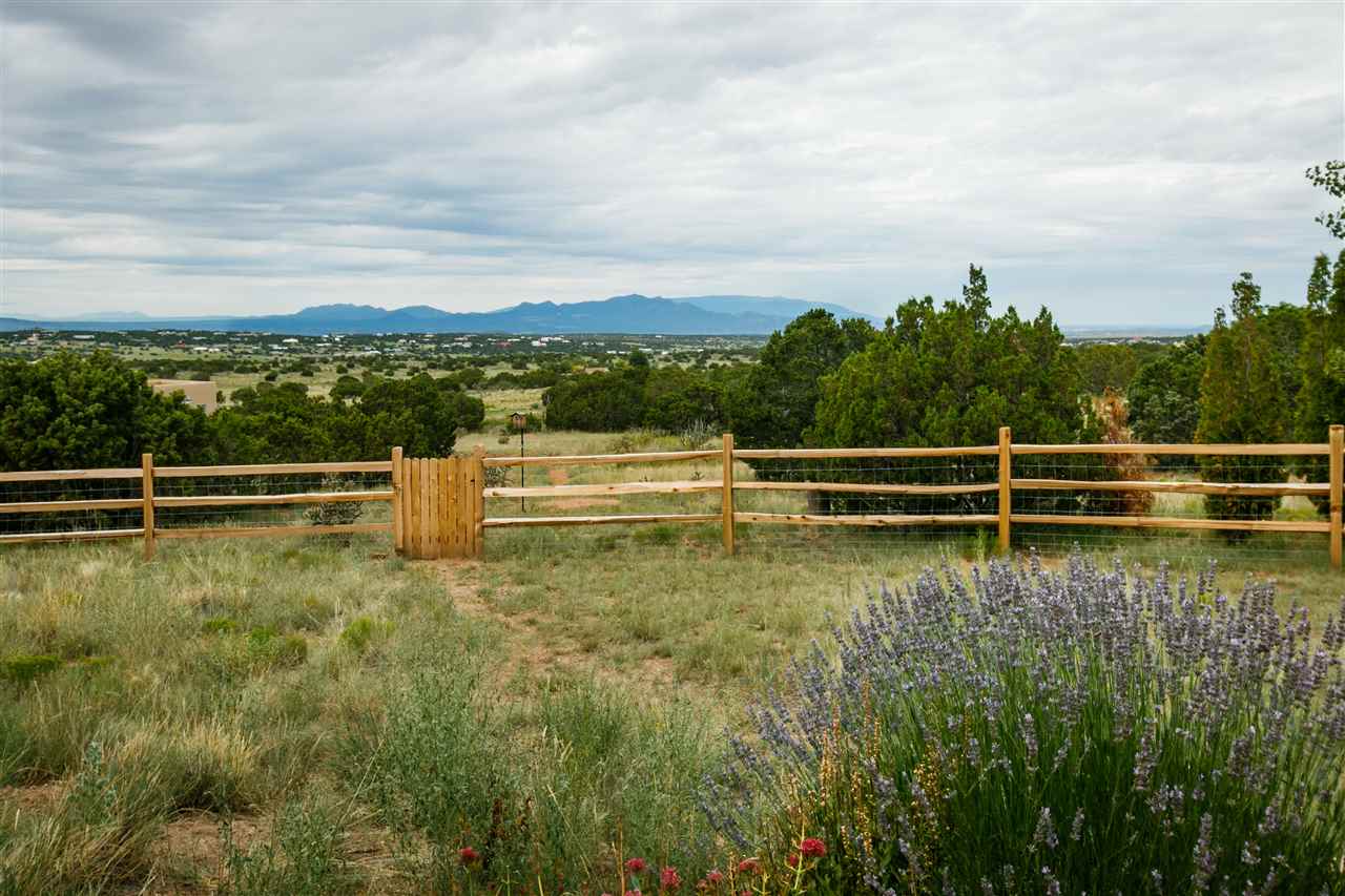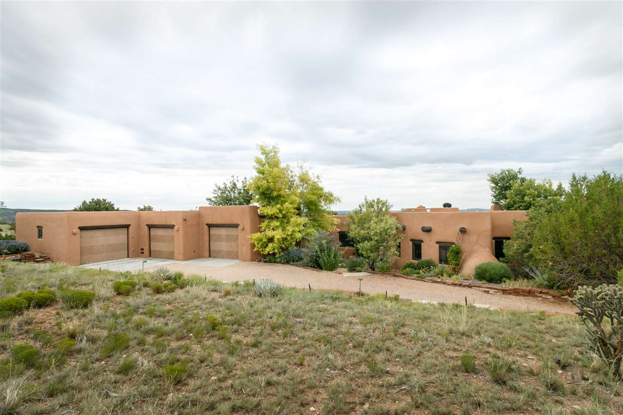 Situated high on a 5 acre lot overlooking incredible mountain views is this lovely custom design by Stephen Merdler a renowned Santa Fe architect. Every angle delights the eye every room beautifully finished. A curvaceous, landscaped Anasazi wall by Michael Herns and kiva fireplace in the living room, travertine tiles and Colorado slate floors throughout, Brazilian wood bathroom countertops, cherry kitchen cabinets, 3 fireplaces, diamond plaster walls and viga beam ceilings. Professionally landscaped gardens with 4 portals, plus a large flagstone patio for outside dining with stunning views! A heated 3 car garage with a built in safe & private portal, plenty of room for one to be a studio. Horses are welcome here, and only minutes to local shopping or Santa Fe.