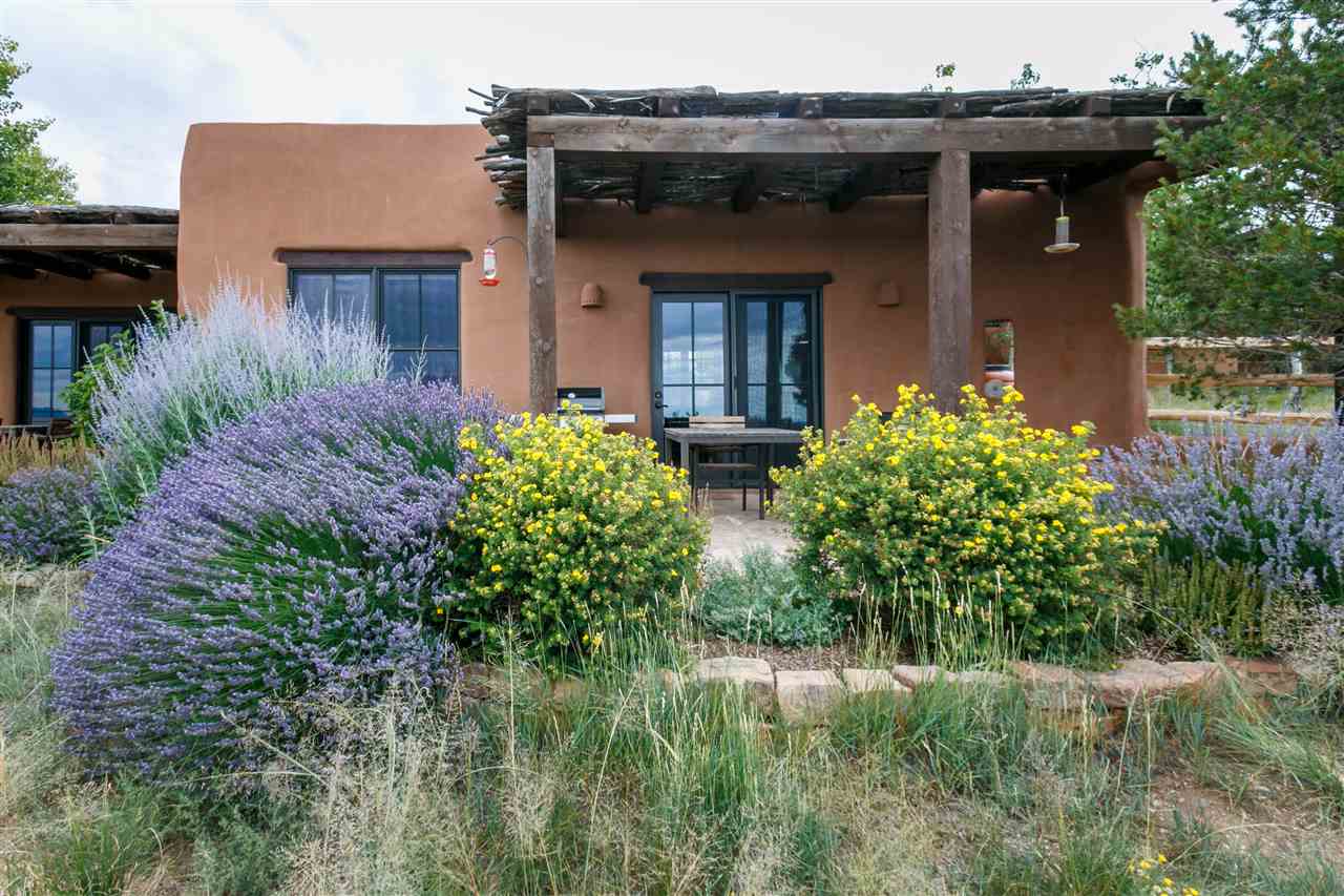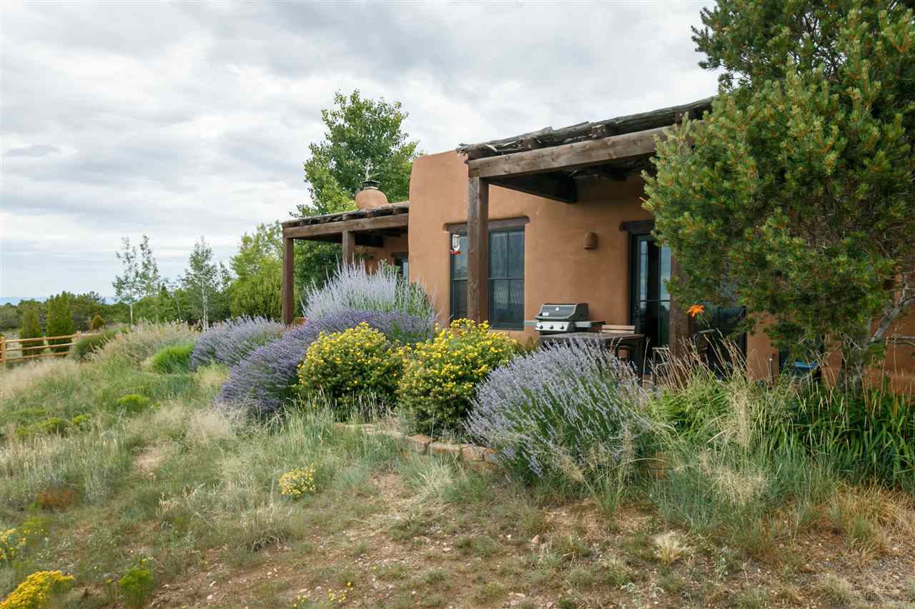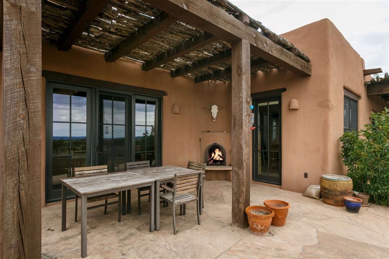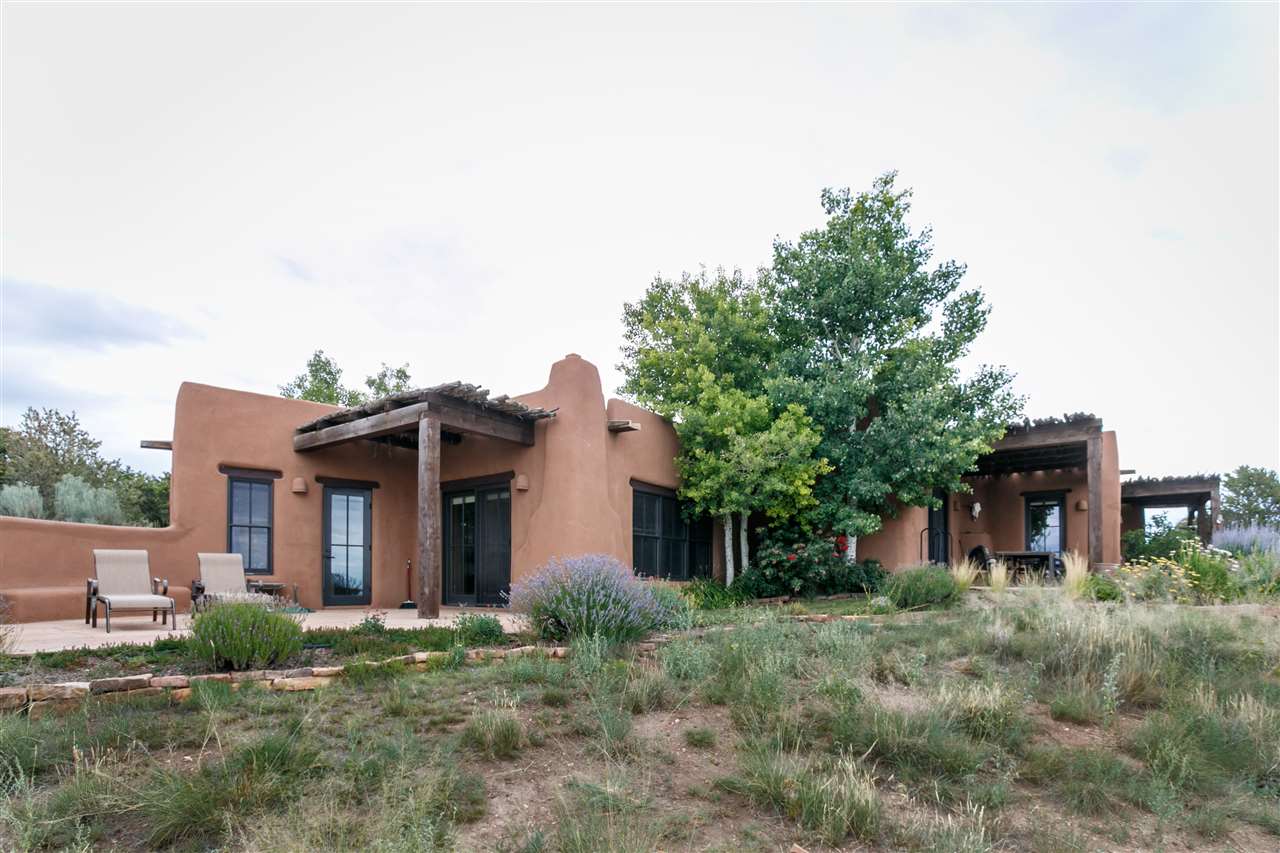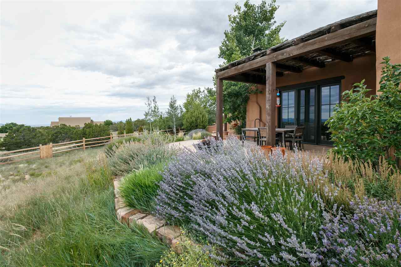Situated high on a 5 acre lot overlooking incredible mountain views is this lovely custom design by Stephen Merdler a renowned Santa Fe architect. Every angle delights the eye every room beautifully finished. A curvaceous, landscaped Anasazi wall by Michael Herns and kiva fireplace in the living room, travertine tiles and Colorado slate floors throughout, Brazilian wood bathroom countertops, cherry kitchen cabinets, 3 fireplaces, diamond plaster walls and viga beam ceilings. Professionally landscaped gardens with 4 portals, plus a large flagstone patio for outside dining with stunning views! A heated 3 car garage with a built in safe & private portal, plenty of room for one to be a studio. Horses are welcome here, and only minutes to local shopping or Santa Fe.
