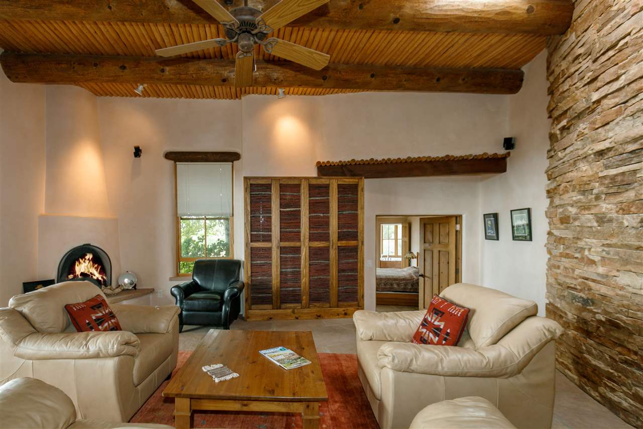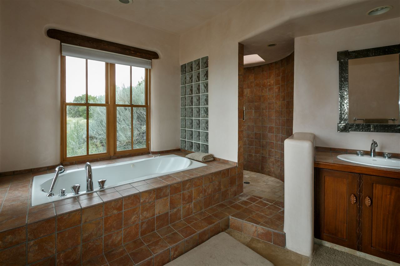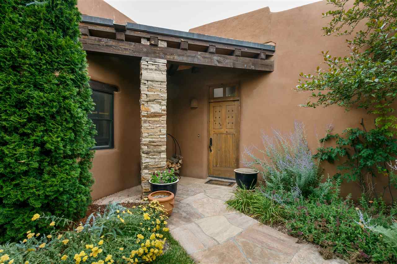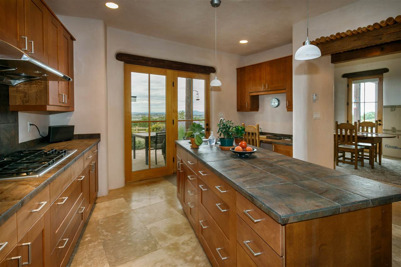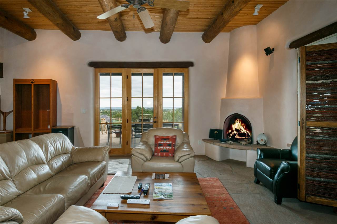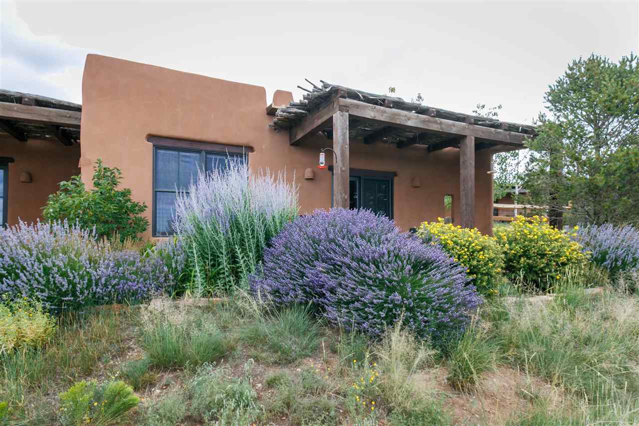 Situated high on a 5 acre lot overlooking incredible mountain views is this lovely custom design by Stephen Merdler a renowned Santa Fe architect. Every angle delights the eye every room beautifully finished. A curvaceous, landscaped Anasazi wall by Michael Herns and kiva fireplace in the living room, travertine tiles and Colorado slate floors throughout, Brazilian wood bathroom countertops, cherry kitchen cabinets, 3 fireplaces, diamond plaster walls and viga beam ceilings. Professionally landscaped gardens with 4 portals, plus a large flagstone patio for outside dining with stunning views! A heated 3 car garage with a built in safe & private portal, plenty of room for one to be a studio. Horses are welcome here, and only minutes to local shopping or Santa Fe.