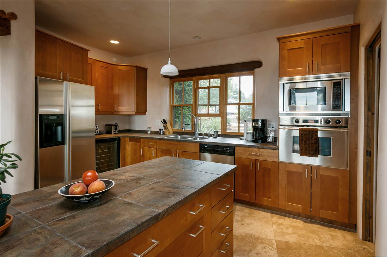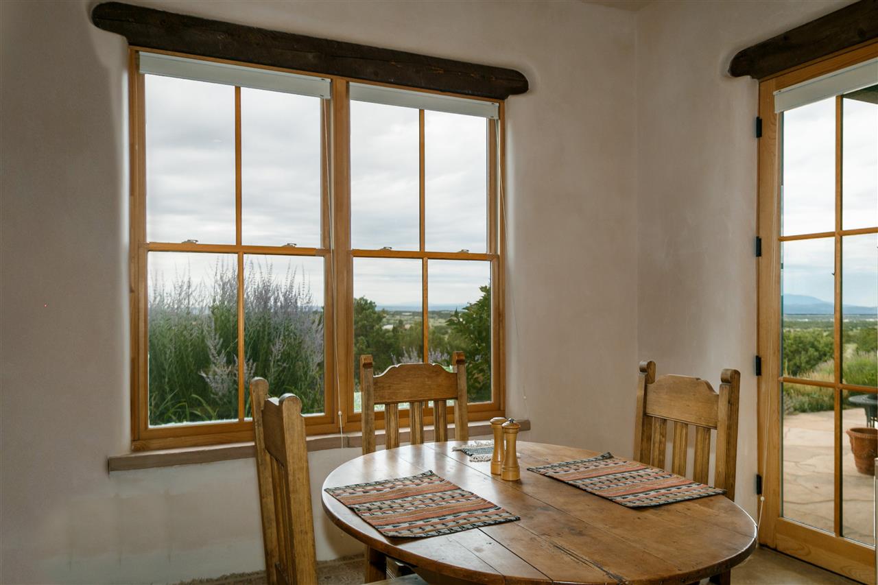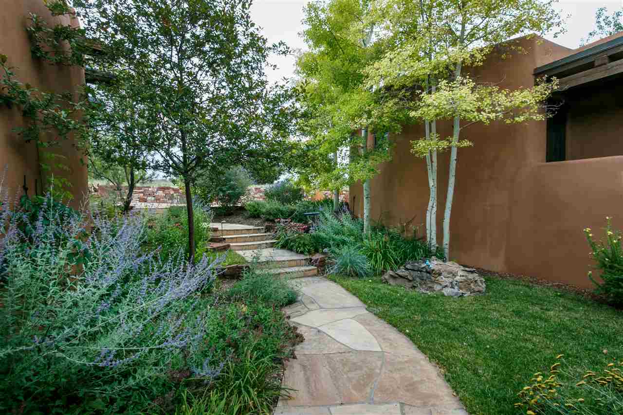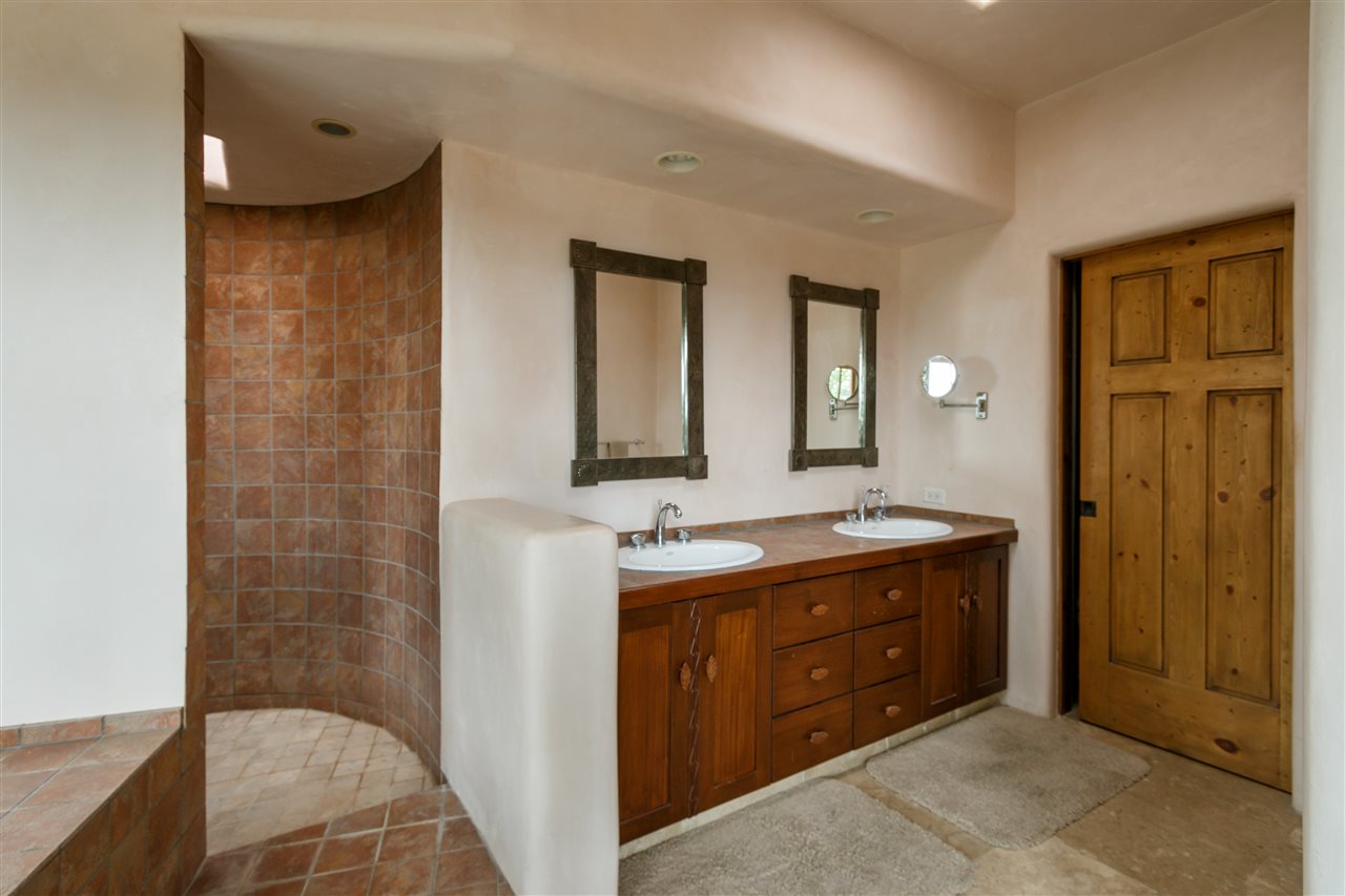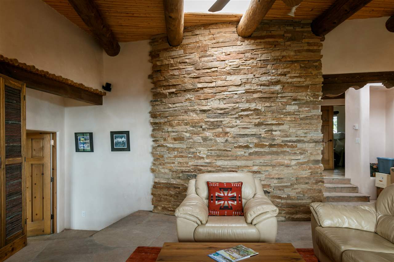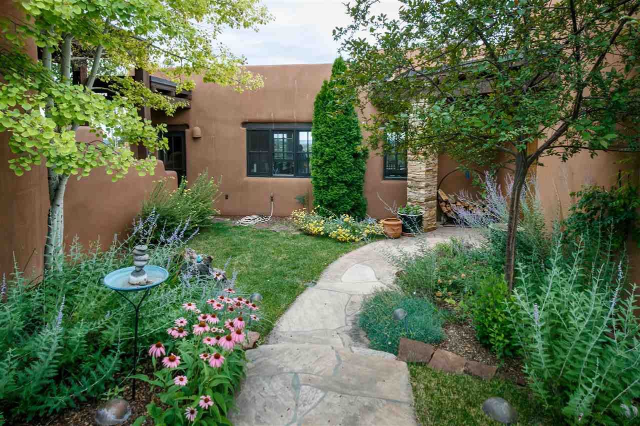 Situated high on a 5 acre lot overlooking incredible mountain views is this lovely custom design by Stephen Merdler a renowned Santa Fe architect. Every angle delights the eye every room beautifully finished. A curvaceous, landscaped Anasazi wall by Michael Herns and kiva fireplace in the living room, travertine tiles and Colorado slate floors throughout, Brazilian wood bathroom countertops, cherry kitchen cabinets, 3 fireplaces, diamond plaster walls and viga beam ceilings. Professionally landscaped gardens with 4 portals, plus a large flagstone patio for outside dining with stunning views! A heated 3 car garage with a built in safe & private portal, plenty of room for one to be a studio. Horses are welcome here, and only minutes to local shopping or Santa Fe.