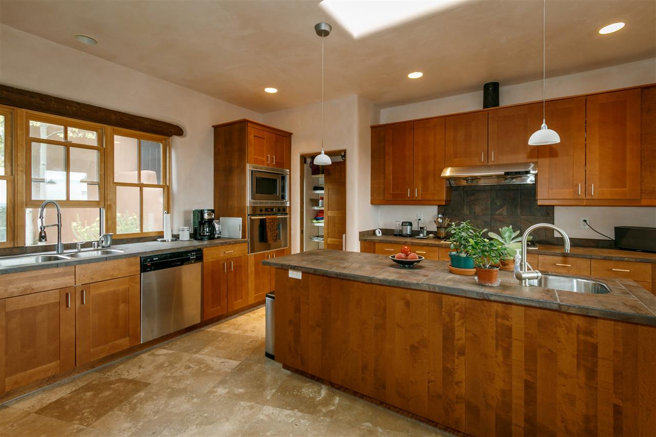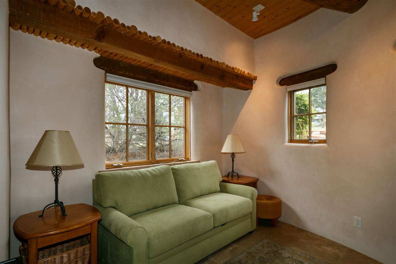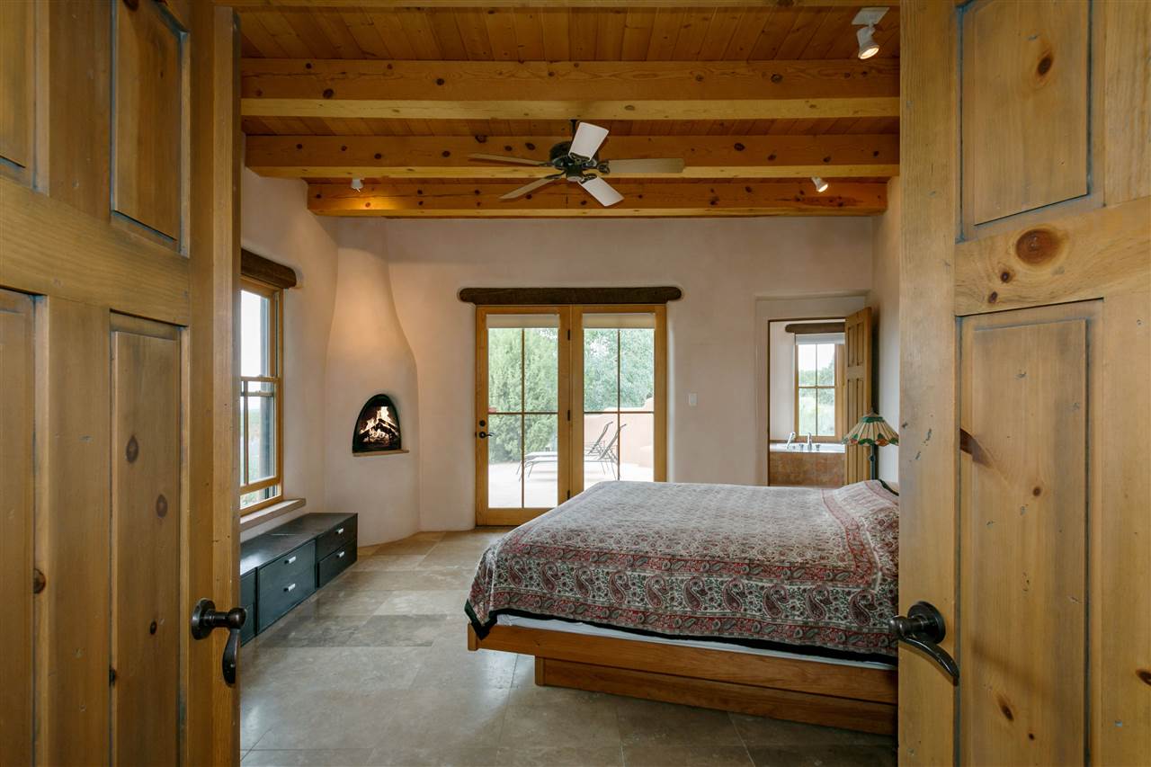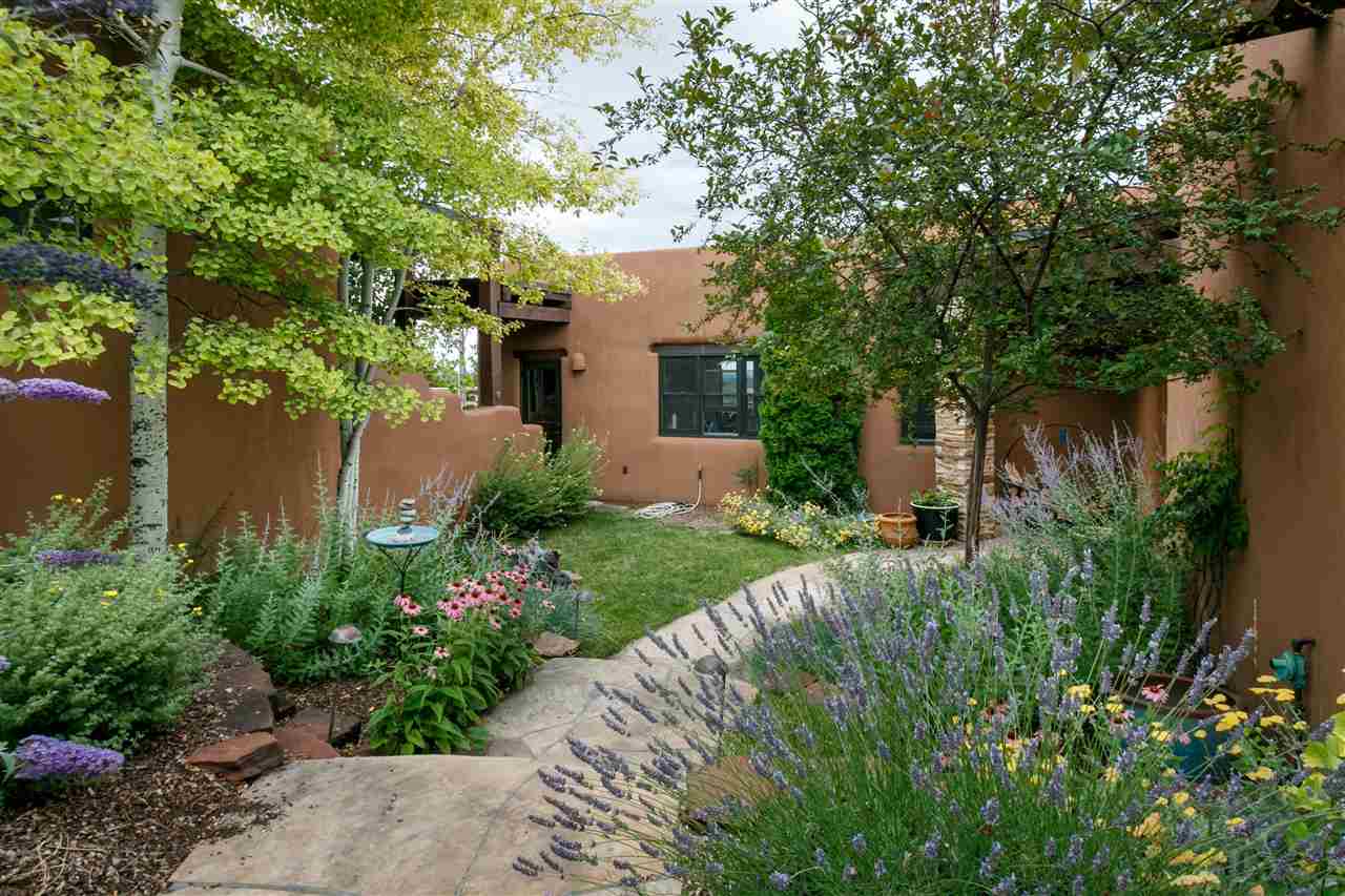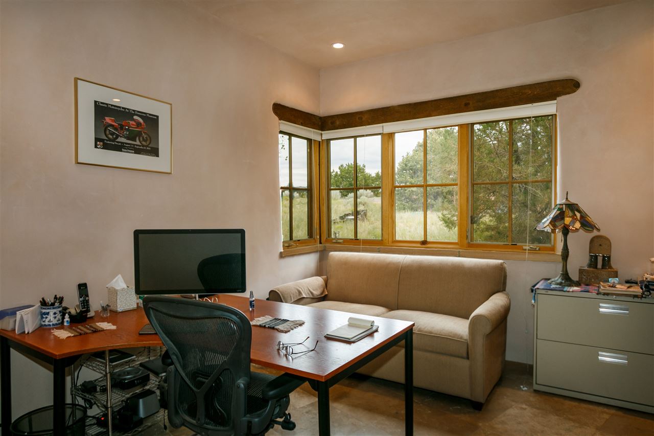 Situated high on a 5 acre lot overlooking incredible mountain views is this lovely custom design by Stephen Merdler a renowned Santa Fe architect. Every angle delights the eye every room beautifully finished. A curvaceous, landscaped Anasazi wall by Michael Herns and kiva fireplace in the living room, travertine tiles and Colorado slate floors throughout, Brazilian wood bathroom countertops, cherry kitchen cabinets, 3 fireplaces, diamond plaster walls and viga beam ceilings. Professionally landscaped gardens with 4 portals, plus a large flagstone patio for outside dining with stunning views! A heated 3 car garage with a built in safe & private portal, plenty of room for one to be a studio. Horses are welcome here, and only minutes to local shopping or Santa Fe.