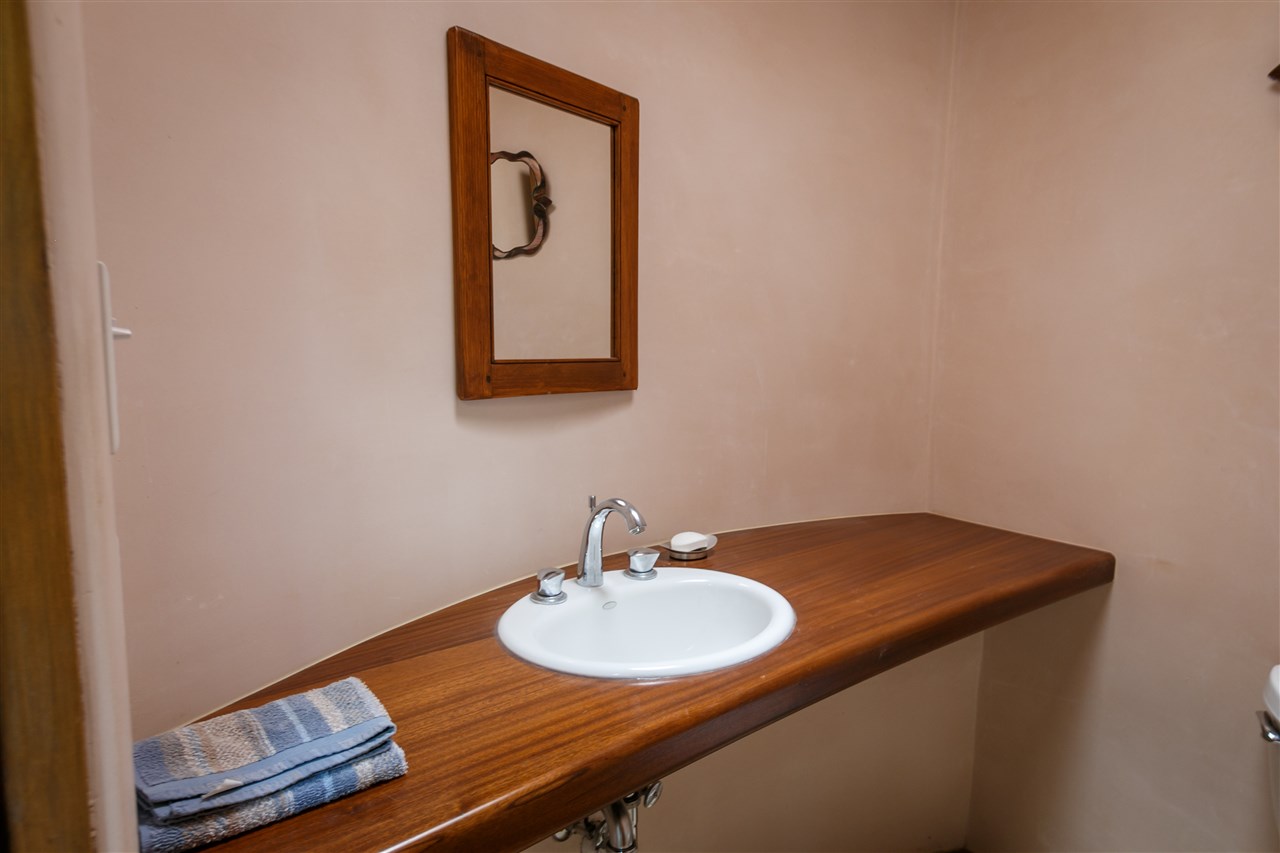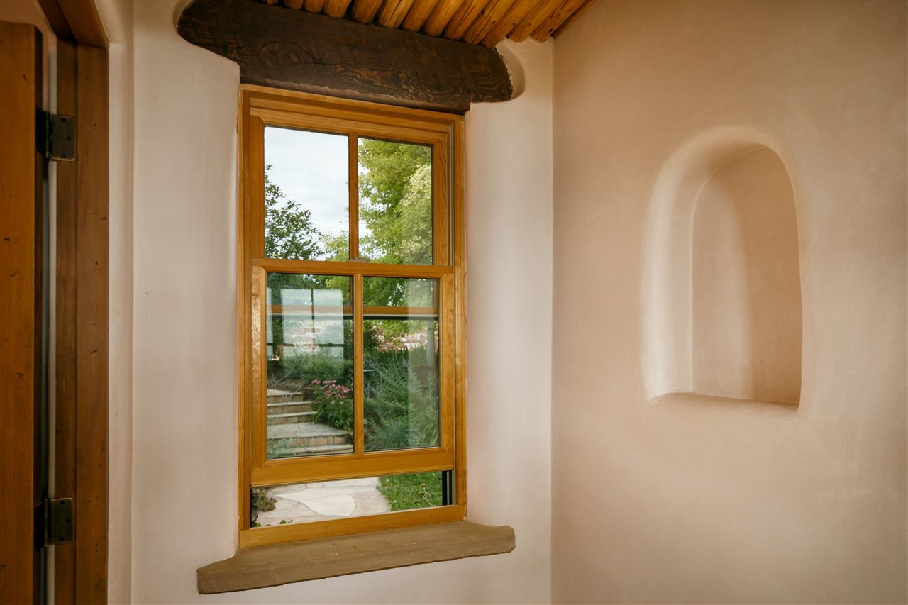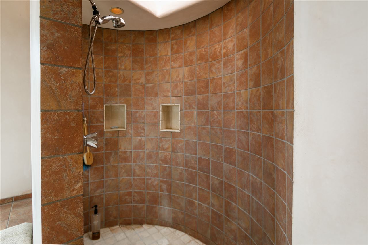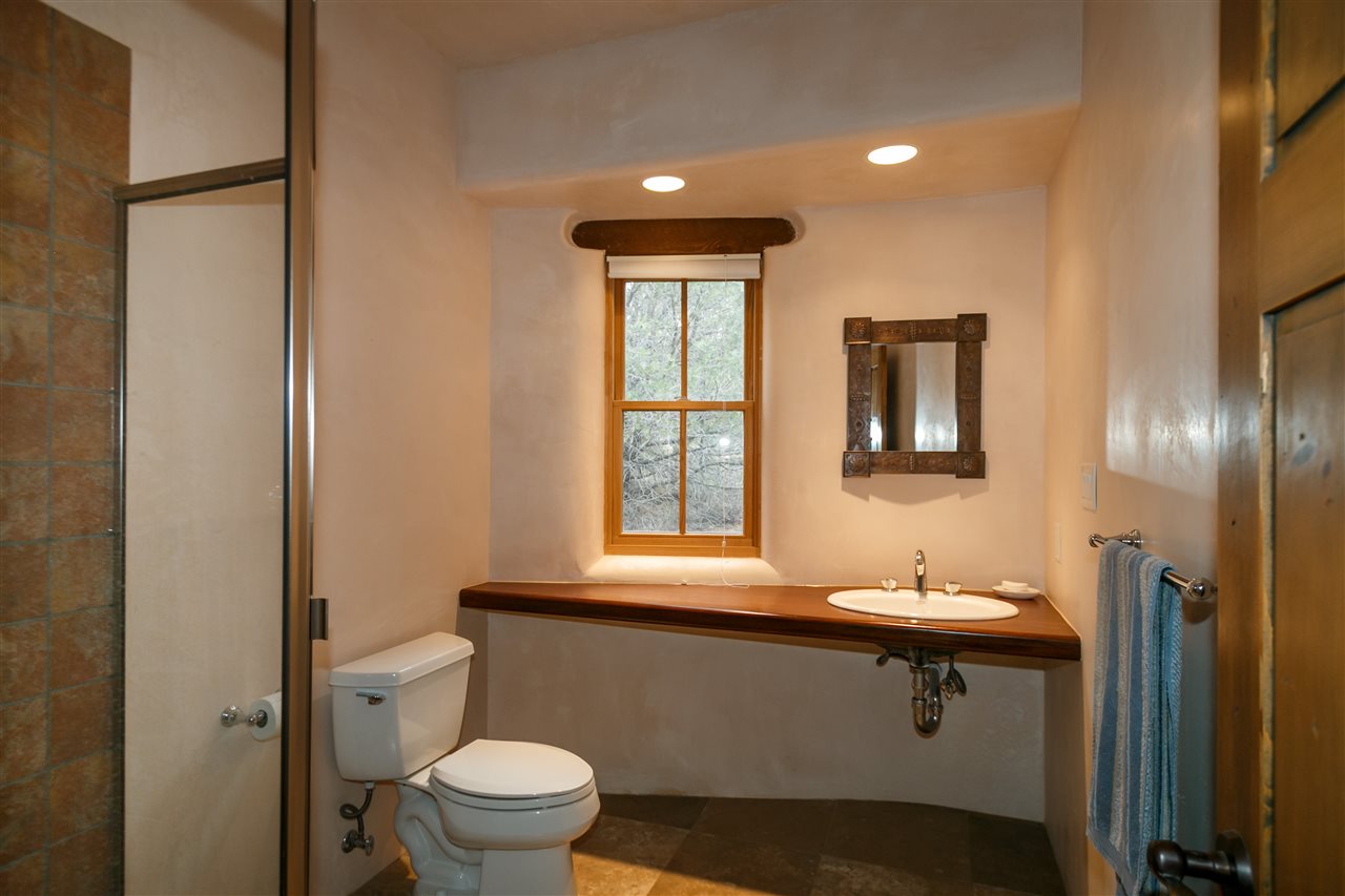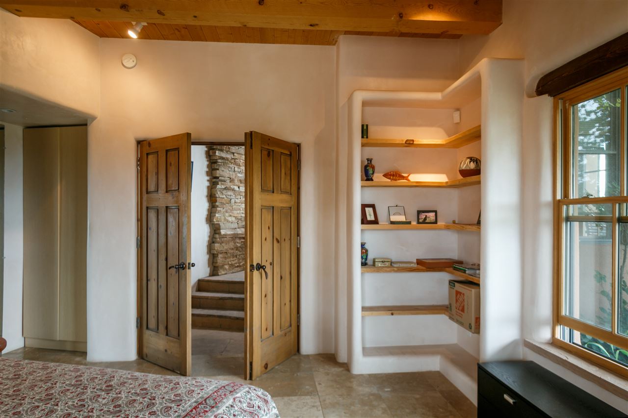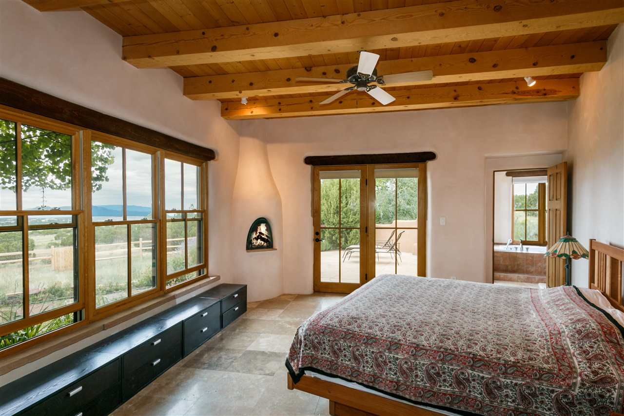 Situated high on a 5 acre lot overlooking incredible mountain views is this lovely custom design by Stephen Merdler a renowned Santa Fe architect. Every angle delights the eye every room beautifully finished. A curvaceous, landscaped Anasazi wall by Michael Herns and kiva fireplace in the living room, travertine tiles and Colorado slate floors throughout, Brazilian wood bathroom countertops, cherry kitchen cabinets, 3 fireplaces, diamond plaster walls and viga beam ceilings. Professionally landscaped gardens with 4 portals, plus a large flagstone patio for outside dining with stunning views! A heated 3 car garage with a built in safe & private portal, plenty of room for one to be a studio. Horses are welcome here, and only minutes to local shopping or Santa Fe.