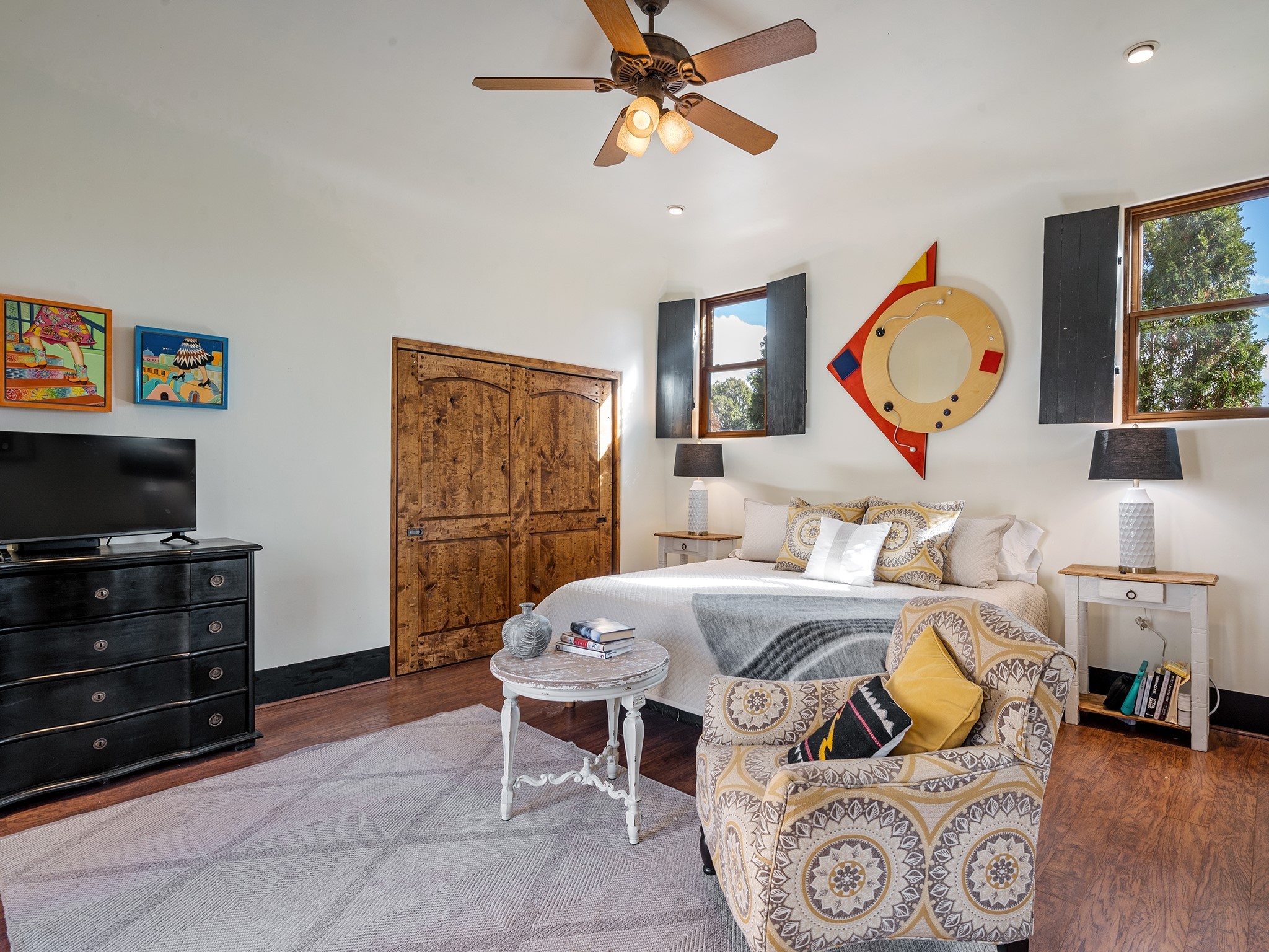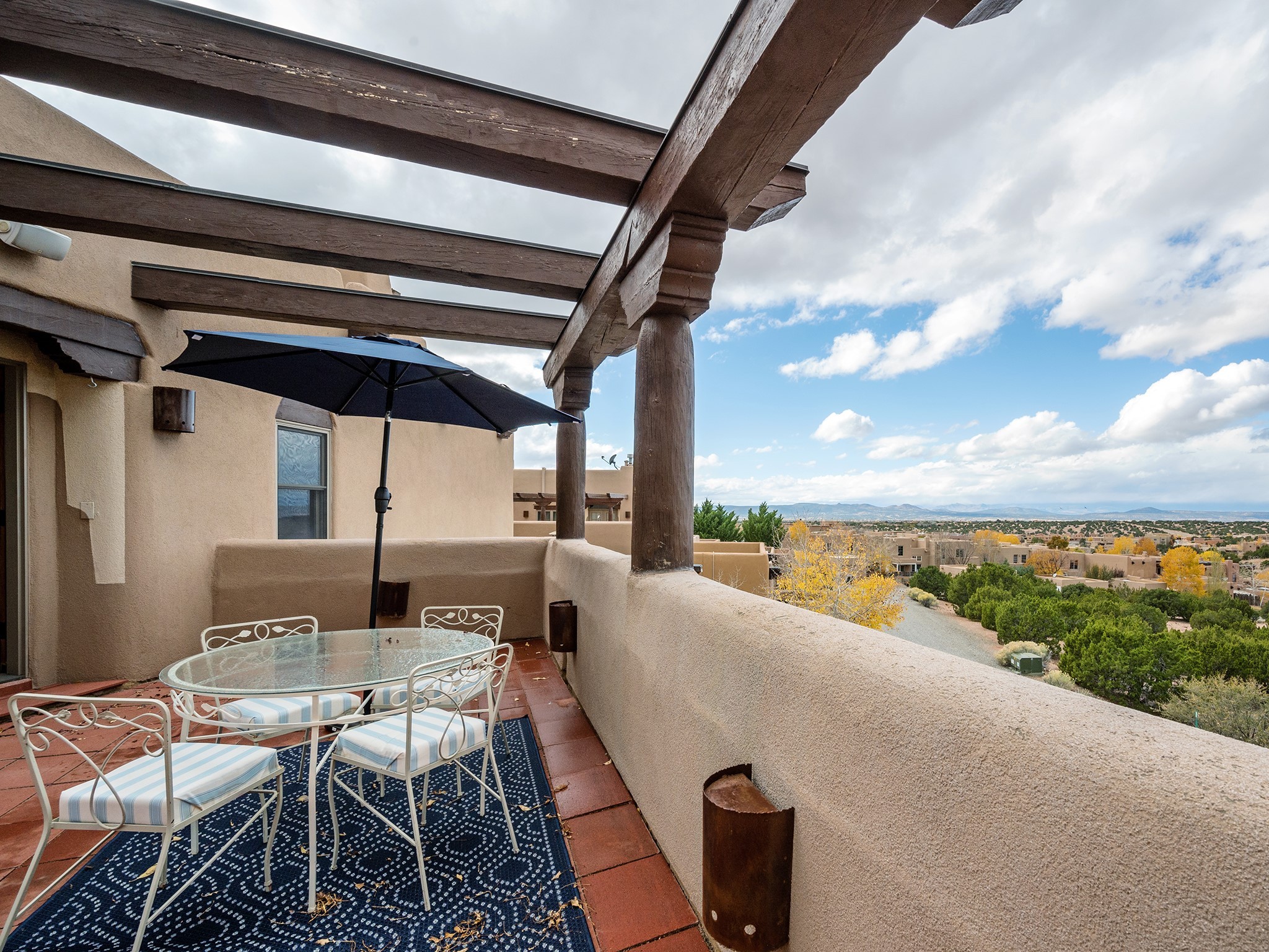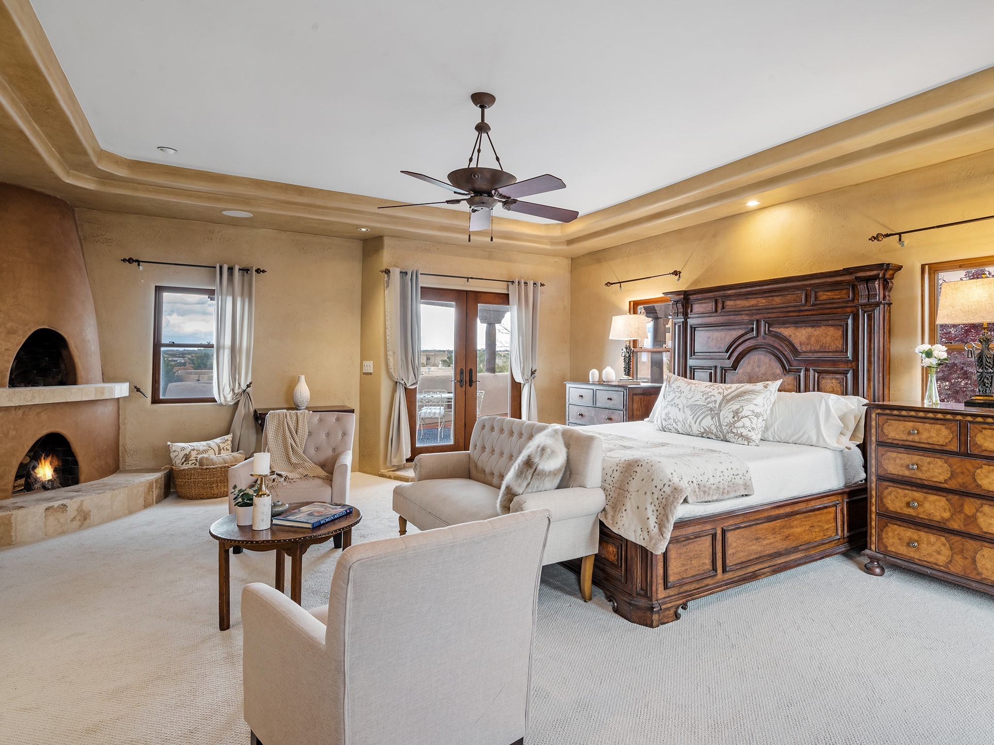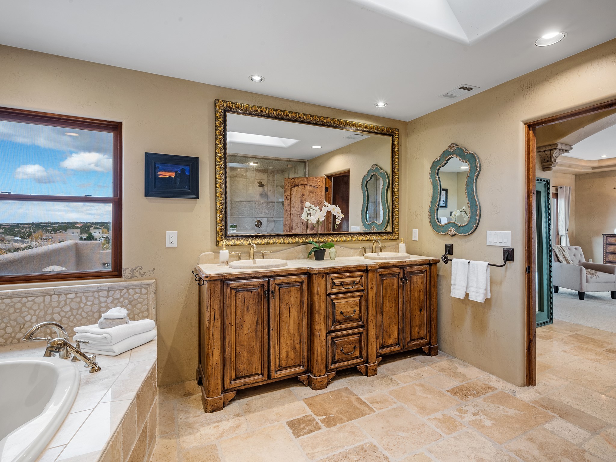 Enter through the gates of this Romantic home and you will be transported to San Miguel De Allende. The courtyard is just one of the masterpieces of this home, with arched cantera stone portals, hand made wrought iron balconies and a beautiful stone fountain as the focal point. The 3153 sf house and separate casita feature 3 beds, 3 1/2 baths, and 2 car garage. The courtyard leads you to the impressive living room which features a rumford fireplace, travertine tile floors and tall beamed ceilings with massive hand carved corbels. The lovely stair well has a hand made wrought iron railing adding to the grace and beauty of the home. There is a downstairs bedroom on the main level with new tile floors and a private full bath. The remodeled kitchen features brand new high end appliances including a gas range, refrigerator and freezer, microwave and dishwasher. The counters and backsplash are a beautiful porcelain slab with marble look veining. Off of the kitchen is a private patio where you can enjoy sunset views with your favorite evening drink, additionally, there is a curved brick ceiling giving it even more charm. There is a pantry, separate laundry room and oversized 2 car garage off of the kitchen as well. Upstairs is a large primary bedroom suite with new carpet and a beautiful bathroom with a jetted tub and walk in steam shower. Here you can enjoy your mornings on the large deck that features great sunset views of the Sandias. Back down in the courtyard is a casita that is perfect for your guests to feel close yet gives them plenty of privacy. Located in popular Aldea De Santa Fe with 13 miles of walking trails. Community center and local coffee shop. This is the perfect walkable community with plenty of activities like birding and walking clubs, book and art clubs and many other opportunities for socializing. There are currently 3 heating and cooling mini-splits in the house. The house has been repiped, NO more Kitek in the domestic water system.