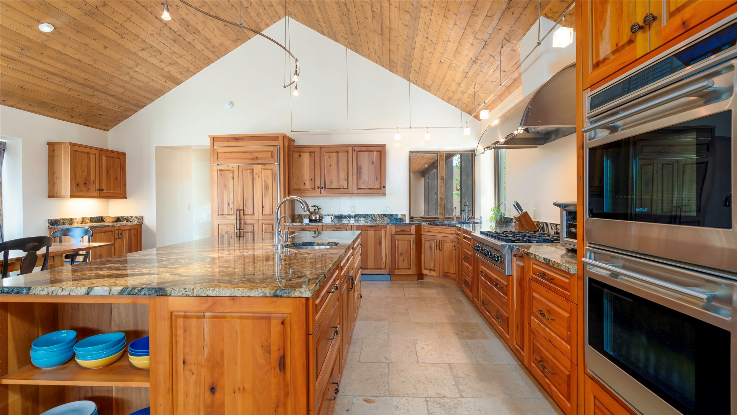 This spectacular, secluded Santa Fe Modern compound is one-of-a-kind. Located in the Art Barn district near Eldorado, this 12.5 acre property was masterfully designed to feature panoramic views of several mountain ranges, as well as wildlife viewing. Only 25 minutes from the Plaza and 5 minutes to nearby restaurants, this stunning estate is adjacent to a 100-acre private nature preserve and the 4,000 acre Eldorado Wilderness. Nestled amidst groves of native trees, this property consists of 3 homes totaling 6 bedrooms, each with an ensuite bathroom. This magnificent home brings the outdoors inside with numerous glass exposures and several private patios. The home and grounds have been updated using organic and non-toxic materials to further integrate the classic Santa Fe style. The primary suite offers a gas fireplace, enormous closet, private office, patio, and gorgeous primary bath with a soaking tub and steam shower. The Great Room has towering ceilings with abundant natural light. The custom wine room, wet bar, stunning tile and hand troweled plaster walls are just a few of the refined features this home offers. The Chef's kitchen features Wolf appliances, granite countertops with an over-sized island, and a walk-through butler's panty to a kitchen garden. The 3-car garage attached to the Main Residence is partially heated and offers extensive storage space, along with outdoor closets attached to the south patio. The guest house features 2 separate suites, a private portal, steam shower and beautiful kiva fireplace. A front porch offers bird and wildlife viewing while watching epic sunsets as an added bonus. The caretaker's cottage is over 1000 sq feet and has been used as a successful rental, This is a one-of-a kind property that has been meticulously cared for and recently upgraded in many aspects. This home is perfect for those wanting the quiet of a more rural area, while providing the comfort and convenience to the historic Santa Fe Plaza.