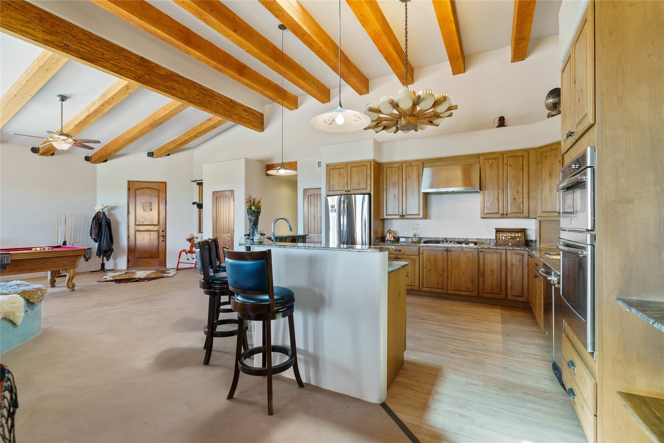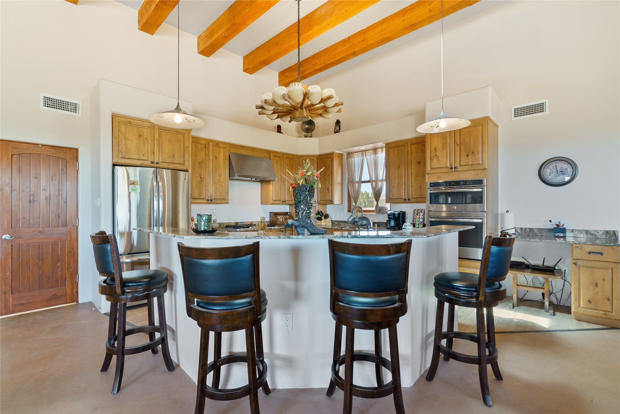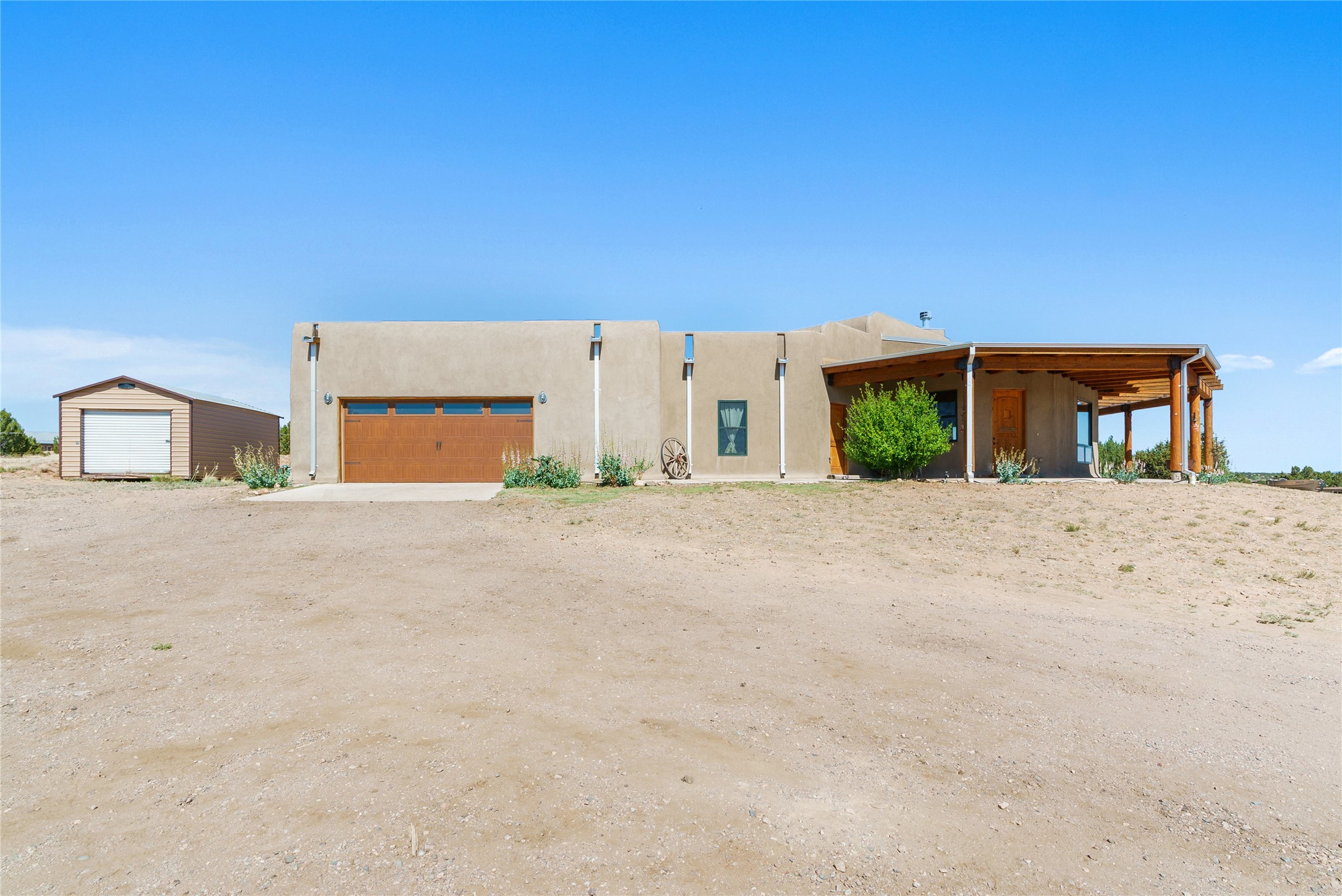 Buyer Sale Contingency with 72 hour FRR. Welcome home - This is the ONE! Close to the infamous star-bound Bonanza Creek Ranch. Stretch out on 10 acres of pristine country, situated on top of a mesa with expanding scenic views of the New Mexican landscape. From the valleys to the mountain tops, you can see it all. This custom-built home was completed in 2014 and offers everything you could imagine. The detail in this home starts with the overall design with many windows perfectly placed for the most impactful views. The home is a sprawling 2,160 square feet with an open floorplan that takes your breath away upon entering.With soaring ceilings to rich wood accents, this home is the epitome of the southwestern style. Stained concrete floors give you an elegant and timeless look as they carry you into each room. Custom blacksmith work by local artist accents the wood beams, cabinets and doors. The granite was hand-picked, showing intense colors and vibrant patterns. The owner's suite offers a standing shower, a jetted tub, dual vanity sinks along with a private commode. Each room is fitted with its own bathroom and exit to the exterior for comfort and ease. On the exterior of the home, you will enjoy a wrap around covered patio along with a private courtyard featuring a built-in grill - a great place for quiet, intimate evenings or showing off while entertaining large parties. This home has been set up with comfort in mind, offering 5 different heating options, ranging from in-floor radiant heat to the gas fireplace in the bedroom. Refrigerated air has been fitted into the home as well so you can enjoy the perfect climate for your needs. The oversized two car garage is set up with ample storage with the option of solar, along with a workshop area with 220v power. This exclusive property features pro-panel stables for your critters, a large barn/workshop, a custom built green house and a Morgan Shed. Structural Insulated Panel (SIP) Construction offering a R48 value on the roof and an R36 value in the walls. This type of construction is designed to save energy to save you money on heating and cooling costs. Minutes from center Santa Fe, Madrid and Albuquerque. You won't want to miss this one!