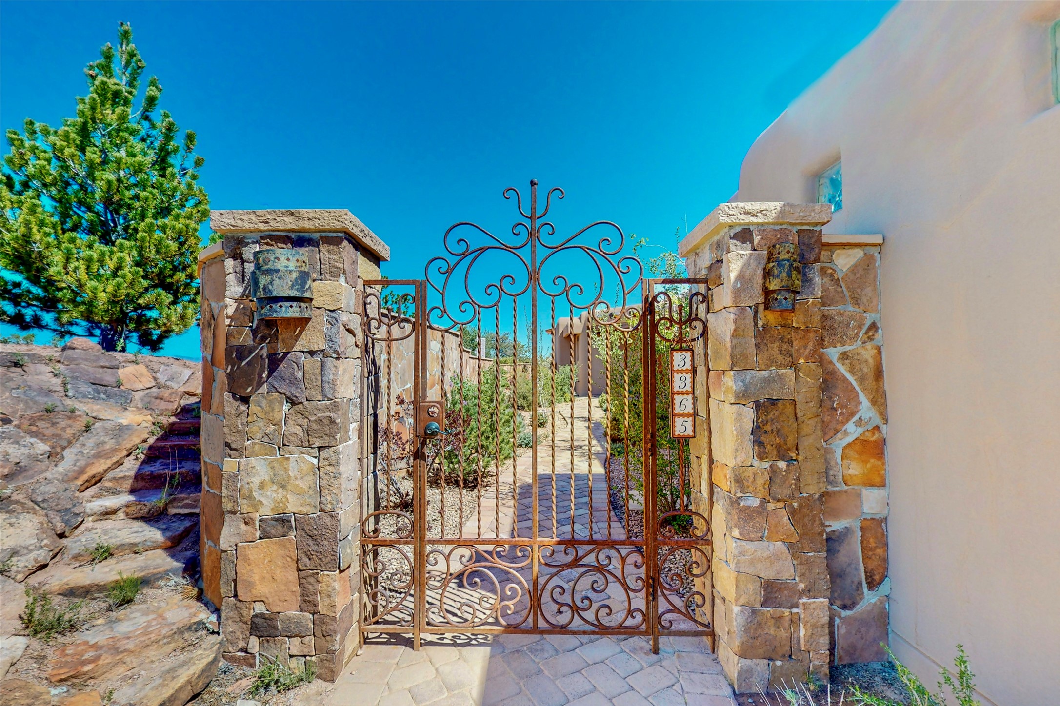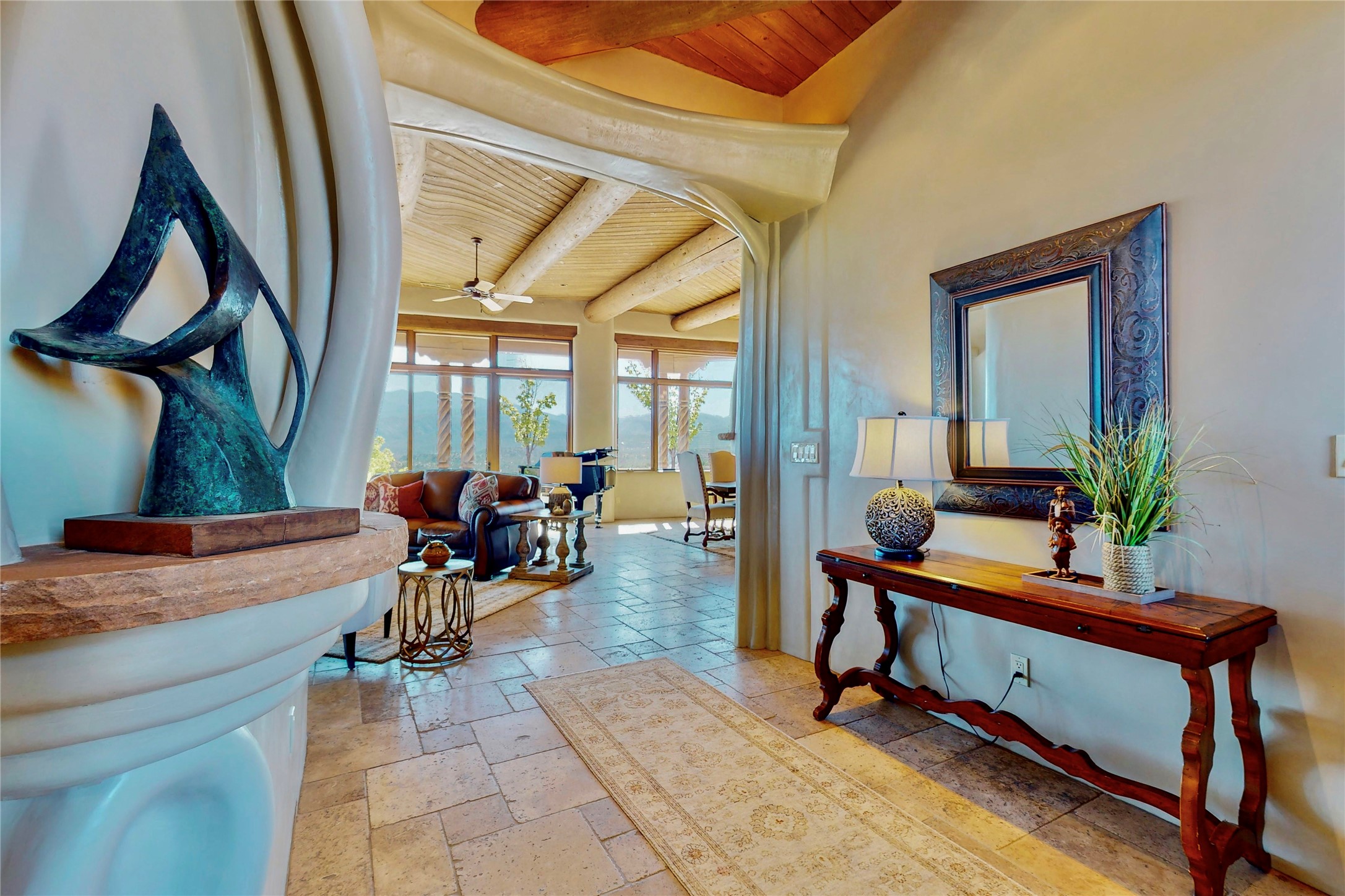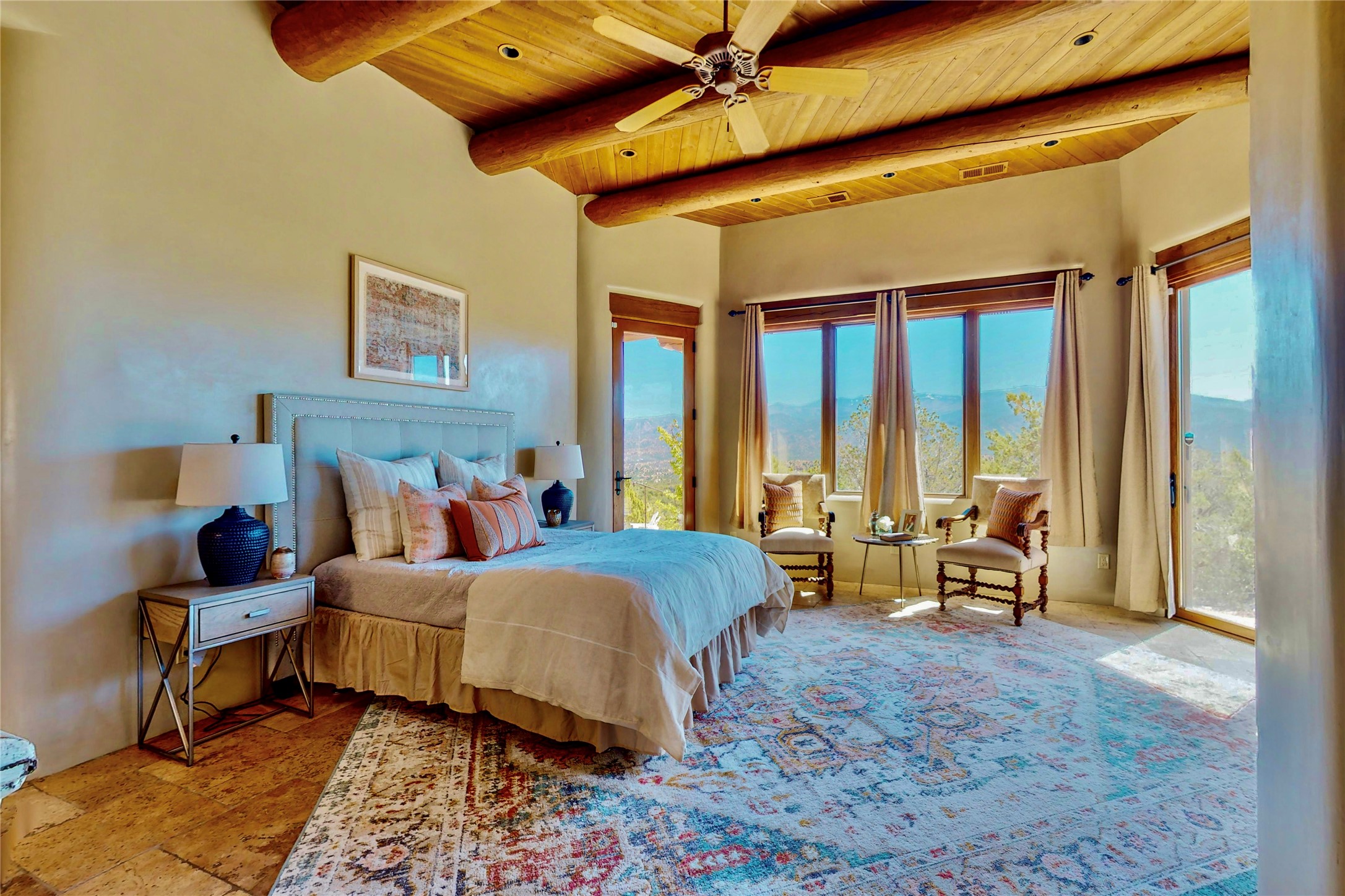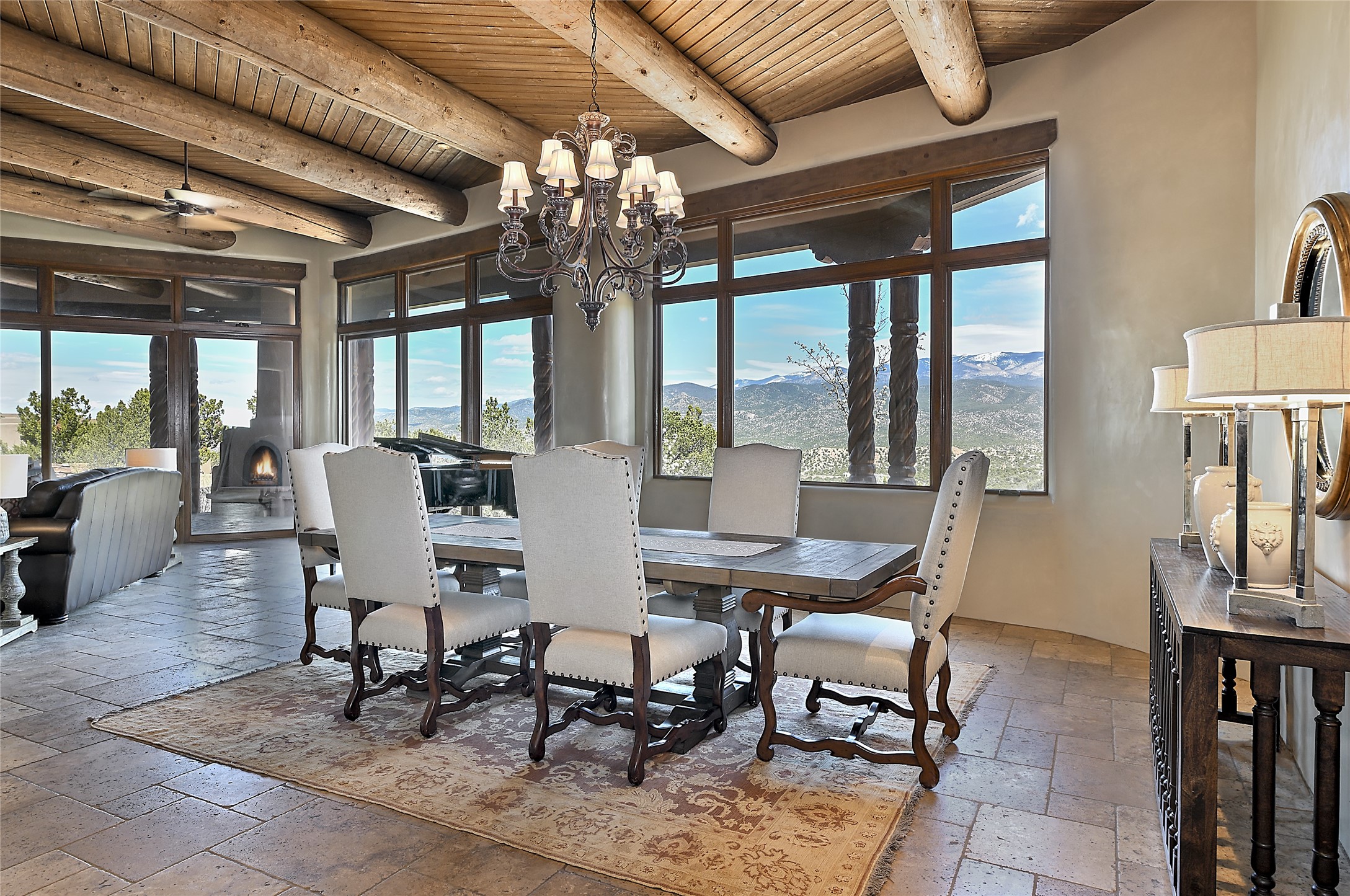 Exquisite single level Monte Sereno Home sited on one of the finest and highest lots within the Monte Sereno subdivision, capturing unobstructable and endless views of the Sangre de Cristo Mountain range and beyond. Rare to find such a spectacular lot and location of this caliber anymore! The home features a grand floor plan, perfect for entertaining. The open, great room concept, coupled with floor to ceiling windows, simply envelopes all public spaces with magnificent views. Additionally, the portal and outdoor areas are easily accessed from the living and dining areas for genuine indoor/outdoor comfort and entertaining. Although the house is grand in nature, there remains a wonderful separation of space between the sequestered, and intimate primary suite and all other bedroom suites. The owners suite bath features a jacuzzi tub, steam shower and sauna - the perfect respite! Completed in 2007, this Southwest Pueblo style home was crafted by legendary builder, John LeMaster and features the finest of finishes with great flair. The kitchen rivals all great kitchens but commands beautiful views from every location within it! A large bar height counter surrounds the kitchen for perfect communication with guests while cooking! Perfect center island with warming oven helps with prepping, storage and heating while cooking. Beautiful smooth, hand troweled sculptured plaster walls, travertine floors and gorgeous, detailed mosaic tile work throughout just touch the surface of this lovely home.