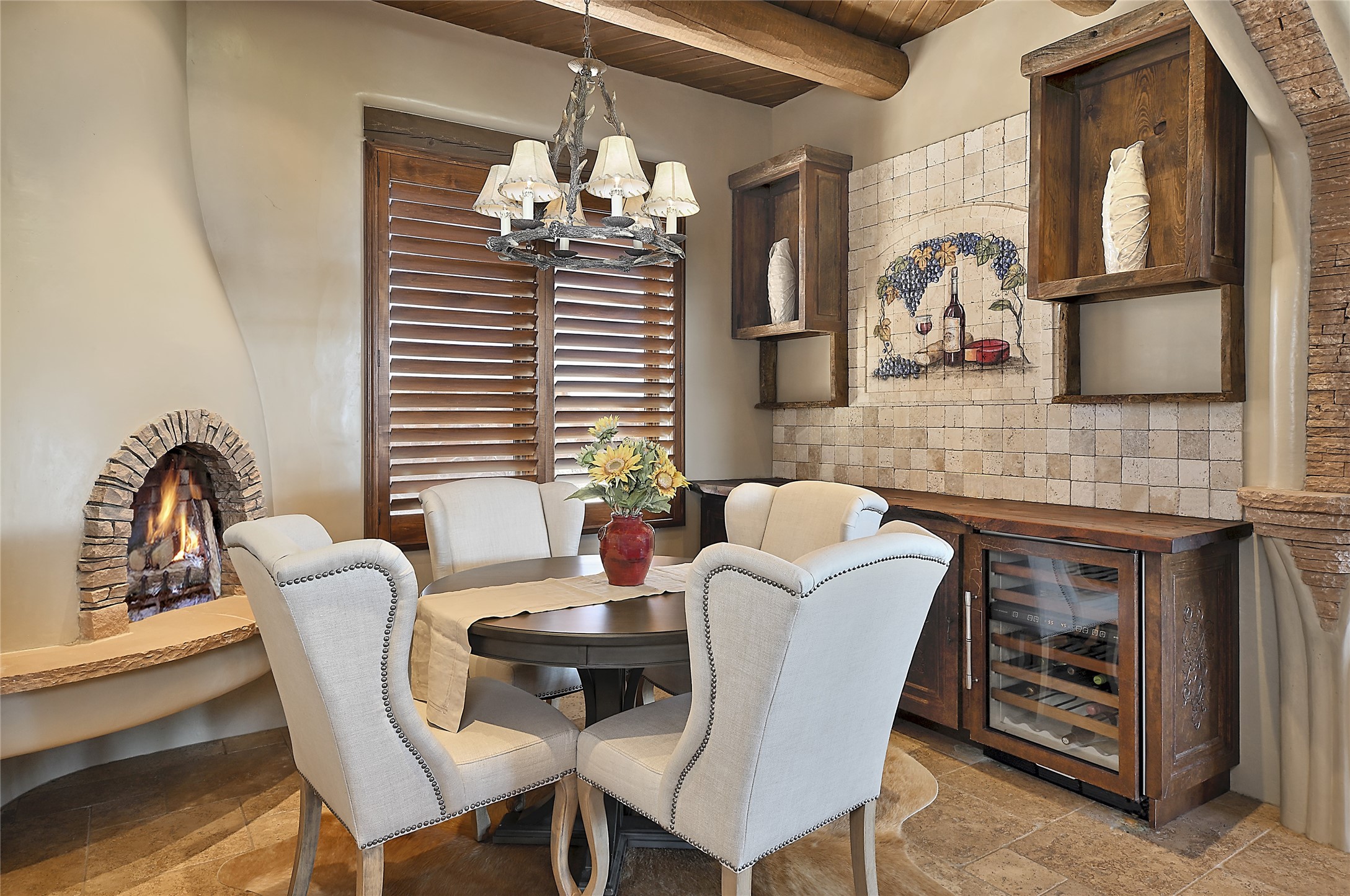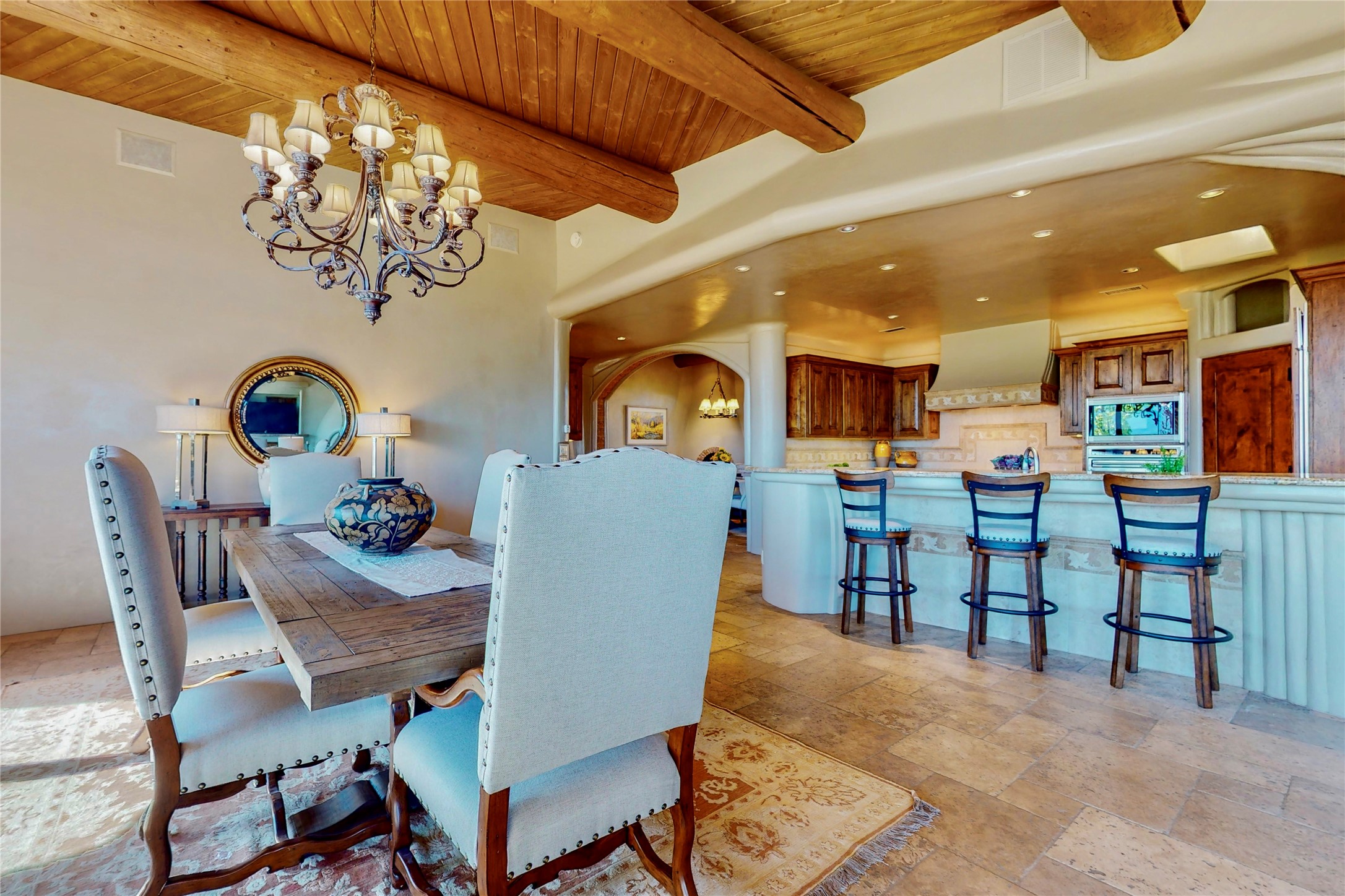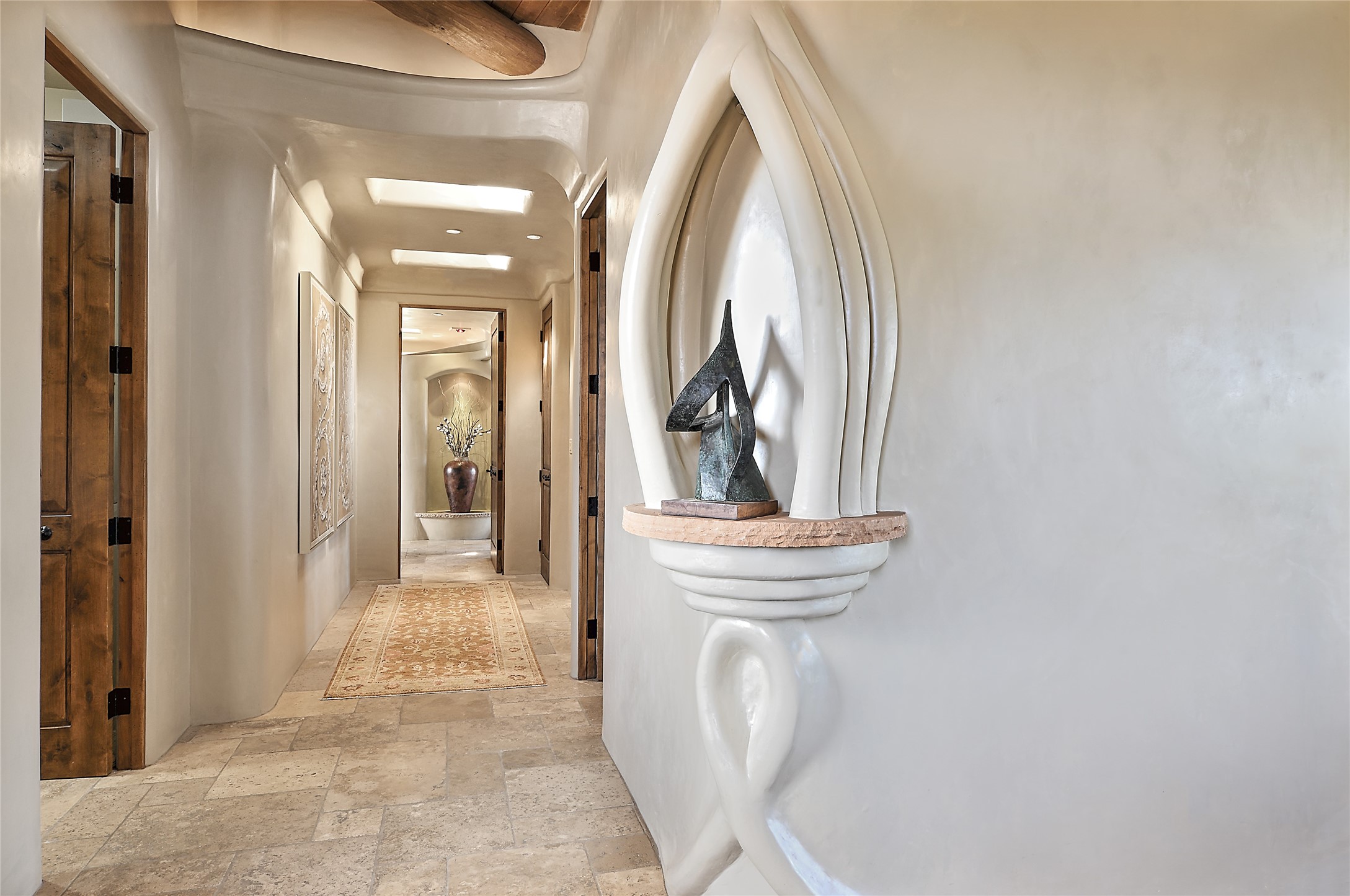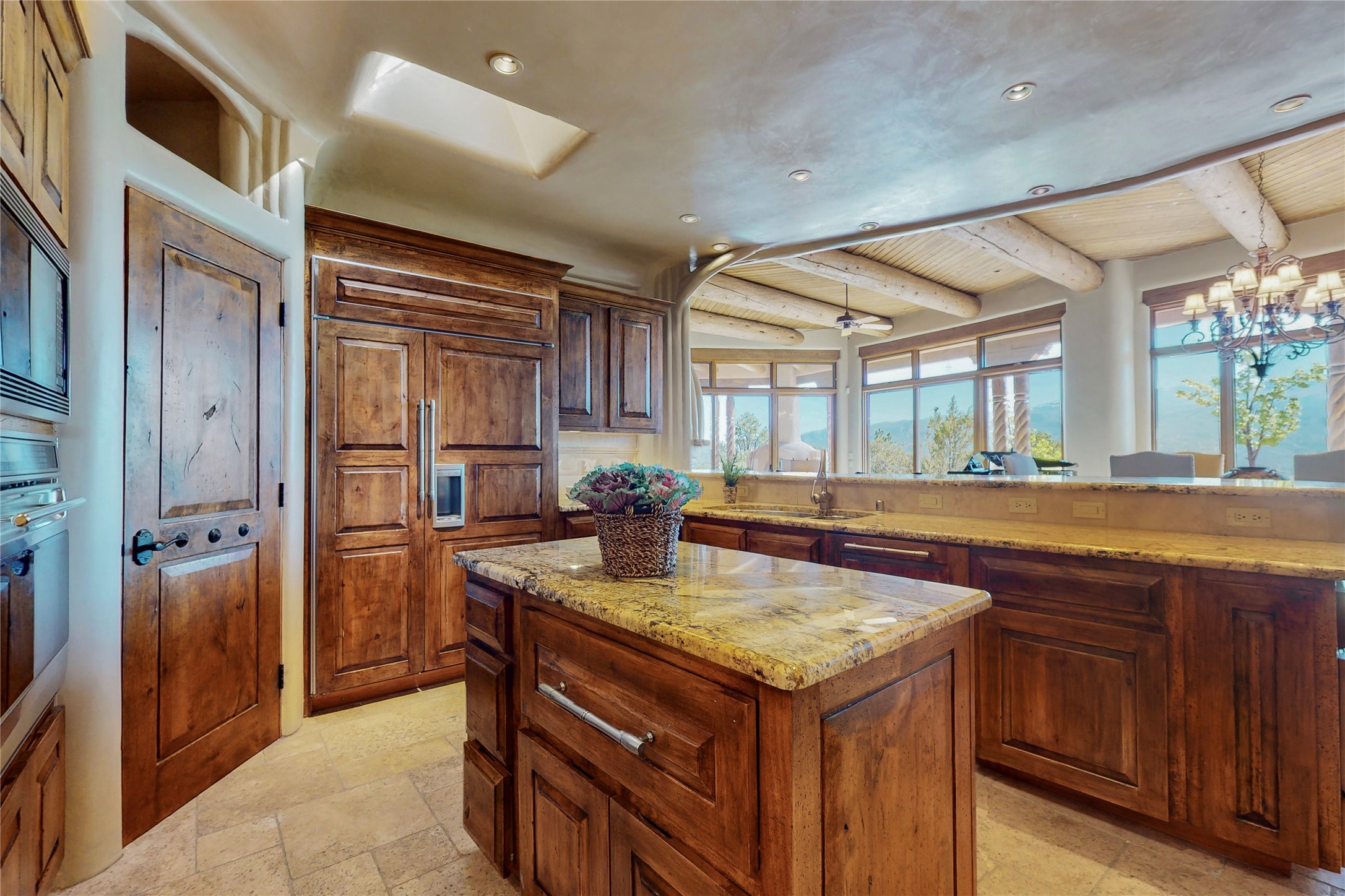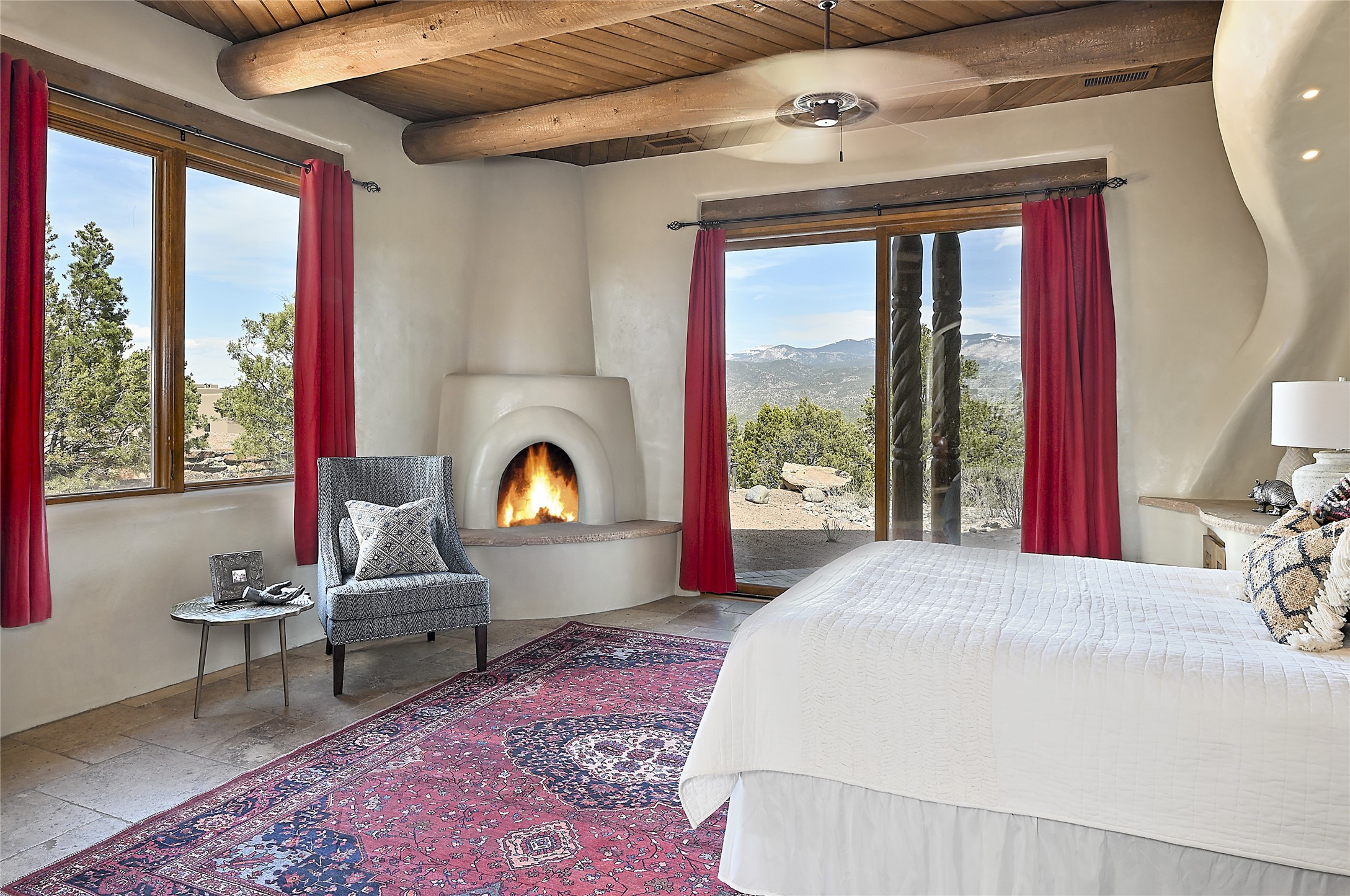 Exquisite single level Monte Sereno Home sited on one of the finest and highest lots within the Monte Sereno subdivision, capturing unobstructable and endless views of the Sangre de Cristo Mountain range and beyond. Rare to find such a spectacular lot and location of this caliber anymore! The home features a grand floor plan, perfect for entertaining. The open, great room concept, coupled with floor to ceiling windows, simply envelopes all public spaces with magnificent views. Additionally, the portal and outdoor areas are easily accessed from the living and dining areas for genuine indoor/outdoor comfort and entertaining. Although the house is grand in nature, there remains a wonderful separation of space between the sequestered, and intimate primary suite and all other bedroom suites. The owners suite bath features a jacuzzi tub, steam shower and sauna - the perfect respite! Completed in 2007, this Southwest Pueblo style home was crafted by legendary builder, John LeMaster and features the finest of finishes with great flair. The kitchen rivals all great kitchens but commands beautiful views from every location within it! A large bar height counter surrounds the kitchen for perfect communication with guests while cooking! Perfect center island with warming oven helps with prepping, storage and heating while cooking. Beautiful smooth, hand troweled sculptured plaster walls, travertine floors and gorgeous, detailed mosaic tile work throughout just touch the surface of this lovely home.