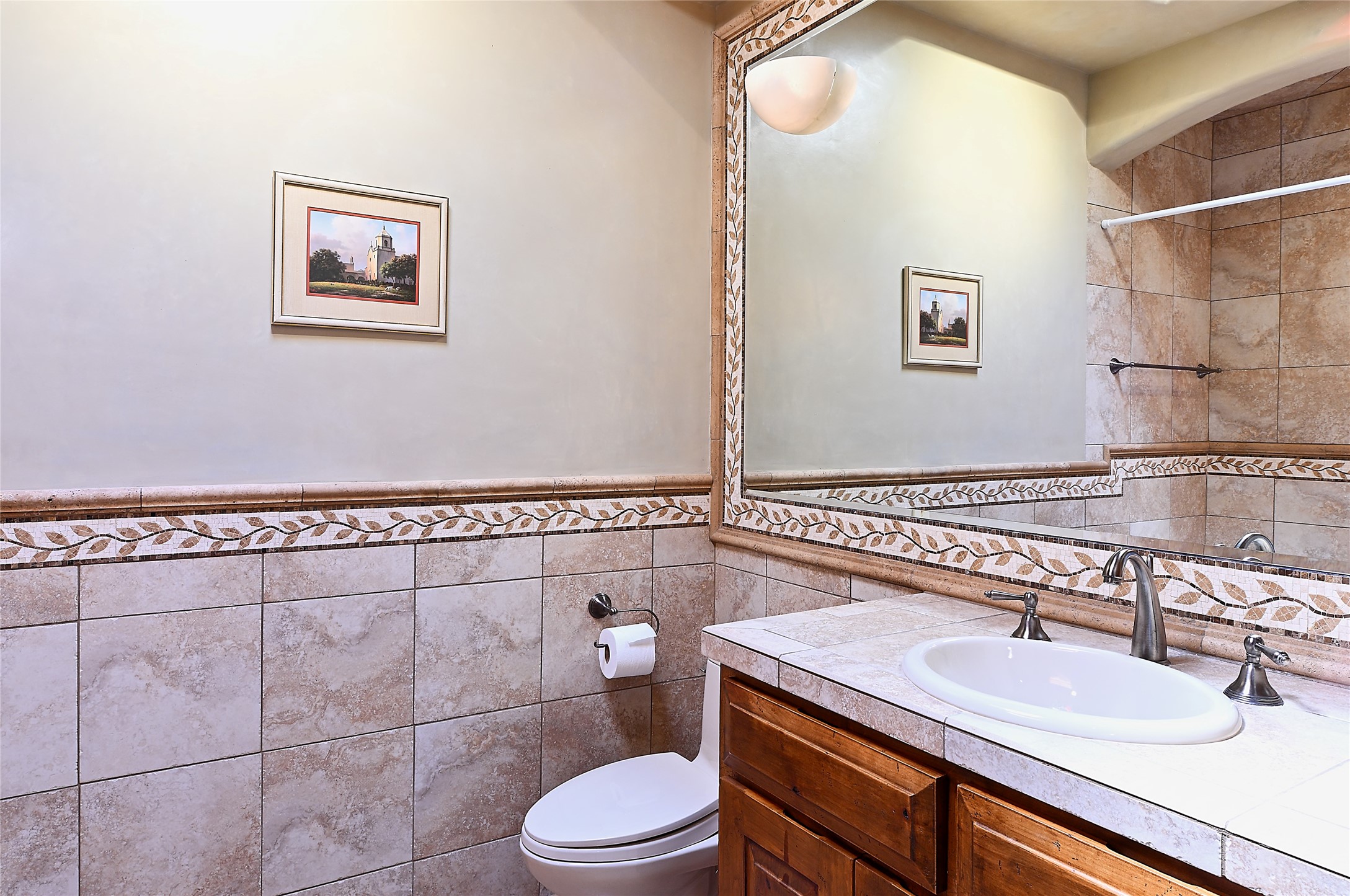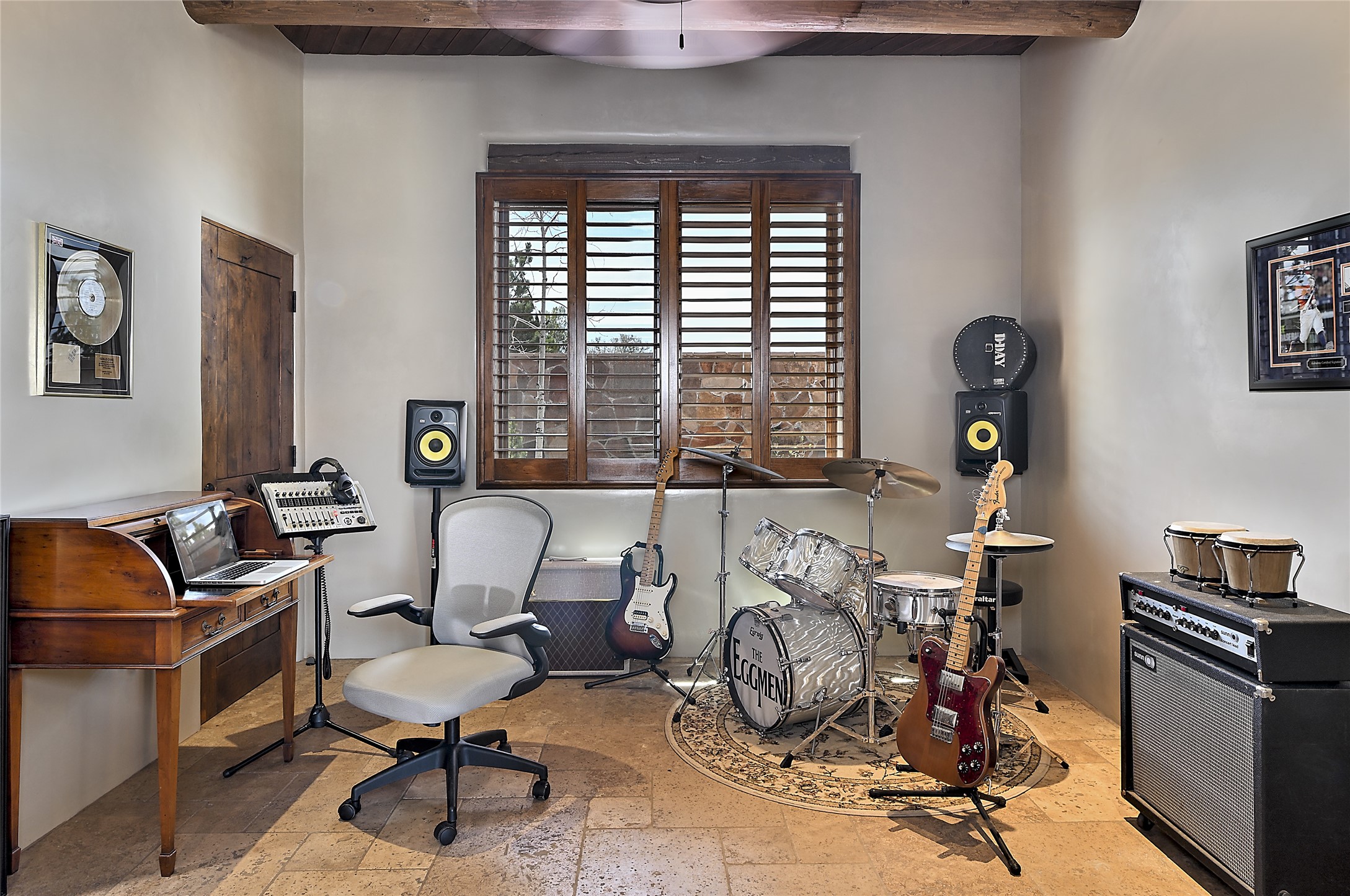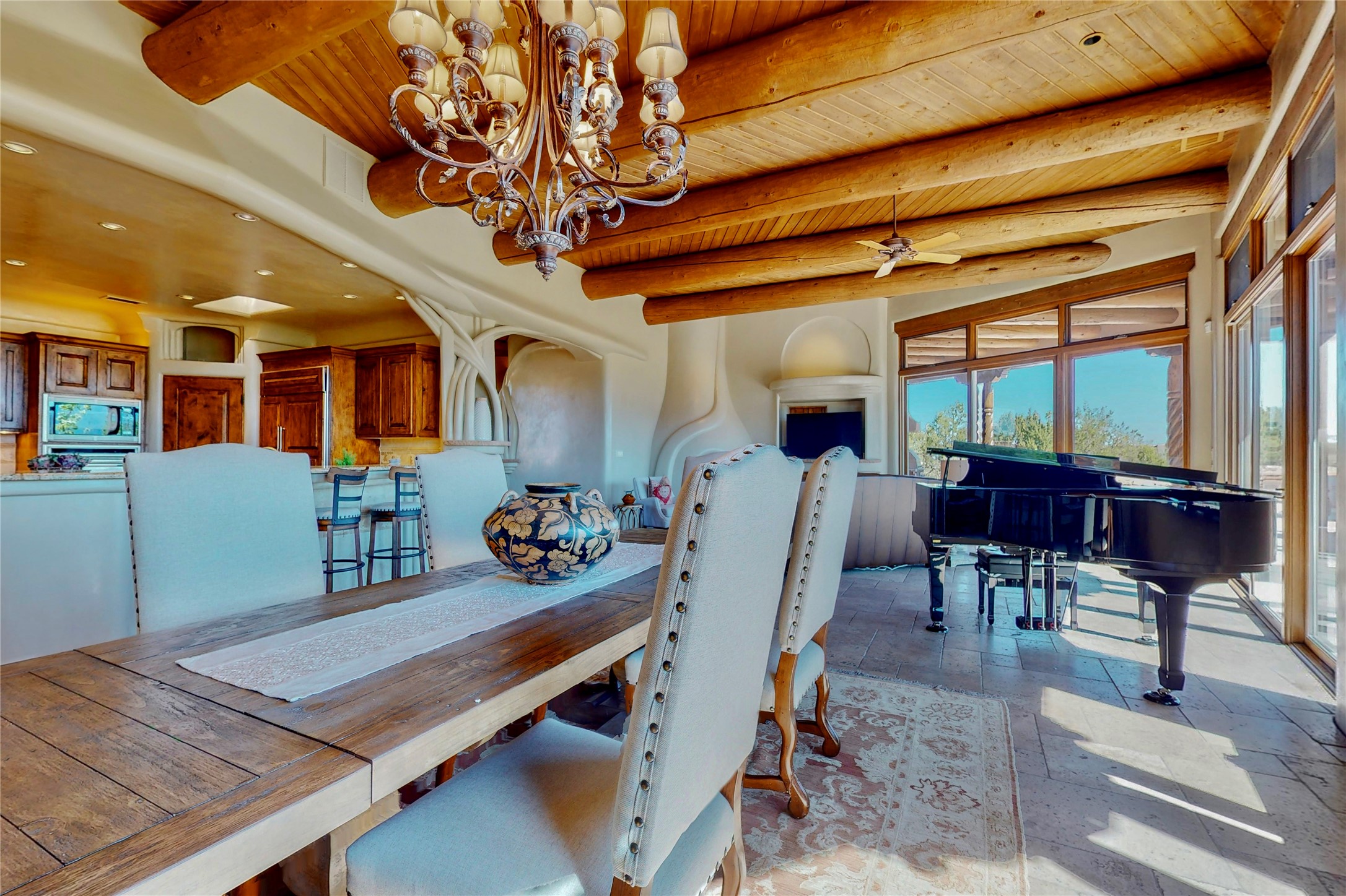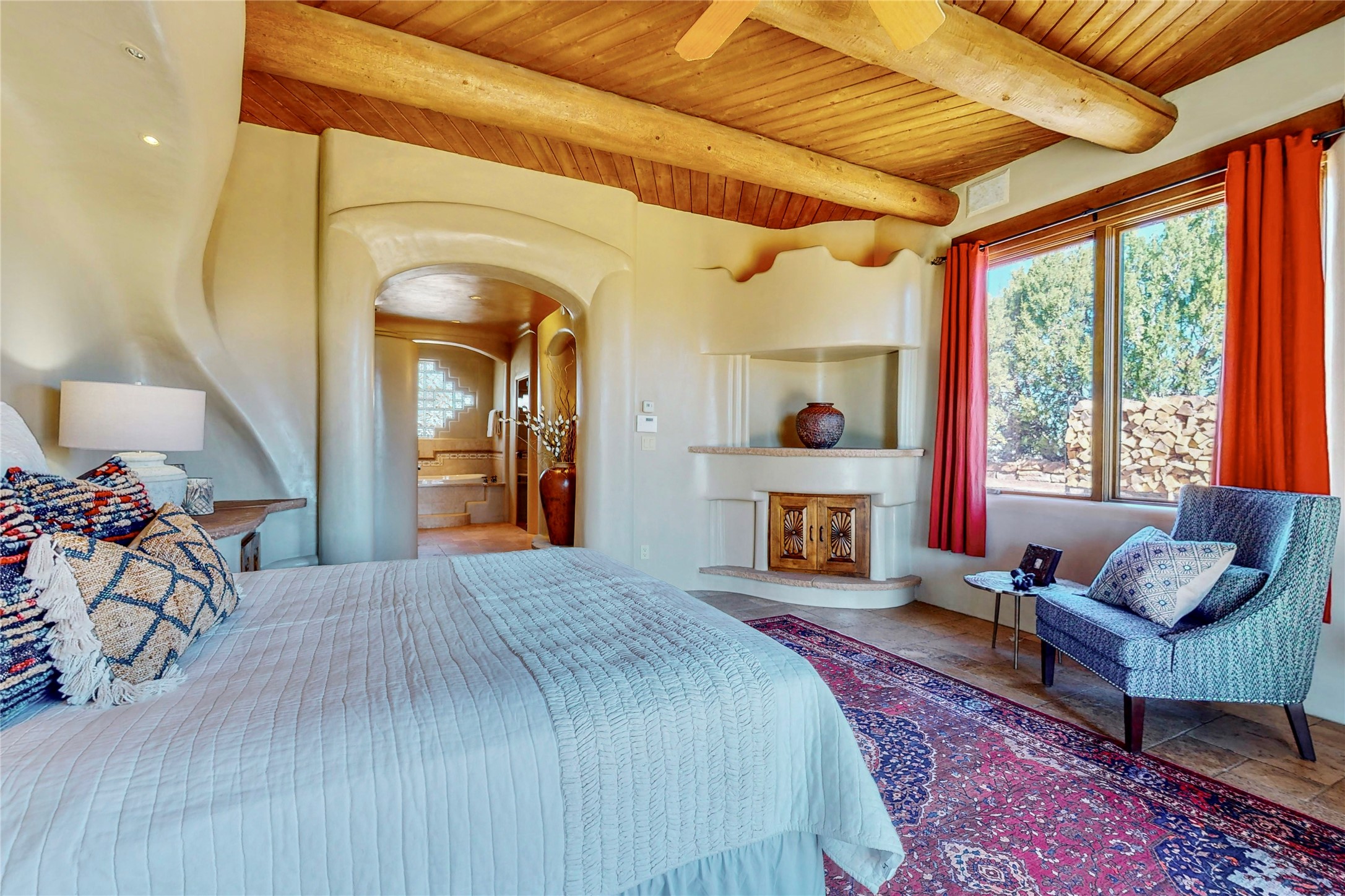 Exquisite single level Monte Sereno Home sited on one of the finest and highest lots within the Monte Sereno subdivision, capturing unobstructable and endless views of the Sangre de Cristo Mountain range and beyond. Rare to find such a spectacular lot and location of this caliber anymore! The home features a grand floor plan, perfect for entertaining. The open, great room concept, coupled with floor to ceiling windows, simply envelopes all public spaces with magnificent views. Additionally, the portal and outdoor areas are easily accessed from the living and dining areas for genuine indoor/outdoor comfort and entertaining. Although the house is grand in nature, there remains a wonderful separation of space between the sequestered, and intimate primary suite and all other bedroom suites. The owners suite bath features a jacuzzi tub, steam shower and sauna - the perfect respite! Completed in 2007, this Southwest Pueblo style home was crafted by legendary builder, John LeMaster and features the finest of finishes with great flair. The kitchen rivals all great kitchens but commands beautiful views from every location within it! A large bar height counter surrounds the kitchen for perfect communication with guests while cooking! Perfect center island with warming oven helps with prepping, storage and heating while cooking. Beautiful smooth, hand troweled sculptured plaster walls, travertine floors and gorgeous, detailed mosaic tile work throughout just touch the surface of this lovely home.