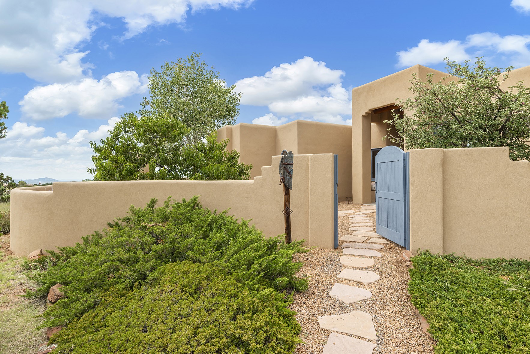 Single Level offering in the much-coveted Dos Griegos neighborhood! This 3 bedroom home offers an open and spacious living area with a view to the Dos Griegos Peak, separate dining room, and access to the rear patio from the sunken living room. The home offers many Santa Fe touches such as Saltillo tile, soaring ceilings, Vigas, nichos, curved and arched doorways, and solid wood doors. The colorful pallet speaks of the artist who much loved the home and created work for the Eldorado Studio Tour. In addition to the Office there is a third garage that could easily work for a Studio or Workshop. The owner's suite is well separated from the secondary bedrooms and offers a view of Dos Griegos Peak. A special perk is the front courtyard with Kiva Fireplace perfect for those magical Santa Fe evenings and endless Stargazing! The Dos Griegos neighborhood has paved roads, and No HOA fees, is conveniently located to shopping, dining, K-9 school, library, and senior center yet only about 20 minutes to The Santa Fe Plaza.