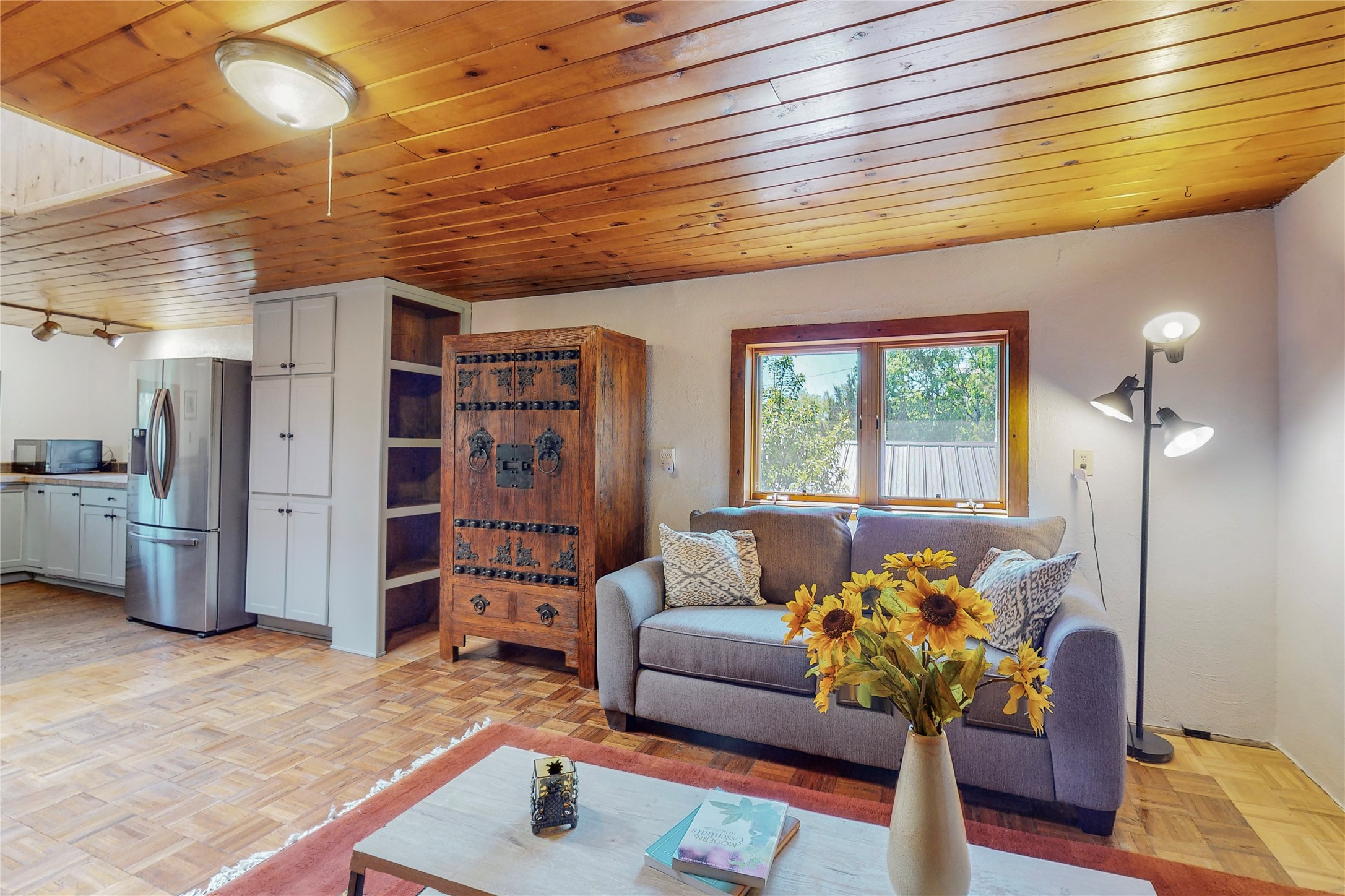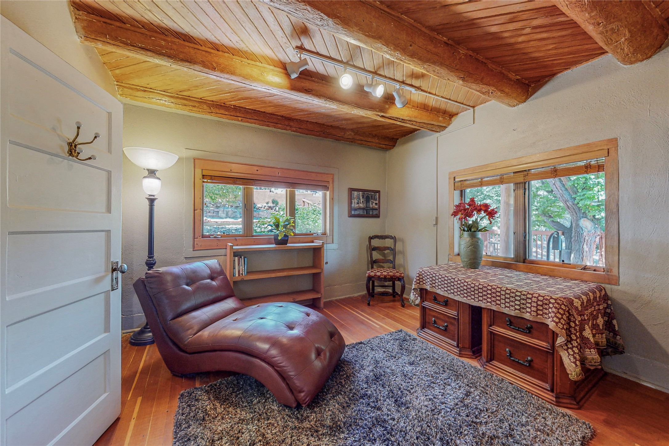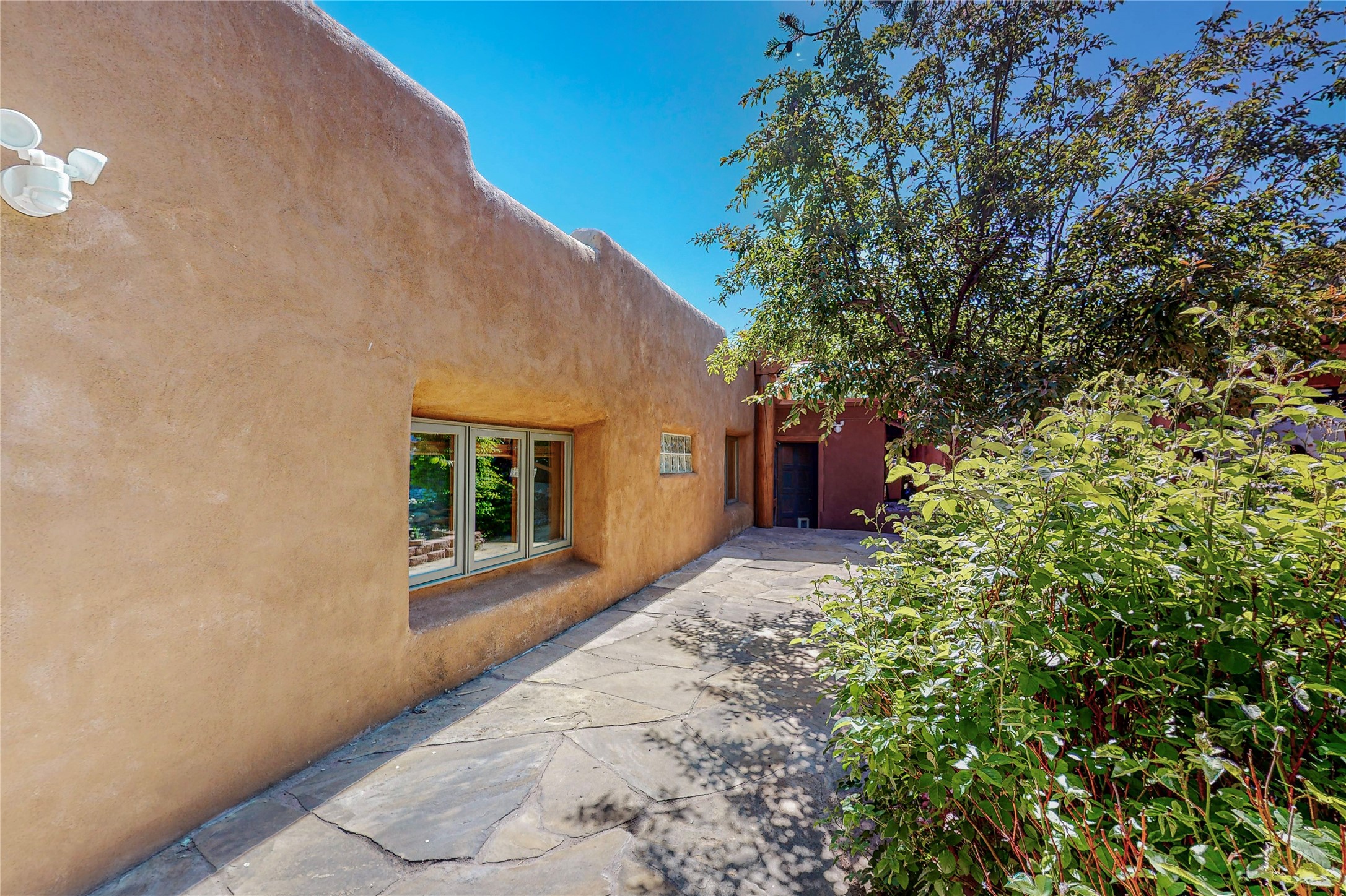 Classic Northern New Mexico style adobe gem listed for sale. The property features many upgrades including a fully fenced/walled lot with two access gates from paved NM Hwy 63, vigas and beams, tongue and groove ceilings, extensive landscaping, a fountain, an horno, a bricked terrace with great views, and a carport. Entering from the graveled driveway to covered porch overlooking one of the gardens and fountain one enters the home through a custom wooden door. The living room has recently sanded and sealed floors, corner kiva fireplace, views to the ridge above the Pecos River, bookshelf and openings to the office/2nd bedroom and dining room. The bathroom has be renovated and adjoins both bedrooms. The large recently remodeled country kitchen has stainless steel appliances - refrigerator/dishwasher/stove, copper sink, expansive seating area, new cabinets and adjoins the laundry room. There is a lower level with a den, bath, a small room that with a closet could be a bedroom or an office, separate entrance as well as a large unfinished "basement" for ample storage or renovation possibilities. There is radon mitigation in place. There is a stand alone shed/work shop that is a bonus. Come see this beautiful property today!