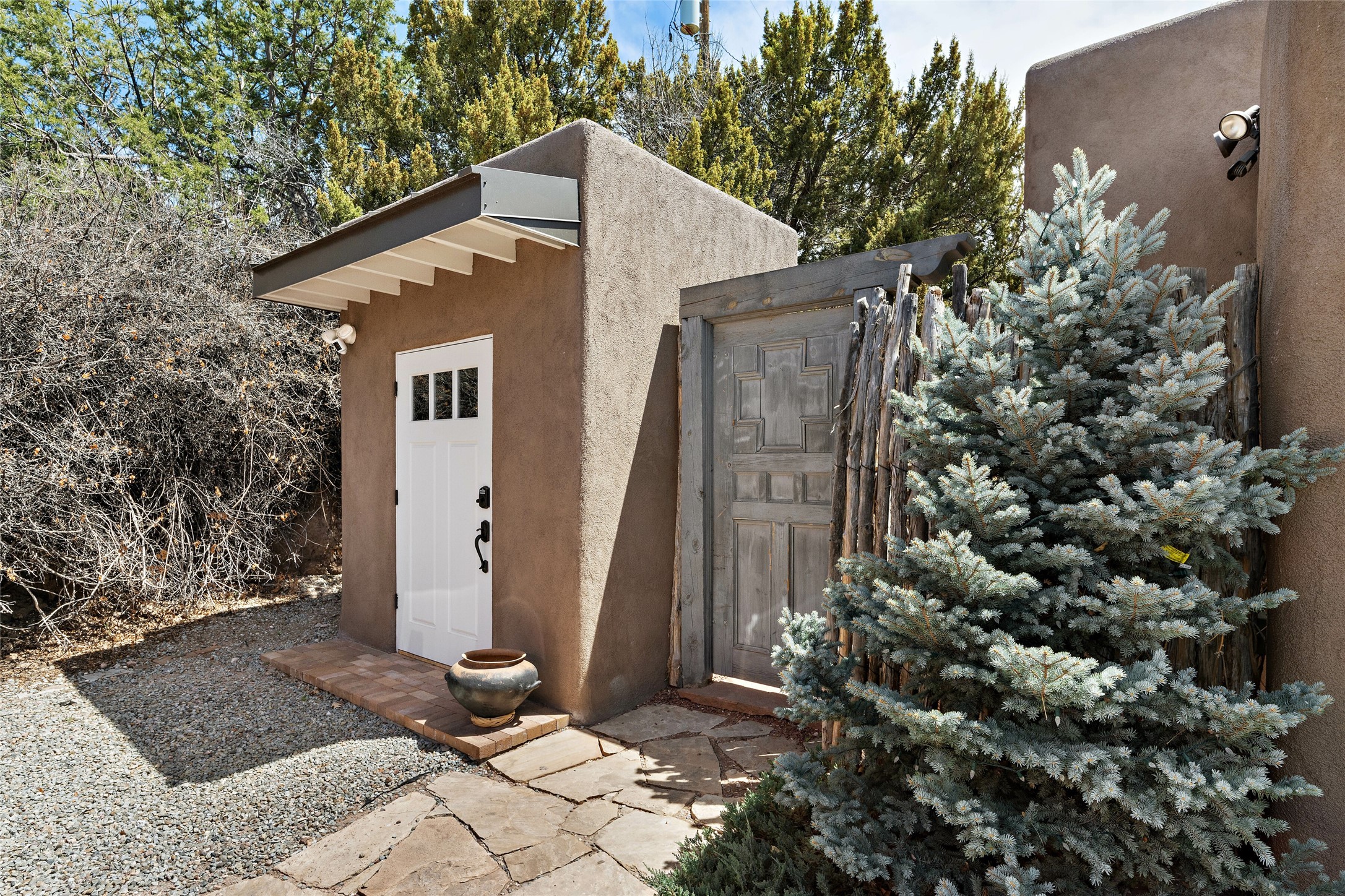 Tucked away in the quiet and verdant Chupadero Valley is a spectacular expression of design, architecture, and northern New Mexico history. This richly restored adobe/frame and stucco home and newer guesthouse sit on one expansive 1.88-acre lot manicured with gardens, a community-adored apple orchard bordered by native acequia waters, and the Rio Chupadero river. Exquisitely constructed in a traditional Territorial design, every attention to architectural detail has been considered from hand-plastered walls, hand-hewn vigas, and custom-built fireplaces. The main house consists of a sumptuous primary suite with a private gym/office and two separate bedrooms with their own ensuite baths. The formal entry and living/dining are complemented by the large, updated kitchen and expanded sitting room leading to an idyllic, wisteria-bound pergola area offering a year-round seasonal experience for those looking to entertain. A deep, covered portal runs the length of most of the main house, overlooking the orchards and gardens. Steps away, the separate 1 bedroom/1 bath guest house is bordered by its own private outdoor spaces overlooking raised-bed gardens and the chicken coop. The property is wired with high-end Lutron lighting and high-speed Starlink internet. A private well and surface water rights from the acequia keep the orchards, evergreens, and multi-season gardens in bloom. This is a rare, authentic compound that lives in the hearts of a lovely community, all in close proximity to The Four Seasons Resort, El Nido Restaurant, and the Tesuque Village Market & Eatery.