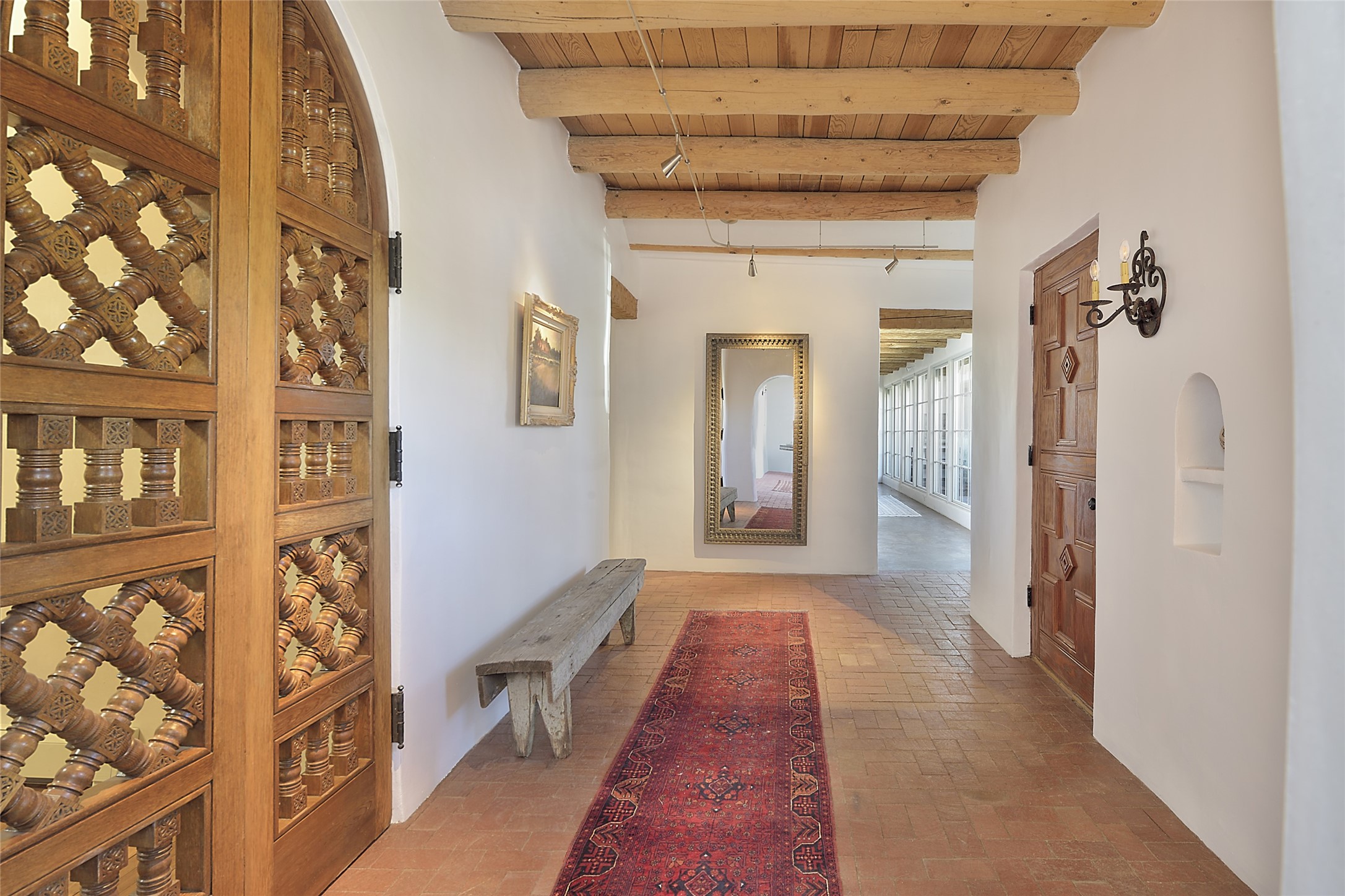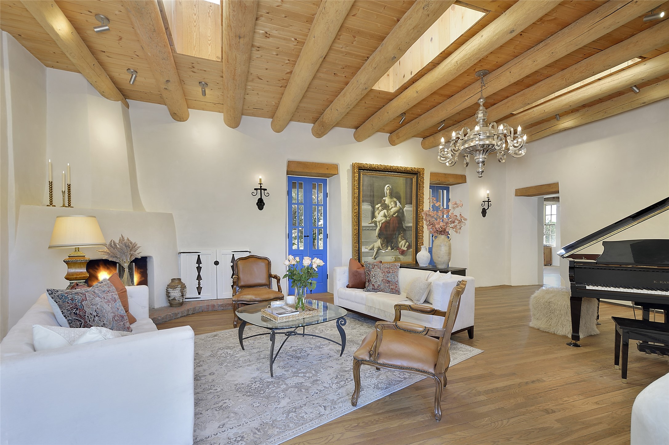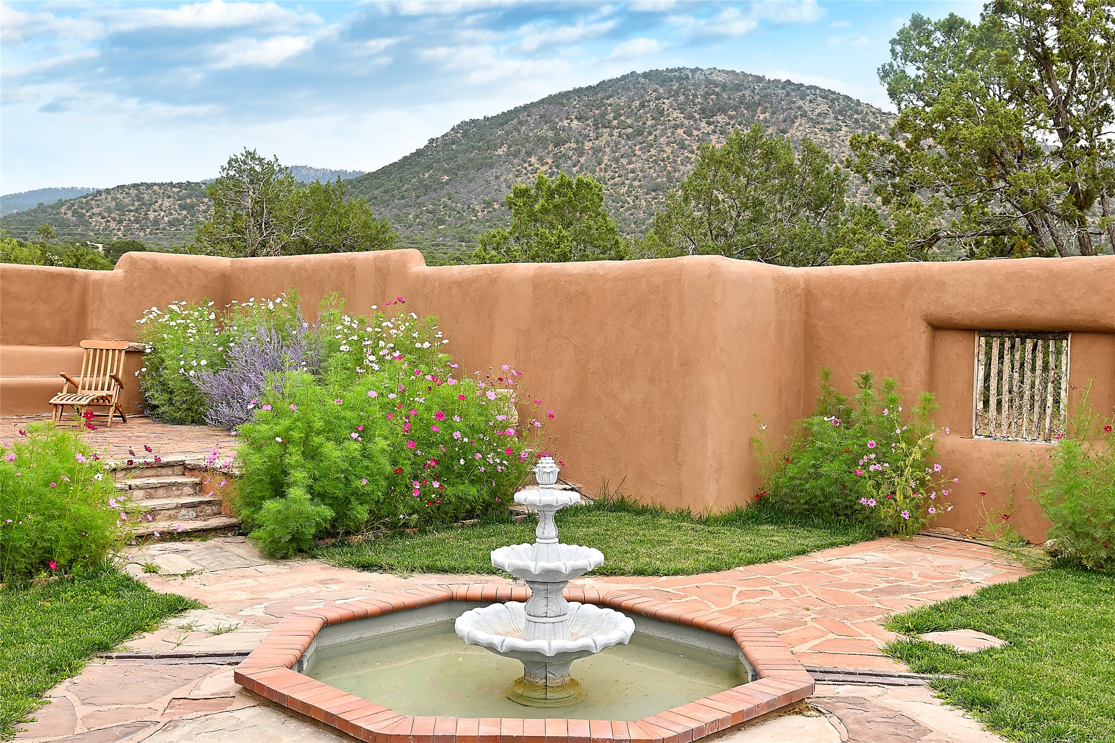 Designed by renowned architect John Gaw Meem and built in 1929, the historic Proctor Compound is sited on two acres in Sun Mountain Estates, on the edge of Museum Hill, and comprises a primary residence, a two-bedroom casita, and a spacious studio. The approximately 6,500-square-foot home is introduced by a courtyard with a classical fountain, a vintage fresco, flagstone terraces, and stunning mountain views. It features four bedrooms, six baths, five portals, a media room, a grand sala, formal dining room, spacious kitchen with superior appliances, a breakfast area, and two offices, laundry rooms, and sunrooms. The two-bedroom casita--which provides two baths, laundry facilities, a private courtyard, and the studio--which offers a full bath, a kitchen, and laundry facilities--lie across a second courtyard with fruit trees. While retaining the 1929 Pueblo Revival design elements and understated elegance for which Meem was known, the property has been carefully rejuvenated with updated systems: plumbing, electrical--including an 11.5 kilowatt solar array--heating, and cooling as well as a new roof, stucco, and windows. Contributing to the distinctive aesthetic are eight fireplaces, bancos, hand-carved doors, oak floors, vigas, beams, corbels, and replastered interior walls with original contours and soft edges. The skylit three-car garage could also serve as a workshop or studio. This is a rare opportunity not to be missed.