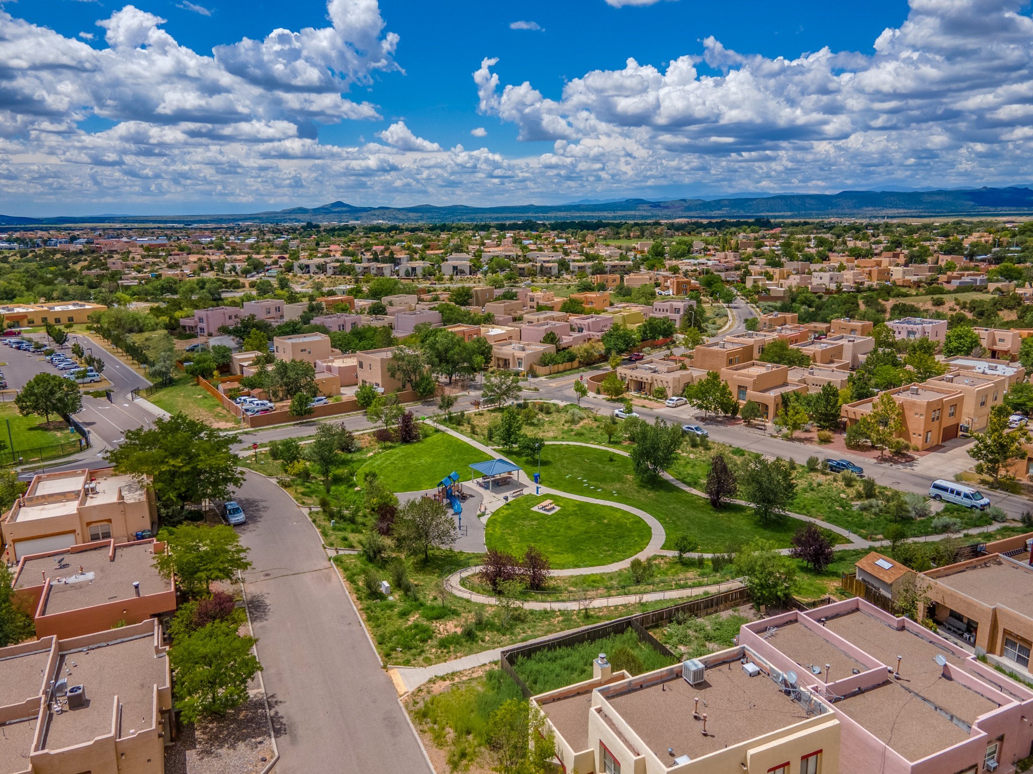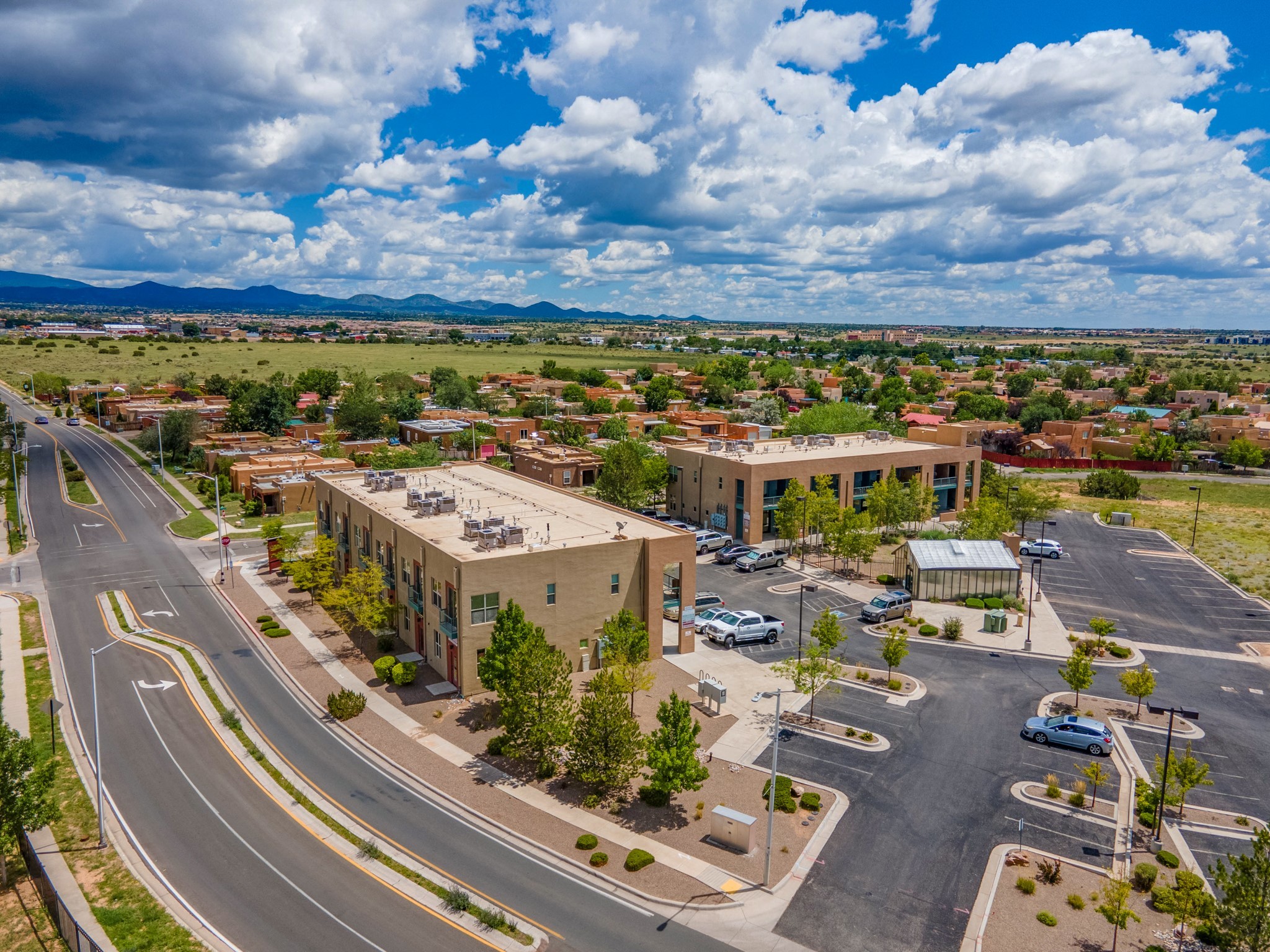 Bright, open second floor condominium with views of Sangre De Cristos and Sandias, end/corner unit with almost 200 sq ft of covered balcony. This stylish one bedroom features an updated kitchen, refrigerated air and a stackable washer/dryer. HOA pays for garbage, roof, stucco and HVAC maintenance. Owner is a NM Real Estate Broker.