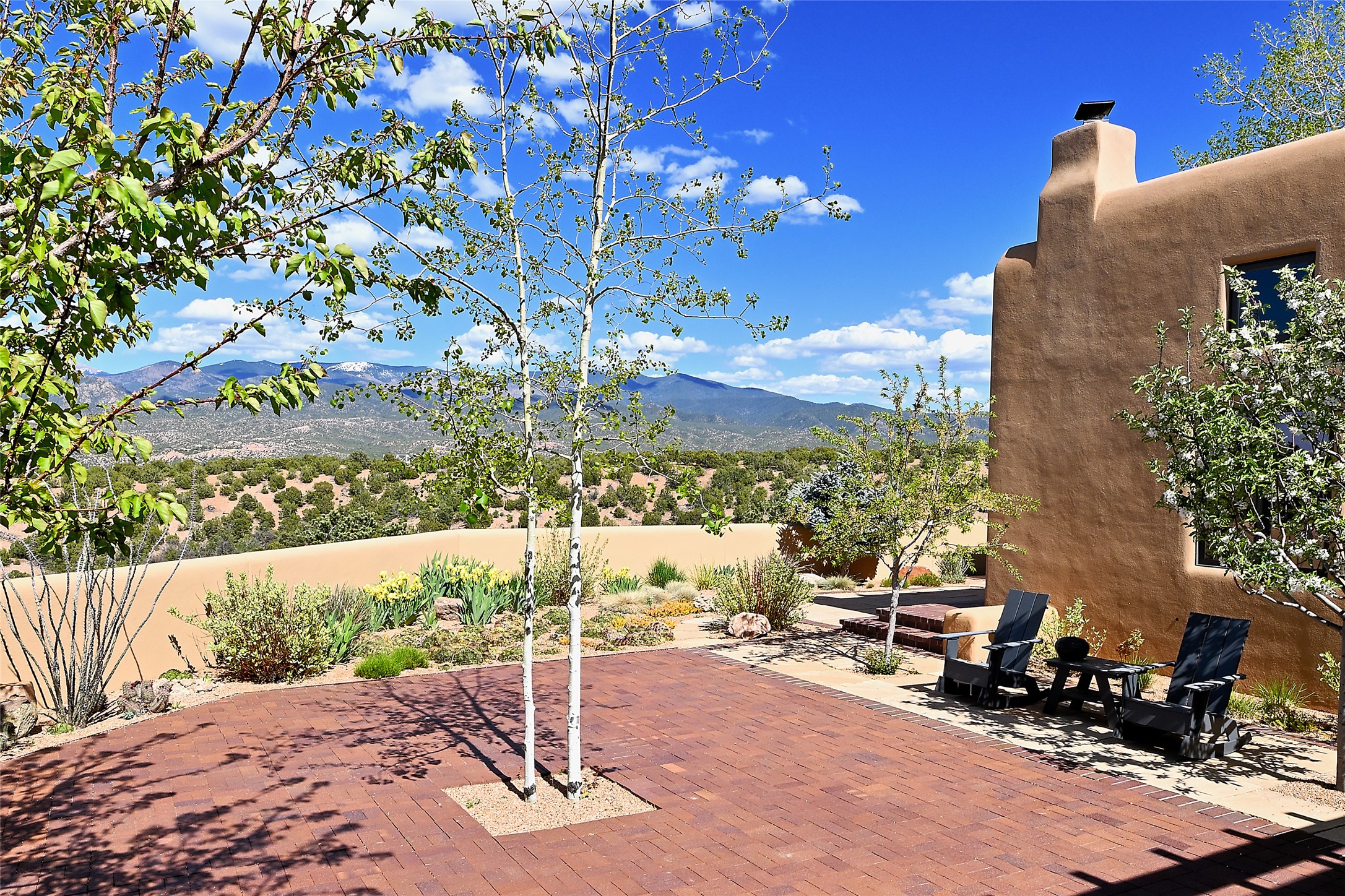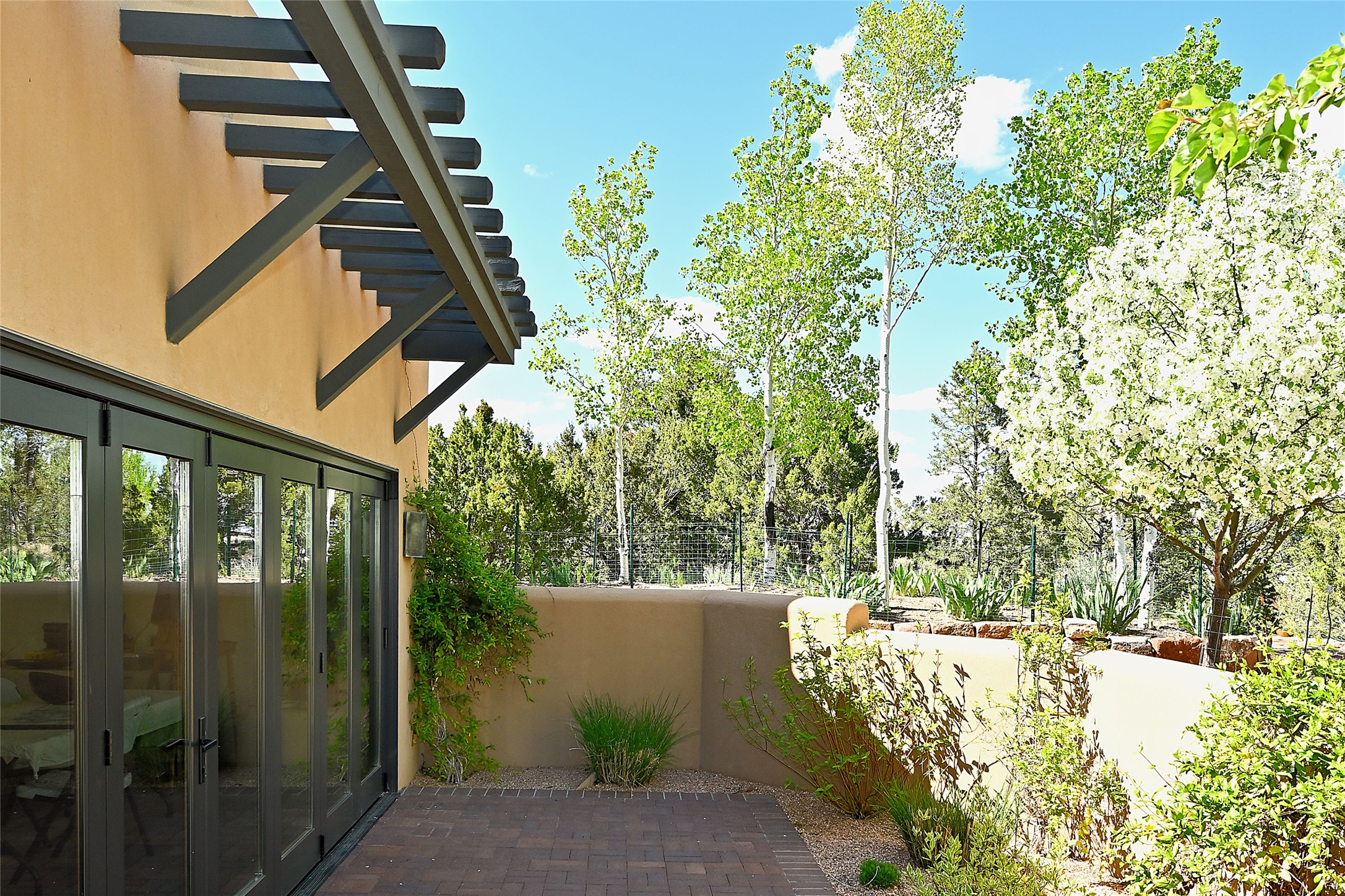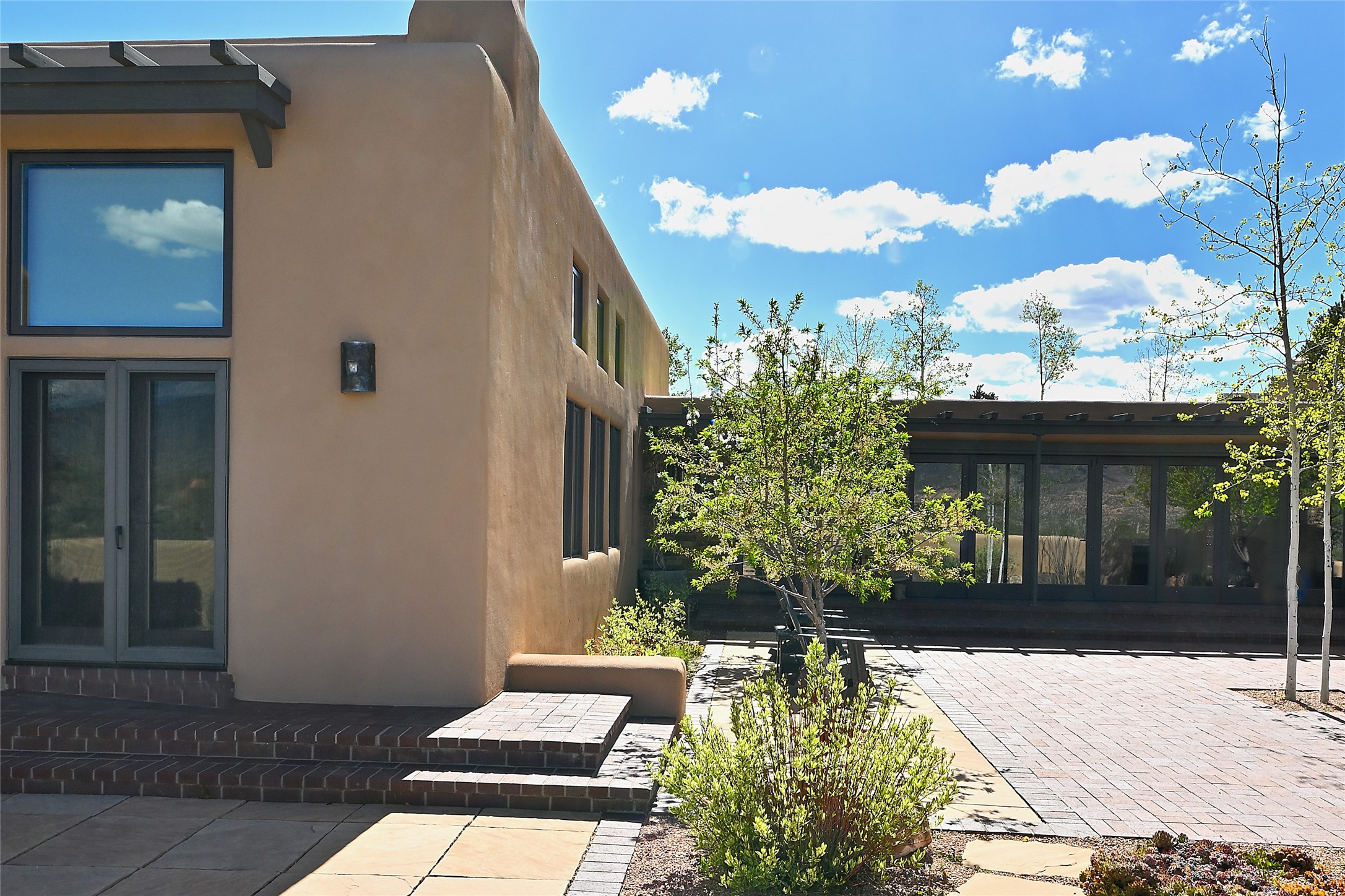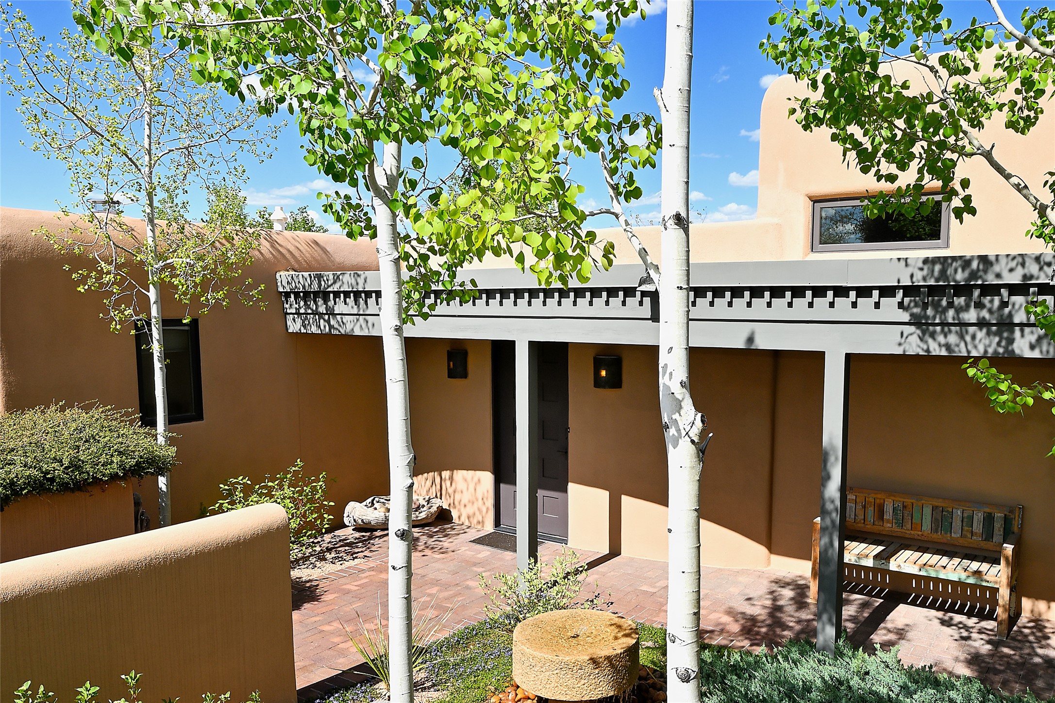 Located in the private gated community of Casas de San Juan--in the foothills adjacent to the renowned Santa Fe Opera and only minutes north of the historic Plaza, Canyon Road, and Museum Hill--this stunning four-bedroom four-bath retreat with new roof in November 2023 enjoys spectacular views from nearly every room. Robert Zachry designed the contemporary condominium, which encourages year-round indoor-outdoor living and is accompanied by a two-car garage. The open concept living, dining, and kitchen area has an easy flow and French doors opening to a brick and flagstone terrace, xeriscaped gardens, and basalt stone fountains. Transom windows and tall ceilings with vigas and beams create a bright, expansive ambience. The chef's kitchen features alder cabinets, superior appliances, and a casual breakfast bar. The gracious primary suite boasts custom closets and French doors to a terrace with panoramic views. One guest bedroom is warmed by a kiva fireplace and is adjoined by a sunroom or living area, while the third bedroom in the main house could also serve as an office, a media room, or a study. Secluded from the main residence is a one-room guest house with a kiva fireplace, a bath, and its own patio. The gated community is securely staffed. New roof in November 2023.