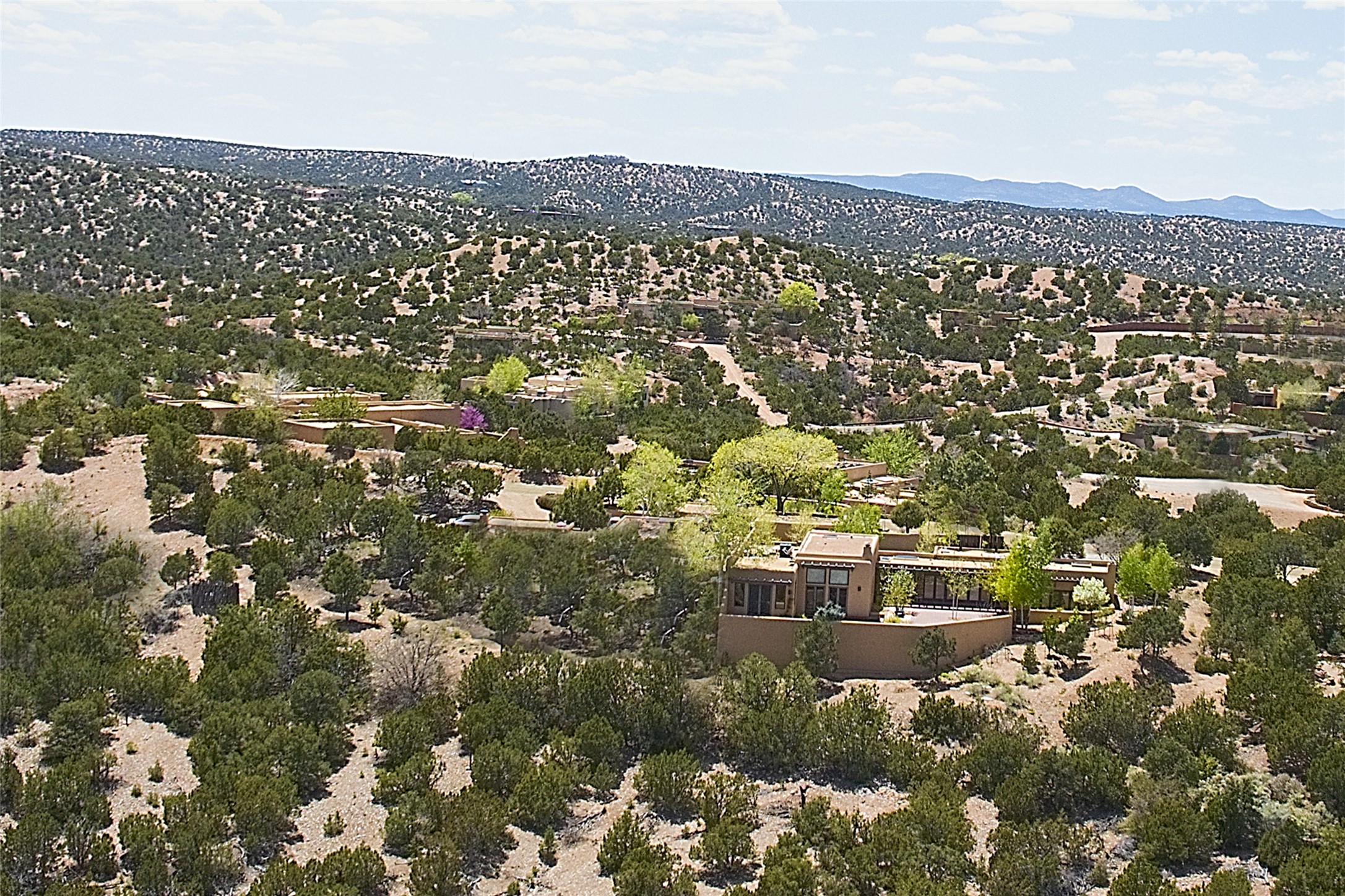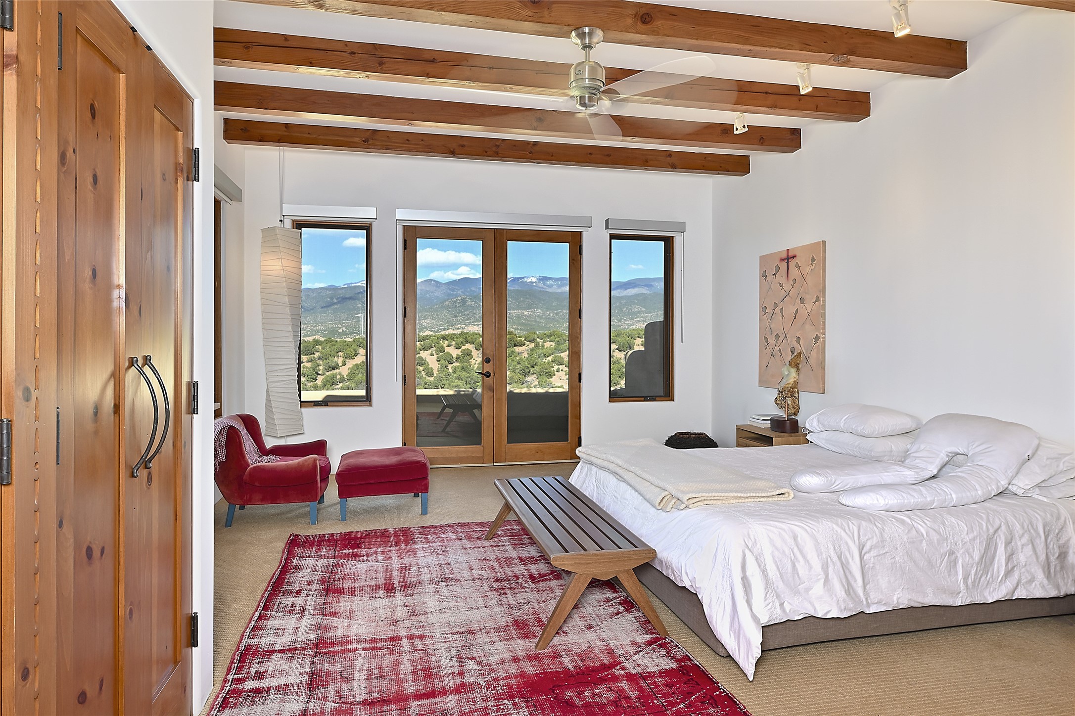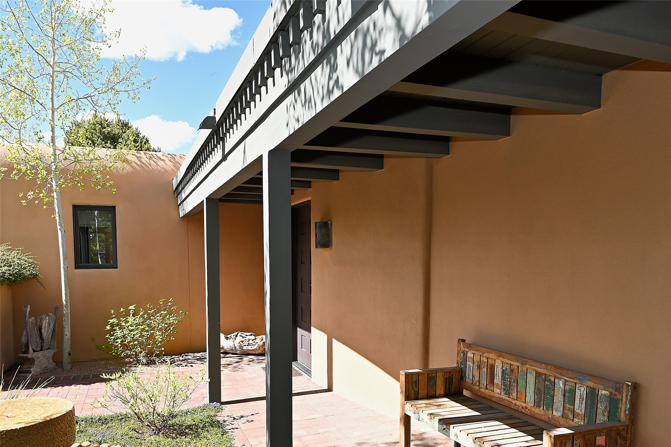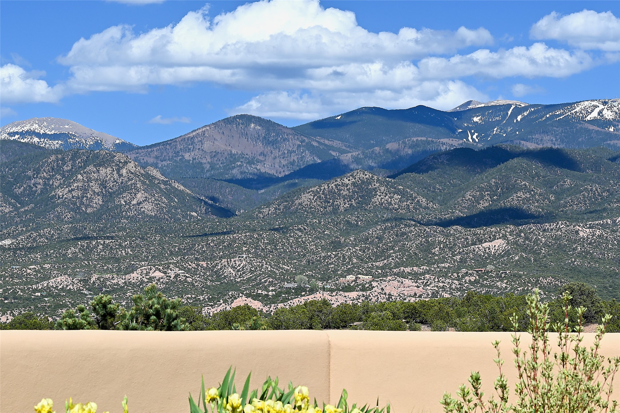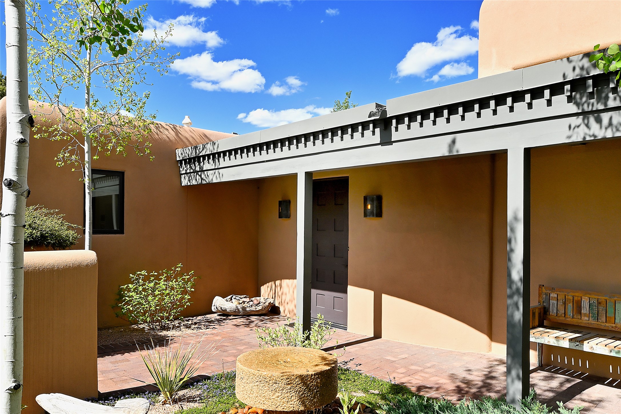 Located in the private gated community of Casas de San Juan--in the foothills adjacent to the renowned Santa Fe Opera and only minutes north of the historic Plaza, Canyon Road, and Museum Hill--this stunning four-bedroom four-bath retreat with new roof in November 2023 enjoys spectacular views from nearly every room. Robert Zachry designed the contemporary condominium, which encourages year-round indoor-outdoor living and is accompanied by a two-car garage. The open concept living, dining, and kitchen area has an easy flow and French doors opening to a brick and flagstone terrace, xeriscaped gardens, and basalt stone fountains. Transom windows and tall ceilings with vigas and beams create a bright, expansive ambience. The chef's kitchen features alder cabinets, superior appliances, and a casual breakfast bar. The gracious primary suite boasts custom closets and French doors to a terrace with panoramic views. One guest bedroom is warmed by a kiva fireplace and is adjoined by a sunroom or living area, while the third bedroom in the main house could also serve as an office, a media room, or a study. Secluded from the main residence is a one-room guest house with a kiva fireplace, a bath, and its own patio. The gated community is securely staffed. New roof in November 2023.