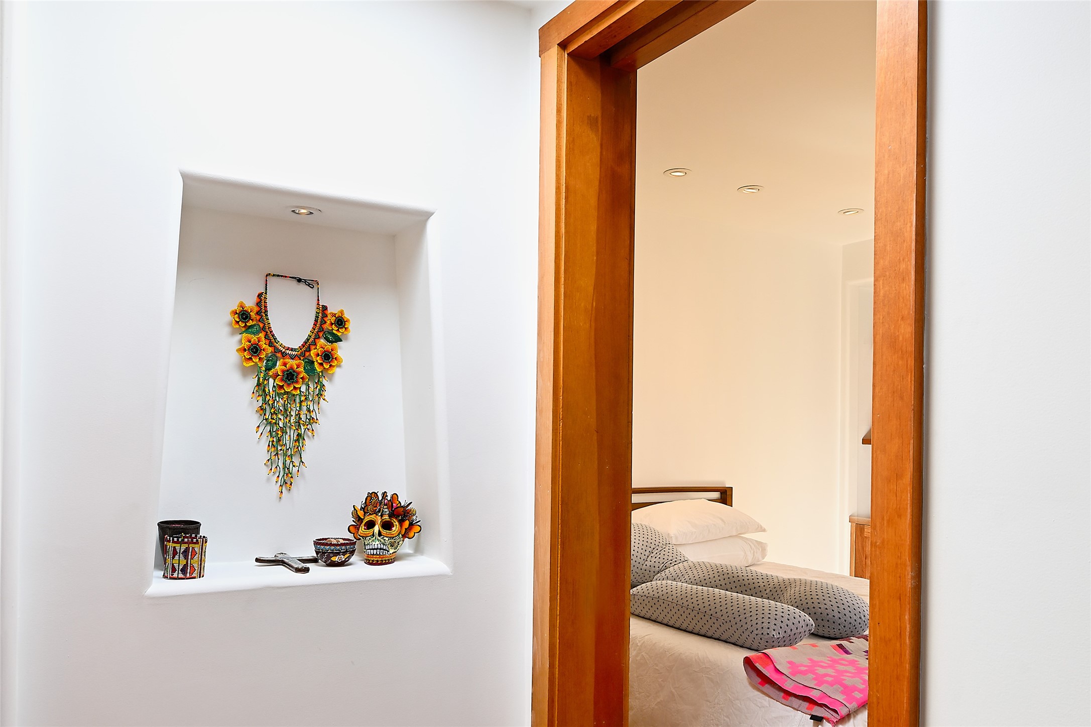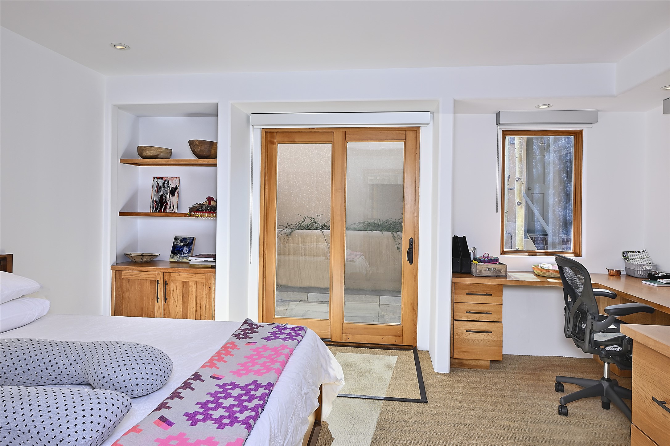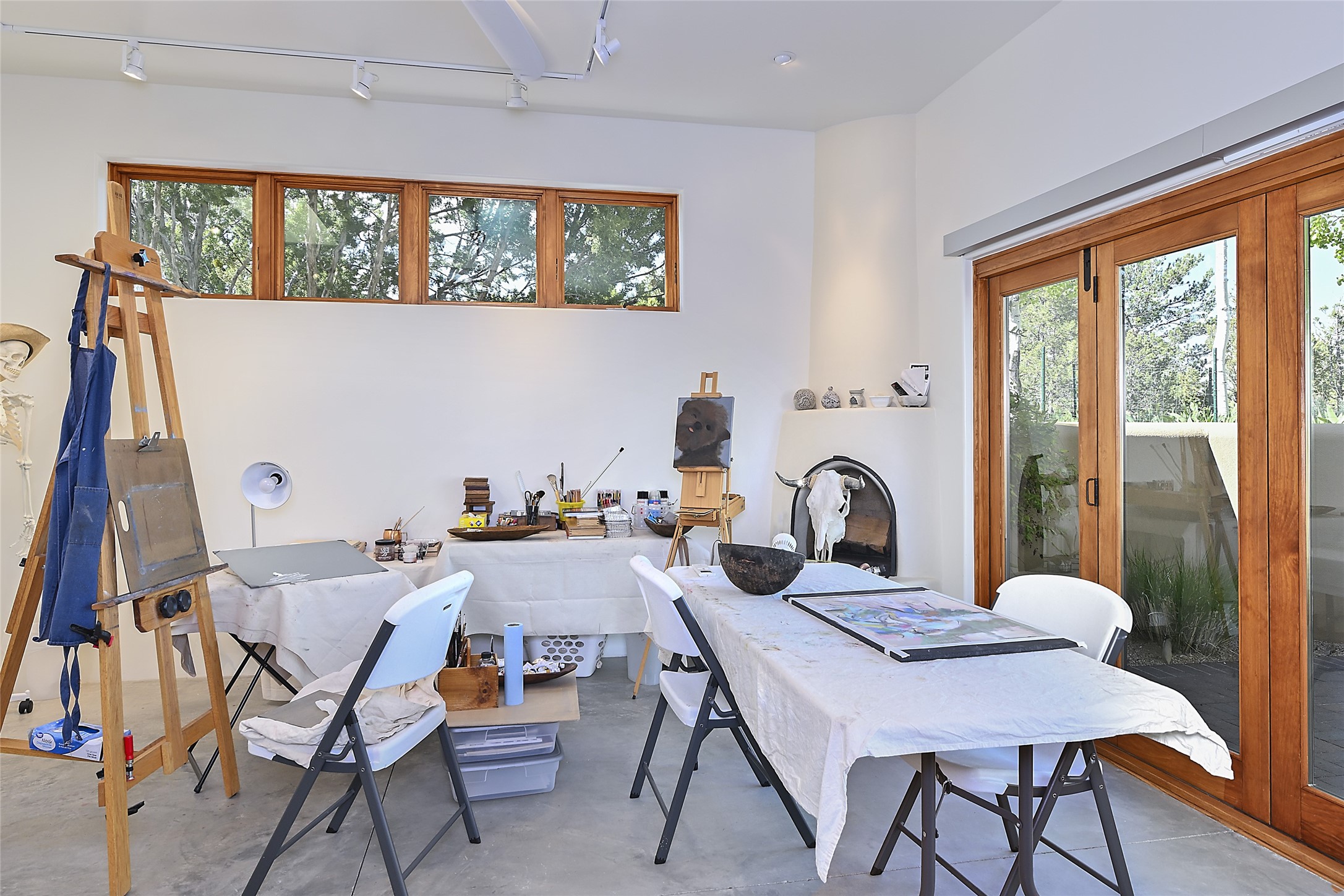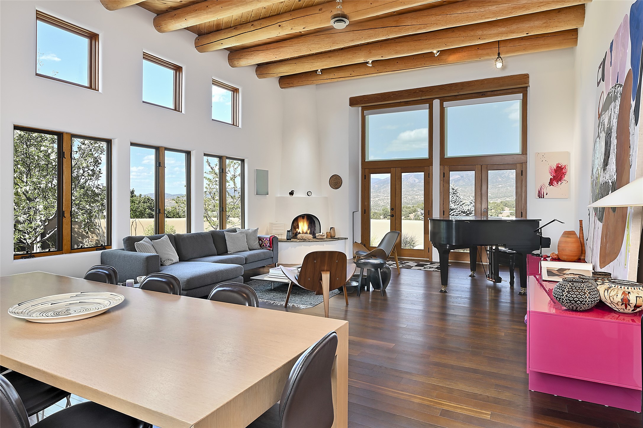 Located in the private gated community of Casas de San Juan--in the foothills adjacent to the renowned Santa Fe Opera and only minutes north of the historic Plaza, Canyon Road, and Museum Hill--this stunning four-bedroom four-bath retreat with new roof in November 2023 enjoys spectacular views from nearly every room. Robert Zachry designed the contemporary condominium, which encourages year-round indoor-outdoor living and is accompanied by a two-car garage. The open concept living, dining, and kitchen area has an easy flow and French doors opening to a brick and flagstone terrace, xeriscaped gardens, and basalt stone fountains. Transom windows and tall ceilings with vigas and beams create a bright, expansive ambience. The chef's kitchen features alder cabinets, superior appliances, and a casual breakfast bar. The gracious primary suite boasts custom closets and French doors to a terrace with panoramic views. One guest bedroom is warmed by a kiva fireplace and is adjoined by a sunroom or living area, while the third bedroom in the main house could also serve as an office, a media room, or a study. Secluded from the main residence is a one-room guest house with a kiva fireplace, a bath, and its own patio. The gated community is securely staffed. New roof in November 2023.