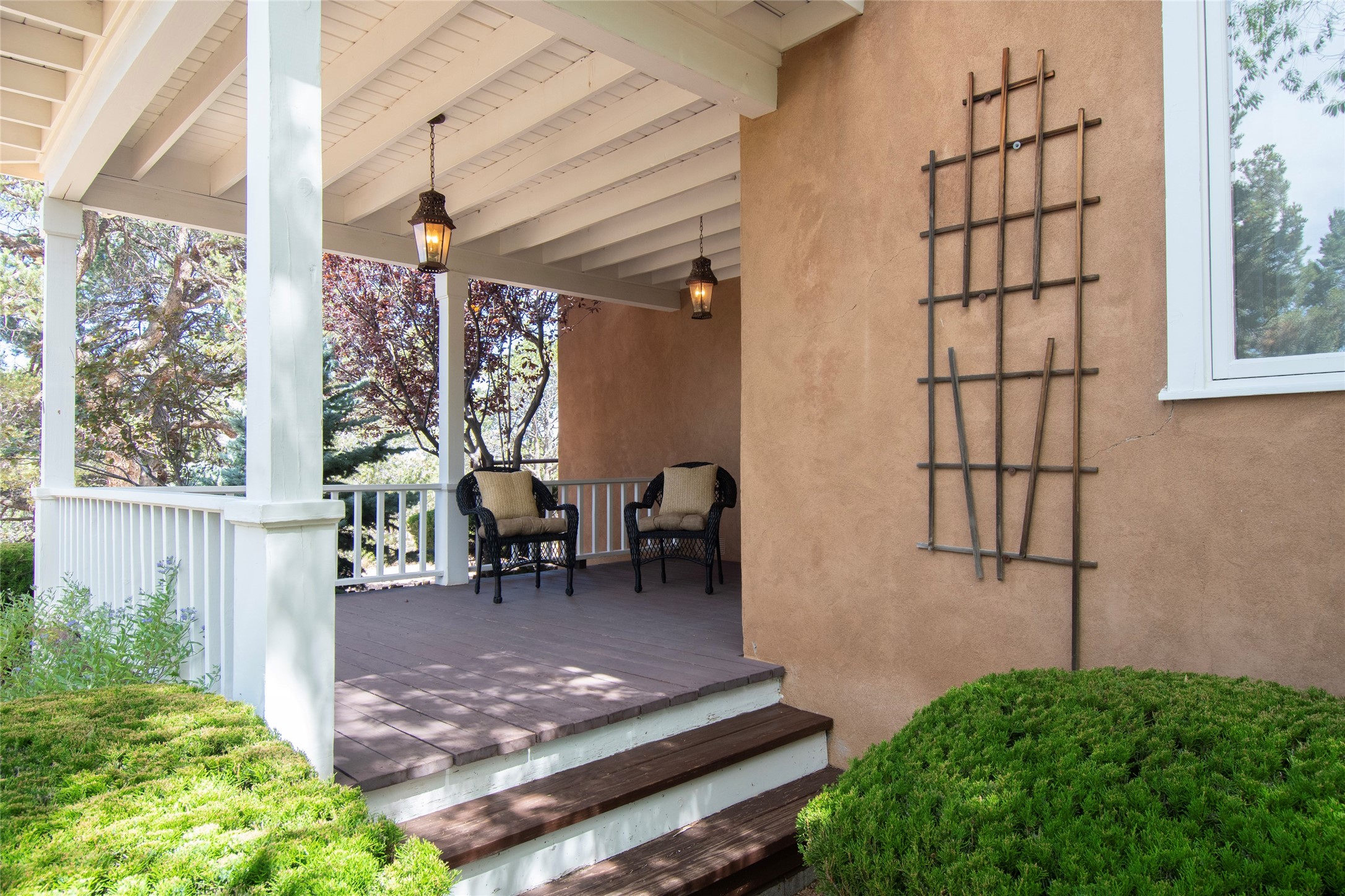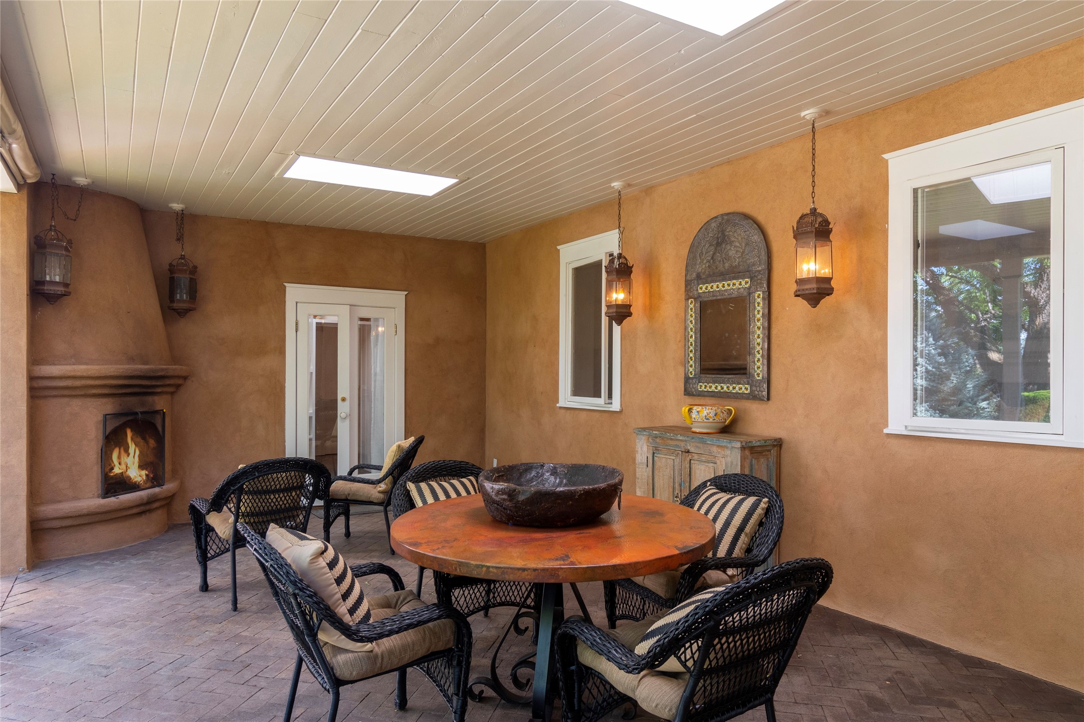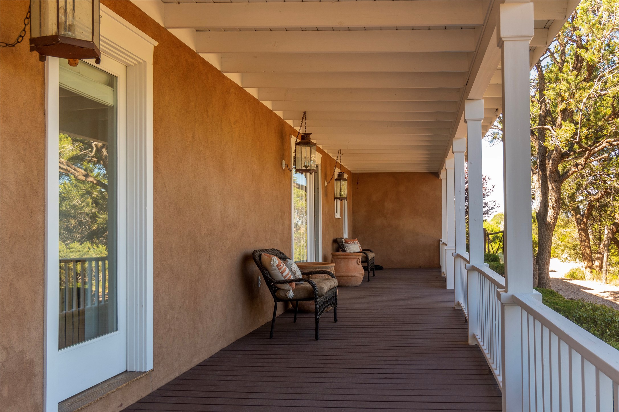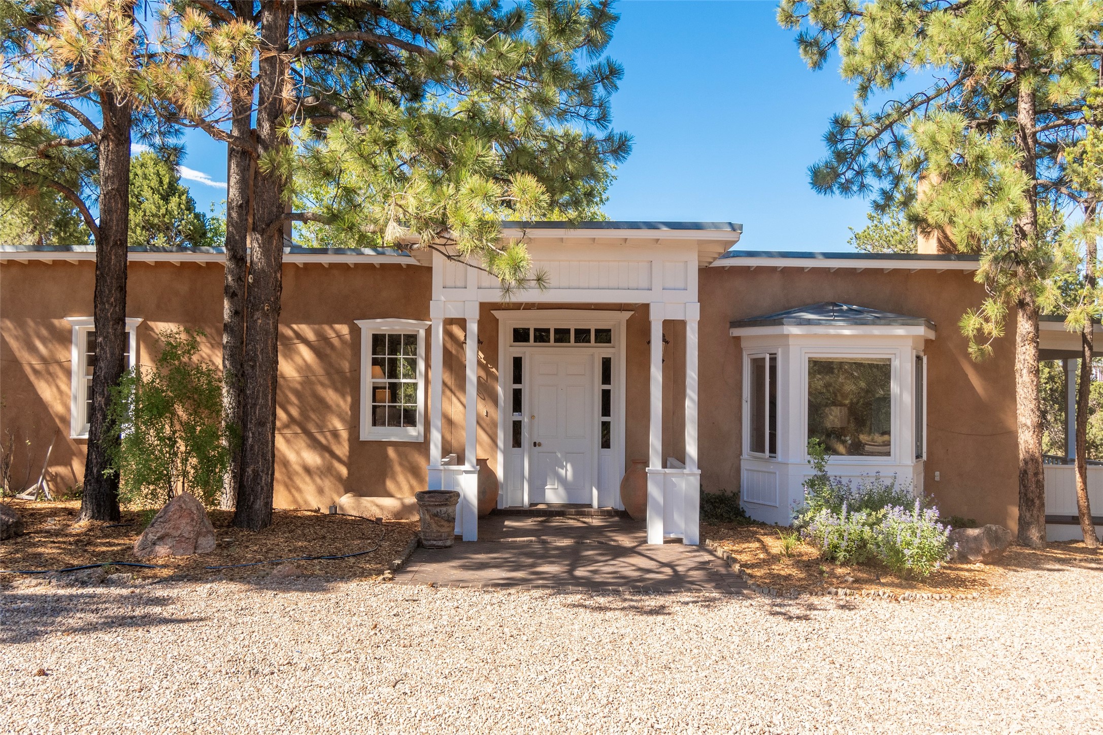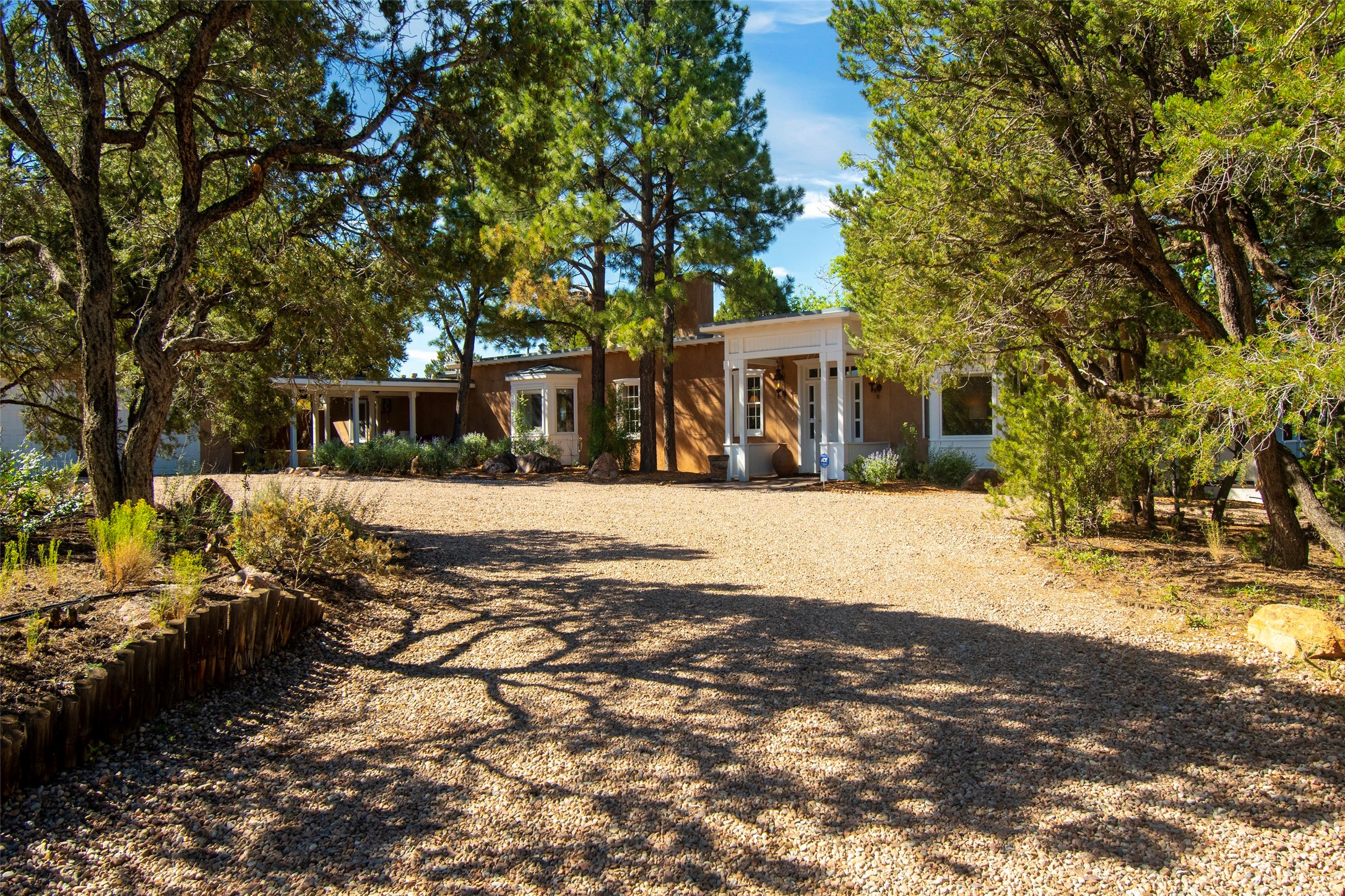 Nestled among mature trees, this classic New Mexico Territorial-style home rests on 2.788 acres of beautiful land with stellar views of Sangre de Cristo, Sandia and Ortiz Mountains. In the 3,600 sq. ft. main house a long, lovely, bricked entry hallway connects many of the rooms. Here there are 3 bedrooms, 4 bathrooms, separate office, living room, formal dining room, and a good-sized eat-in kitchen. The quiet, primary bedroom suite has a media room, full walk-in closet and private portal. There are 6 fireplaces, including one on a wide portal off the living room, so nearly every room is warm and inviting on cold winter nights. There are several portals to enjoy the views and the great Northern New Mexico weather. The guest house (753 sq. ft.) is a one bedroom, one bath home with a living/dining room, separate kitchen, and private patio. A covered brick walkway leads from the two houses to a 2-car garage. Nearby, a 1,059 sq. ft. detached garage/studio stands alone just waiting to make your dreams come true as a studio, shop, or an antique car showroom. Privately located in the historic Eastside of Santa Fe this home is just minutes from hiking trails, Museum Hill, Canyon Road and the Downtown Plaza.