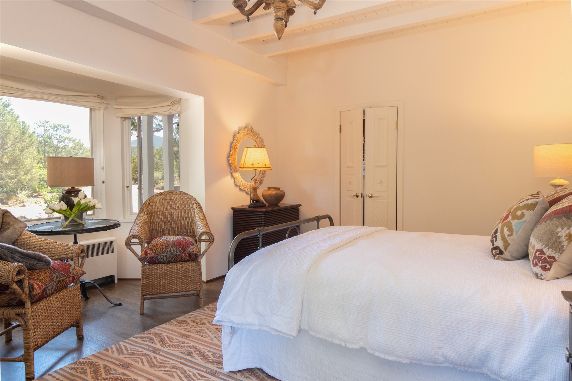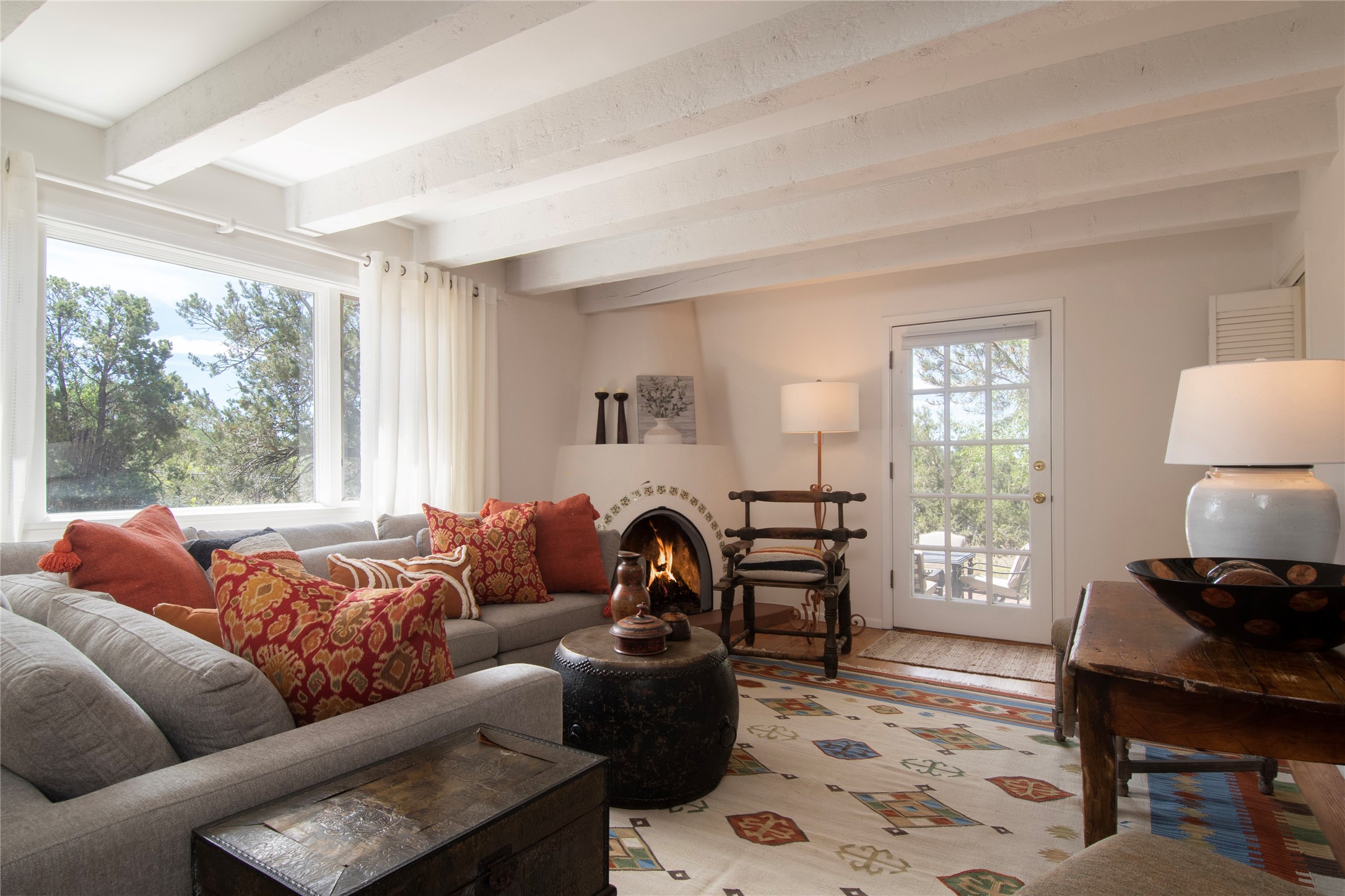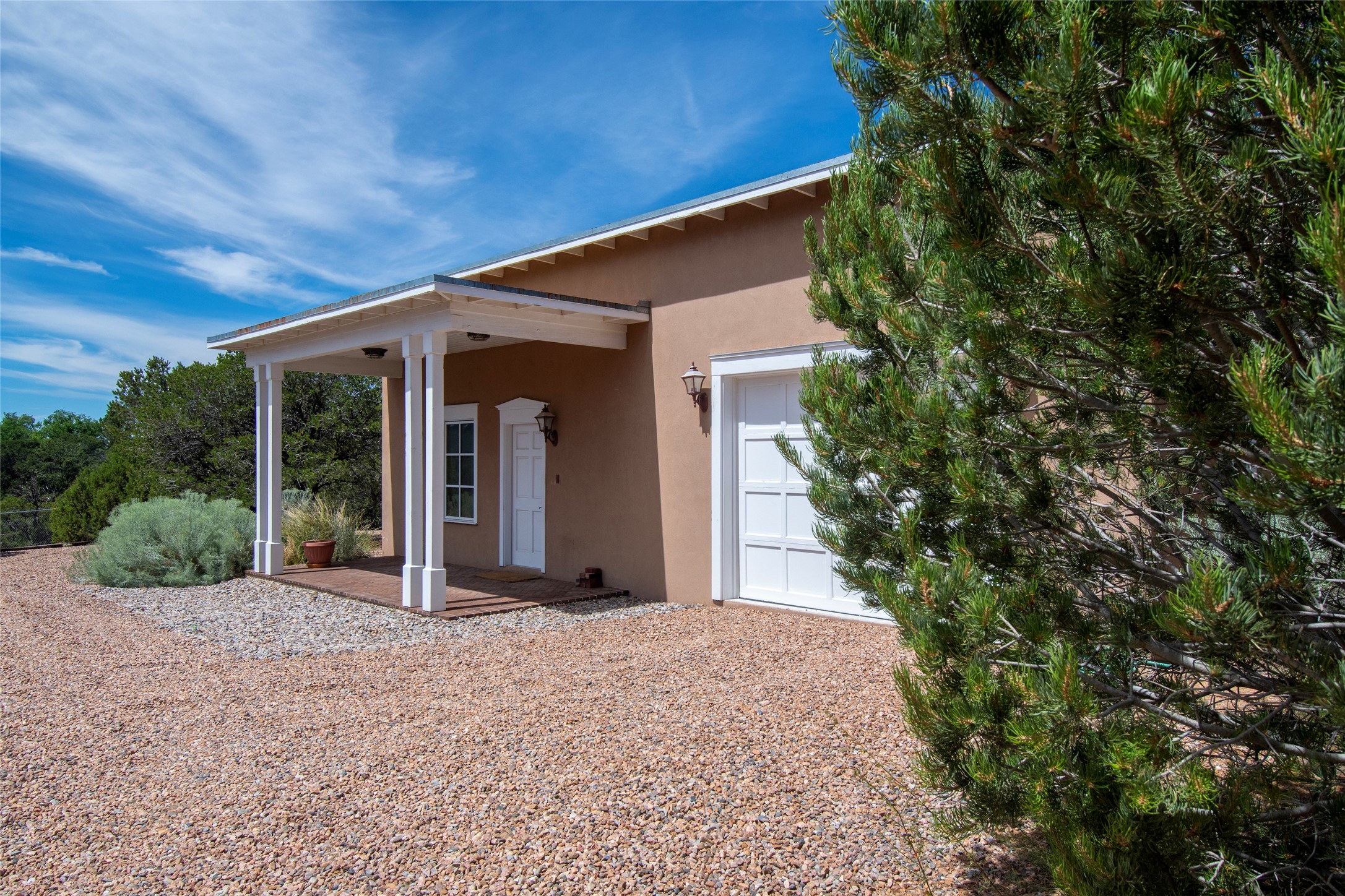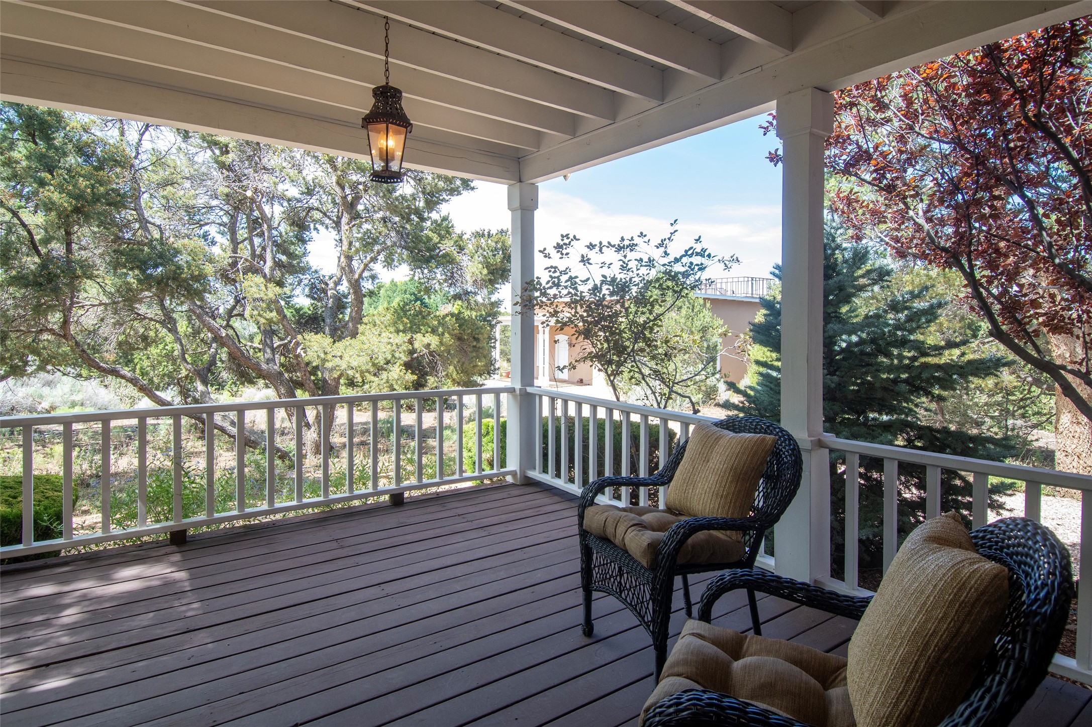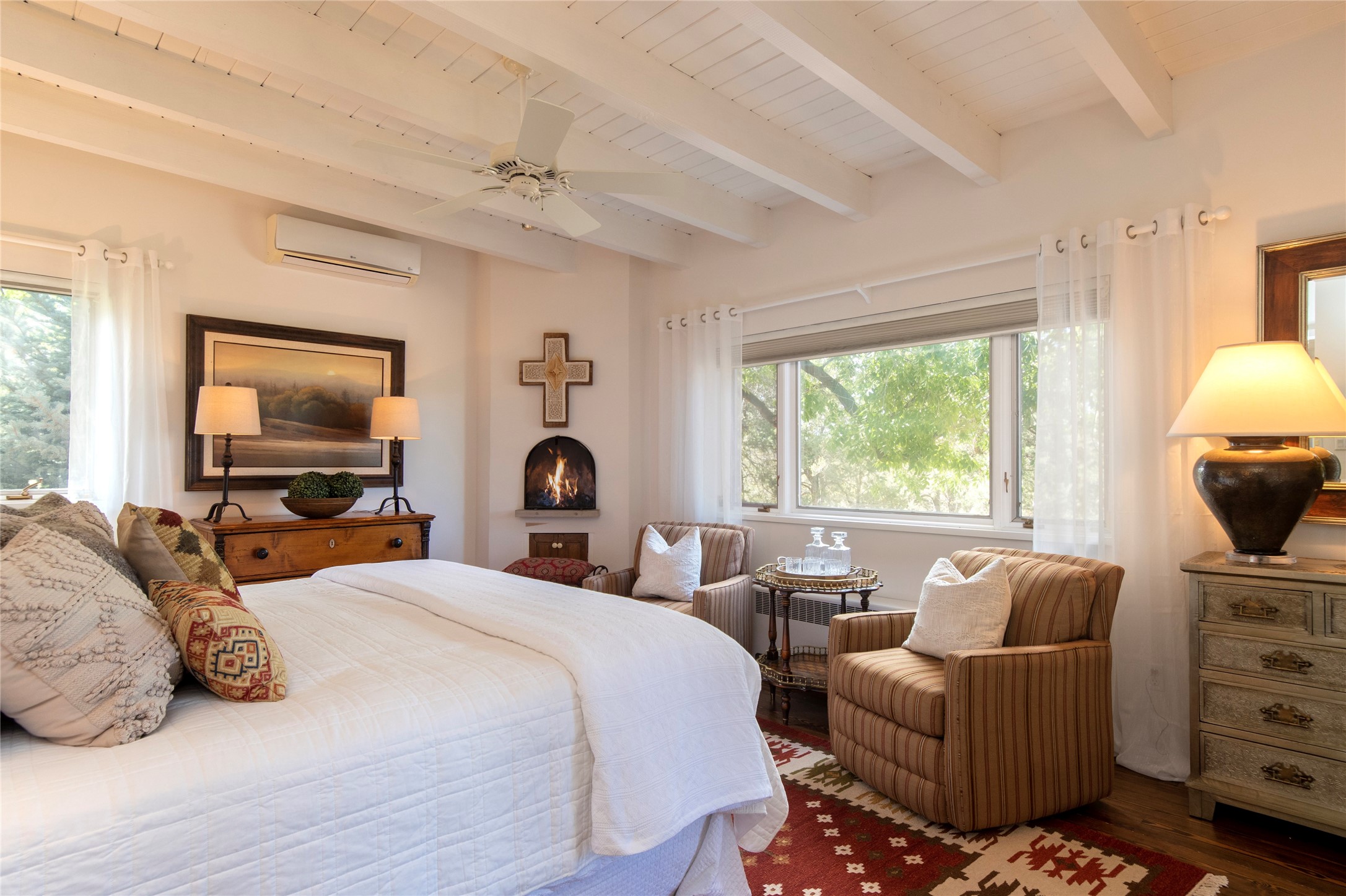Nestled among mature trees, this classic New Mexico Territorial-style home rests on 2.788 acres of beautiful land with stellar views of Sangre de Cristo, Sandia and Ortiz Mountains. In the 3,600 sq. ft. main house a long, lovely, bricked entry hallway connects many of the rooms. Here there are 3 bedrooms, 4 bathrooms, separate office, living room, formal dining room, and a good-sized eat-in kitchen. The quiet, primary bedroom suite has a media room, full walk-in closet and private portal. There are 6 fireplaces, including one on a wide portal off the living room, so nearly every room is warm and inviting on cold winter nights. There are several portals to enjoy the views and the great Northern New Mexico weather. The guest house (753 sq. ft.) is a one bedroom, one bath home with a living/dining room, separate kitchen, and private patio. A covered brick walkway leads from the two houses to a 2-car garage. Nearby, a 1,059 sq. ft. detached garage/studio stands alone just waiting to make your dreams come true as a studio, shop, or an antique car showroom. Privately located in the historic Eastside of Santa Fe this home is just minutes from hiking trails, Museum Hill, Canyon Road and the Downtown Plaza.