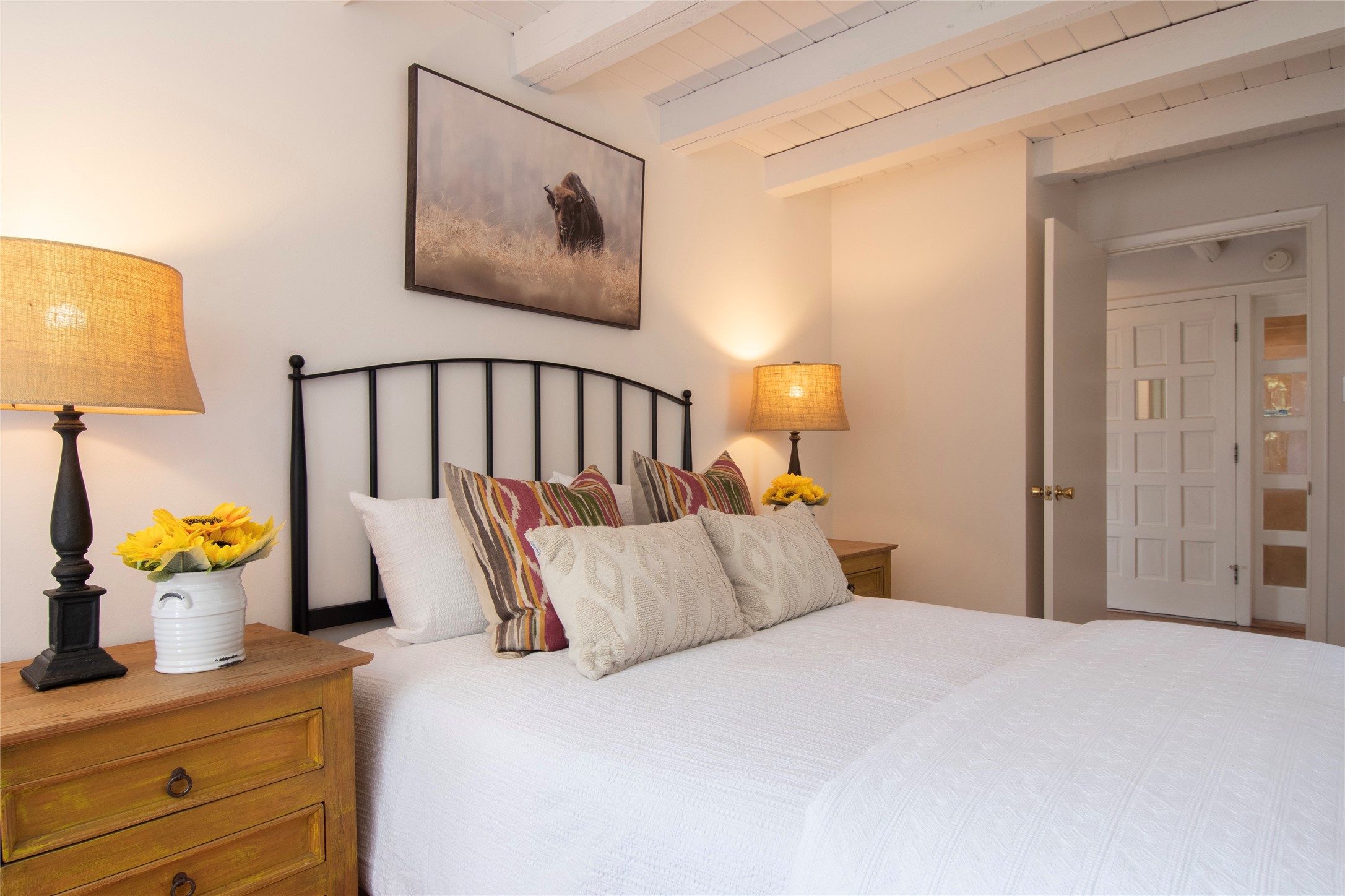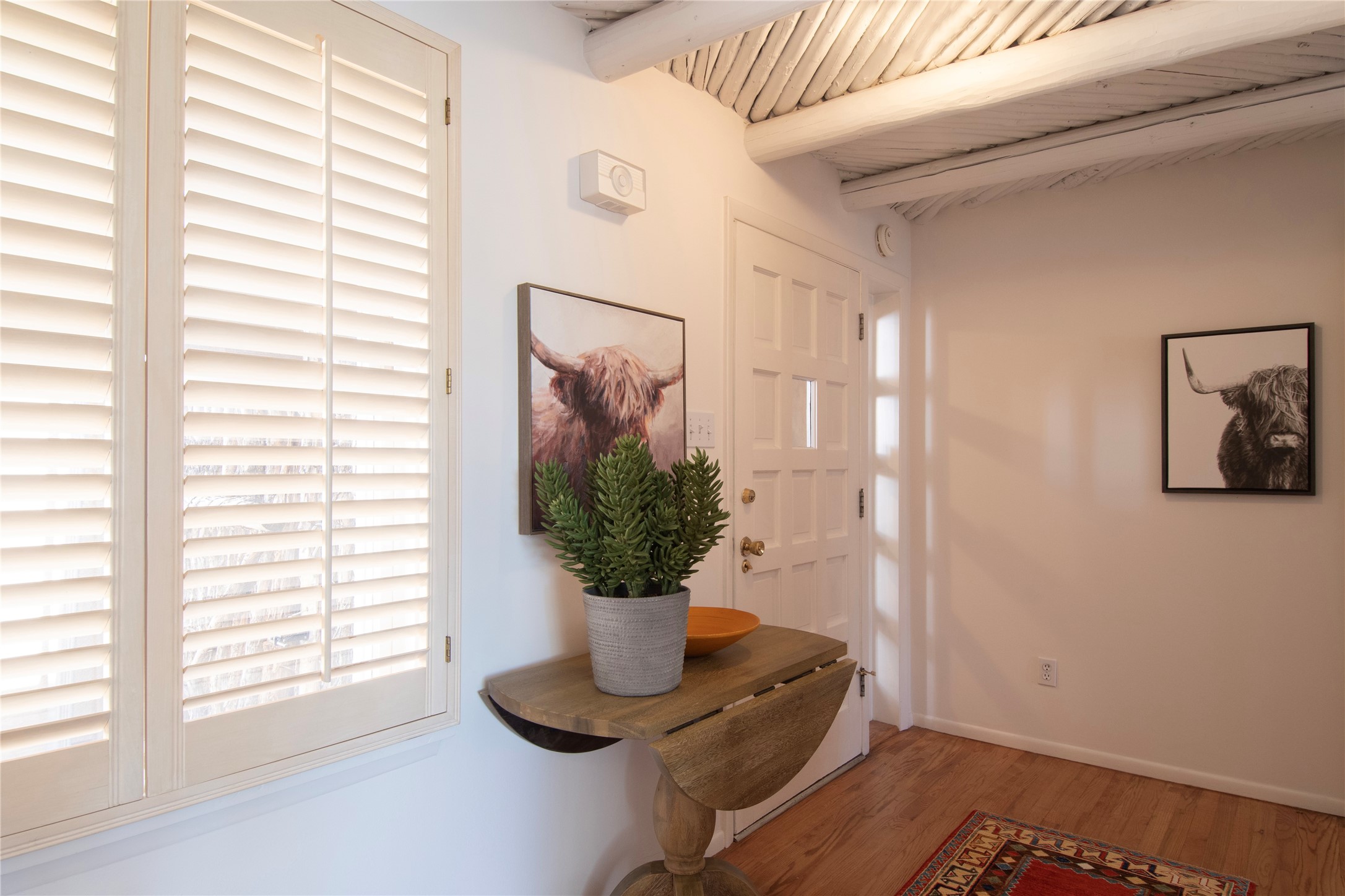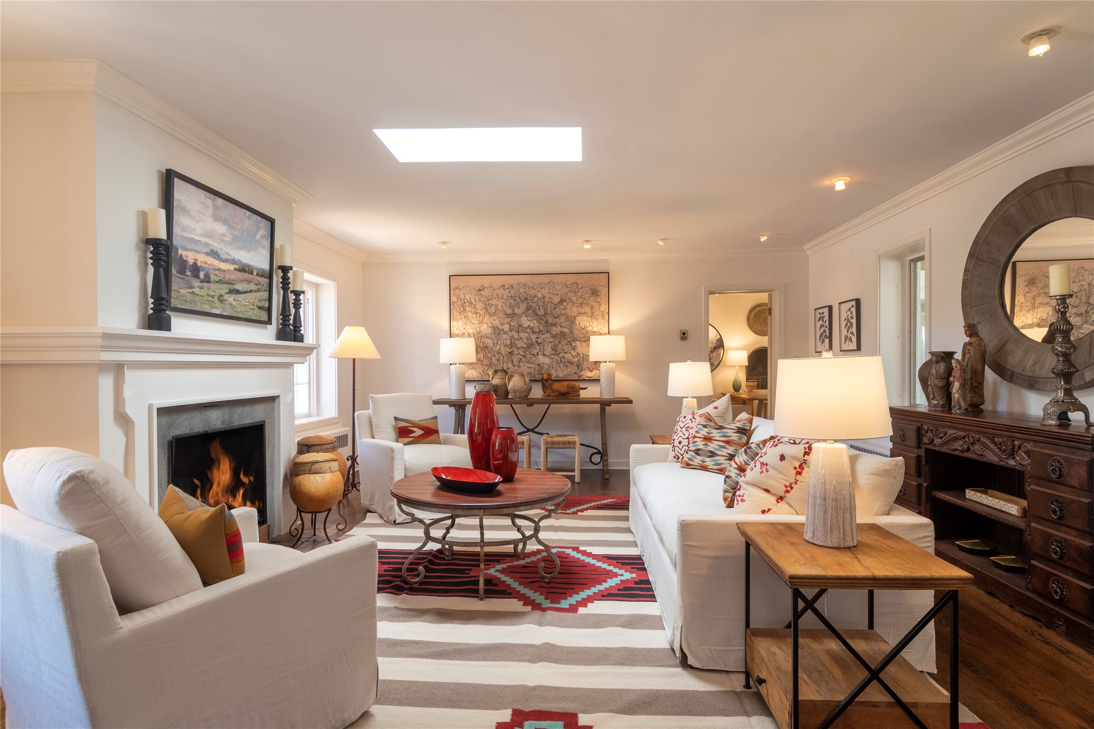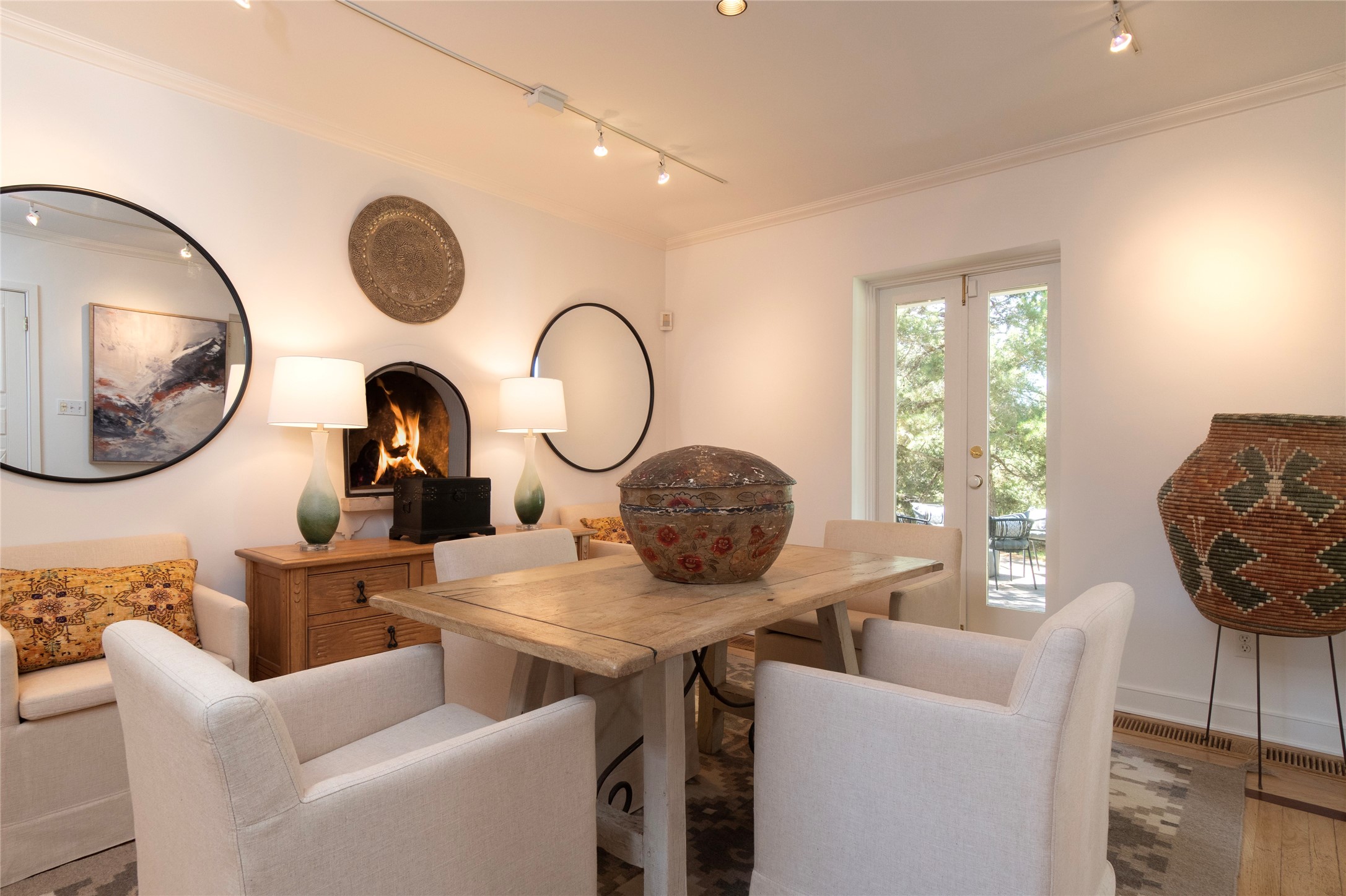 Nestled among mature trees, this classic New Mexico Territorial-style home rests on 2.788 acres of beautiful land with stellar views of Sangre de Cristo, Sandia and Ortiz Mountains. In the 3,600 sq. ft. main house a long, lovely, bricked entry hallway connects many of the rooms. Here there are 3 bedrooms, 4 bathrooms, separate office, living room, formal dining room, and a good-sized eat-in kitchen. The quiet, primary bedroom suite has a media room, full walk-in closet and private portal. There are 6 fireplaces, including one on a wide portal off the living room, so nearly every room is warm and inviting on cold winter nights. There are several portals to enjoy the views and the great Northern New Mexico weather. The guest house (753 sq. ft.) is a one bedroom, one bath home with a living/dining room, separate kitchen, and private patio. A covered brick walkway leads from the two houses to a 2-car garage. Nearby, a 1,059 sq. ft. detached garage/studio stands alone just waiting to make your dreams come true as a studio, shop, or an antique car showroom. Privately located in the historic Eastside of Santa Fe this home is just minutes from hiking trails, Museum Hill, Canyon Road and the Downtown Plaza.