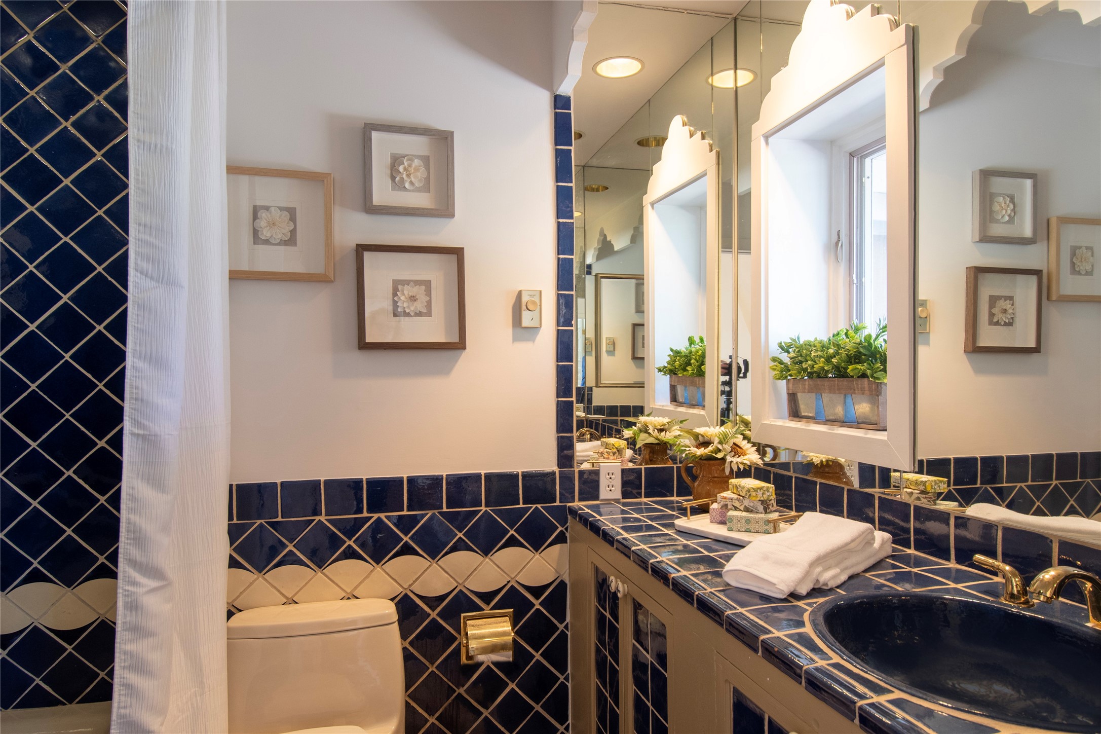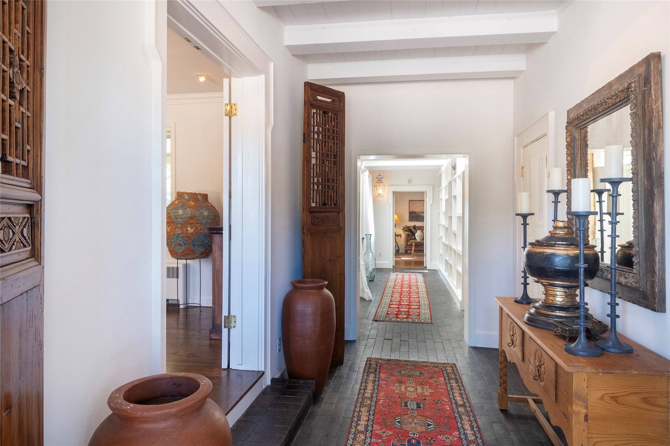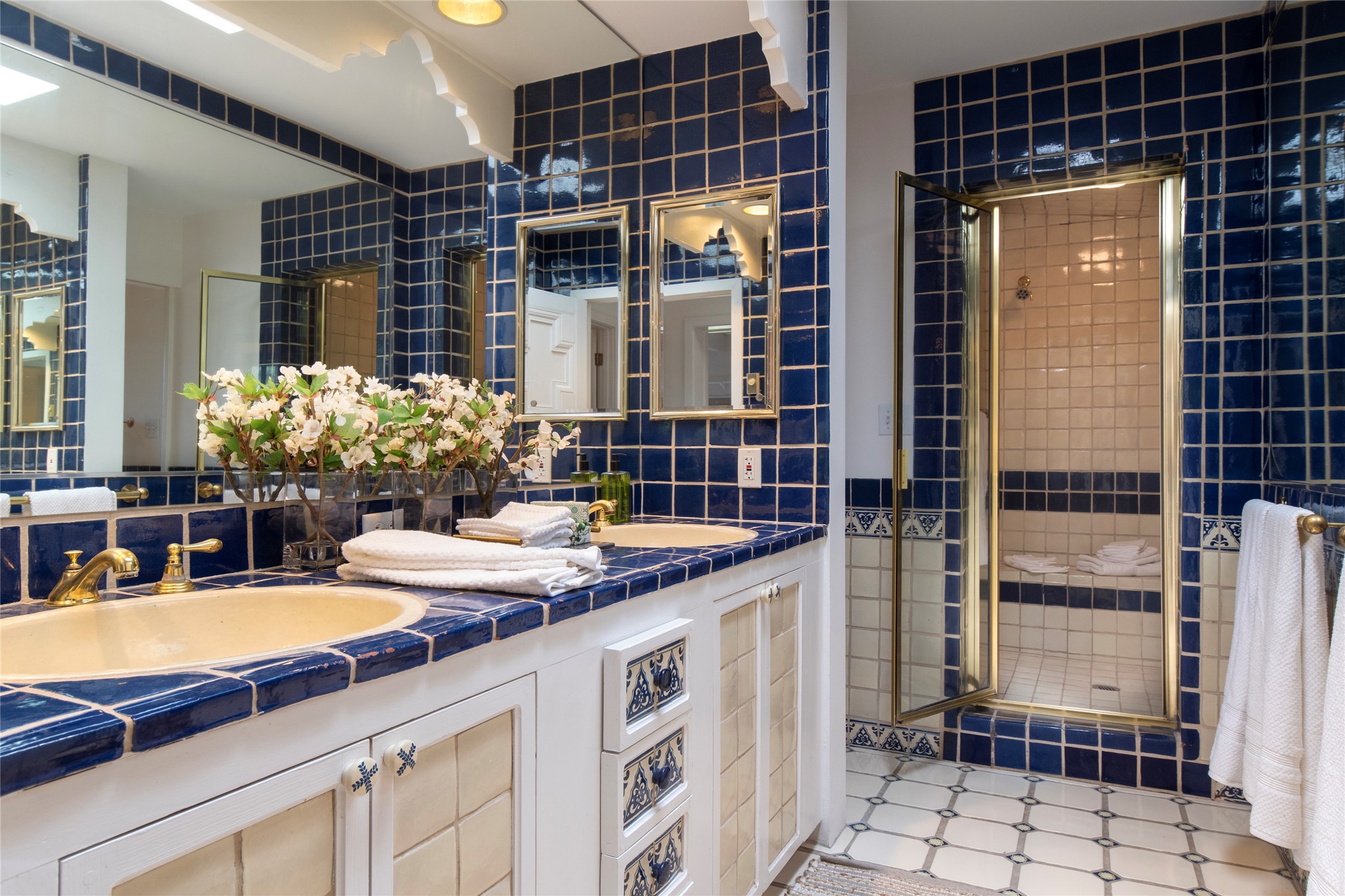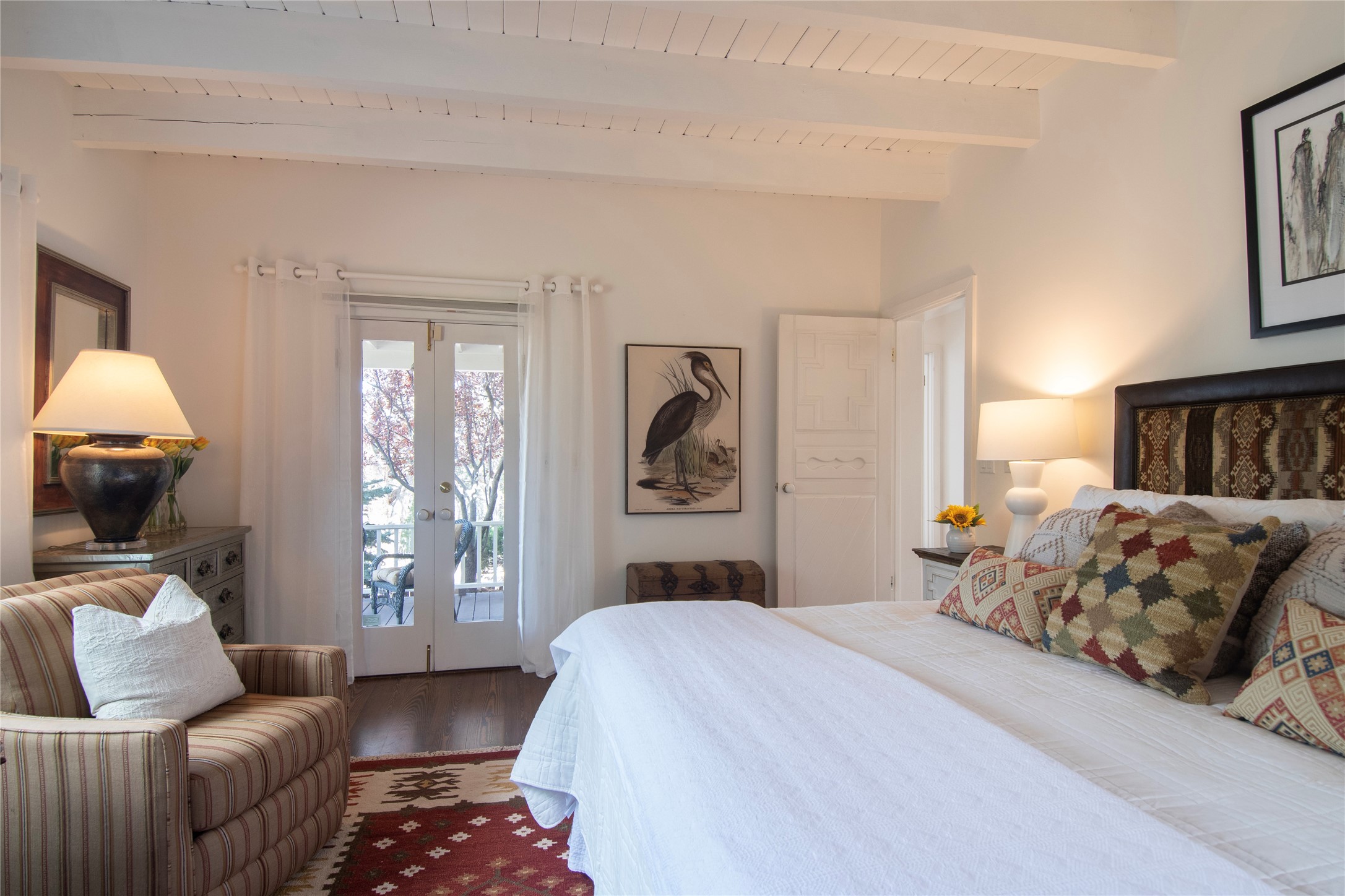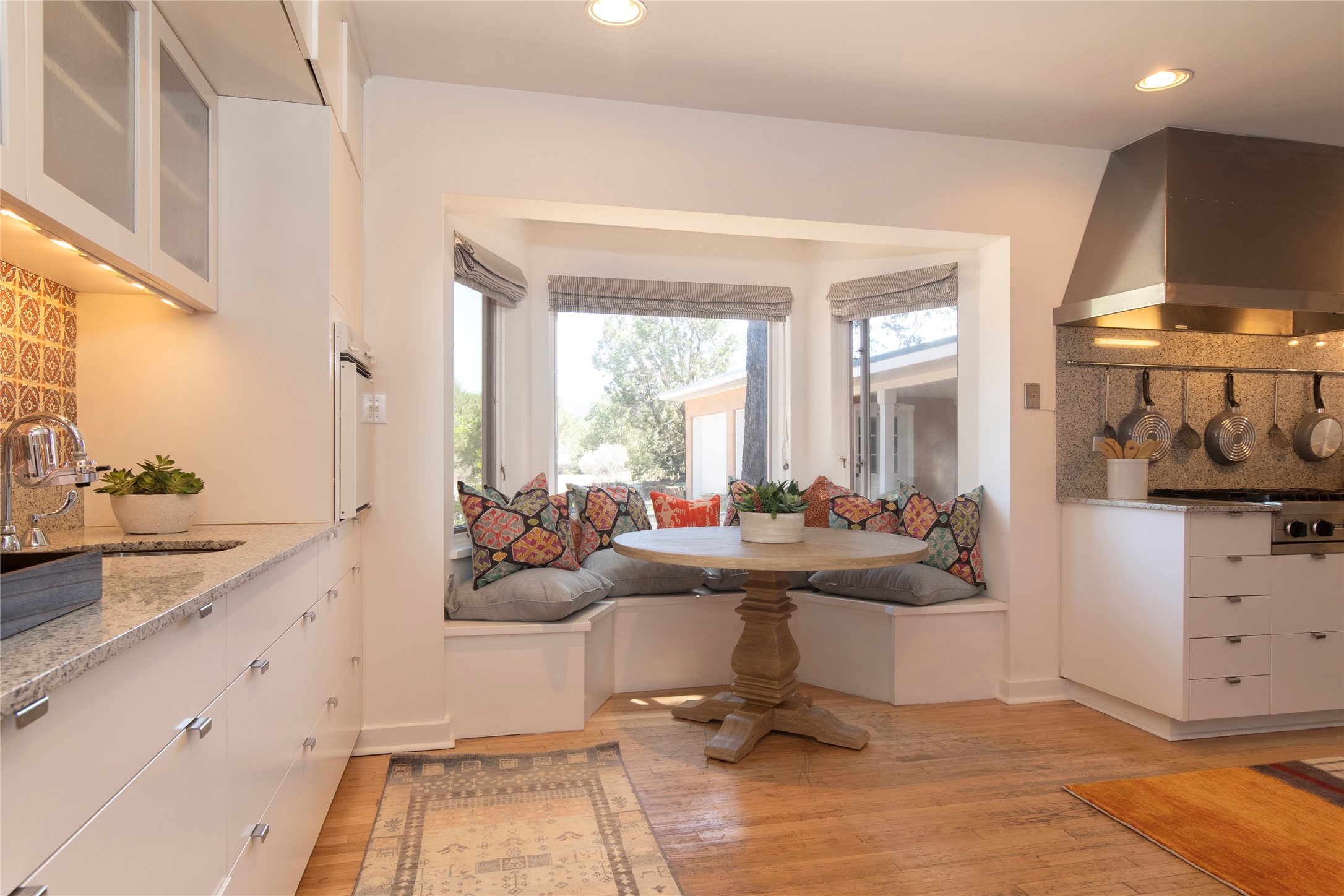 Nestled among mature trees, this classic New Mexico Territorial-style home rests on 2.788 acres of beautiful land with stellar views of Sangre de Cristo, Sandia and Ortiz Mountains. In the 3,600 sq. ft. main house a long, lovely, bricked entry hallway connects many of the rooms. Here there are 3 bedrooms, 4 bathrooms, separate office, living room, formal dining room, and a good-sized eat-in kitchen. The quiet, primary bedroom suite has a media room, full walk-in closet and private portal. There are 6 fireplaces, including one on a wide portal off the living room, so nearly every room is warm and inviting on cold winter nights. There are several portals to enjoy the views and the great Northern New Mexico weather. The guest house (753 sq. ft.) is a one bedroom, one bath home with a living/dining room, separate kitchen, and private patio. A covered brick walkway leads from the two houses to a 2-car garage. Nearby, a 1,059 sq. ft. detached garage/studio stands alone just waiting to make your dreams come true as a studio, shop, or an antique car showroom. Privately located in the historic Eastside of Santa Fe this home is just minutes from hiking trails, Museum Hill, Canyon Road and the Downtown Plaza.