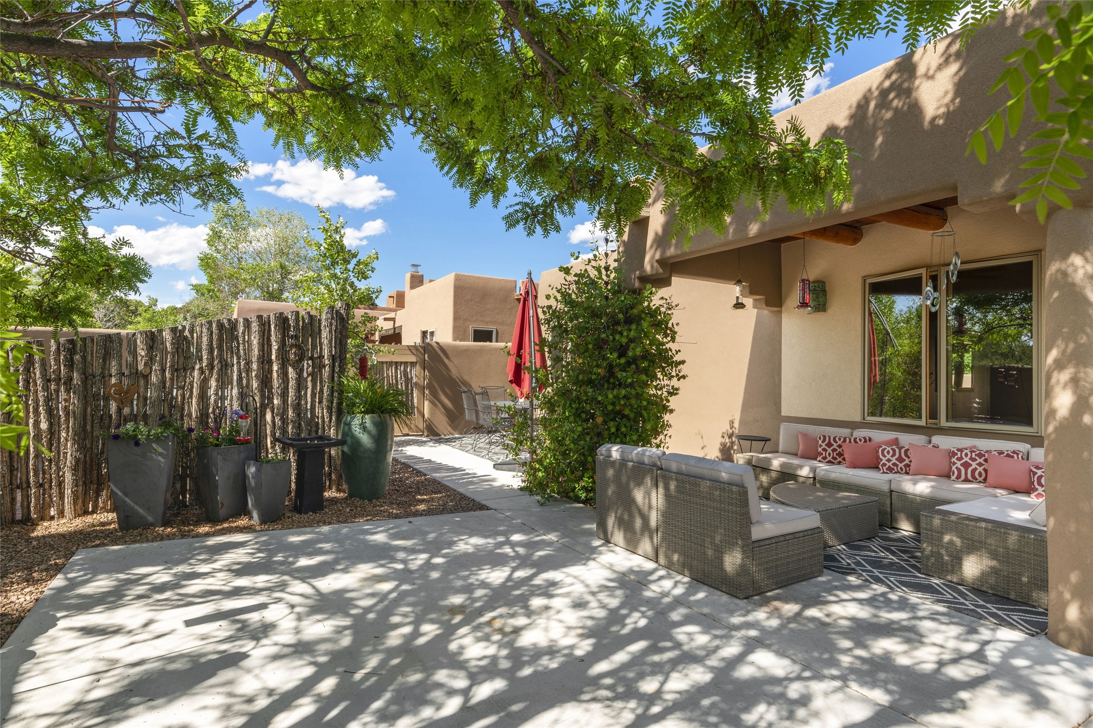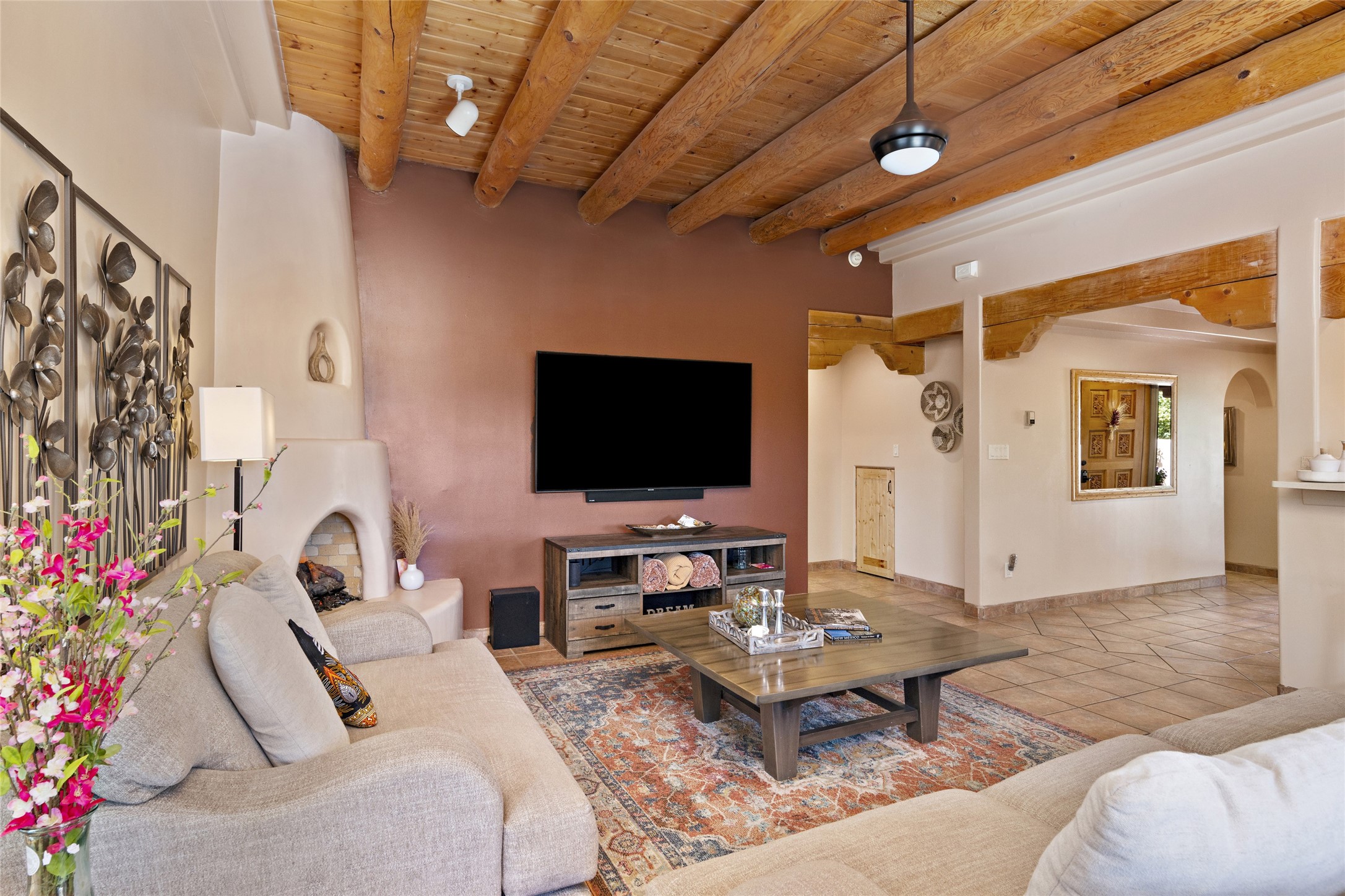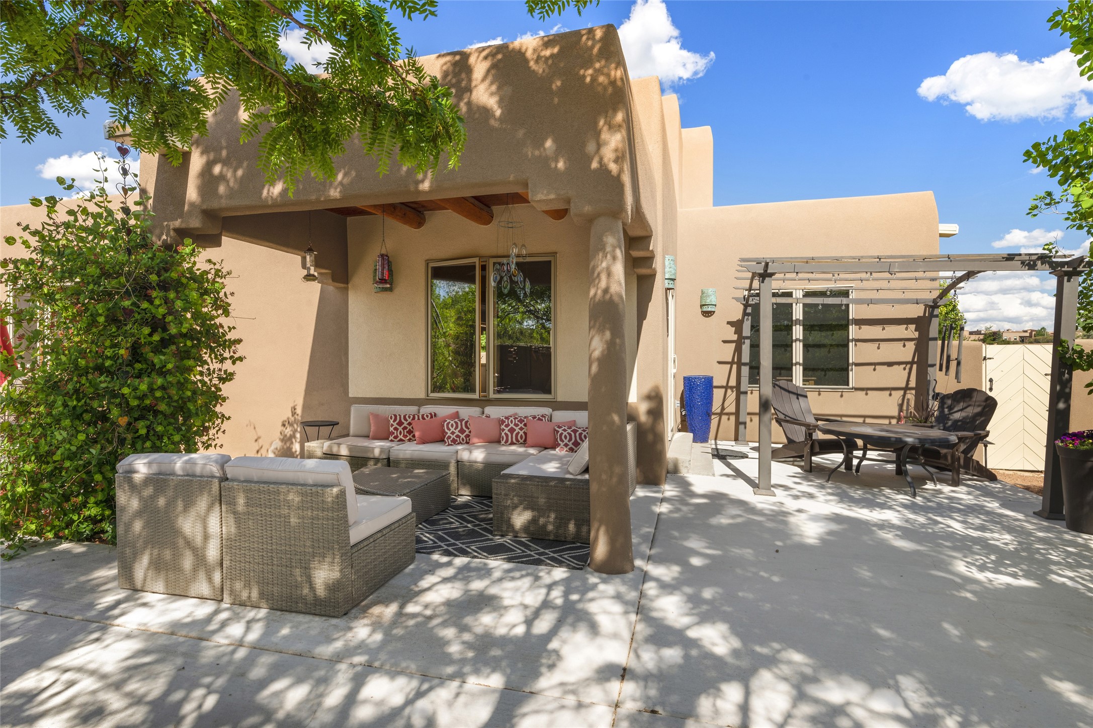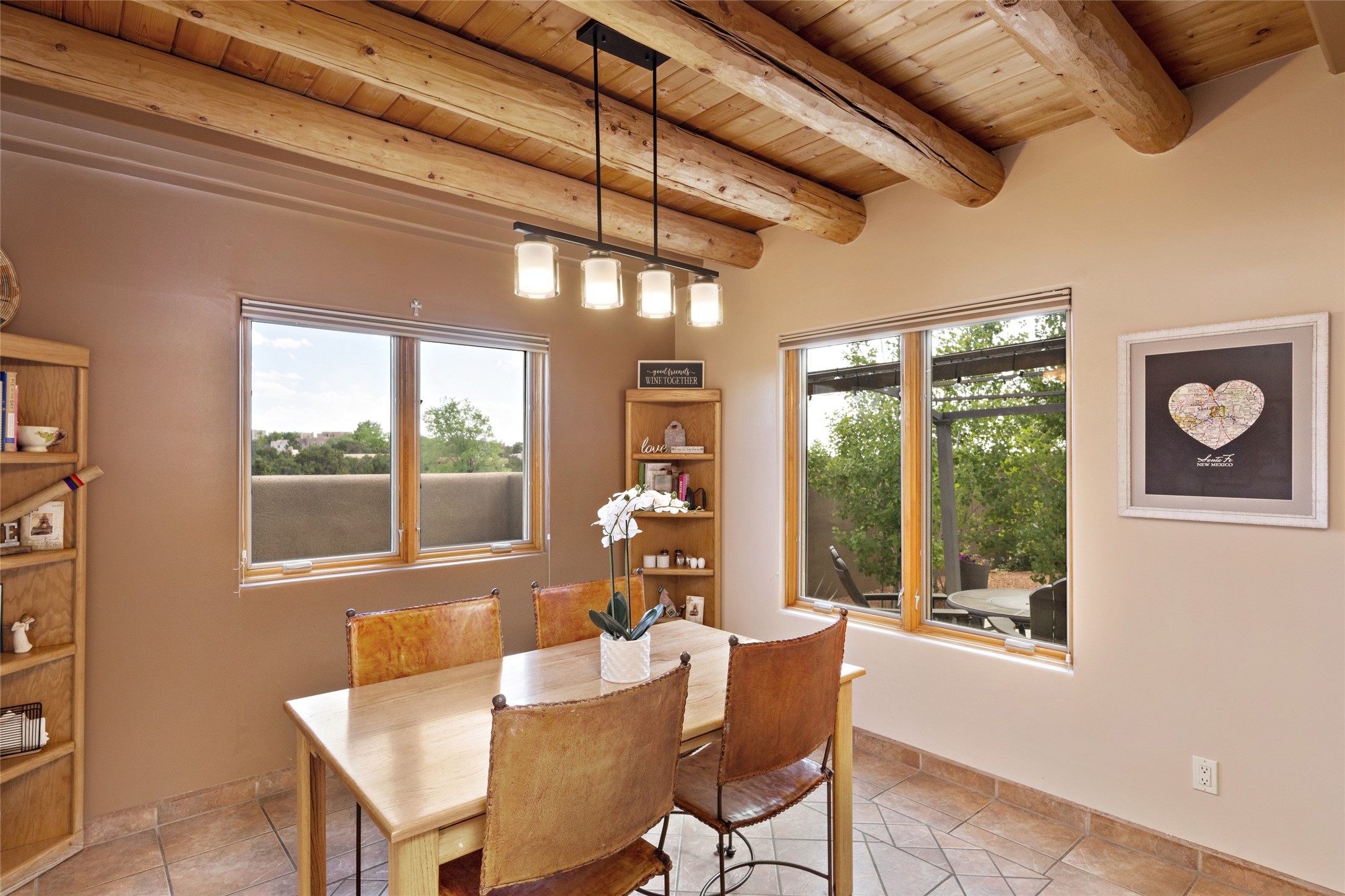 This immaculate residence, thoughtfully curated and lovingly maintained by its original owner can now be yours. Nestled in the coveted Pueblos Del Sol neighborhood, this remarkable home has been meticulously maintained. With freshly stucco, and a new roof (with a warranty) this property is like a brand new home. Immerse yourself in the authentic Santa Fe ambiance with artisan corbels, vigas, and a cozy kiva fireplace in the living space. The kitchen is a dream for culinary enthusiasts, featuring new appliances and an elegant white quartz countertop. You'll have the option of both a formal dining area and an informal breakfast bar, perfect for every dining occasion. This splendid home 3-bedroom, 3.5-bathroom residence is a masterpiece of comfort and style. Each bedroom boasts its own en-suite bathroom, offering unparalleled convenience and privacy. Radiant heating and easily maintainable tile floors ensure year-round comfort and simplicity.No detail has been spared in the meticulous updates throughout the home. The primary bathroom is a lavish sanctuary, featuring a luxurious soaking tub for moments of ultimate relaxation. Beyond the enchanting interior, this property sits on an exceptionally rare corner lot, meticulously landscaped to create outdoor living spaces designed to relish our delightful climate.Conveniently located, this home offers easy access to walking trails, restaurants, shopping, and top-notch schools. Discover the ultimate Pueblos Del Sol living experience in this unrivaled residence.