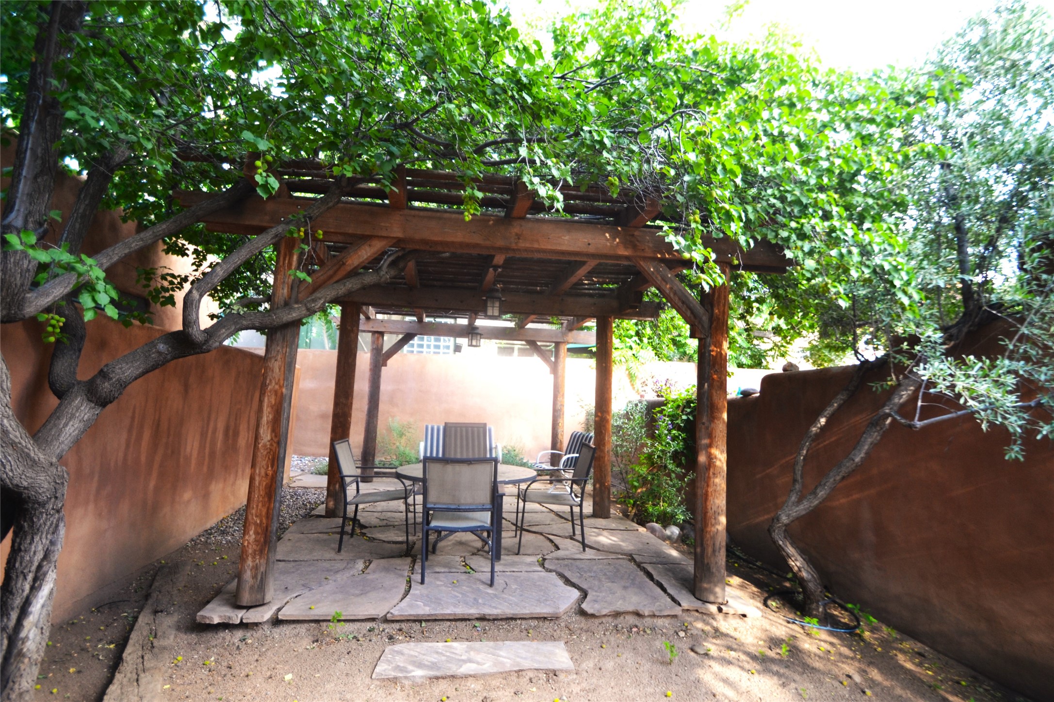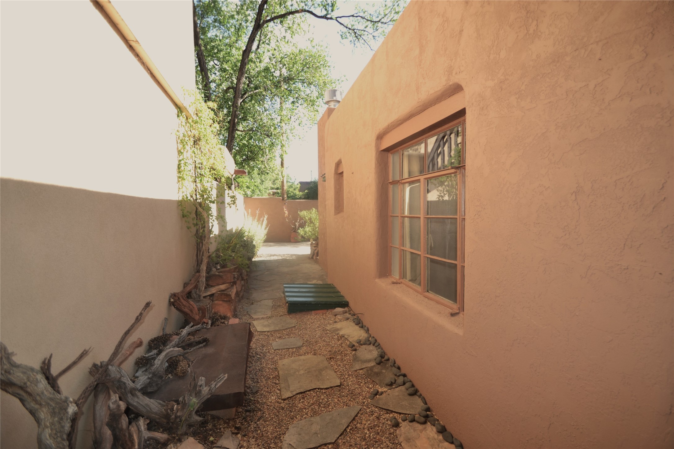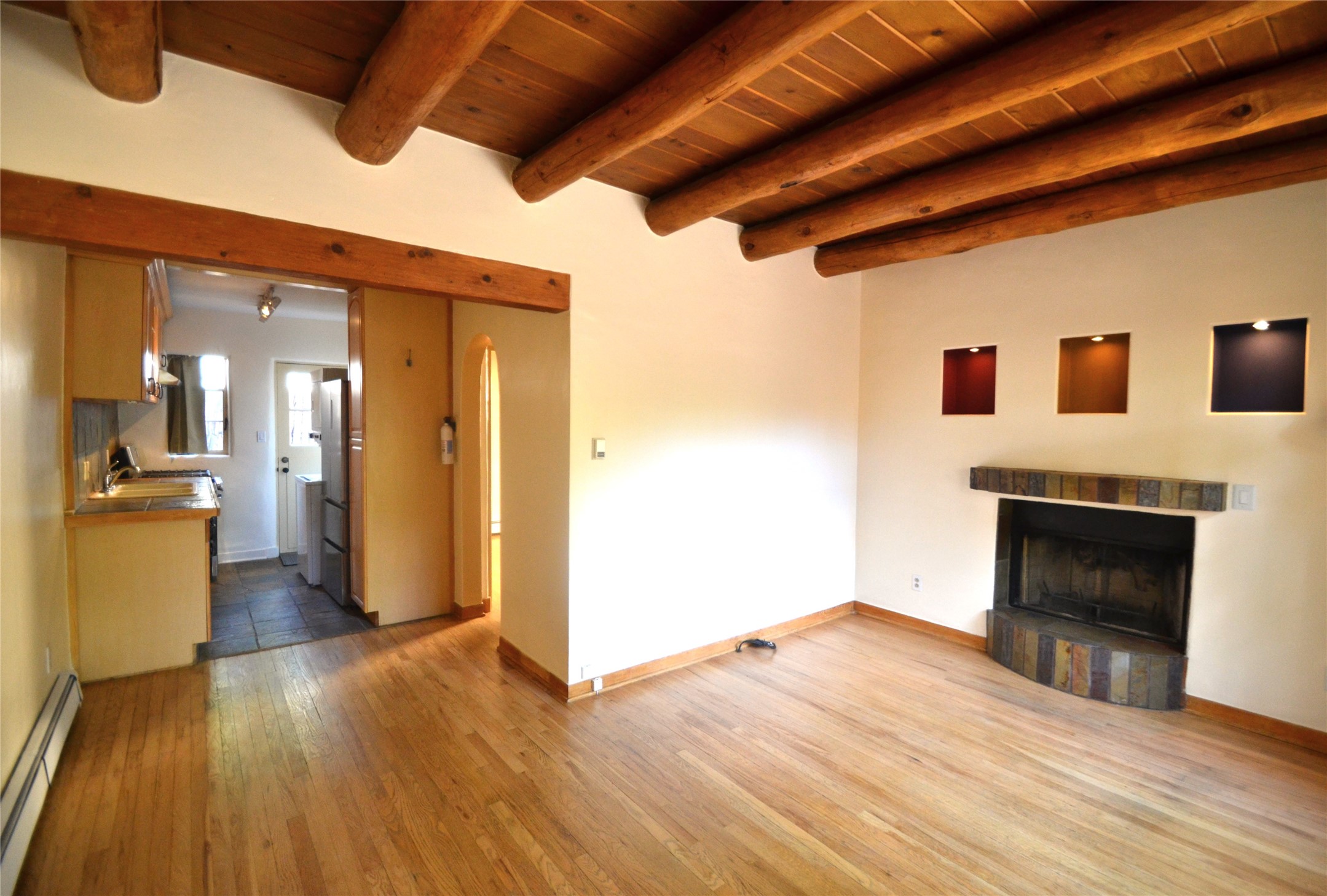 Listed $5K below appraisal on 10-6-23, Walk-to-the Plaza South Capital one bed/one bath single level 473 sqf condo, .013 acres in 14-unit quiet professional compound. Walled private courtyard ideal for entertaining and expanded living space. Single space reserved off-street parking. Santa Fe charm with vigas throughout. Wood burning fireplace complements 2 zoned, hot water baseboard heating. New stainless steel gas range, and refrigerator. Stackable washer and dryer. Hardwood floors with tile in kitchen and full bath accessible from hallway with jetted tub. Water meter shared with 4 units (averages $25/mo), gas and electric on separate meters. Exterior boiler and hot water heater; single shared wall. Outside storage closet and crawl space. The low $76.45/mo HOA fee covers ground maintenance, insurance, and the compounds private outdoor furnished pergola. Wood Gormley School District. Subject to Historical Society guidelines. No short-term rental. Move in ready! Platinum Care Select Home Warranty policy provided by seller