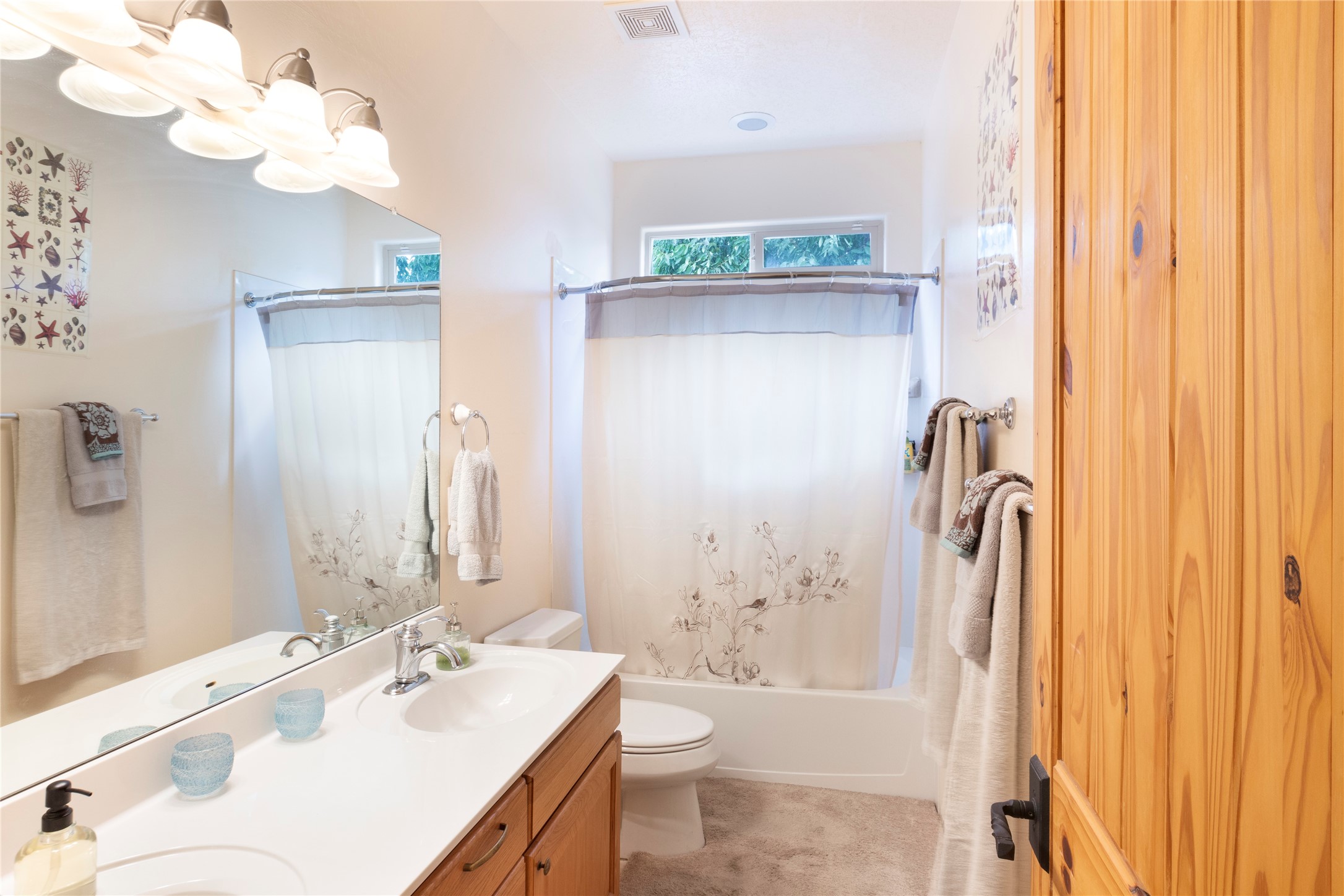 MOTIVATED SELLER! This beautifully appointed Rancho Viejo home has pueblo touches such as plaster, vigas and a kiva fireplace. The floorplan is excellent with the ensuite primary bedroom on one end and the guest rooms on the other end of the common areas of dining, living and kitchen. With 5 bedrooms, 2 bathrooms and a powder room and outdoor portal there is room for company. The open living concept has a breakfast bar and is part of the kitchen/living. The kitchen has been upgraded with granite countertops, 4 burner gas range, double hung ovens, and built in wine rack. Formal dining is bright with natural light. Unobstructed mountain and sunset views are enjoyed in the nicely landscaped back yard with nectarine, peach, apple and cherry trees, all with irrigation, water capture system and a fountain. There are 3 large raised garden beds with a drip system. This great property borders the common area greenbelt and is steps away from the neighborhood park. A two- car garage has direct access to this residence. 5 year roof warranty.