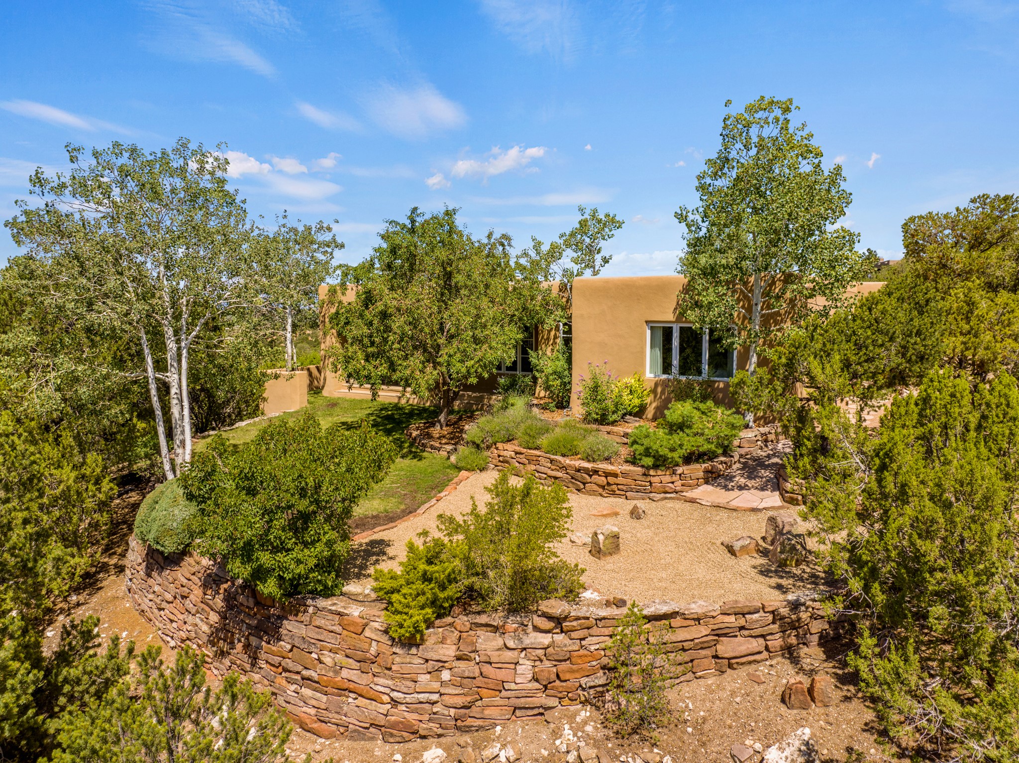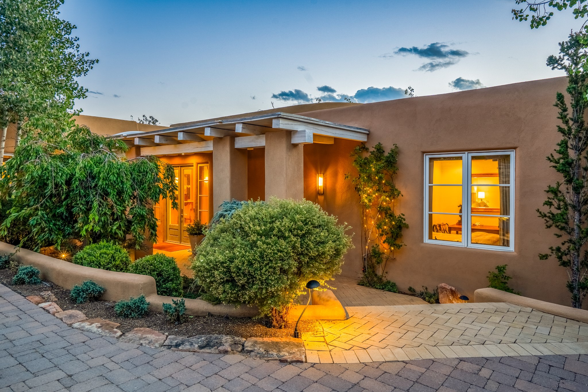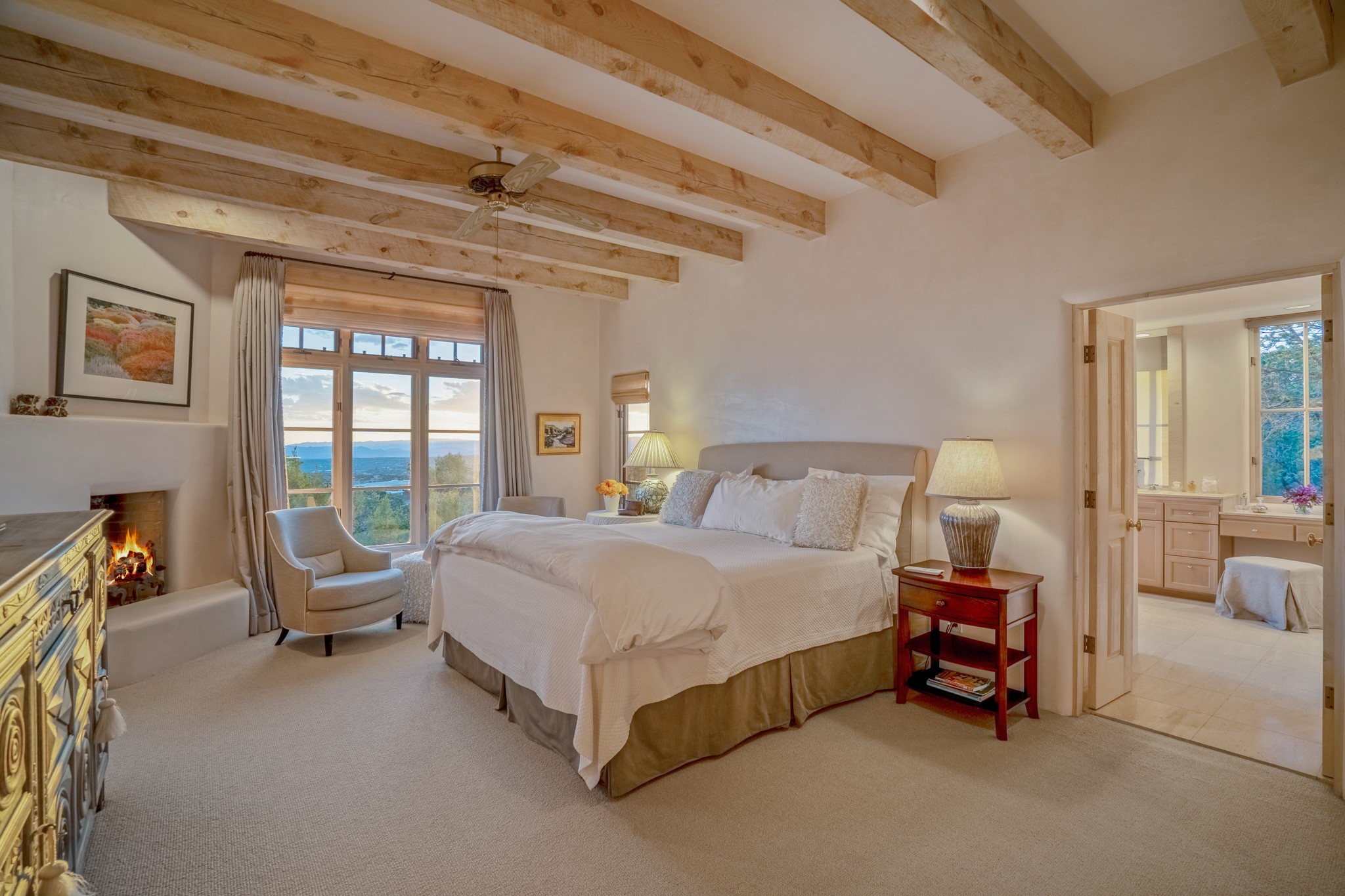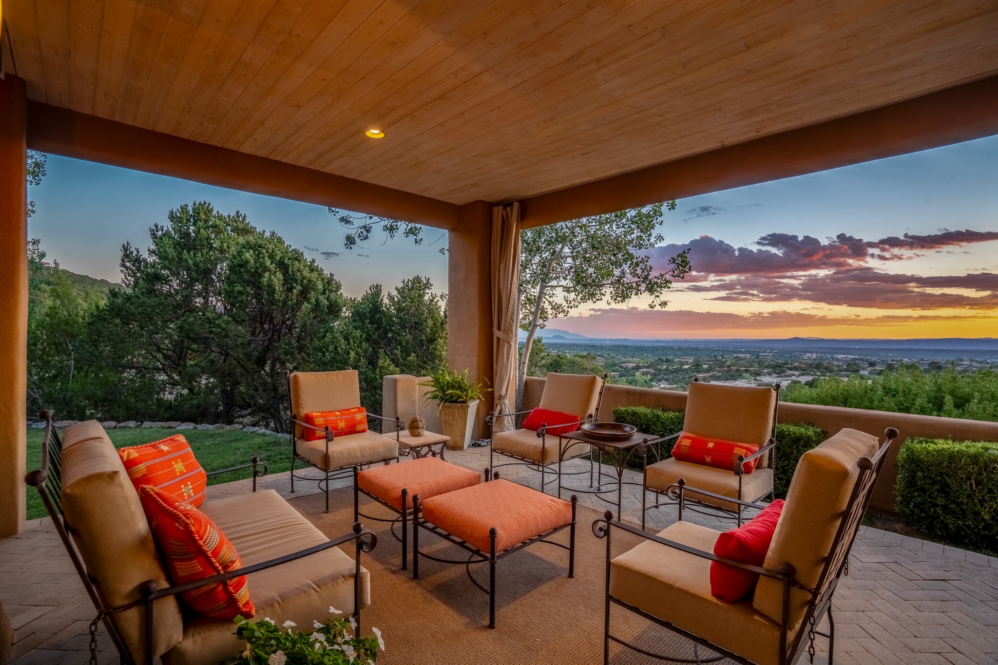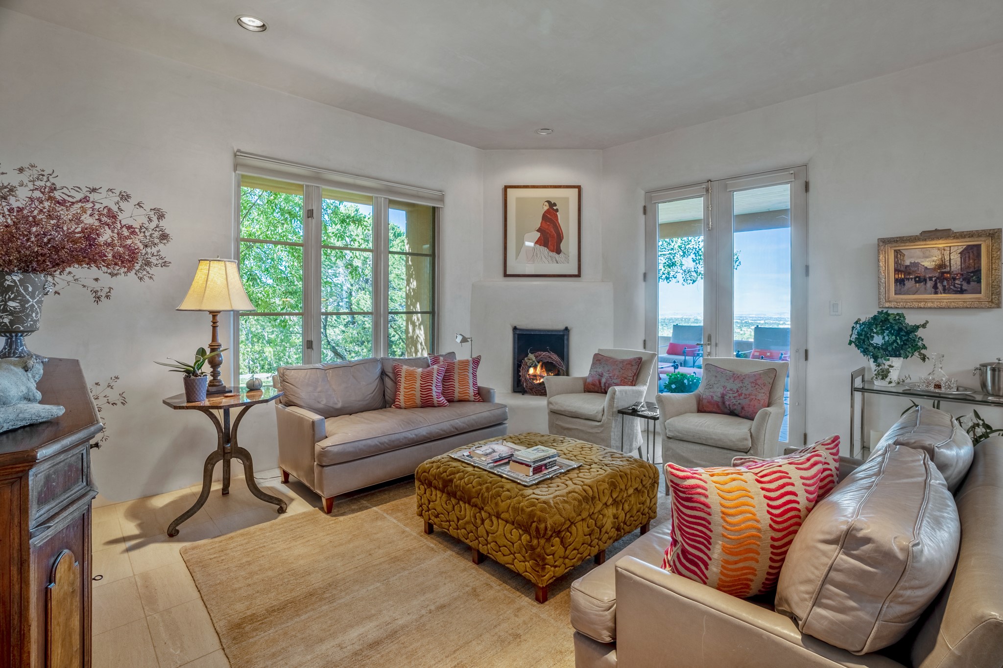 Perched in the hills above the Santa Fe Plaza, this timeless masterpiece with panoramic views of the town was expertly built in the 1990s by Jim Satzinger and flawlessly polished by the discerning eye of the interior designer who called it home. The mostly single level, +/- 3500 square foot floor plan is sited at the rear of a cul-de-sac parcel that looks much larger and feels much more private than the acreage would imply. Its central living space is bookended by the owners' suite and personal office in the North wing, and the two guest bedroom suites in the South wing. With lushly landscaped surroundings and deep portals to lure you through the numerous French doors, it is not only the uninterrupted view that will captivate. Some of the features include polished French limestone floors, recently renovated custom cabinetry, mini-splits, custom solid doors throughout, Dornbracht plumbing fixtures, imported Turkish tile accents, beamed ceilings, gleaming plaster walls, numerous fireplaces to cozy up to, a heated driveway, and new roof in 2021 to round it out. A near endless list of refined finishes, high end appliances, and immaculate maintenance record are testament to the meticulous care this property has received. With a curated furniture package that is negotiable, this home is truly one-of-a-kind and completely move-in ready.