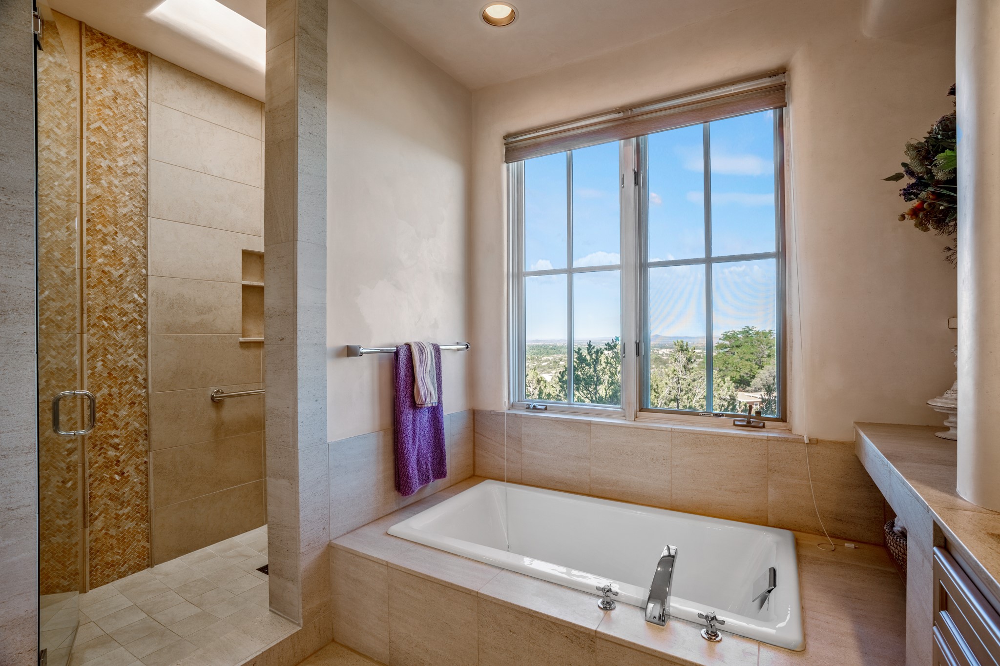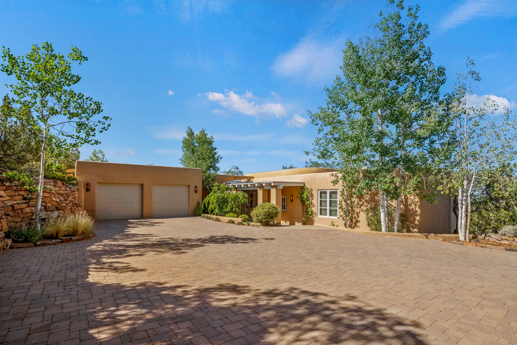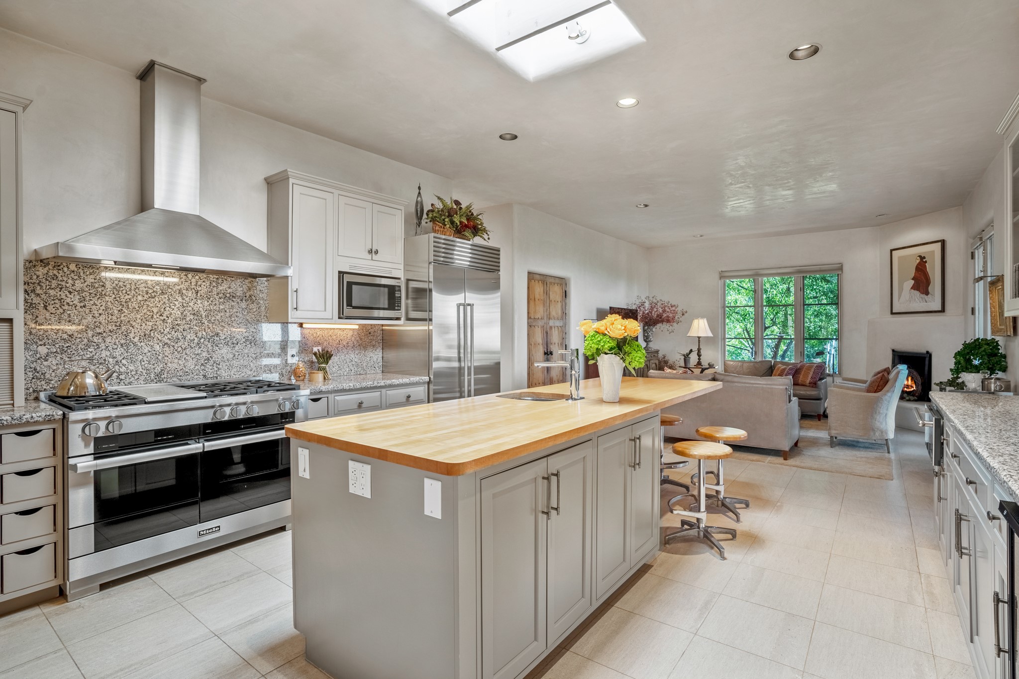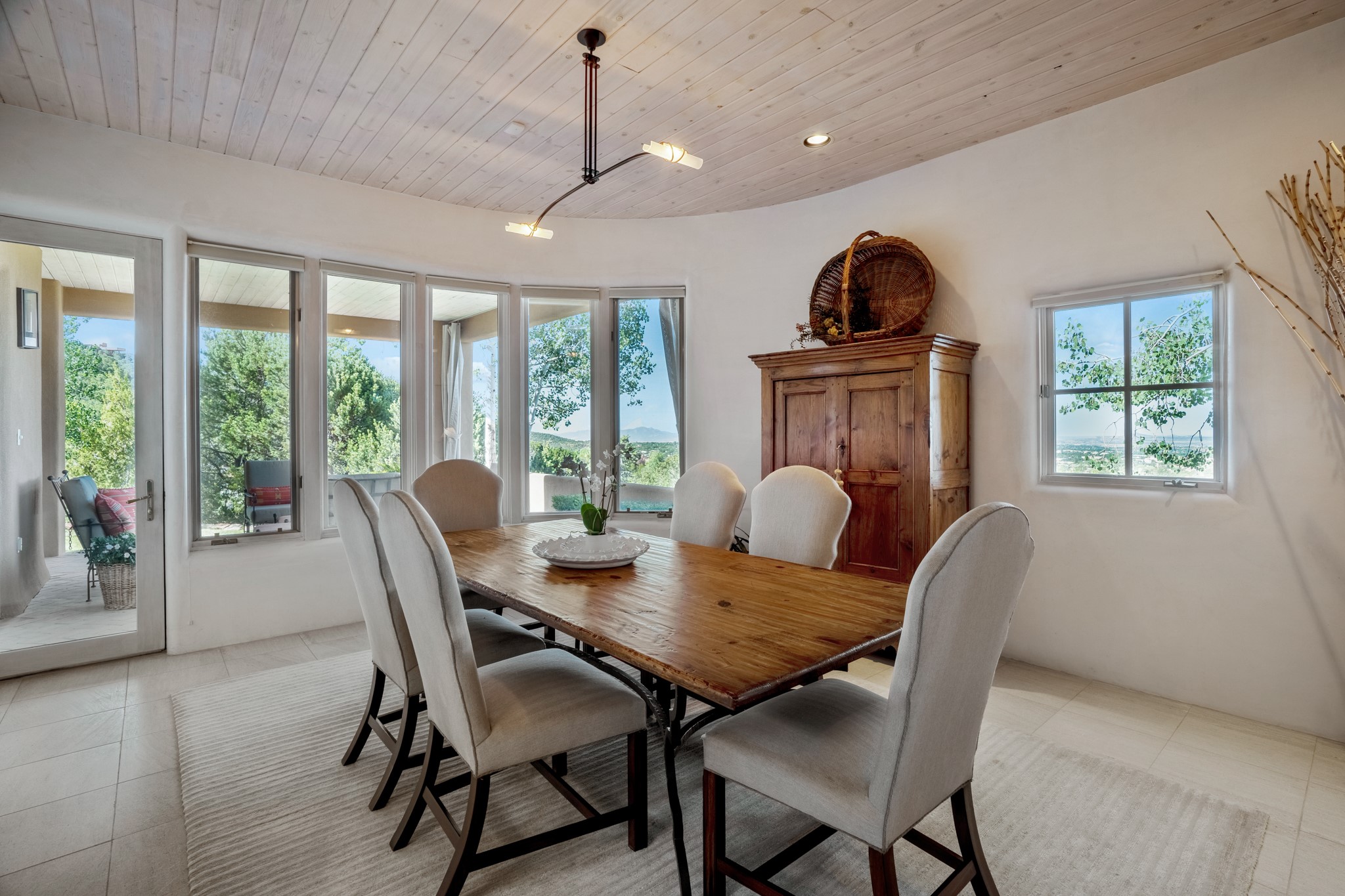 Perched in the hills above the Santa Fe Plaza, this timeless masterpiece with panoramic views of the town was expertly built in the 1990s by Jim Satzinger and flawlessly polished by the discerning eye of the interior designer who called it home. The mostly single level, +/- 3500 square foot floor plan is sited at the rear of a cul-de-sac parcel that looks much larger and feels much more private than the acreage would imply. Its central living space is bookended by the owners' suite and personal office in the North wing, and the two guest bedroom suites in the South wing. With lushly landscaped surroundings and deep portals to lure you through the numerous French doors, it is not only the uninterrupted view that will captivate. Some of the features include polished French limestone floors, recently renovated custom cabinetry, mini-splits, custom solid doors throughout, Dornbracht plumbing fixtures, imported Turkish tile accents, beamed ceilings, gleaming plaster walls, numerous fireplaces to cozy up to, a heated driveway, and new roof in 2021 to round it out. A near endless list of refined finishes, high end appliances, and immaculate maintenance record are testament to the meticulous care this property has received. With a curated furniture package that is negotiable, this home is truly one-of-a-kind and completely move-in ready.