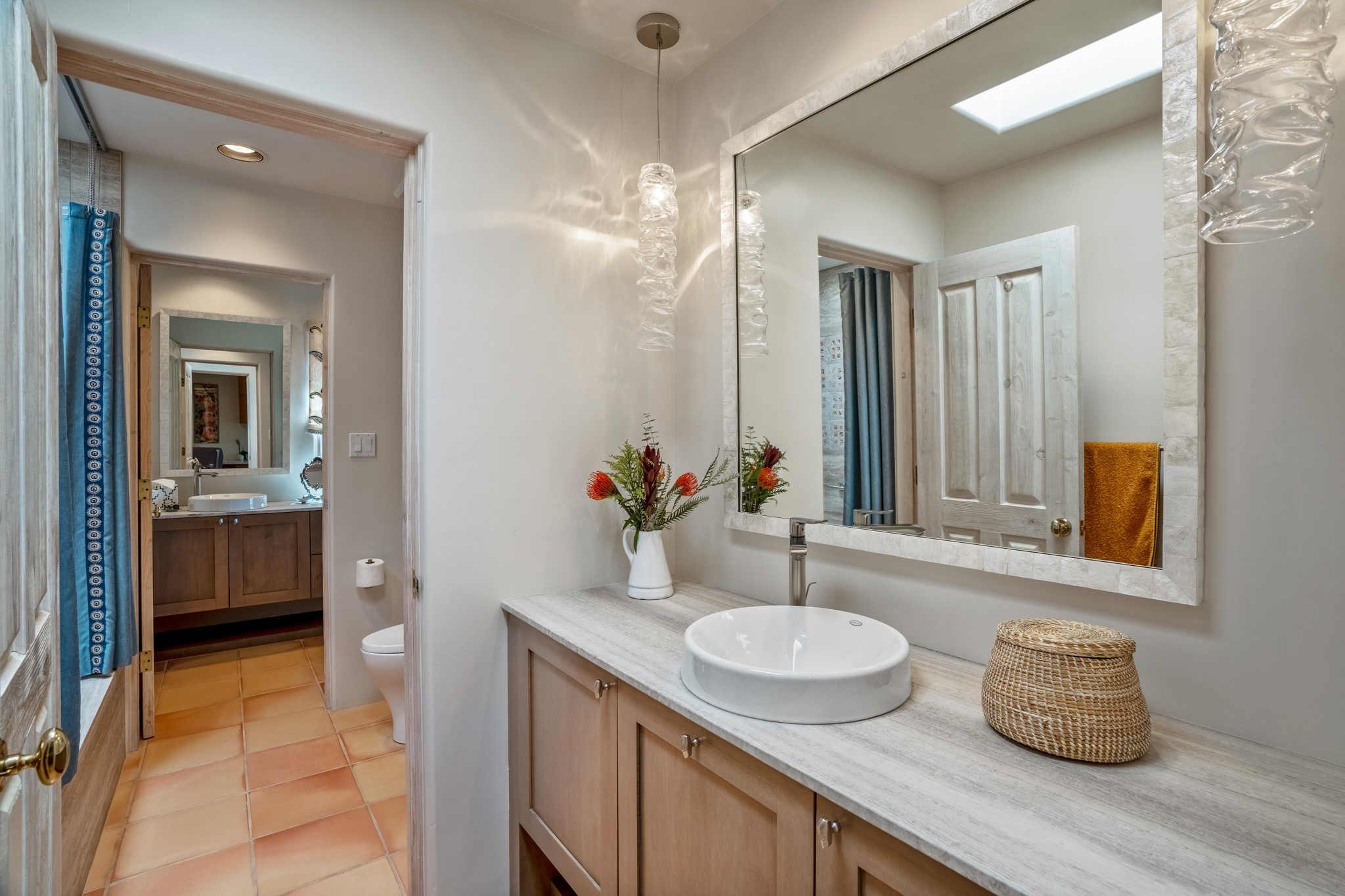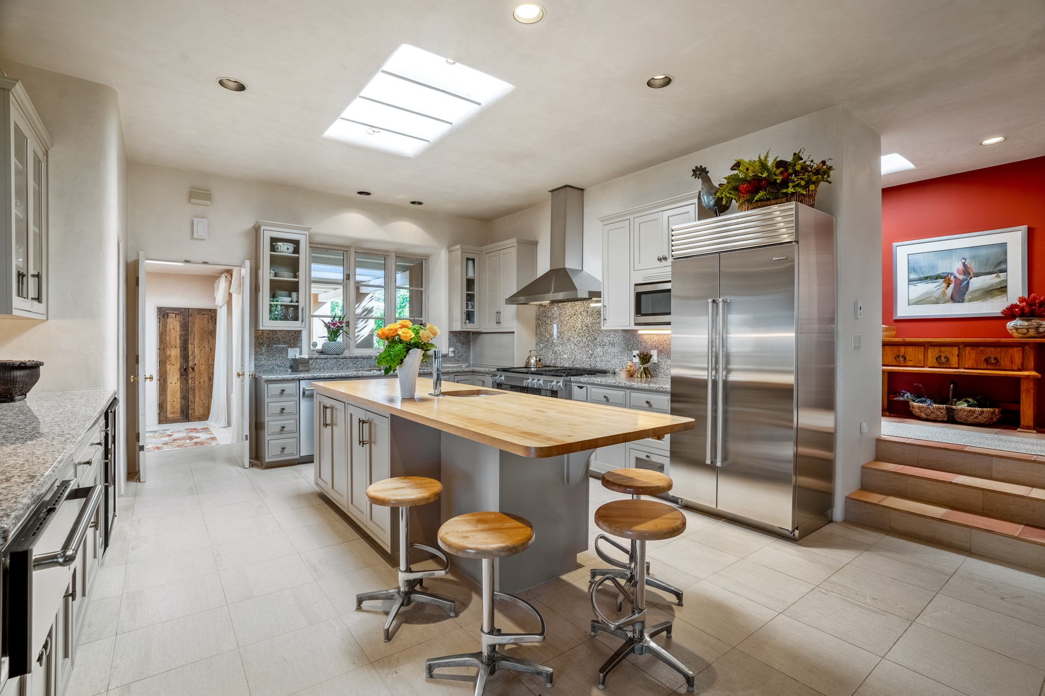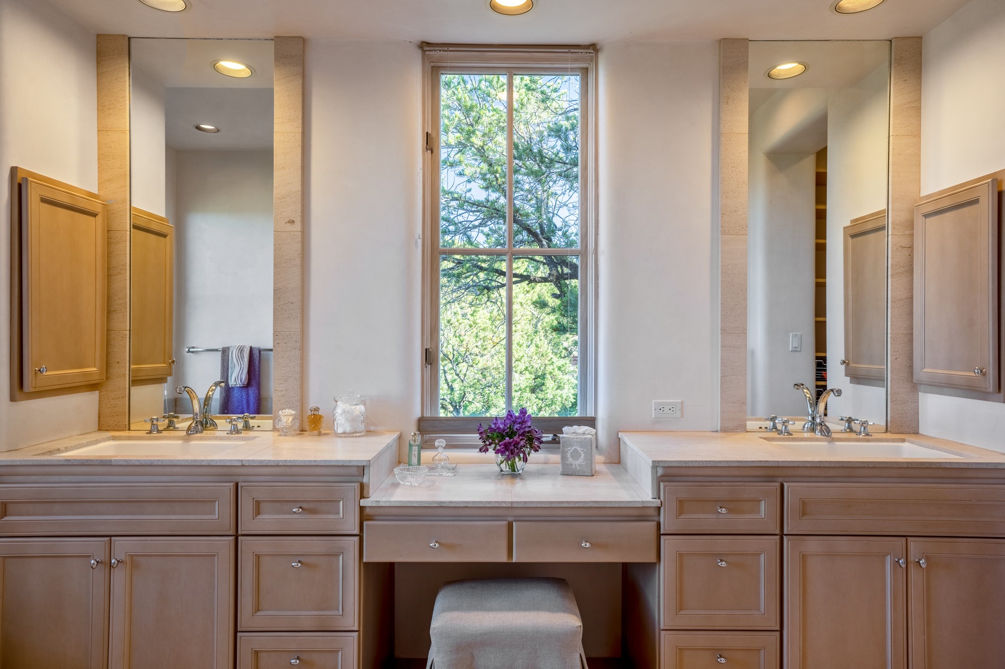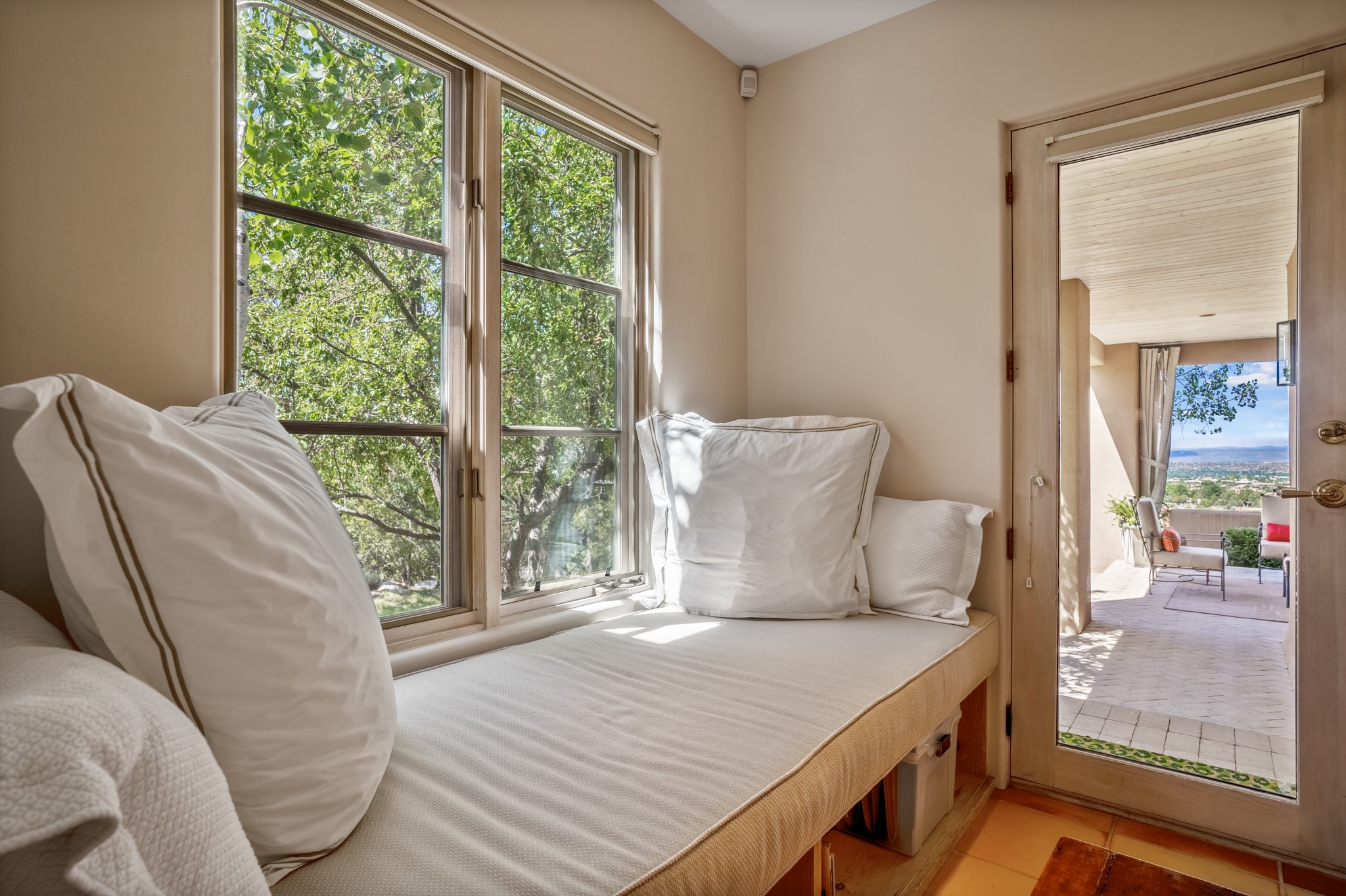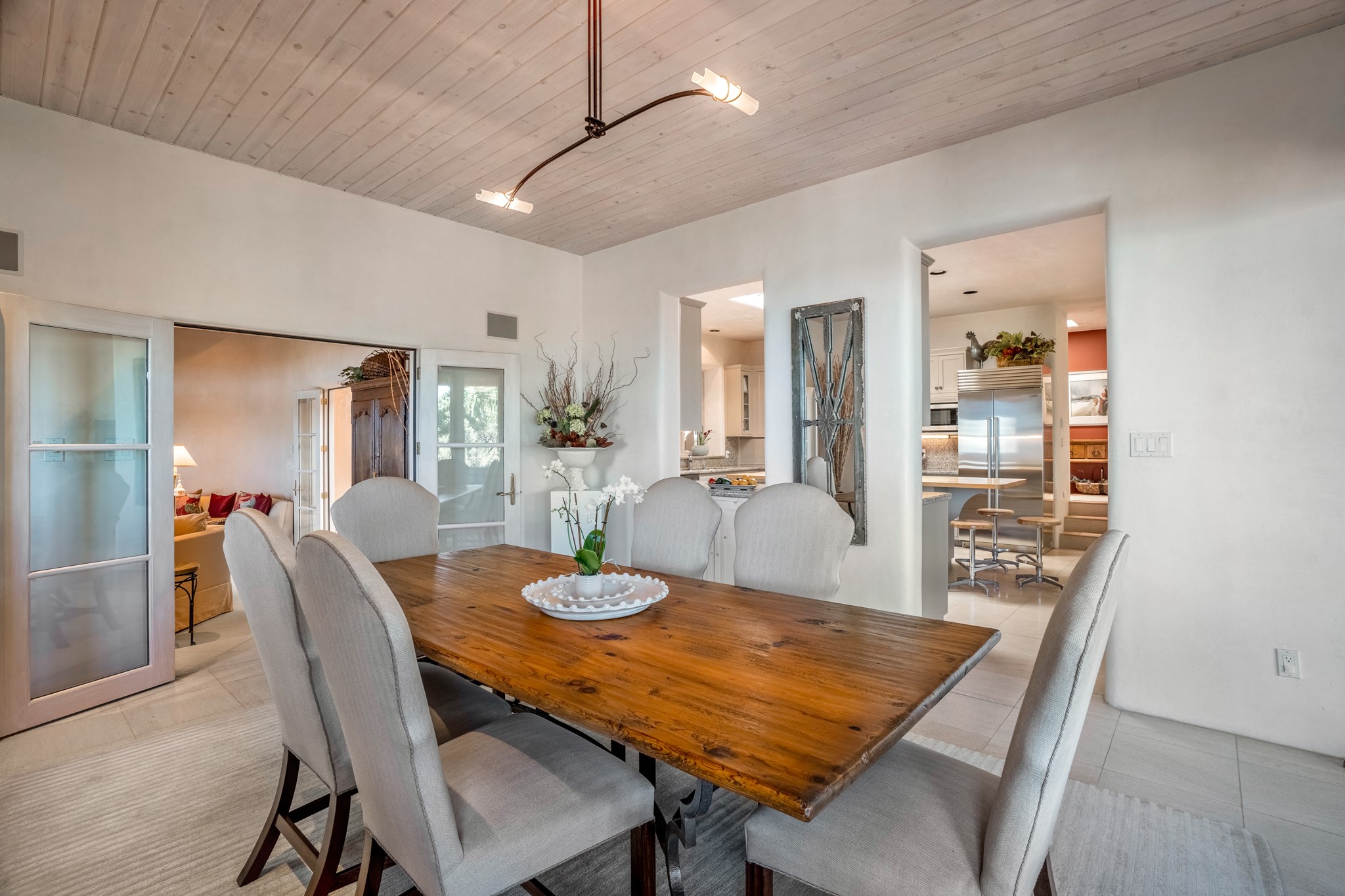 Perched in the hills above the Santa Fe Plaza, this timeless masterpiece with panoramic views of the town was expertly built in the 1990s by Jim Satzinger and flawlessly polished by the discerning eye of the interior designer who called it home. The mostly single level, +/- 3500 square foot floor plan is sited at the rear of a cul-de-sac parcel that looks much larger and feels much more private than the acreage would imply. Its central living space is bookended by the owners' suite and personal office in the North wing, and the two guest bedroom suites in the South wing. With lushly landscaped surroundings and deep portals to lure you through the numerous French doors, it is not only the uninterrupted view that will captivate. Some of the features include polished French limestone floors, recently renovated custom cabinetry, mini-splits, custom solid doors throughout, Dornbracht plumbing fixtures, imported Turkish tile accents, beamed ceilings, gleaming plaster walls, numerous fireplaces to cozy up to, a heated driveway, and new roof in 2021 to round it out. A near endless list of refined finishes, high end appliances, and immaculate maintenance record are testament to the meticulous care this property has received. With a curated furniture package that is negotiable, this home is truly one-of-a-kind and completely move-in ready.