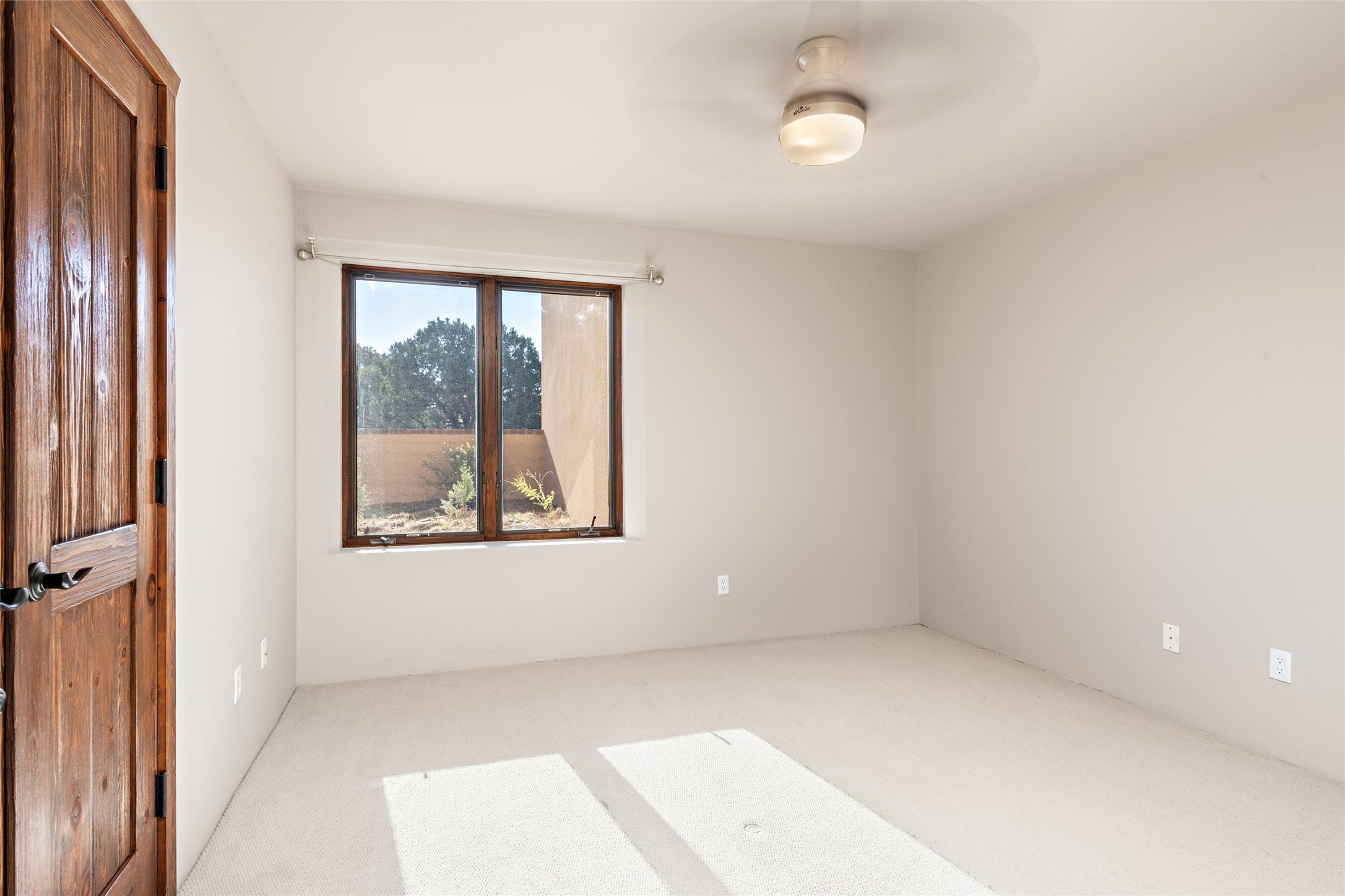 ENTERTAINER'S PARADISE! Not to mention the spectacular postcard-worthy sunset views of the Sandia and Ortiz, mountains from the back patio, and Sangres from the front patio. Sited on a large greenbelt at the end of a cul-de-sac. Four mini-splits provide real air conditioning. New stucco, interior paint and brick floors refinished in September 2023. Kitchen updated in 2022 with new appliances - a 6-burner Wolf gas range, Bosch dishwasher and LG refrigerator and more counter seating and storage. Two primary suites on opposite ends of the house, both with large walk-in closets, provide numerous options, from an in-law suite, to a large artist's studio. The larger of the suites has a sitting room with fantastic mountain views, a smaller room that is plumbed to be a kitchenette, and a separate back entrance. Huge closest with an entire wall of built-in shelves and drawers in first primary bedroom with beautiful spa-like bath with jetted tub, and double sinks. Banco with storage under picture window. Primary bedroom two has a generous 2-person jetted tub, double sinks and beautiful shower. Both primary suites have a fireplace, and there are two more in living areas, for a total of four. Fifth bedroom is set up as a beautiful office with built-ins. The new brick back patio has a sunken seating area with a built-in gas grill, a fire table and a long covered portal which is a great place to entertain or relax. The two added front flagstone patios provide additional space for seating and gorgeous views of snow-covered mountains in the winter - both patios have solar lighting. There is also a secure coyote-fenced backyard space that provides a safe area for dogs to play. Generous laundry room with sink and pantry. Oversized, extra deep 2-car garage with storage. A few steps up from the garage, otherwise single-level. Radiant is PEX. Domestic is copper. Water softener 2019. Each room has a ceiling fan. Custom screen doors, insulated blinds.