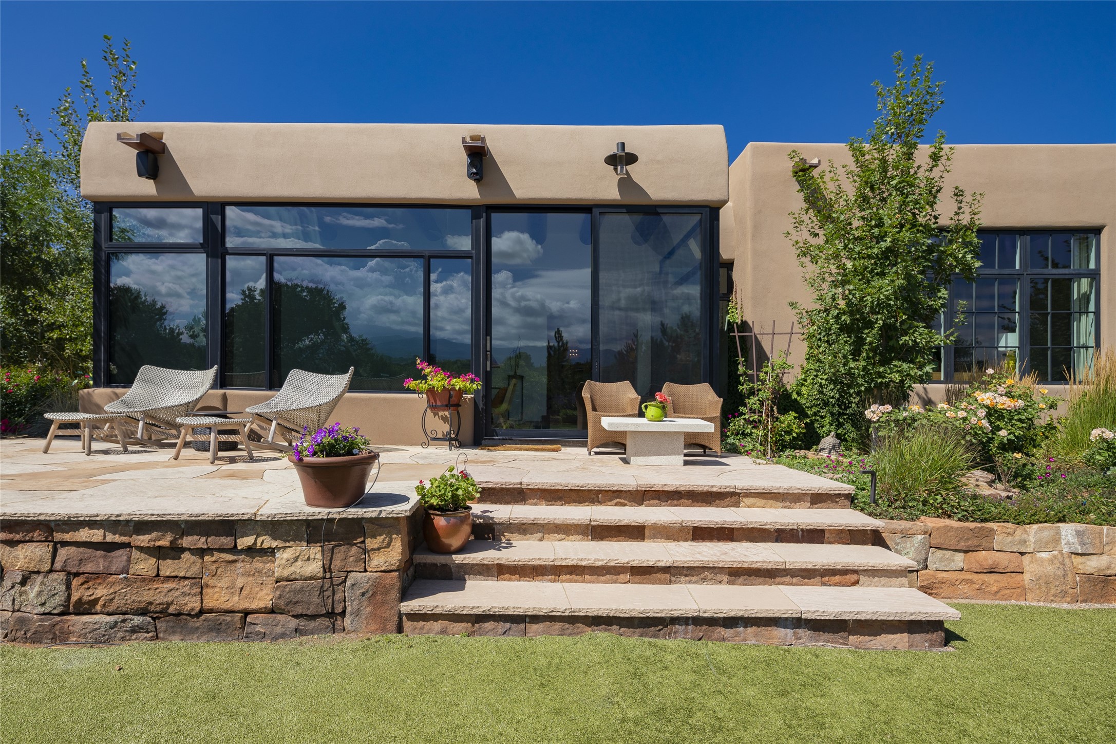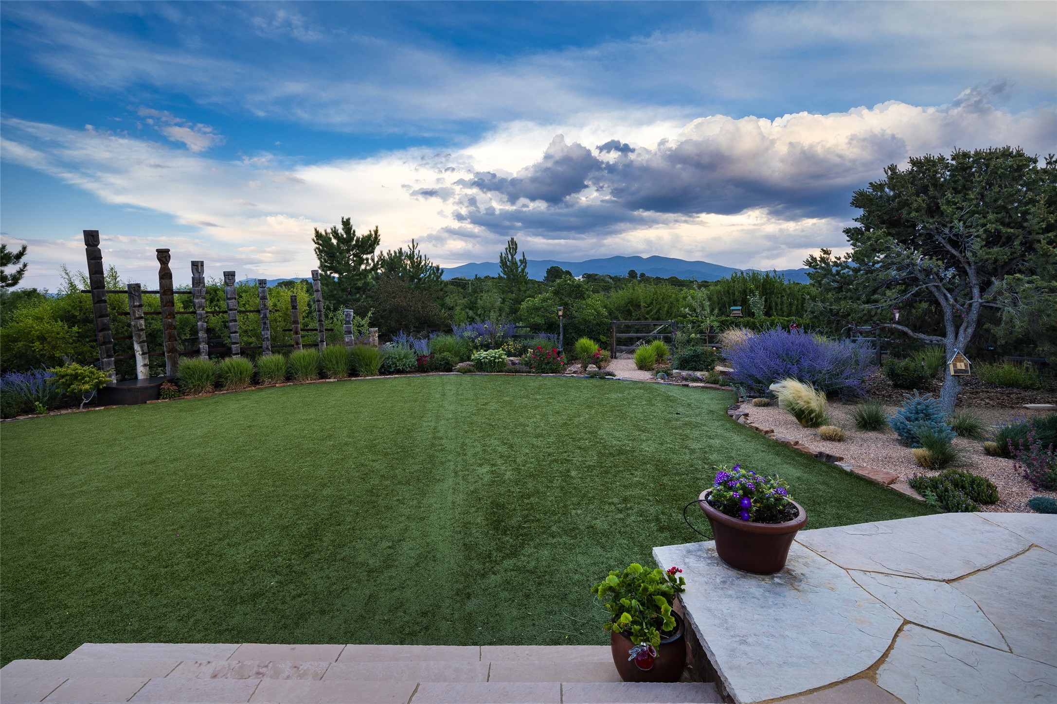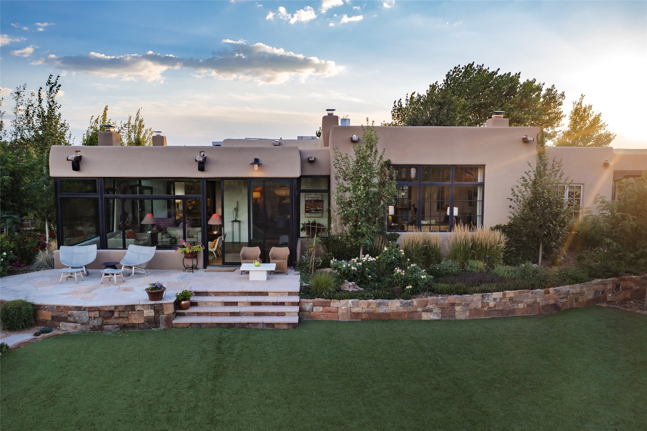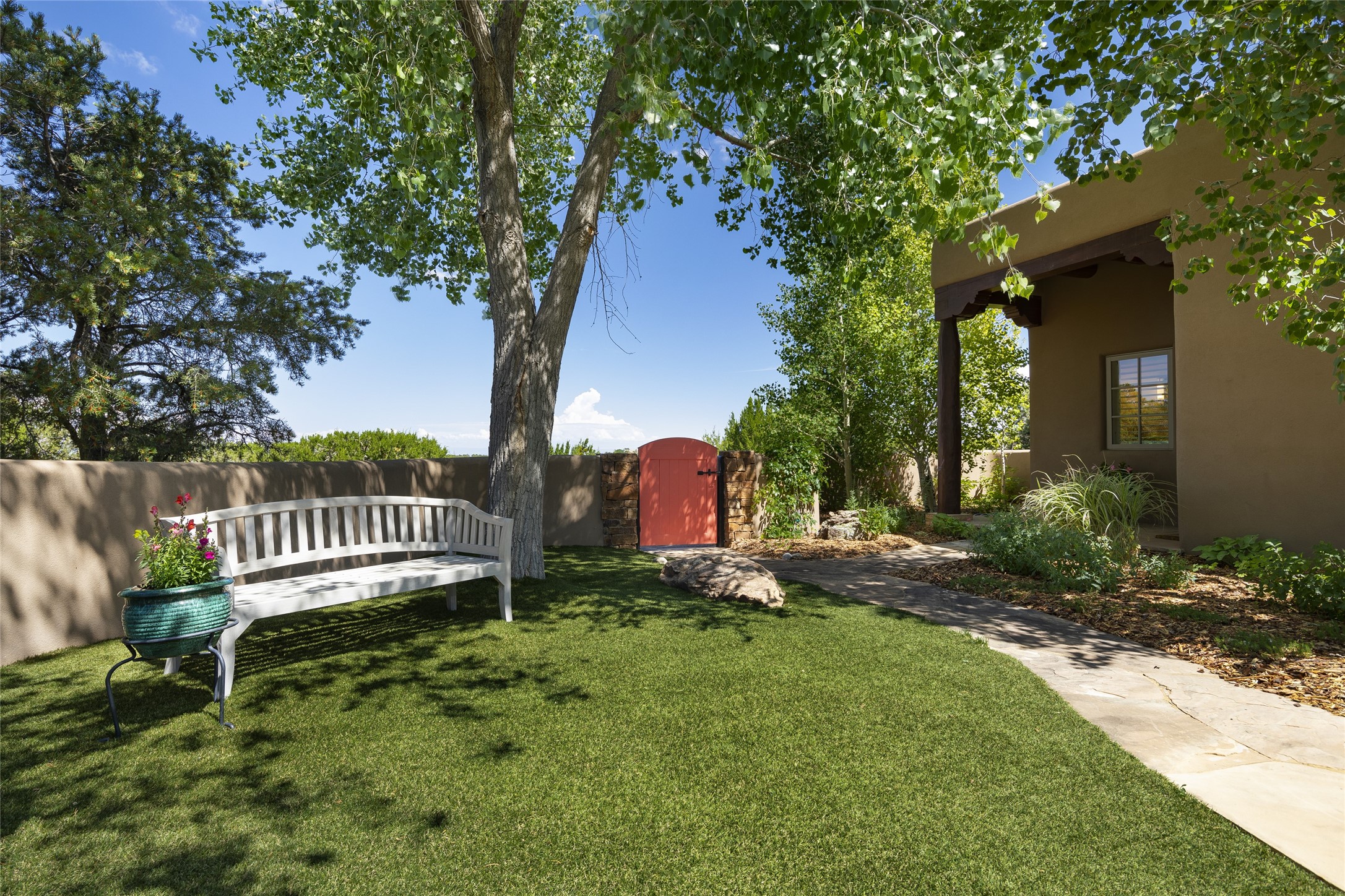 EXPERIENCE THE BEST-OF-THE-BEST IN THIS EXCITING SANTA FE PROPERTY WITH SWEEPING MOUNTAIN VIEWS LOCATED ON A RARE ELEVATED 5+ ACRE PARCEL ON COVETED TANO ROAD. Casa de la Luz is an open, airy, happy, single level home with natural light and lush gardens that enhance the home at every turn. Private gated entry and winding driveway are just the beginning. This exquisite residence has been renovated practically stem-to-stern with first class materials that feel livable, luxurious and relaxing. Dazzling white hand plastered walls, soaring ceilings and banks of windows take your eyes to the WOW views of mountain and sky! Elegant gates lead to the front courtyard with a water feature and impressive double doors that peak through the home to the Sangre de Cristo Mountains. The cook's kitchen is welcoming with plenty of counter space, high-end appliances and a den-like informal dining area. Entertain with style and grace at this stunning property which offers 3 bedrooms, each with an ensuite bathroom, and a separate office. The primary suite features a fireplace, a spa-like bathroom, a soaking tub, separate walk-in shower, and three oversized closets. The living room has soaring ceilings, a fireplace, and large windows that showcase the panoramic views. The sunroom is a perfect place to relax and enjoy the scenery, while the sitting room offers a cozy spot to read or watch TV. The property also includes a 3-car garage with epoxy floors and slat hanging units, a sleek laundry room, and a designer powder room with colors that subtly carry throughout the house. Fall in love with the outdoor living spaces filled with lush landscaping, water features, and mature trees, a covered patio with Lynx grill, and gated vegetable gardens where you can enjoy the peace and tranquility of nature, while being only minutes away from historic downtown Santa Fe. This is a rare opportunity to own a magnificent home in one of the most sought-after locations in Santa Fe. Live...Love...87506!