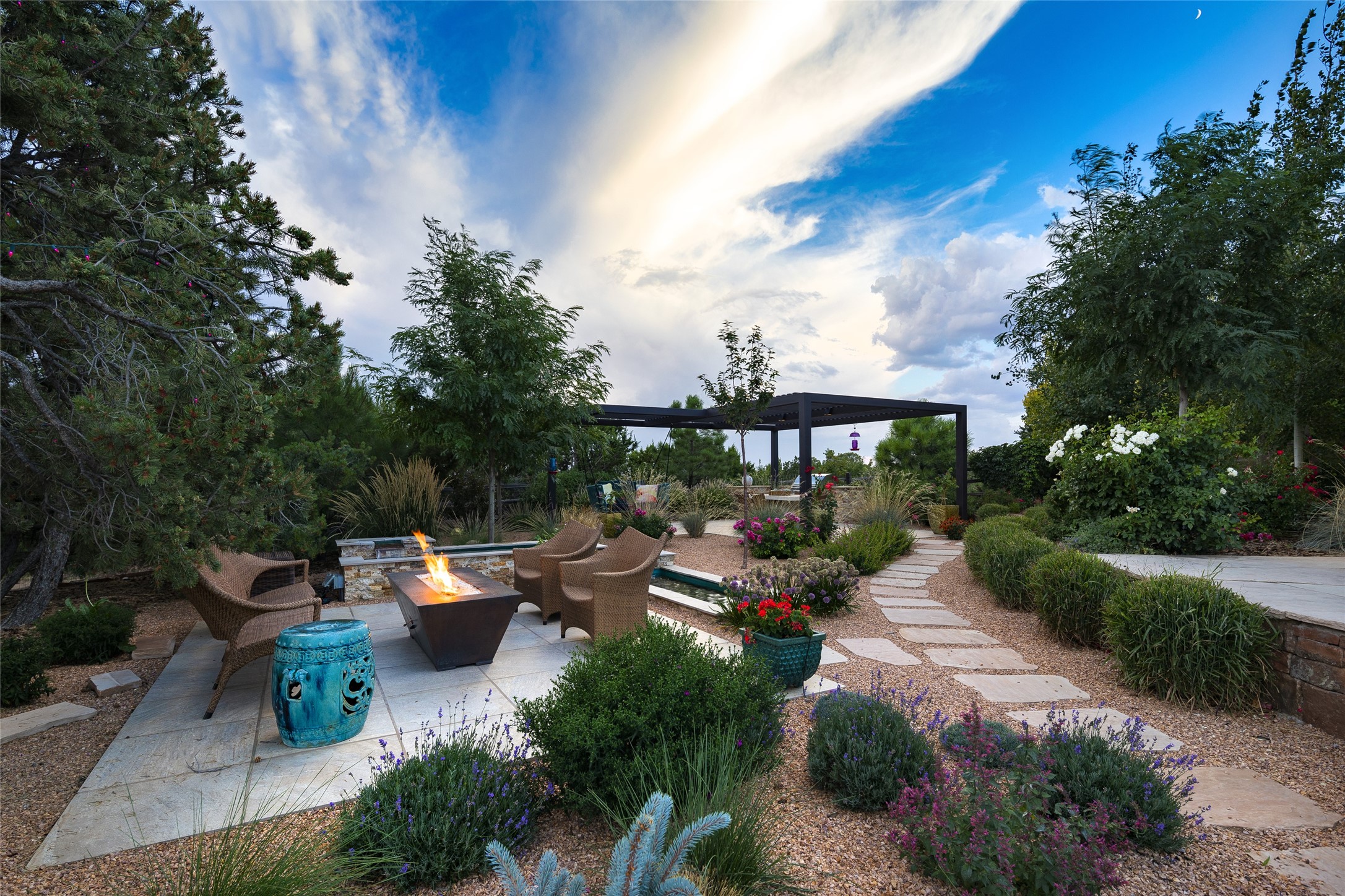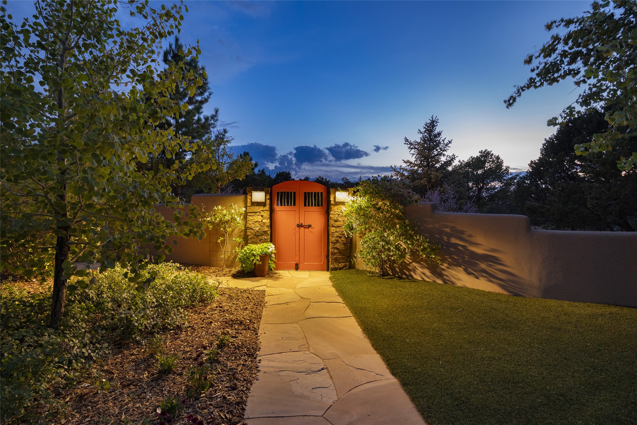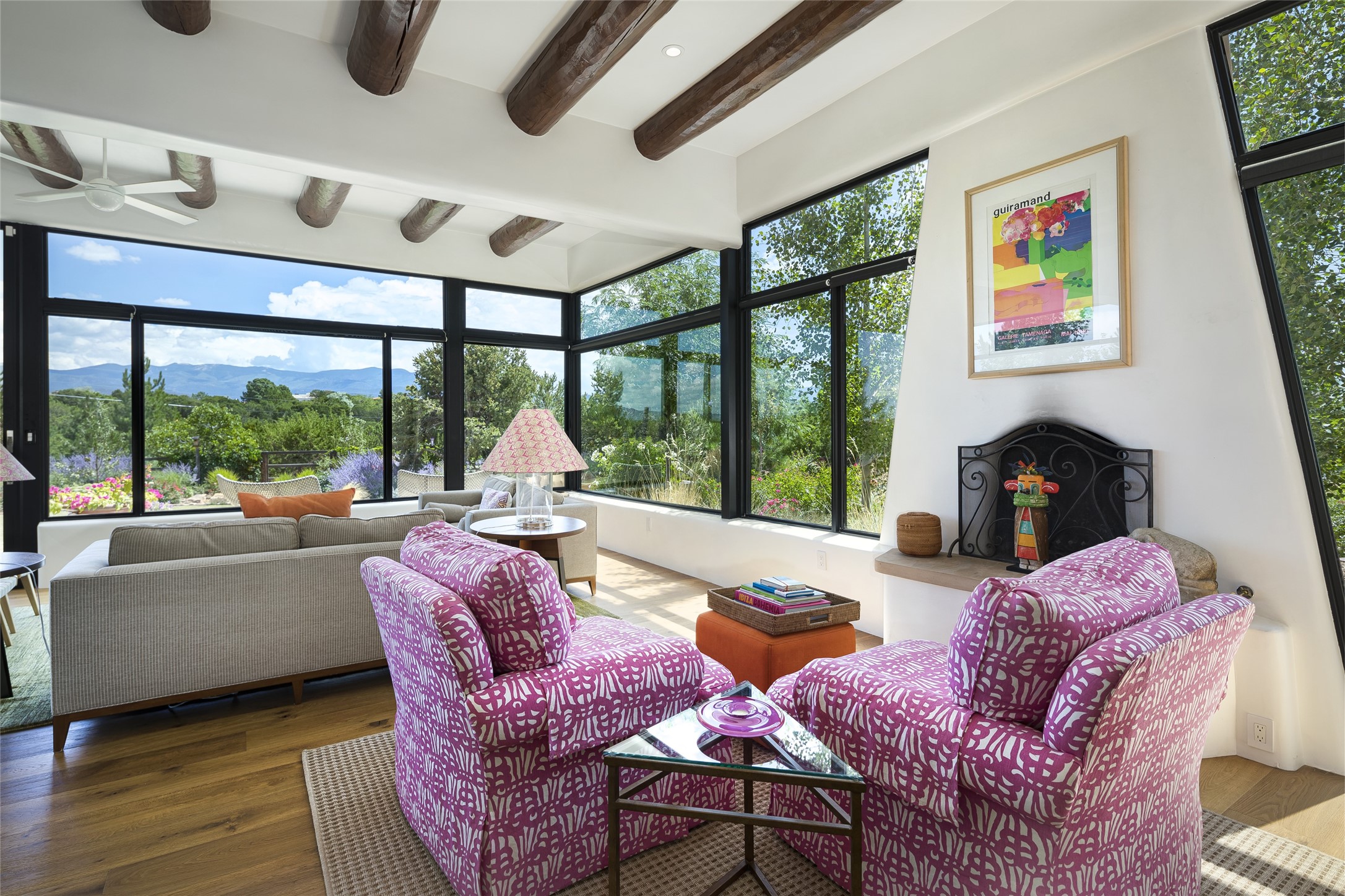 EXPERIENCE THE BEST-OF-THE-BEST IN THIS EXCITING SANTA FE PROPERTY WITH SWEEPING MOUNTAIN VIEWS LOCATED ON A RARE ELEVATED 5+ ACRE PARCEL ON COVETED TANO ROAD. Casa de la Luz is an open, airy, happy, single level home with natural light and lush gardens that enhance the home at every turn. Private gated entry and winding driveway are just the beginning. This exquisite residence has been renovated practically stem-to-stern with first class materials that feel livable, luxurious and relaxing. Dazzling white hand plastered walls, soaring ceilings and banks of windows take your eyes to the WOW views of mountain and sky! Elegant gates lead to the front courtyard with a water feature and impressive double doors that peak through the home to the Sangre de Cristo Mountains. The cook's kitchen is welcoming with plenty of counter space, high-end appliances and a den-like informal dining area. Entertain with style and grace at this stunning property which offers 3 bedrooms, each with an ensuite bathroom, and a separate office. The primary suite features a fireplace, a spa-like bathroom, a soaking tub, separate walk-in shower, and three oversized closets. The living room has soaring ceilings, a fireplace, and large windows that showcase the panoramic views. The sunroom is a perfect place to relax and enjoy the scenery, while the sitting room offers a cozy spot to read or watch TV. The property also includes a 3-car garage with epoxy floors and slat hanging units, a sleek laundry room, and a designer powder room with colors that subtly carry throughout the house. Fall in love with the outdoor living spaces filled with lush landscaping, water features, and mature trees, a covered patio with Lynx grill, and gated vegetable gardens where you can enjoy the peace and tranquility of nature, while being only minutes away from historic downtown Santa Fe. This is a rare opportunity to own a magnificent home in one of the most sought-after locations in Santa Fe. Live...Love...87506!