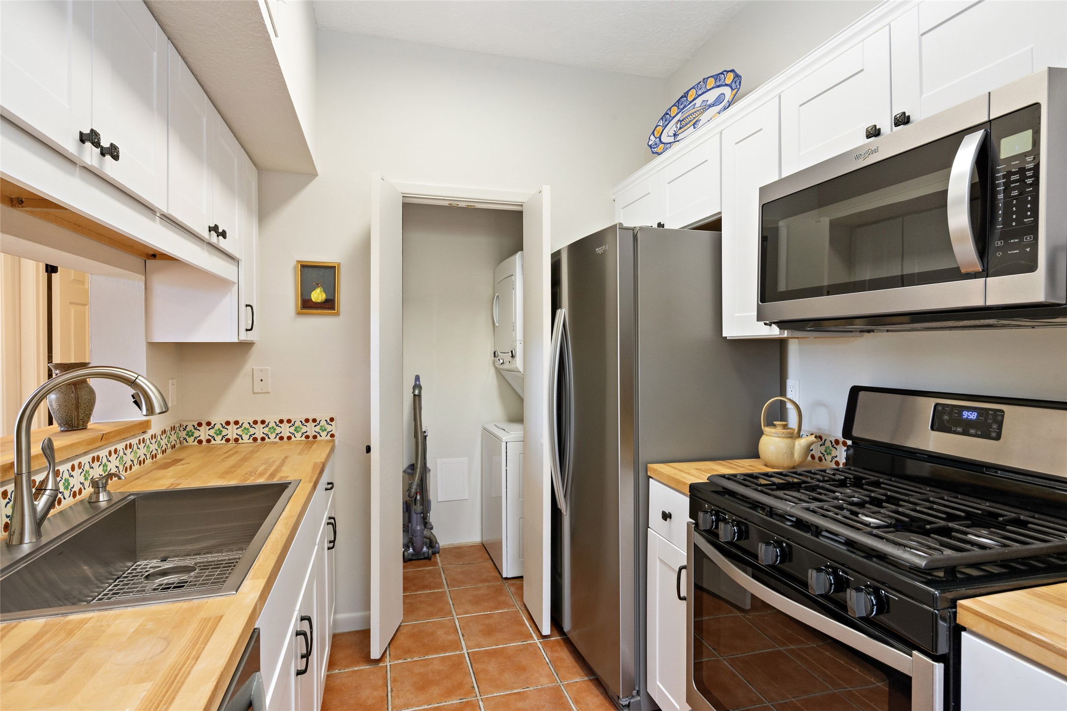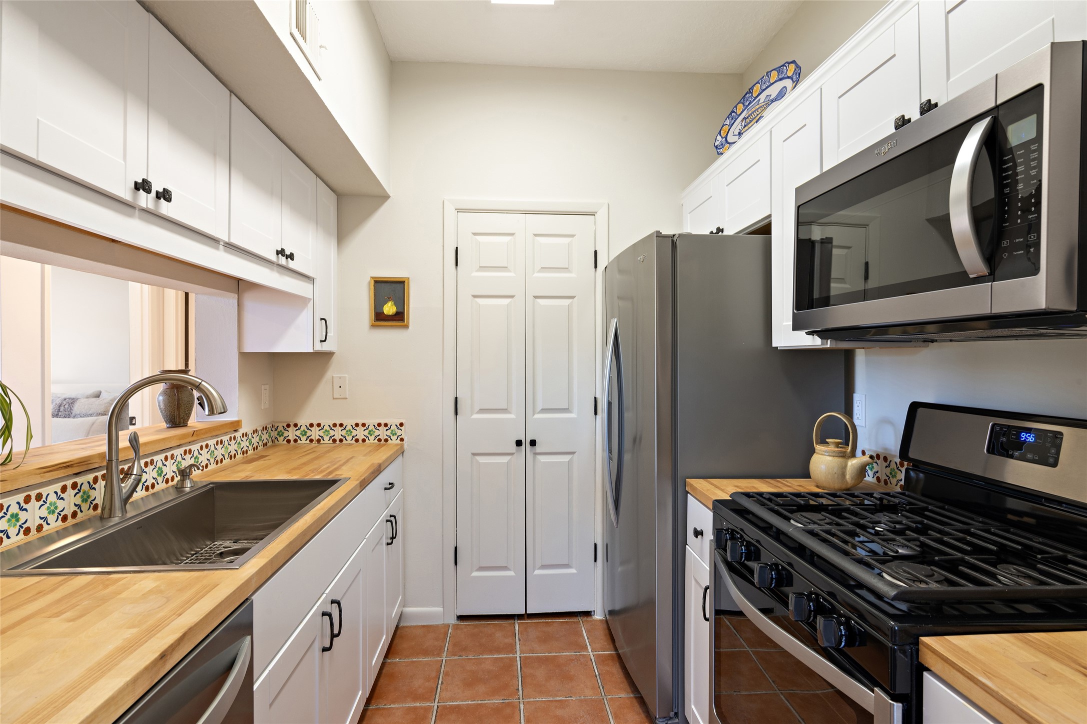What is not to like about this crisp, compact, newly refurbished condominium in a superb location just minutes from the heart of Santa Fe? At the end unit of the Vieto del Norte complex, the sweet home enjoys the advantage of no neighbors on the north side; hence, more windows for better light and extra views. A bright interior flows seamlessly into the large balcony off both the living room and bedroom, nearly doubling the enjoyable space for entertaining and peaceful relaxation. Wood floors, plank and square cut beam ceilings, and wood frame glass paned doors offer a handsome counterpoint to the lighter touch given to the rest of the dcor. The kitchen and dining spaces are cozy yet fully functional with renovated shelves and countertops as well as new appliances. The bathroom has been completely renovated and the space maximized by installing a large reach-in closet. A stacked washer/dryer lives in the kitchen pantry/storage closet and a downstairs garage provides room for one vehicle and additional storage. A perfect home for quick and easy access to all of Santa Fe's special summer fairs and festivals and an equally easy spot to languish in after long winter days spent at the ski basin. Whether looking for an easy seasonal foothold in Santa Fe, a profitable rental property, or a charming carefree home in a prime part of Santa Fe, this special unit should not be missed.