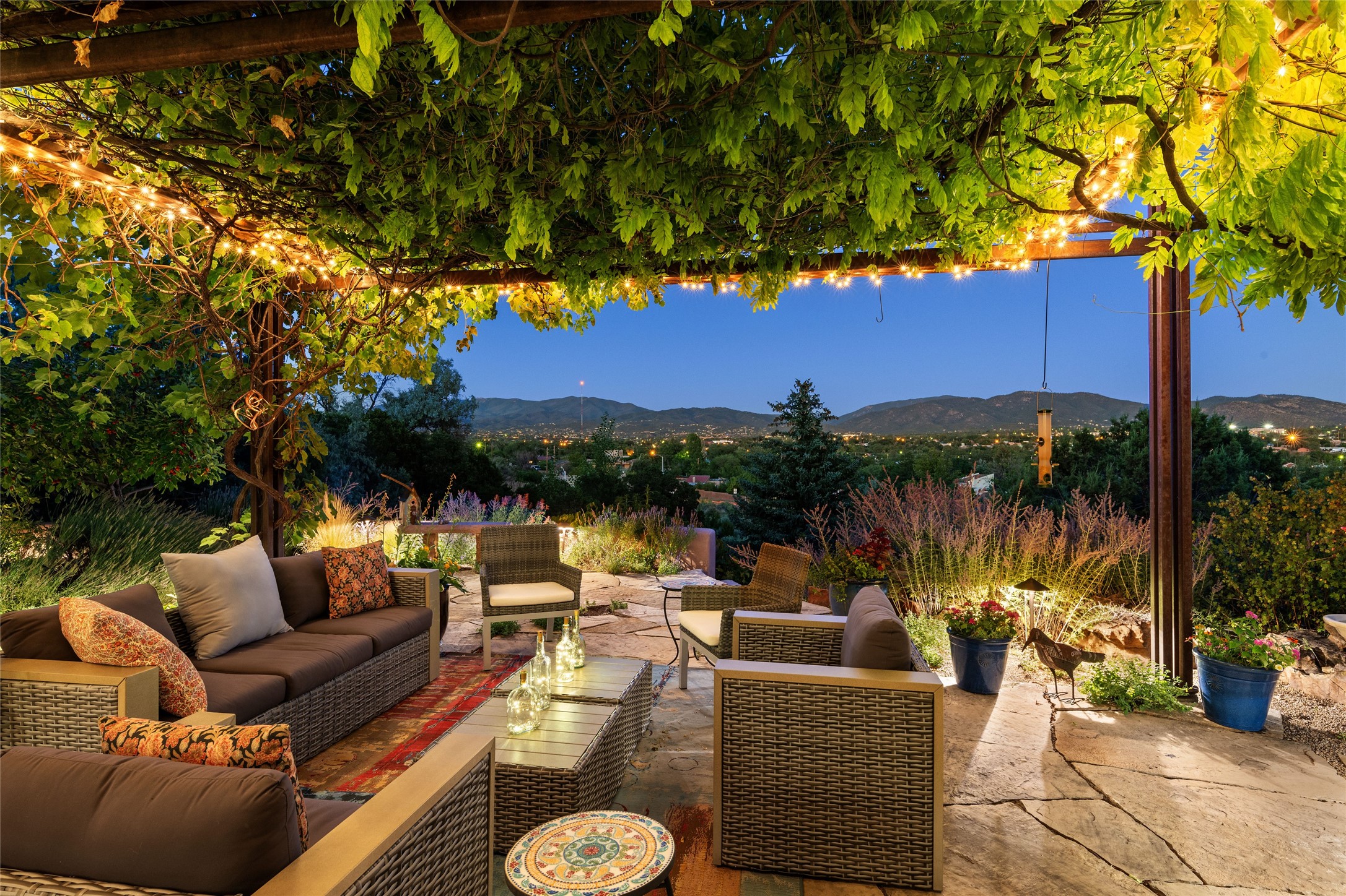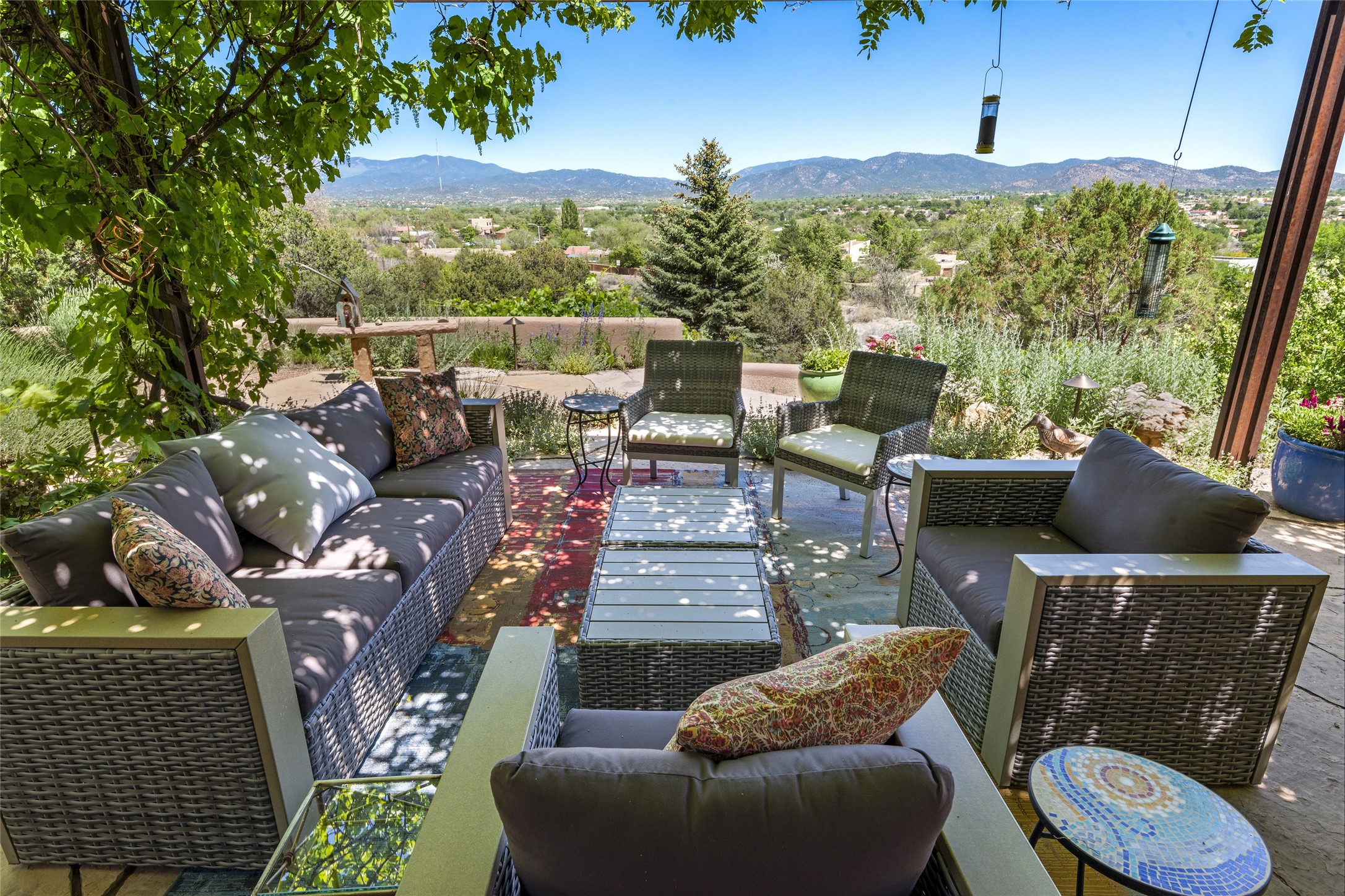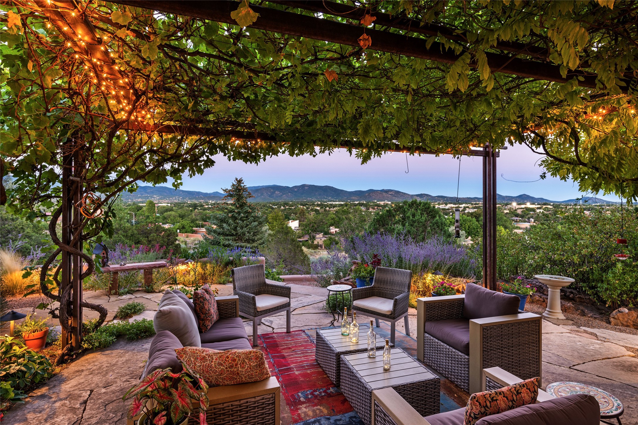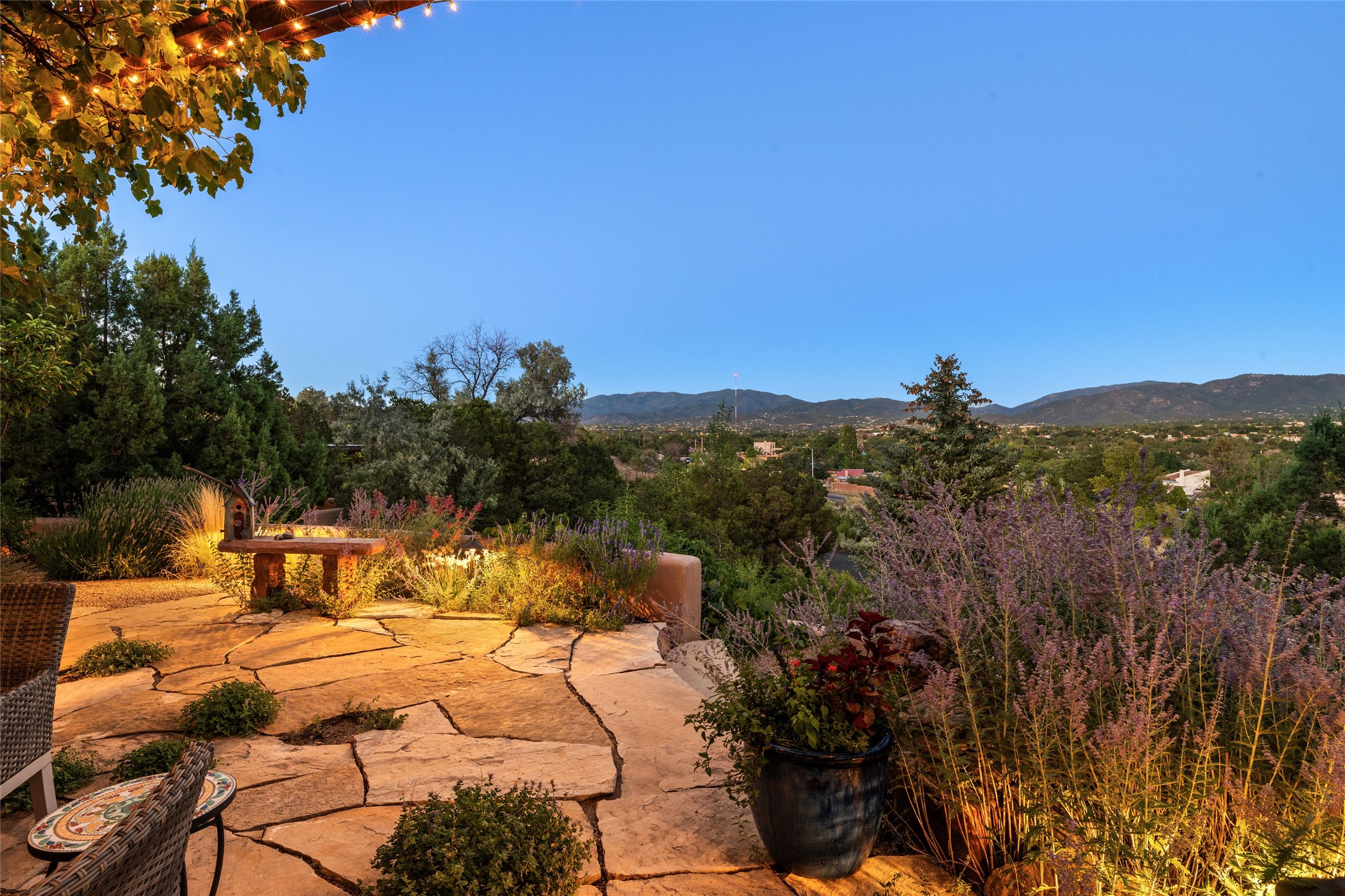 Hold your breath! You will be awed by the views, and enchanted by the gardens of this delightful, in-town property. The house was built by Michael Hurlocker, a Santa Fe builder, as his personal residence. He is well-known for his dedication to high quality design and construction. The light-filled interior is of gracious, ample proportions with many French doors leading to the gardens. Truly a home for easy living and entertaining in the spacious living and dining areas. The room-sized outside portal is pure magic, with grape and wisteria vines overhead and a view to the Sangre de Cristo Mountains to the east. A comfortable bay window seat graces the well-designed kitchen which has lots of counter space and cabinets. The primary suite is quietly situated at the top of the house, with large bedroom and splendid view deck, roomy bathroom and super-big walk-in closet. Two guest bedrooms both have French doors to the outside and are separately located from the main bedroom suite. One is currently used as a studio. And now for the bonus features - A home office with double doors in the main core of the house and a large storage room off the oversized, two-car garage. Landscape lighting has recently been installed and the gardens are on drip and sprinkler irrigation. Conveniently located in Las Lomas subdivision on 0.54 acres, this home is a delight, as also seen in the magical evening photographs!