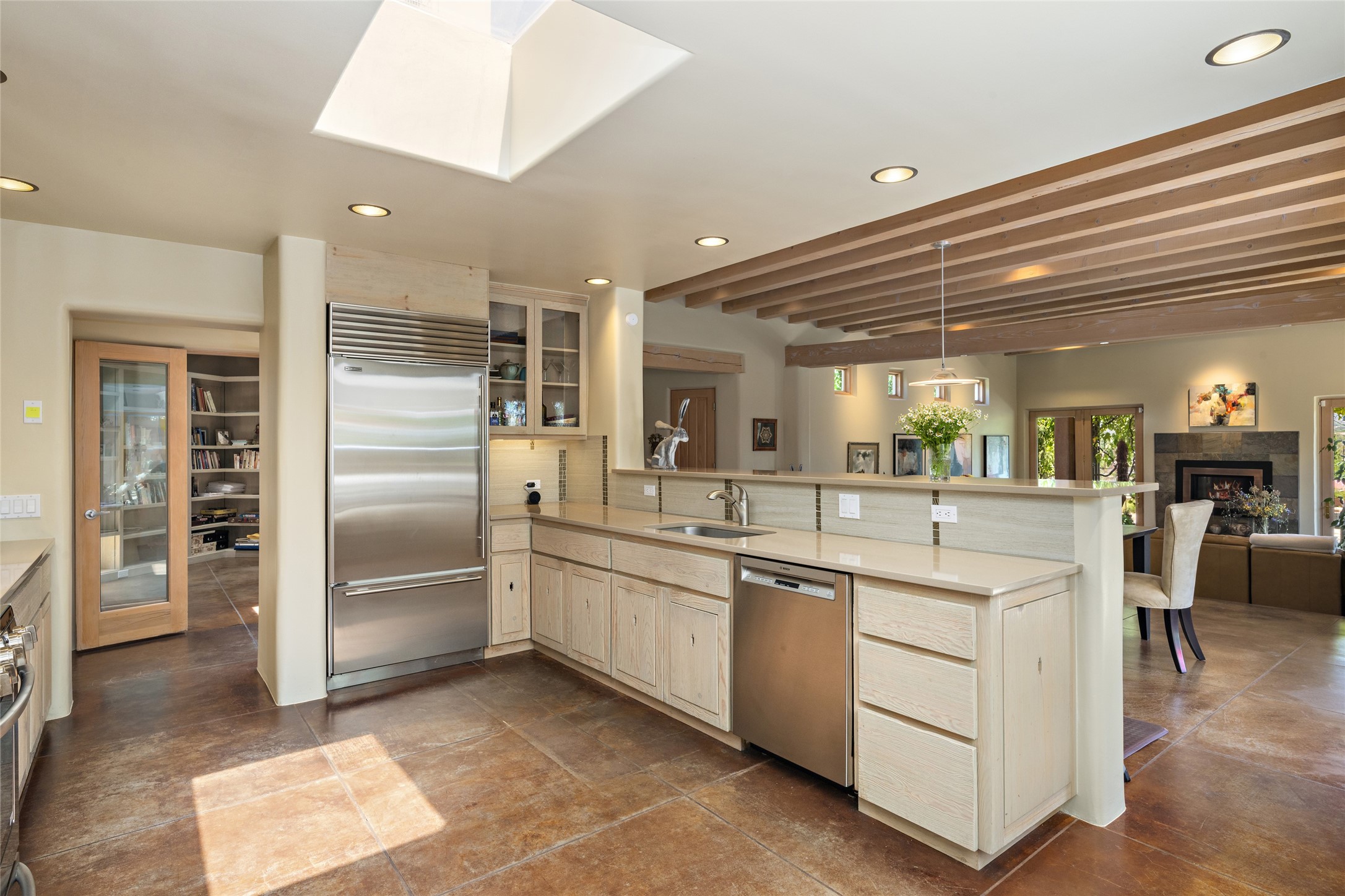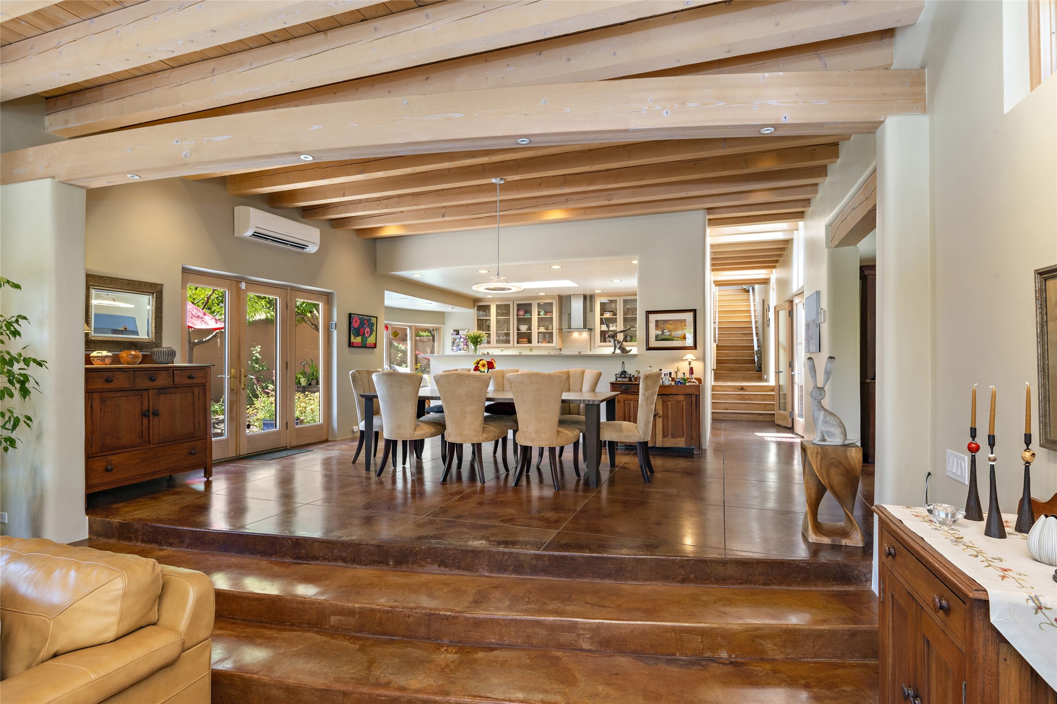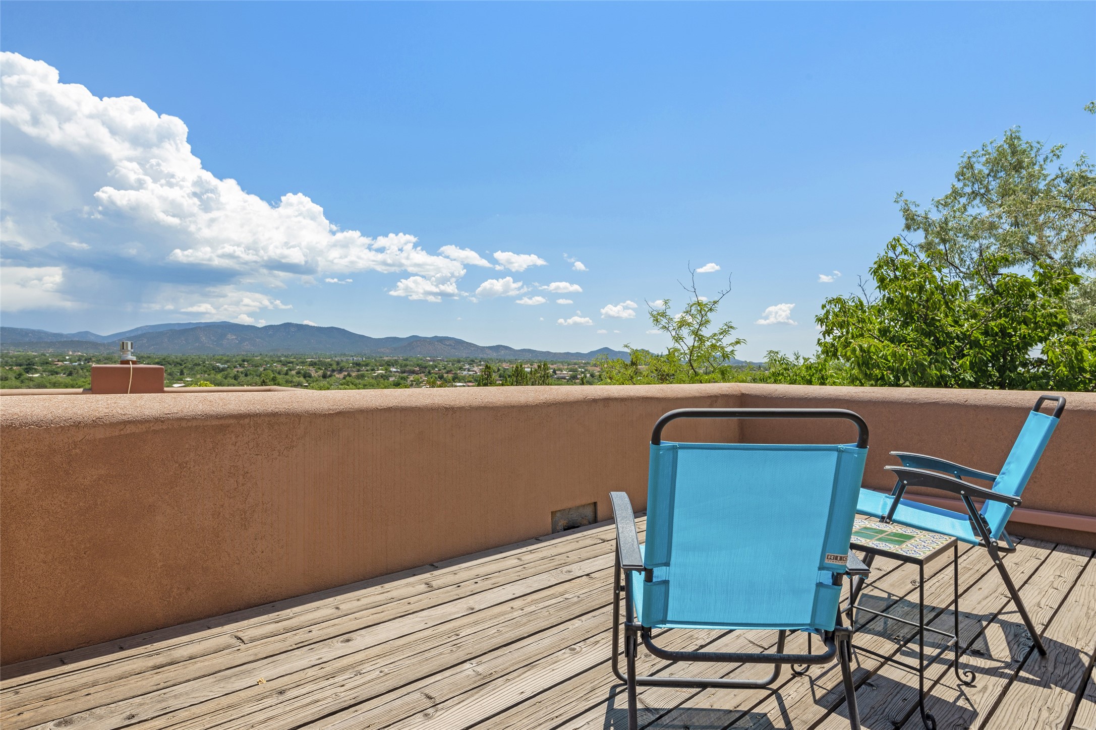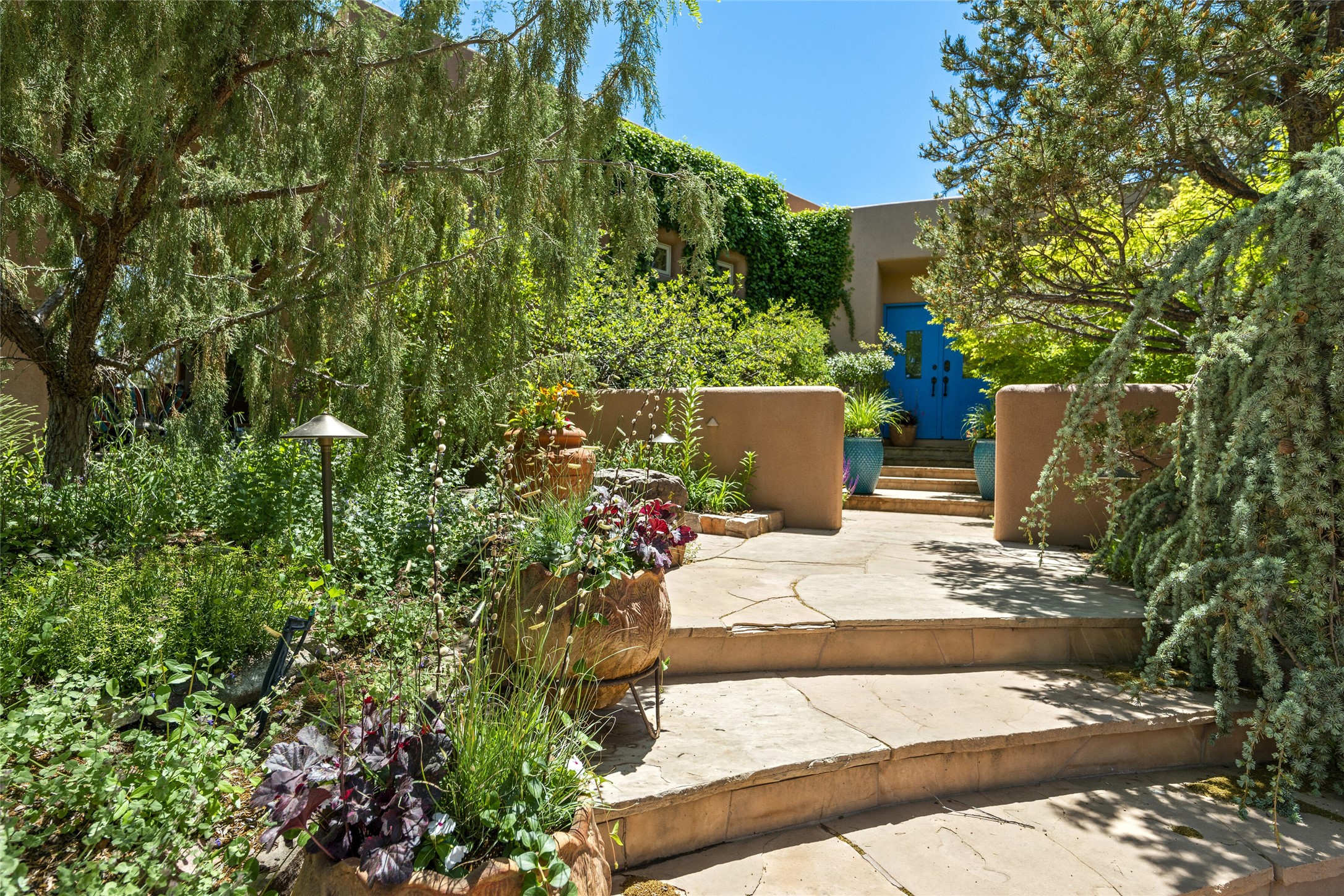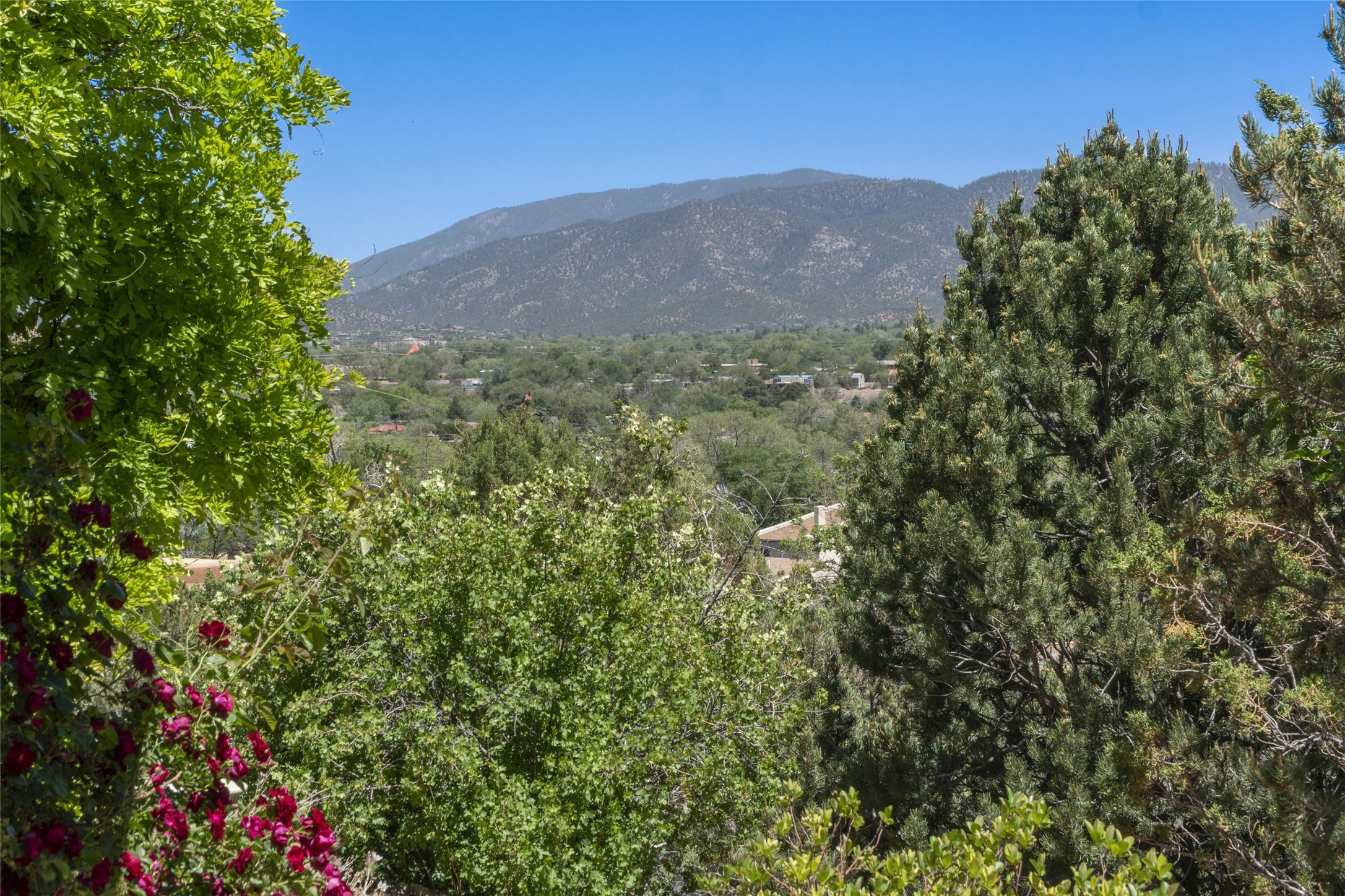 Hold your breath! You will be awed by the views, and enchanted by the gardens of this delightful, in-town property. The house was built by Michael Hurlocker, a Santa Fe builder, as his personal residence. He is well-known for his dedication to high quality design and construction. The light-filled interior is of gracious, ample proportions with many French doors leading to the gardens. Truly a home for easy living and entertaining in the spacious living and dining areas. The room-sized outside portal is pure magic, with grape and wisteria vines overhead and a view to the Sangre de Cristo Mountains to the east. A comfortable bay window seat graces the well-designed kitchen which has lots of counter space and cabinets. The primary suite is quietly situated at the top of the house, with large bedroom and splendid view deck, roomy bathroom and super-big walk-in closet. Two guest bedrooms both have French doors to the outside and are separately located from the main bedroom suite. One is currently used as a studio. And now for the bonus features - A home office with double doors in the main core of the house and a large storage room off the oversized, two-car garage. Landscape lighting has recently been installed and the gardens are on drip and sprinkler irrigation. Conveniently located in Las Lomas subdivision on 0.54 acres, this home is a delight, as also seen in the magical evening photographs!