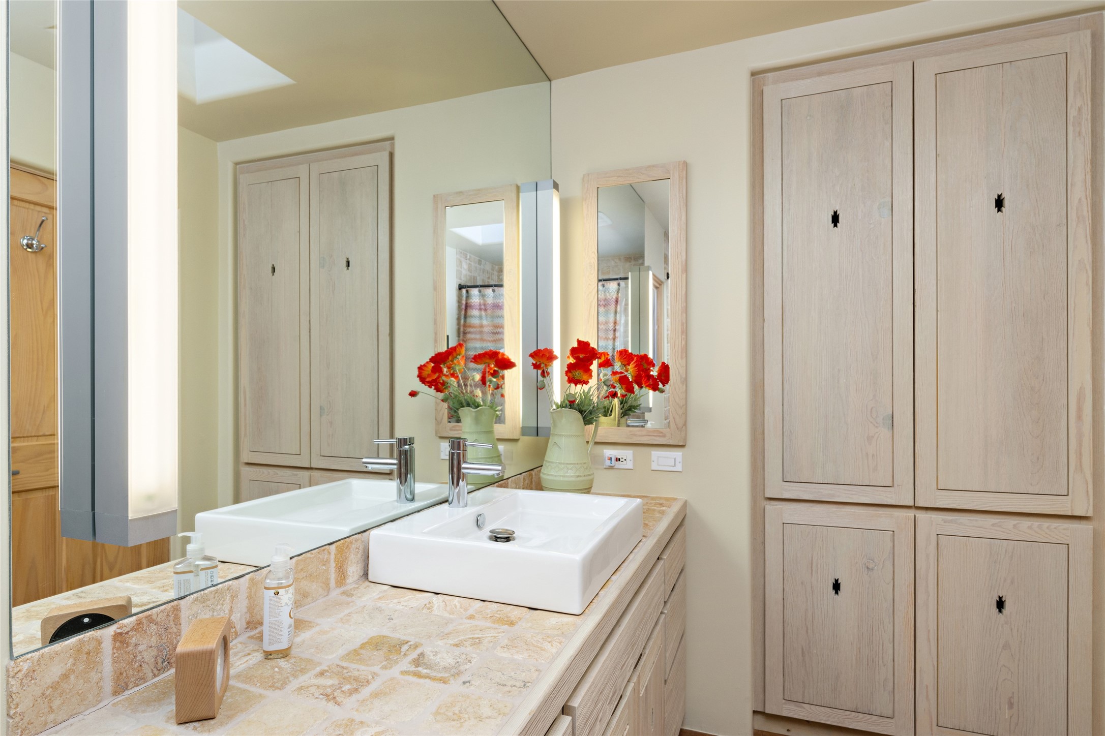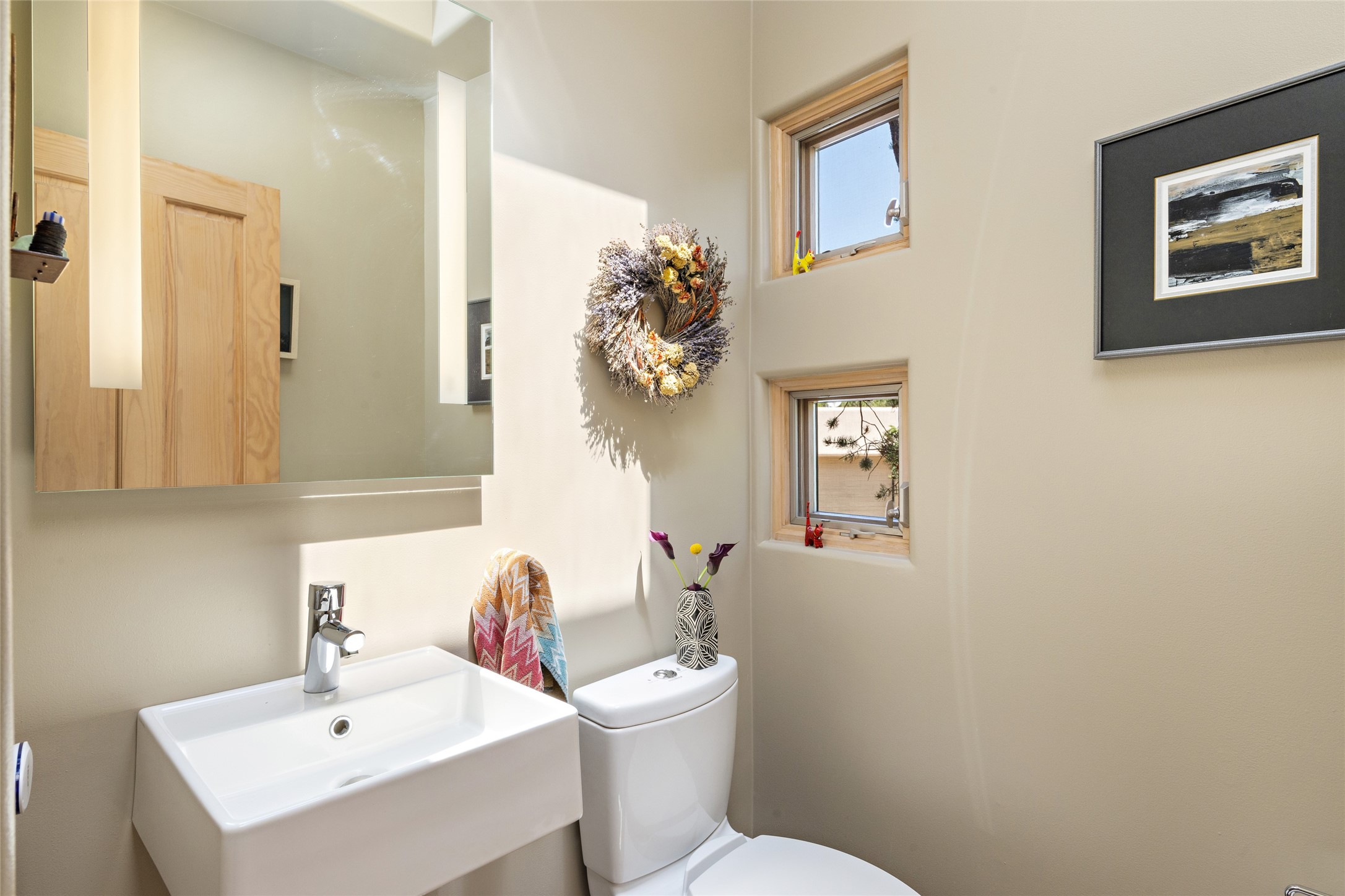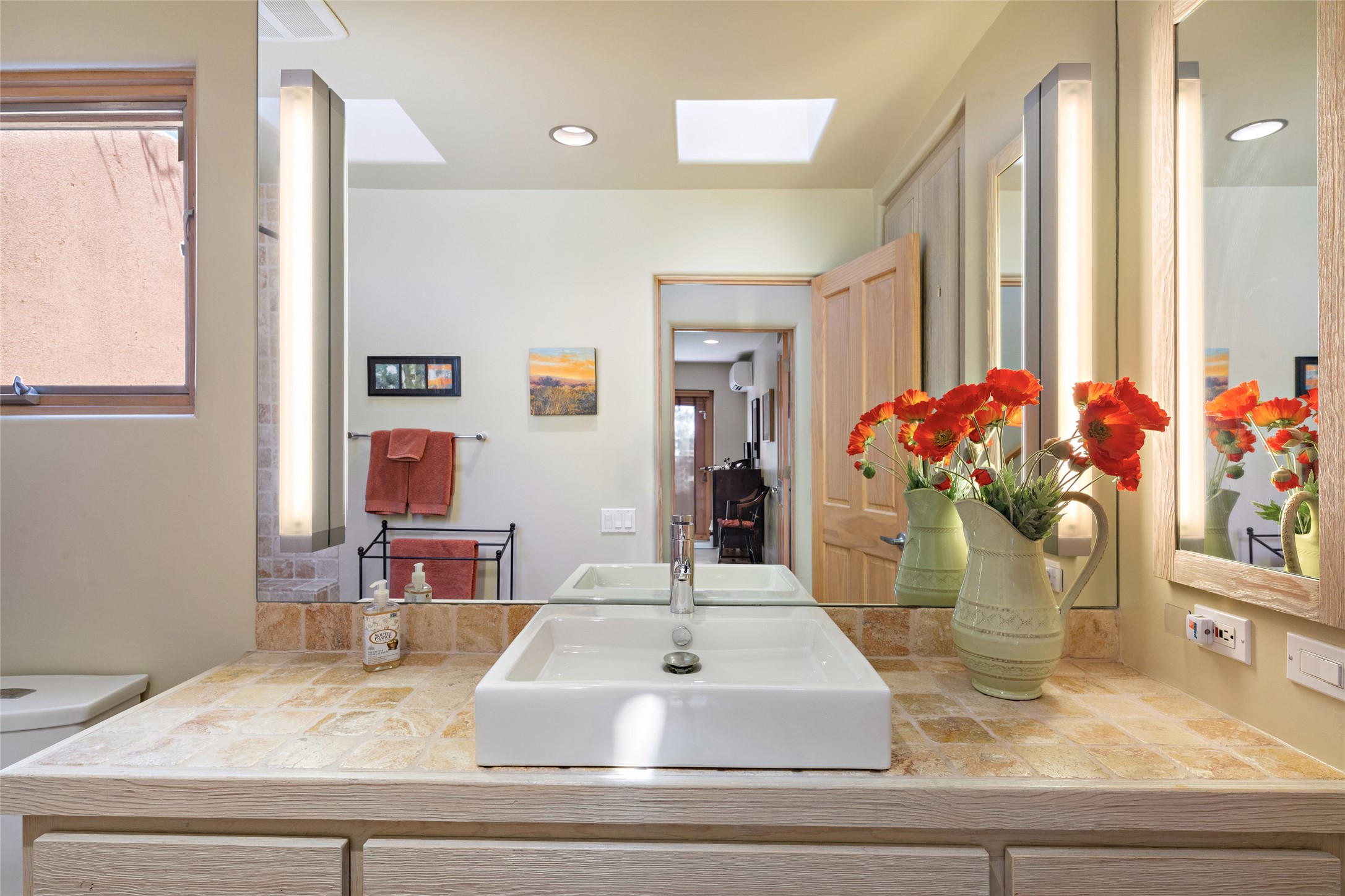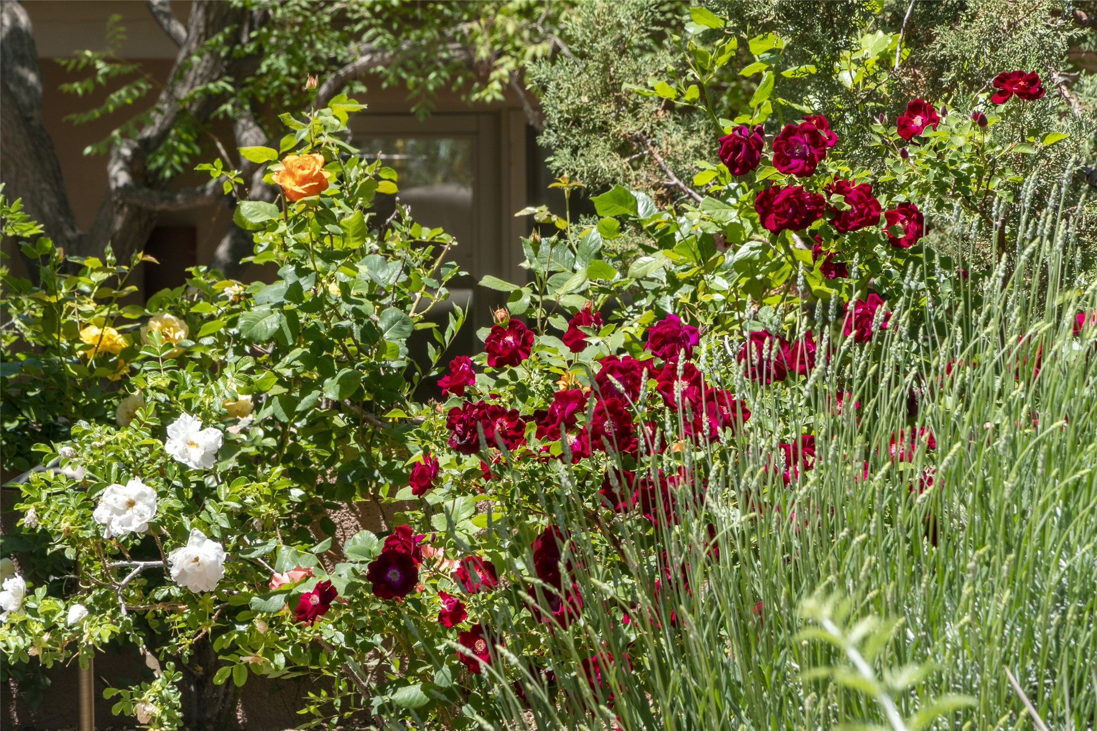 Hold your breath! You will be awed by the views, and enchanted by the gardens of this delightful, in-town property. The house was built by Michael Hurlocker, a Santa Fe builder, as his personal residence. He is well-known for his dedication to high quality design and construction. The light-filled interior is of gracious, ample proportions with many French doors leading to the gardens. Truly a home for easy living and entertaining in the spacious living and dining areas. The room-sized outside portal is pure magic, with grape and wisteria vines overhead and a view to the Sangre de Cristo Mountains to the east. A comfortable bay window seat graces the well-designed kitchen which has lots of counter space and cabinets. The primary suite is quietly situated at the top of the house, with large bedroom and splendid view deck, roomy bathroom and super-big walk-in closet. Two guest bedrooms both have French doors to the outside and are separately located from the main bedroom suite. One is currently used as a studio. And now for the bonus features - A home office with double doors in the main core of the house and a large storage room off the oversized, two-car garage. Landscape lighting has recently been installed and the gardens are on drip and sprinkler irrigation. Conveniently located in Las Lomas subdivision on 0.54 acres, this home is a delight, as also seen in the magical evening photographs!