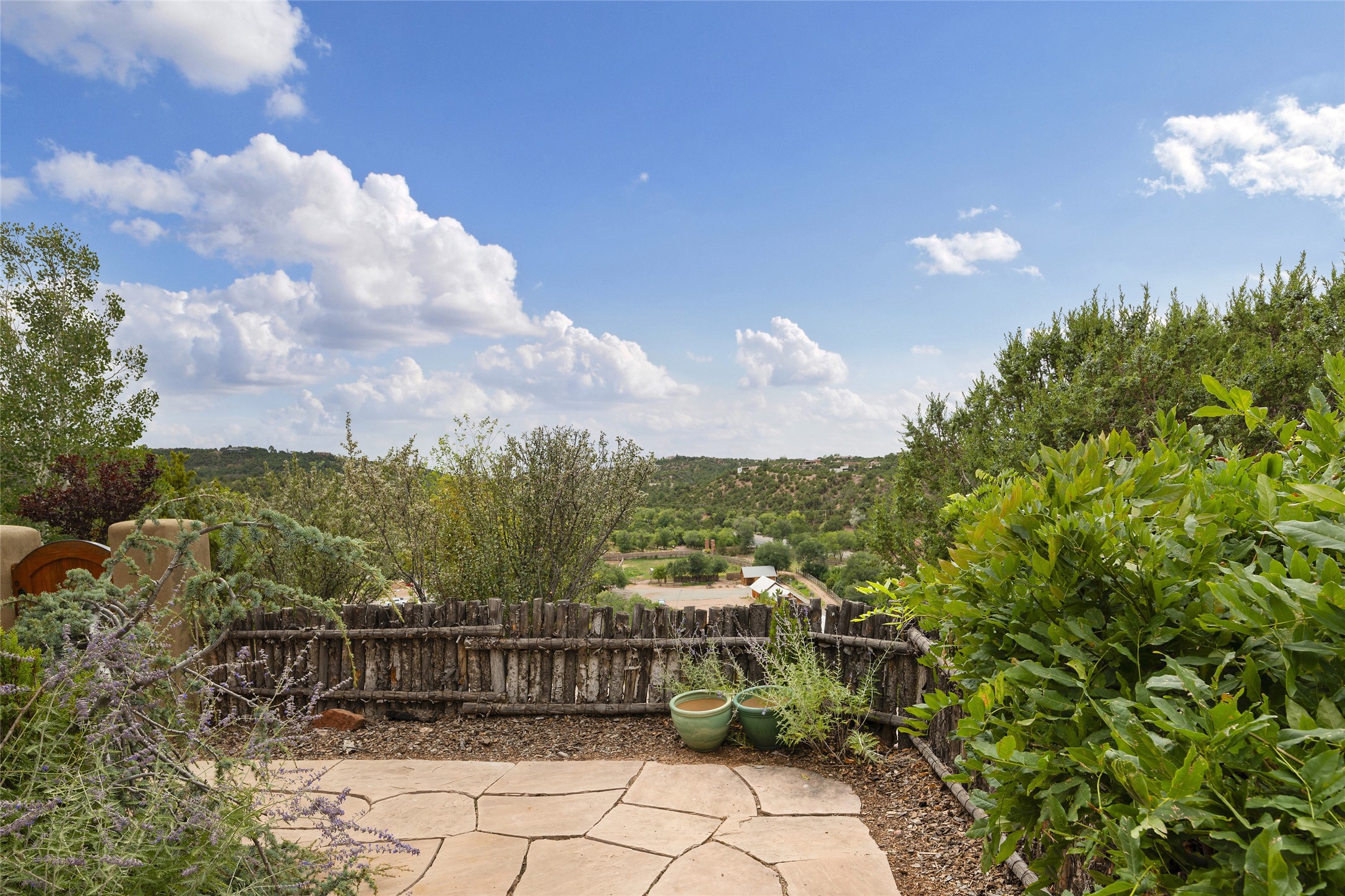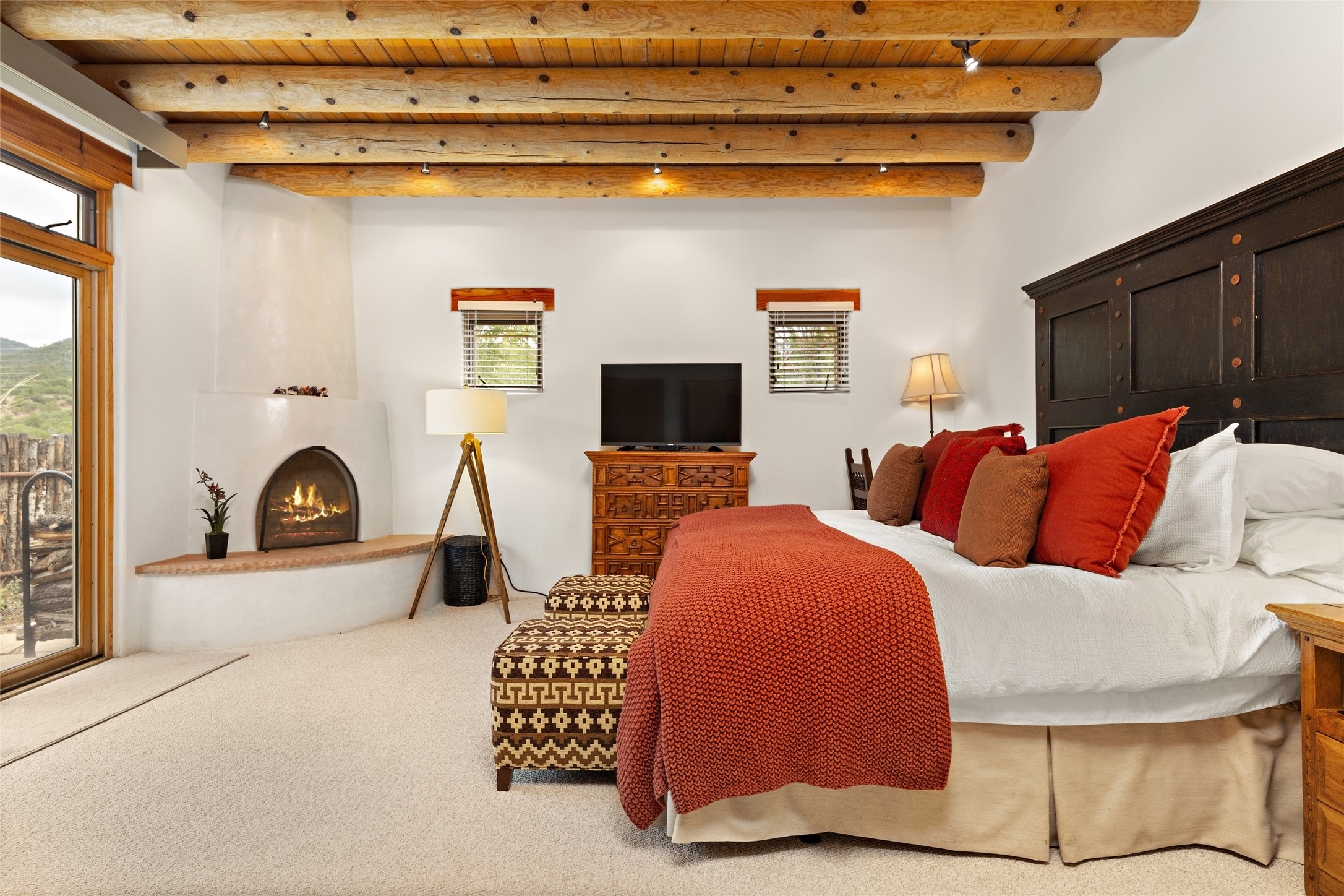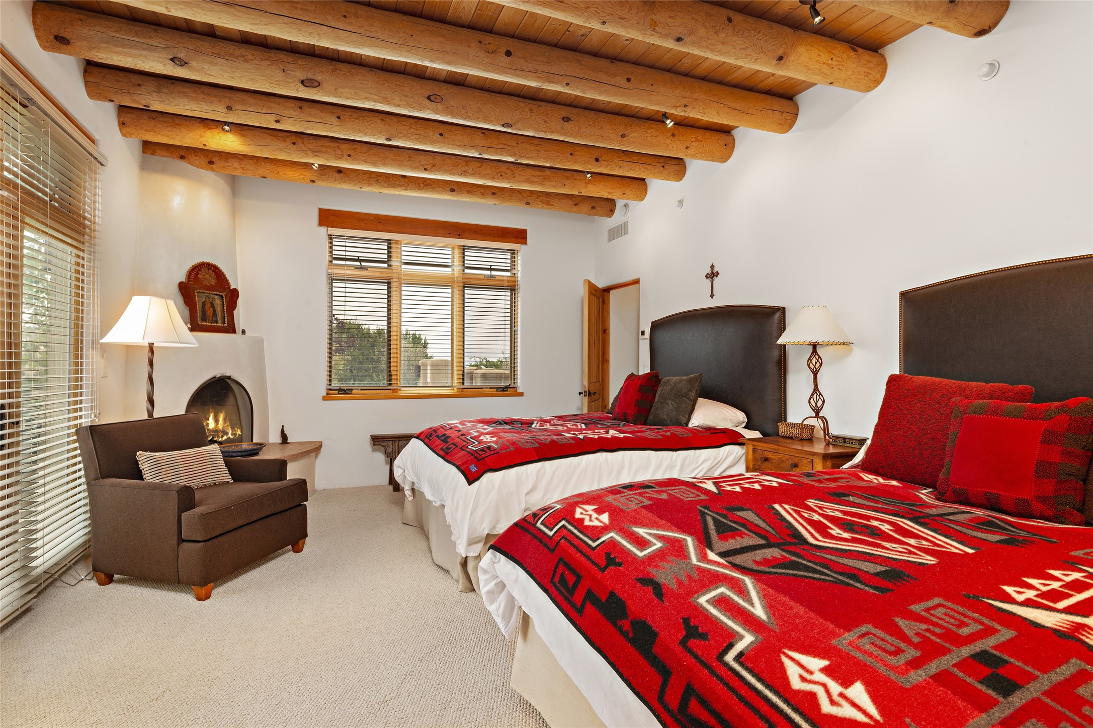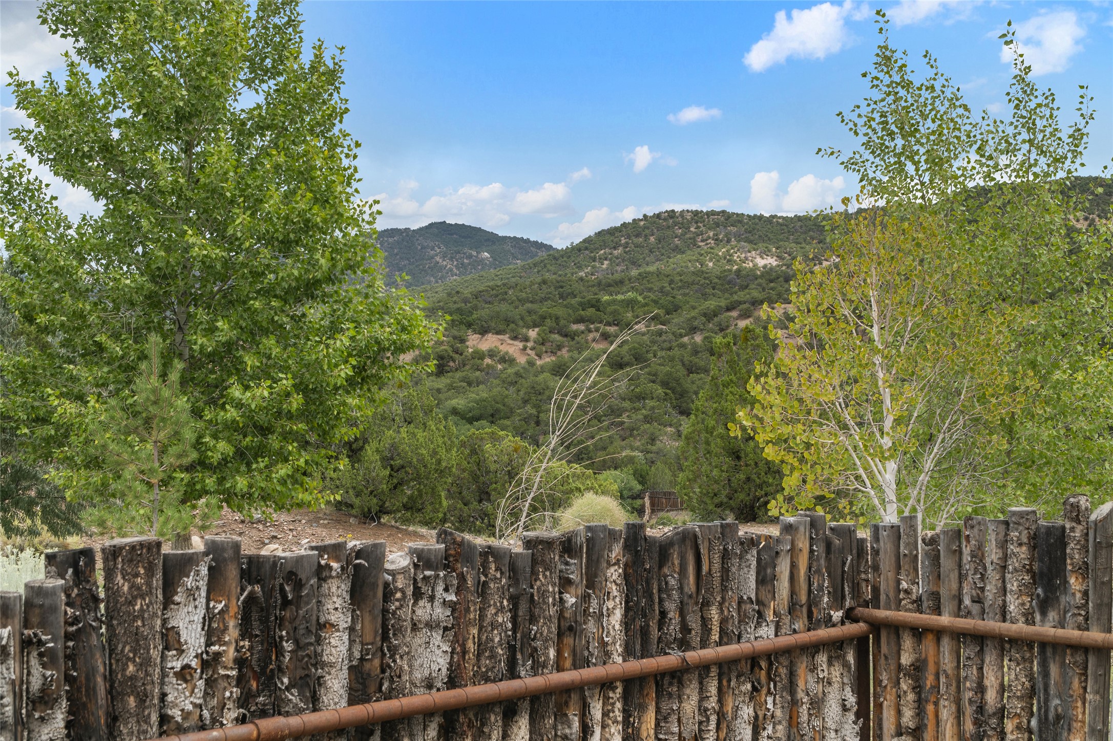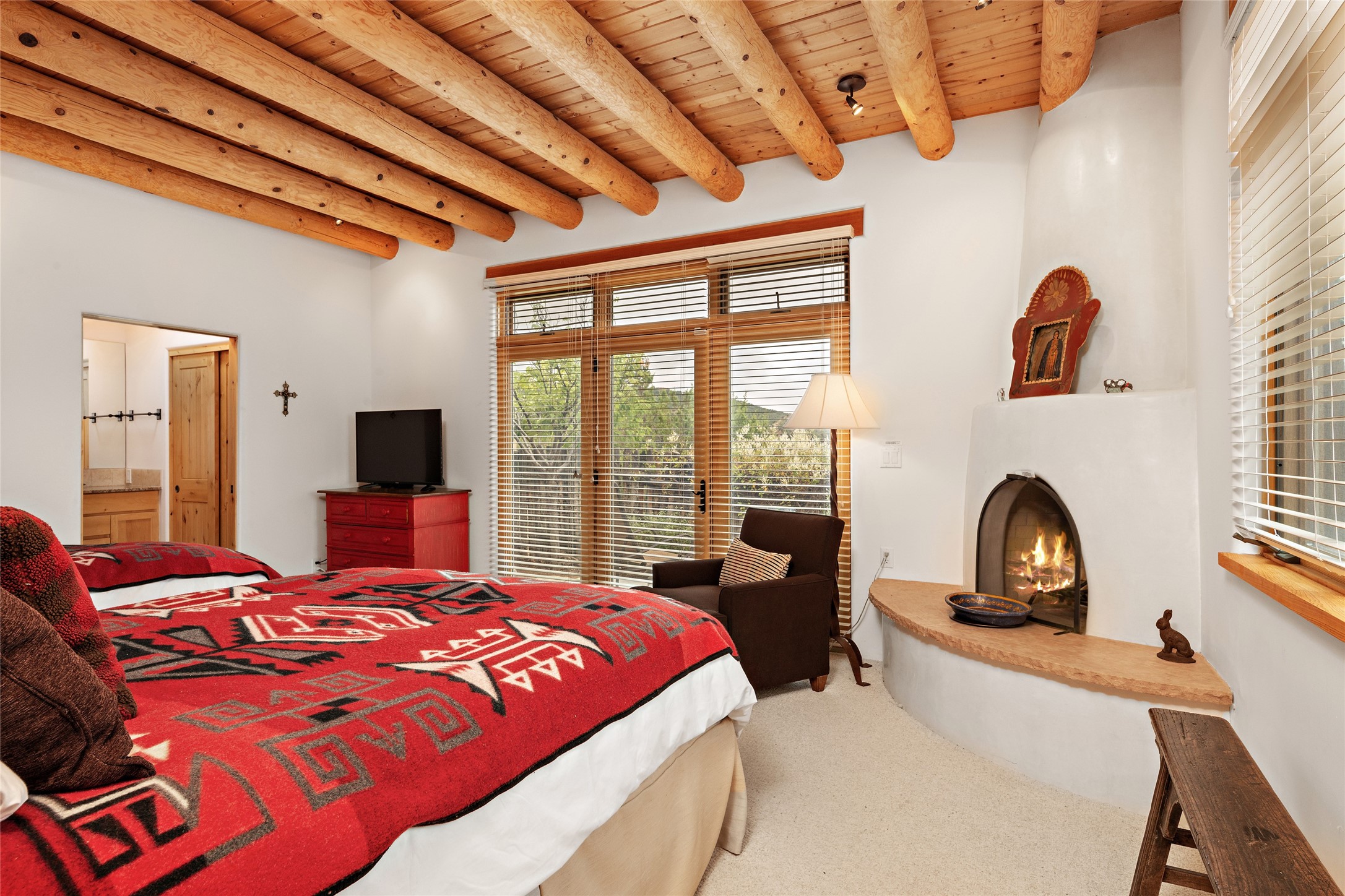 Timeless Santa Fe design, in this Bishop's Lodge Villa, which is currently the only one on the market. Numerous possibilities -full time residence, 2nd home, or vacation rental opportunities. As you walk up to the Villa, from the private gated parking area, you will notice the rolling hills to the east and west. Custom front gate leads to the wrap around coyote fenced courtyards. Spacious outdoor areas with flagstone patios. Oversized front door with grand entry. Living room features include large fireplace with flagstone hearth, built-in custom bookshelves and cabinets, as well as sliding doors that lead to an outdoor patio. Generous U-shaped kitchen with pantry, storage and bar counter seating, ideal for entertaining. Kitchen opens to expansive dining area, with beautiful natural light throughout. Two of the bedroom suites have a kiva fireplace. All 3 bedrooms have private bathrooms and separate outdoor patios. One ensuite has a steam shower and jetted tub. Traditional Santa Fe architectural elements throughout. High ceilings including tongue/groove with beams, corbels, plaster walls, wood & tile flooring, granite countertops, custom doors, and beam trimmed windows. Serene mountain views & lush natural landscaping. Within the cluster of villas is also a private pool. A pristine & charming neighborhood just north of downtown Santa Fe. This very private property, in beautiful Santa Fe is sure to not disappoint. Owners attentiveness to detail has this Villa move-in ready!