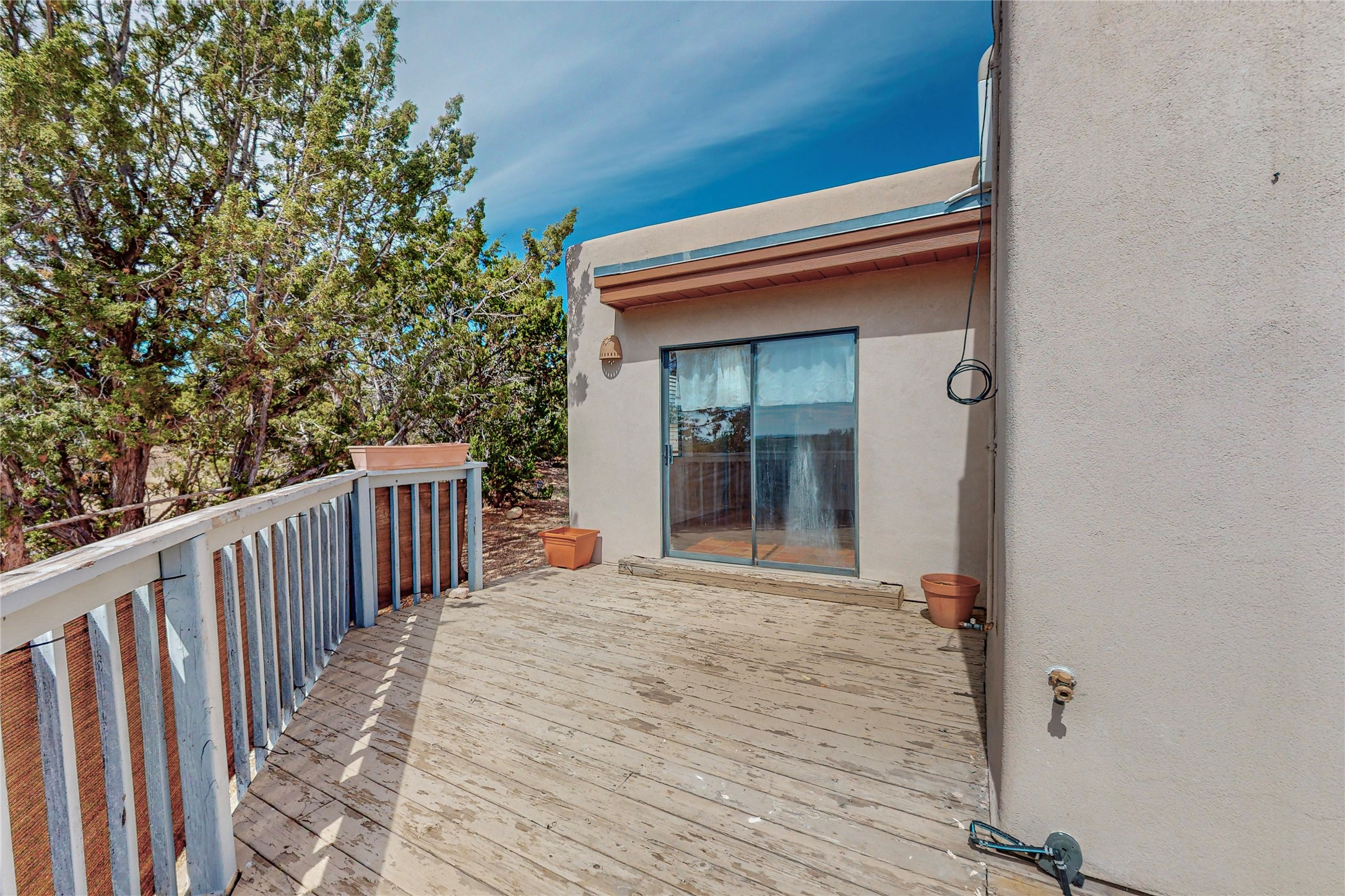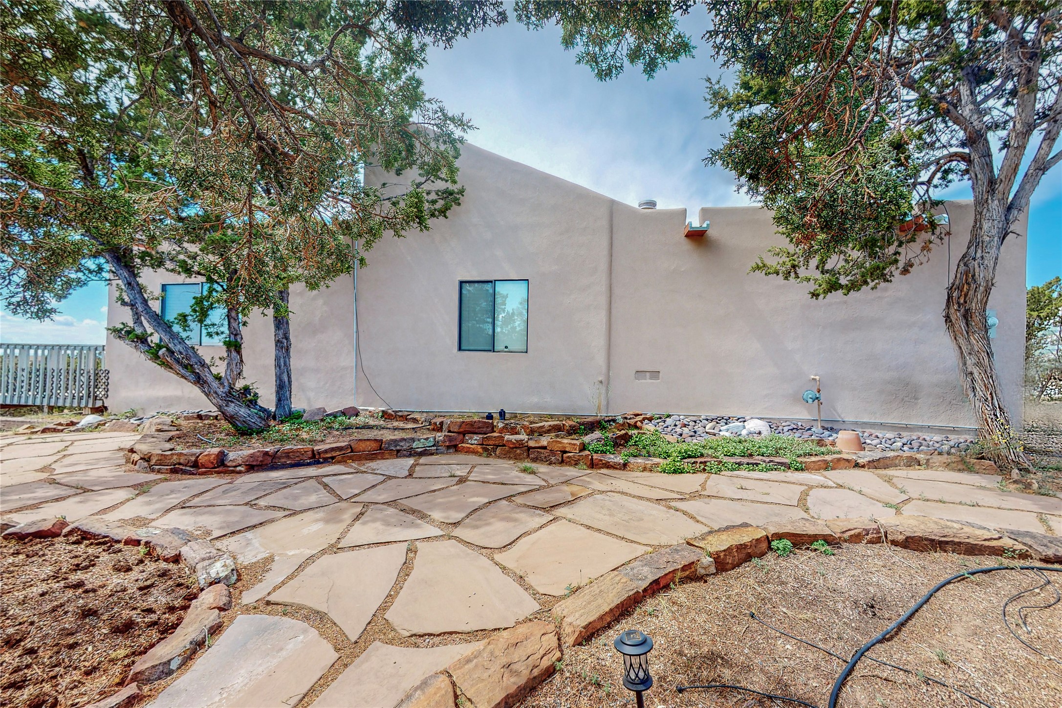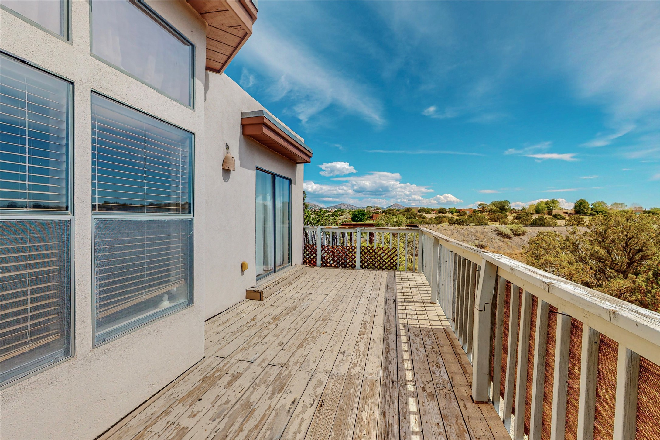 A rare exceptionally semi-private location with no thru streets and minimal ambient noise. Lot backs to a large greenbelt with direct access to social paths and the rail trail. East side of lot borders a retired historic railroad spur that runs between the Santa Fe Railyard and Lamy. The spur and subsequent train cars are occasionally used for slow-roll excursions and Hollywood movie sets (Oppenheimer). The east side of the home also features a flagstone patio with lovely views. The quaint home offers a super bright and light open flow passive solar design with high ceilings adding to spacious feel. Flexible floor plan. Great separation between owner's suite and the 2 guest bedrooms. Livingroom with corner kiva fireplace can be converted back to gas. Freshly painted throughout the interior; the canales, stucco and overhangs newly maintained. All appliances are newer, along with chef sink. New lighting in kitchen, foyer, & bathrooms.Three mini-splits were installed in 2021 for extra heating and cooling. There is a 2-car garage with circular driveway and guest parking. A large wood deck spans the length of the home. All this plus Eldorado amenities, Senior Center, Library, local shopping and only minutes into Santa Fe.