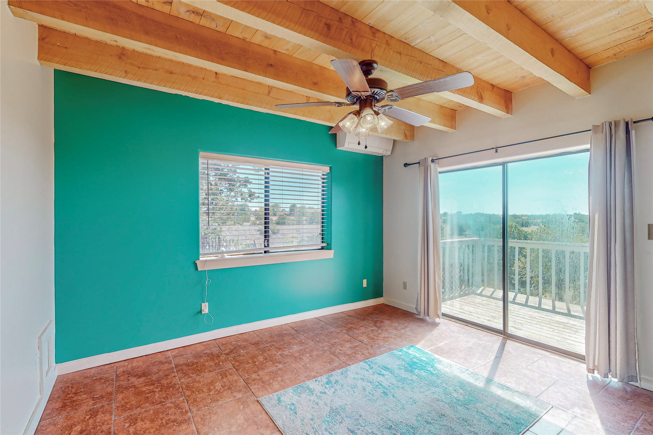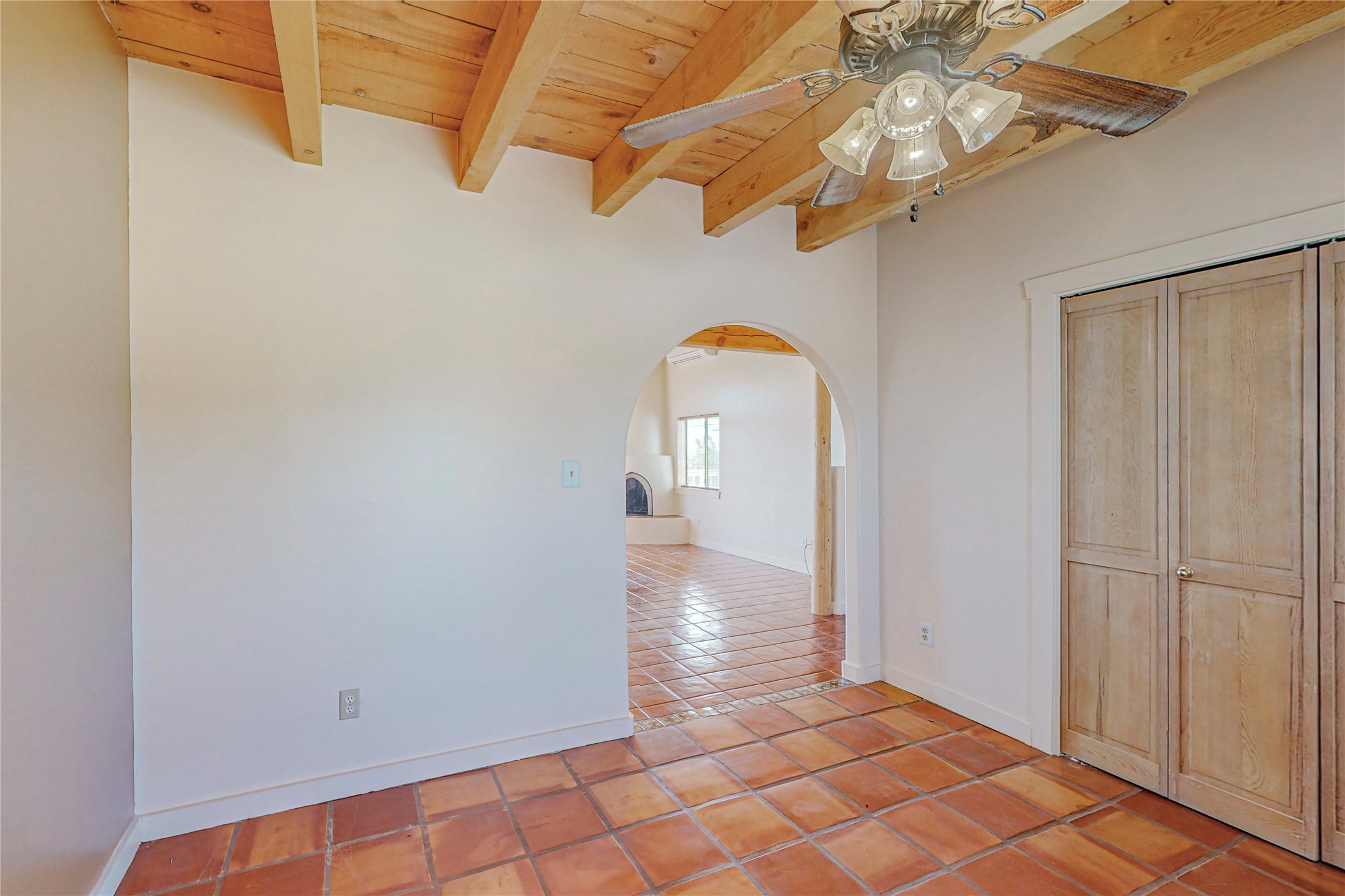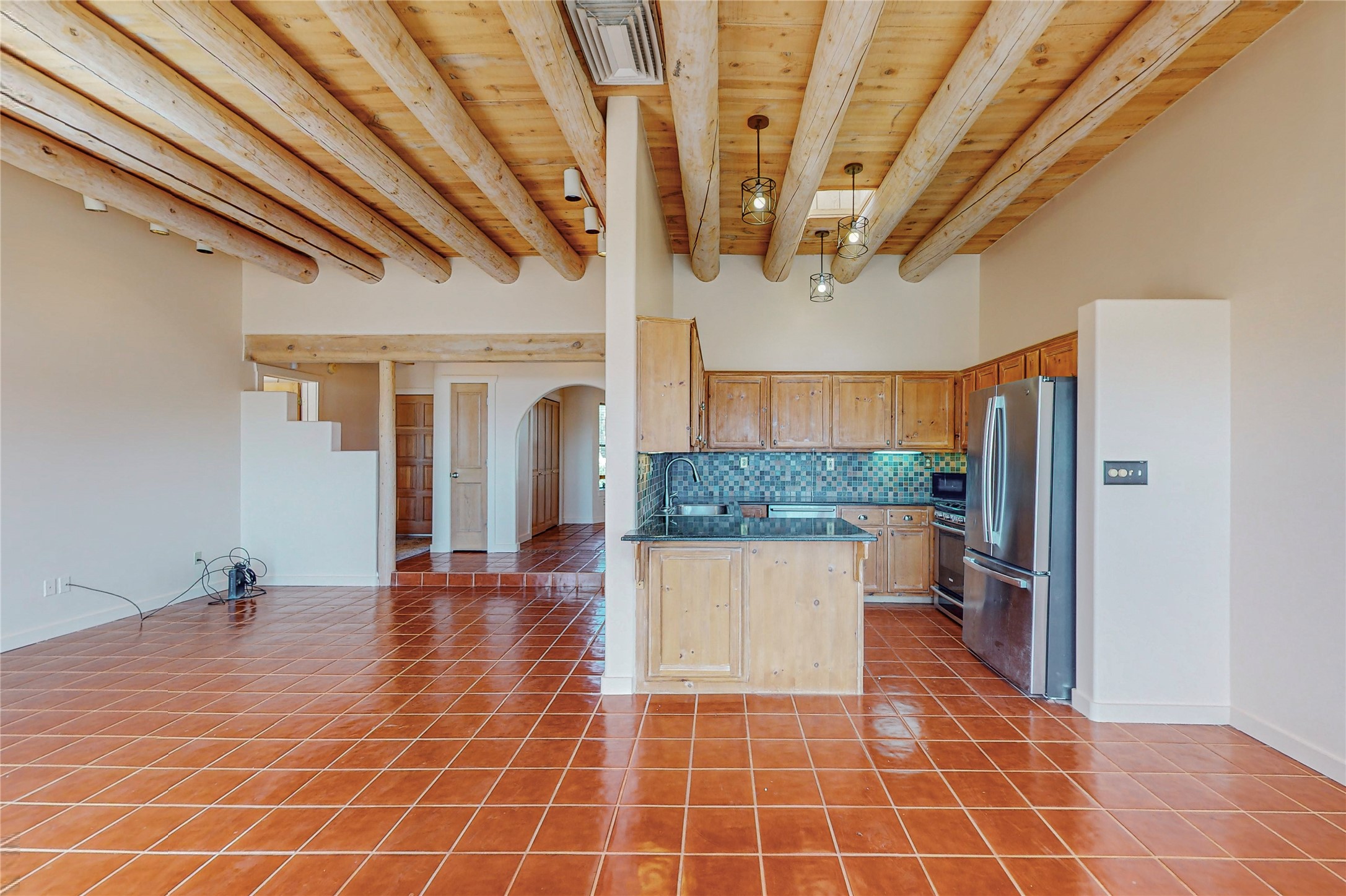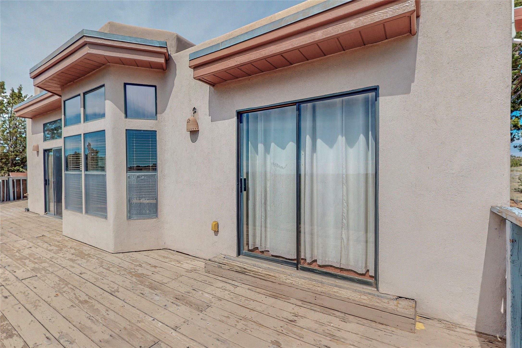 A rare exceptionally semi-private location with no thru streets and minimal ambient noise. Lot backs to a large greenbelt with direct access to social paths and the rail trail. East side of lot borders a retired historic railroad spur that runs between the Santa Fe Railyard and Lamy. The spur and subsequent train cars are occasionally used for slow-roll excursions and Hollywood movie sets (Oppenheimer). The east side of the home also features a flagstone patio with lovely views. The quaint home offers a super bright and light open flow passive solar design with high ceilings adding to spacious feel. Flexible floor plan. Great separation between owner's suite and the 2 guest bedrooms. Livingroom with corner kiva fireplace can be converted back to gas. Freshly painted throughout the interior; the canales, stucco and overhangs newly maintained. All appliances are newer, along with chef sink. New lighting in kitchen, foyer, & bathrooms.Three mini-splits were installed in 2021 for extra heating and cooling. There is a 2-car garage with circular driveway and guest parking. A large wood deck spans the length of the home. All this plus Eldorado amenities, Senior Center, Library, local shopping and only minutes into Santa Fe.