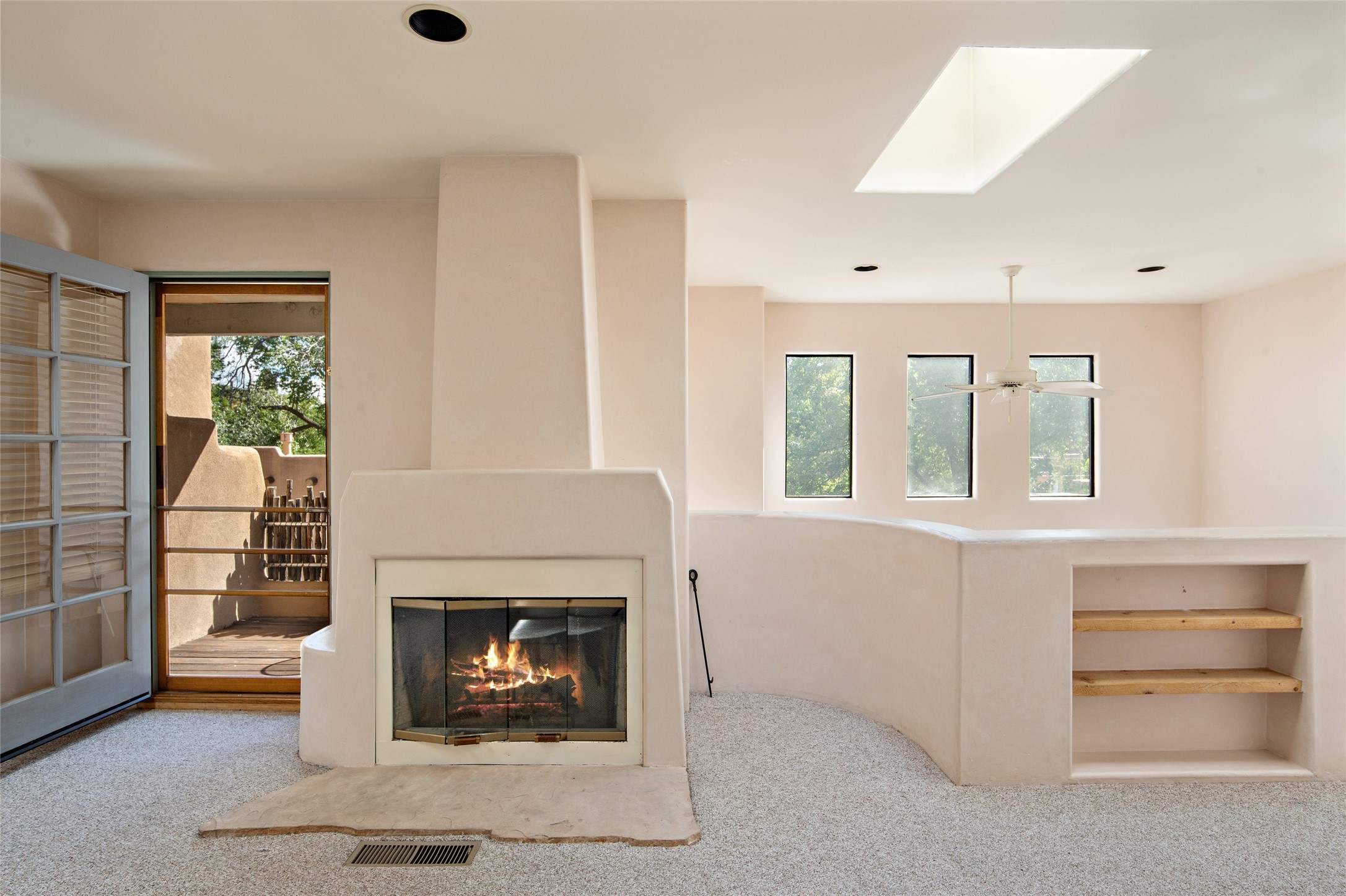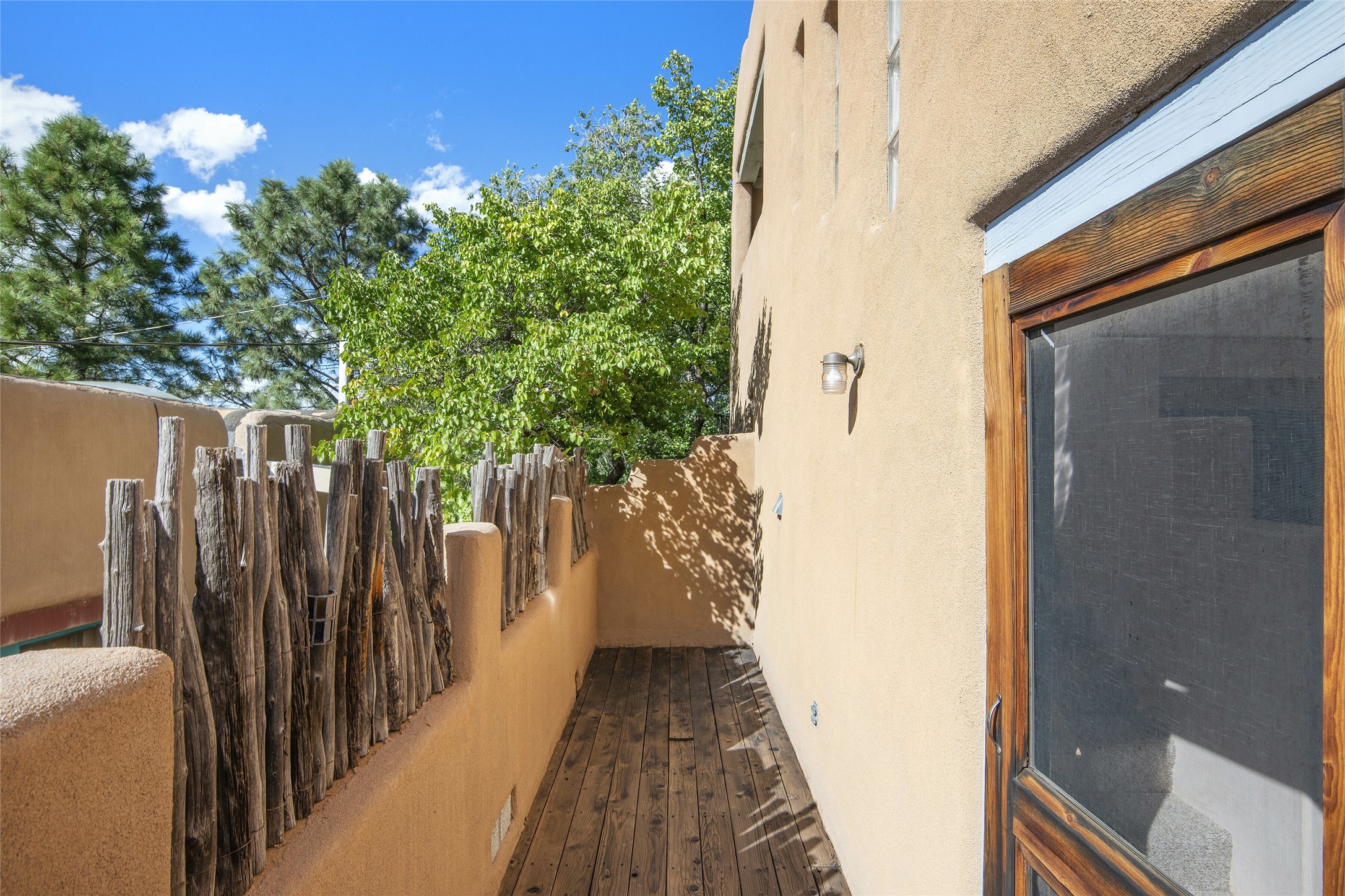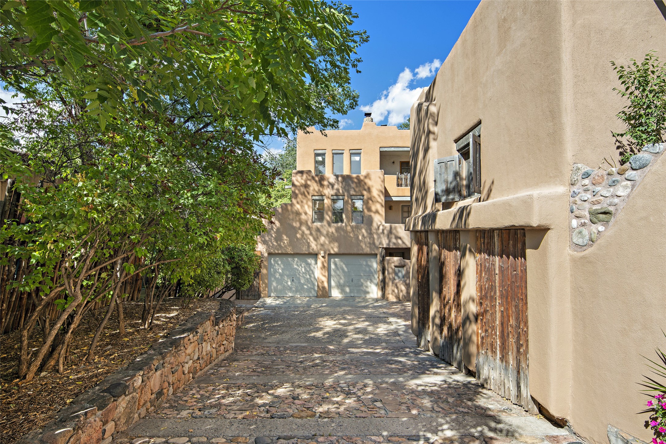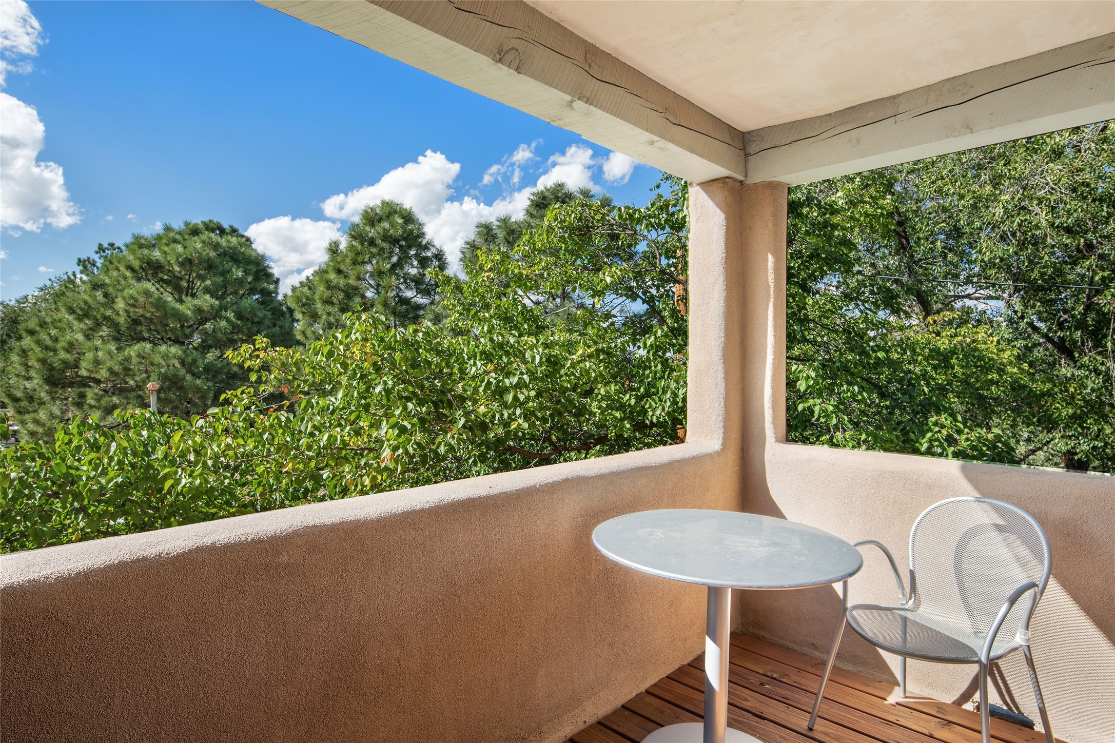 Centrally located in this quiet South Capital neighborhood, this 1,045 sq.ft., two-story condo not only has has great separation of space, but an easy and livable floor plan. The open-concept living/dining room and kitchen look out onto treetop views with access to view decks, perfect for seasonal living. A wood burning fireplace centers the living area with banco seating nearby. Large clearstory windows, skylights and high ceilings bathe the space in light. The large primary suite is separated from one other bed-room suite downstairs. Two private outdoor patios flank the primary bedroom with an-other wood burning fireplace centered in the room. Comfortable forced air heating and cooling is installed in the home. Other features include hardwood flooring, decorative vigas, built-in book shelving and a stackable washer/dryer laundry area. A one-car garage is included. This condo is part of a small condo association located in an ideal downtown Santa Fe location.