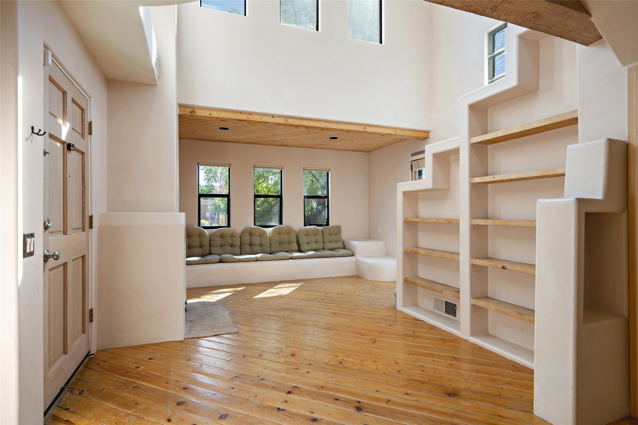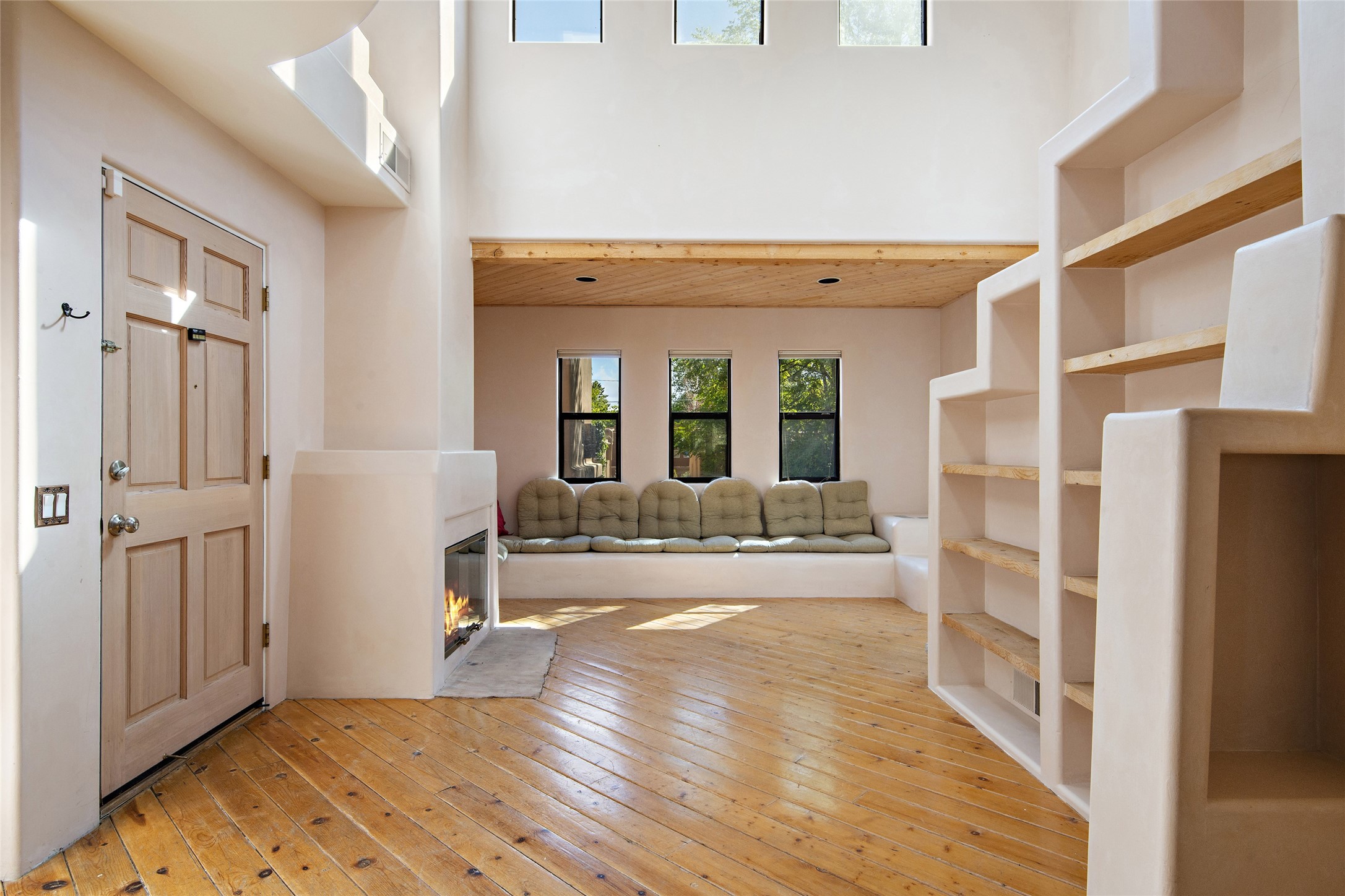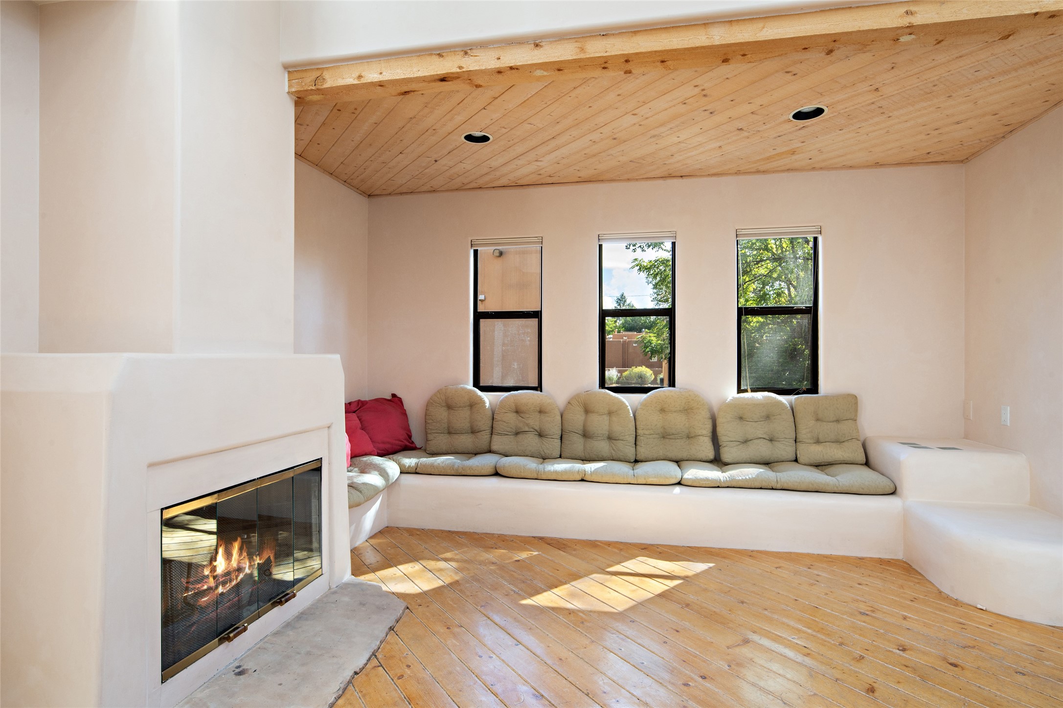 Centrally located in this quiet South Capital neighborhood, this 1,045 sq.ft., two-story condo not only has has great separation of space, but an easy and livable floor plan. The open-concept living/dining room and kitchen look out onto treetop views with access to view decks, perfect for seasonal living. A wood burning fireplace centers the living area with banco seating nearby. Large clearstory windows, skylights and high ceilings bathe the space in light. The large primary suite is separated from one other bed-room suite downstairs. Two private outdoor patios flank the primary bedroom with an-other wood burning fireplace centered in the room. Comfortable forced air heating and cooling is installed in the home. Other features include hardwood flooring, decorative vigas, built-in book shelving and a stackable washer/dryer laundry area. A one-car garage is included. This condo is part of a small condo association located in an ideal downtown Santa Fe location.