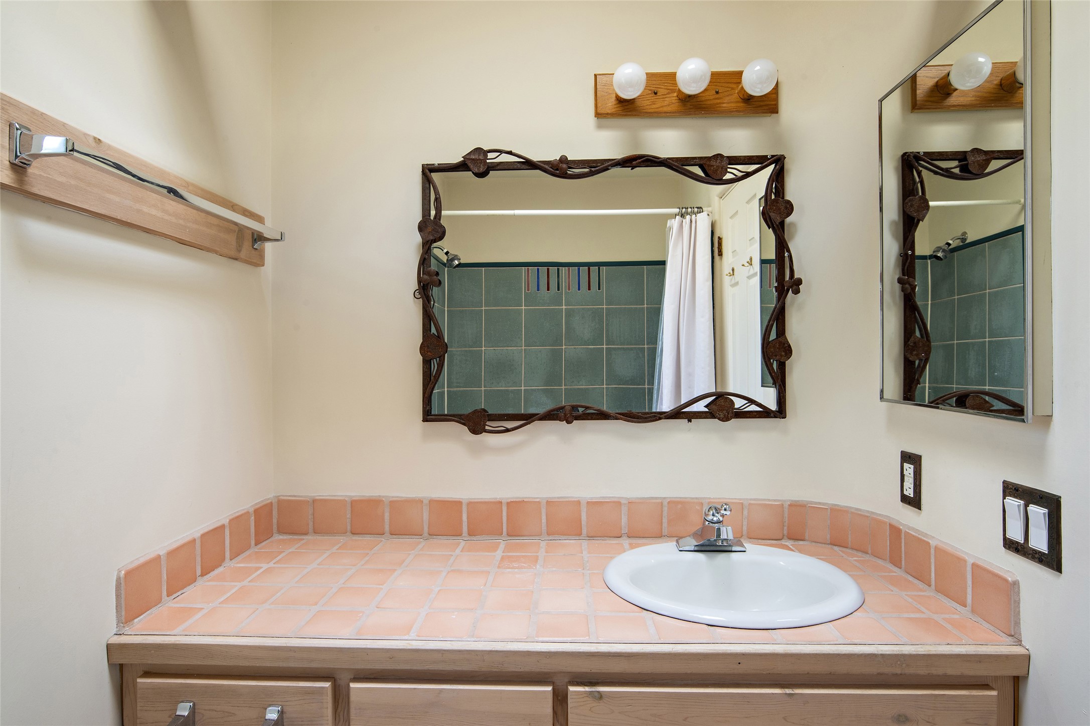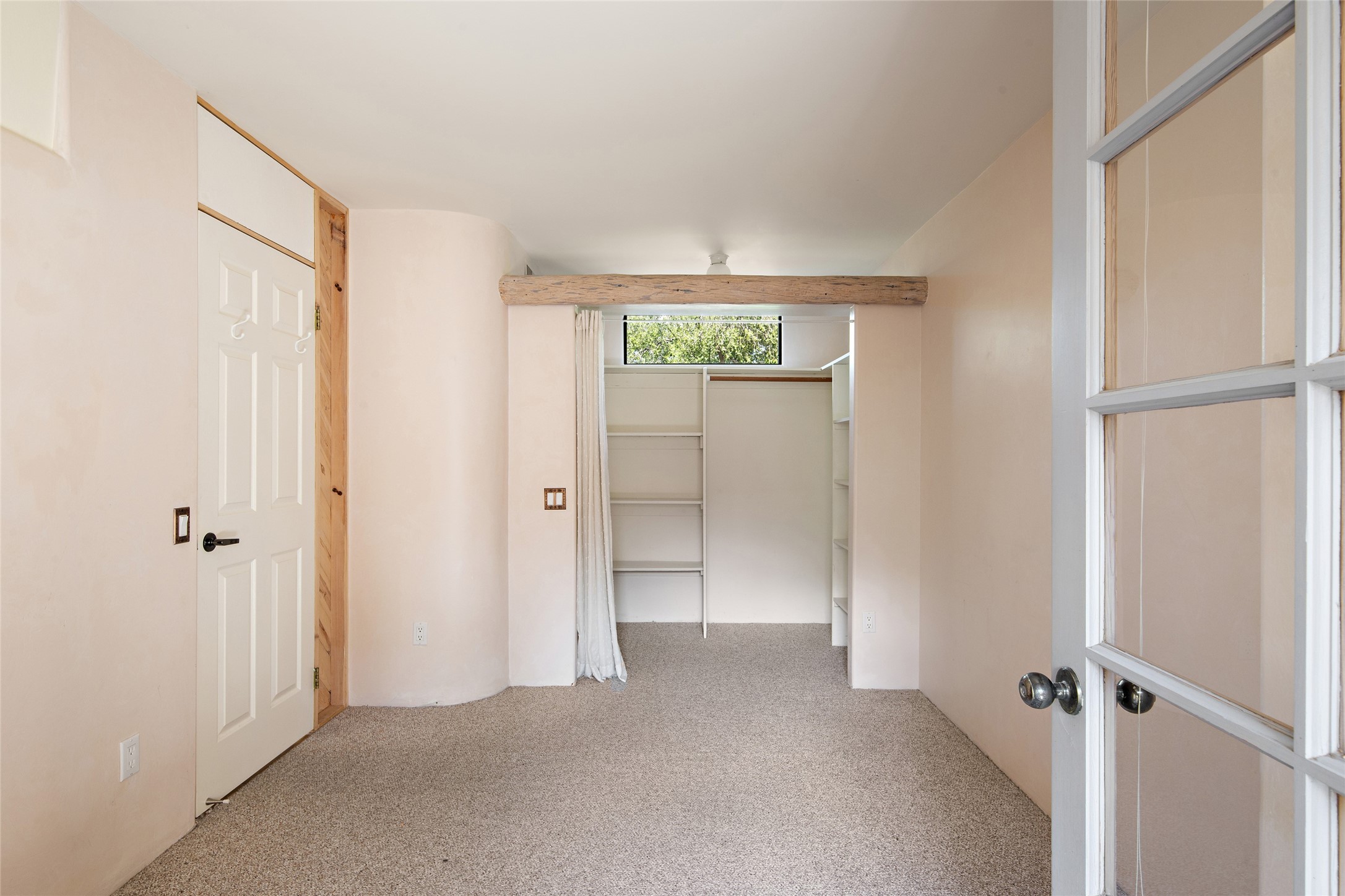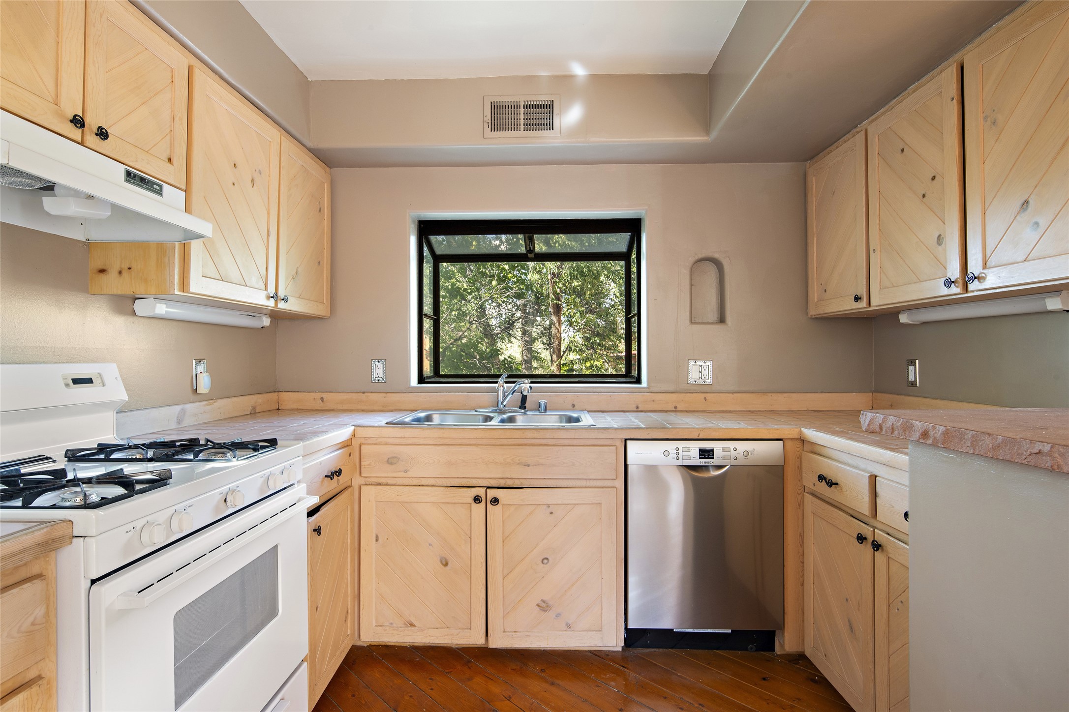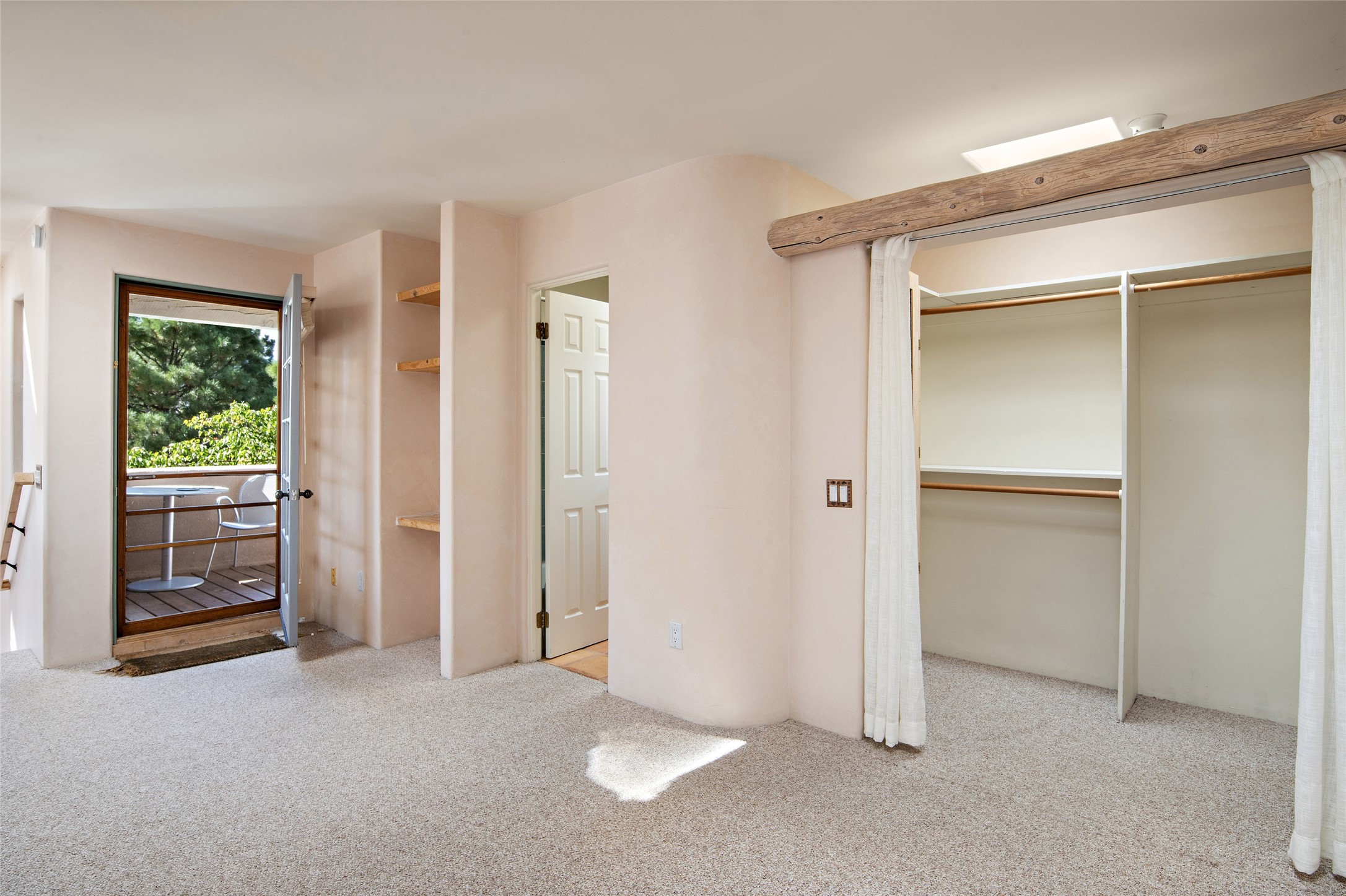 Centrally located in this quiet South Capital neighborhood, this 1,045 sq.ft., two-story condo not only has has great separation of space, but an easy and livable floor plan. The open-concept living/dining room and kitchen look out onto treetop views with access to view decks, perfect for seasonal living. A wood burning fireplace centers the living area with banco seating nearby. Large clearstory windows, skylights and high ceilings bathe the space in light. The large primary suite is separated from one other bed-room suite downstairs. Two private outdoor patios flank the primary bedroom with an-other wood burning fireplace centered in the room. Comfortable forced air heating and cooling is installed in the home. Other features include hardwood flooring, decorative vigas, built-in book shelving and a stackable washer/dryer laundry area. A one-car garage is included. This condo is part of a small condo association located in an ideal downtown Santa Fe location.