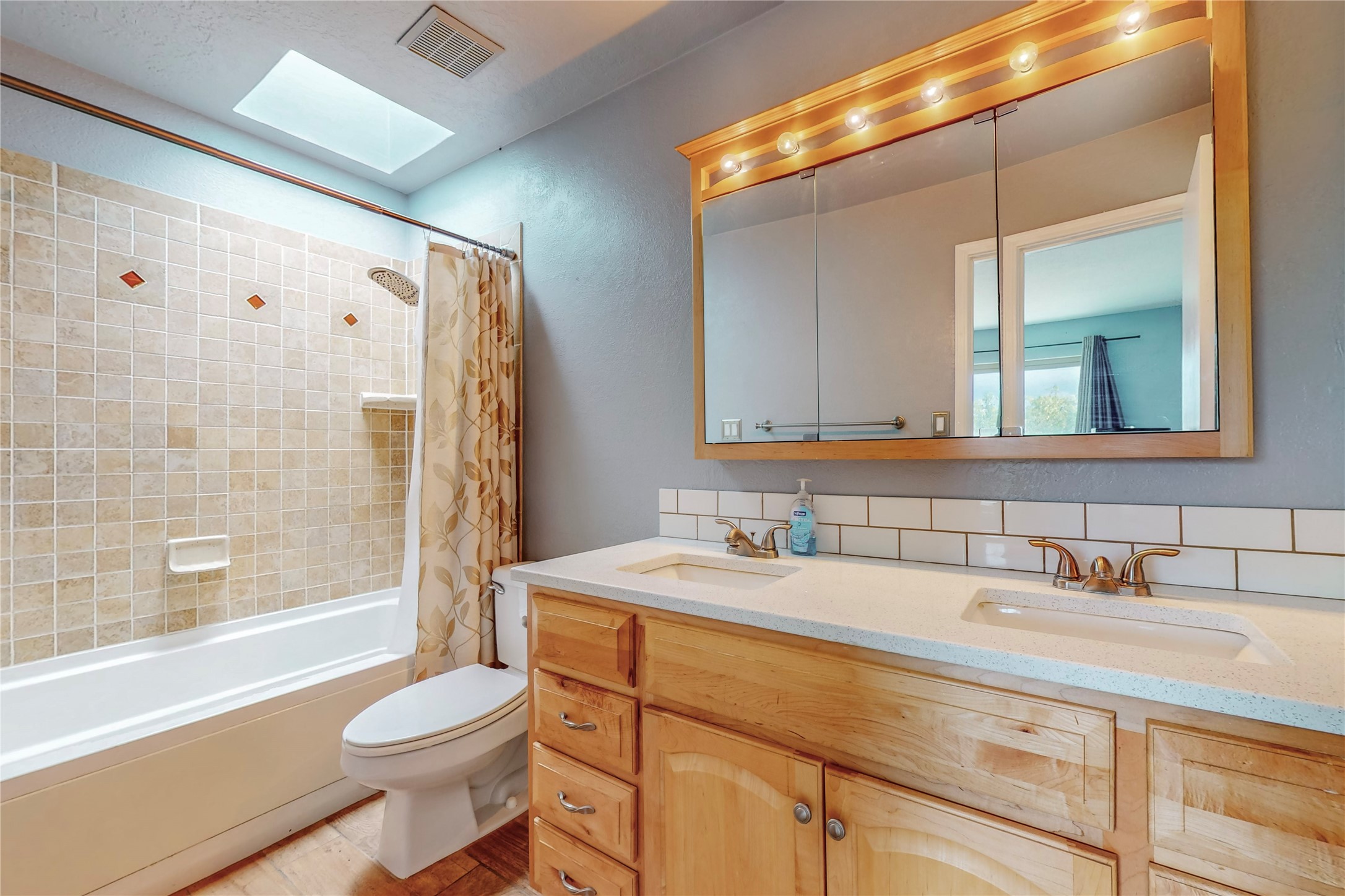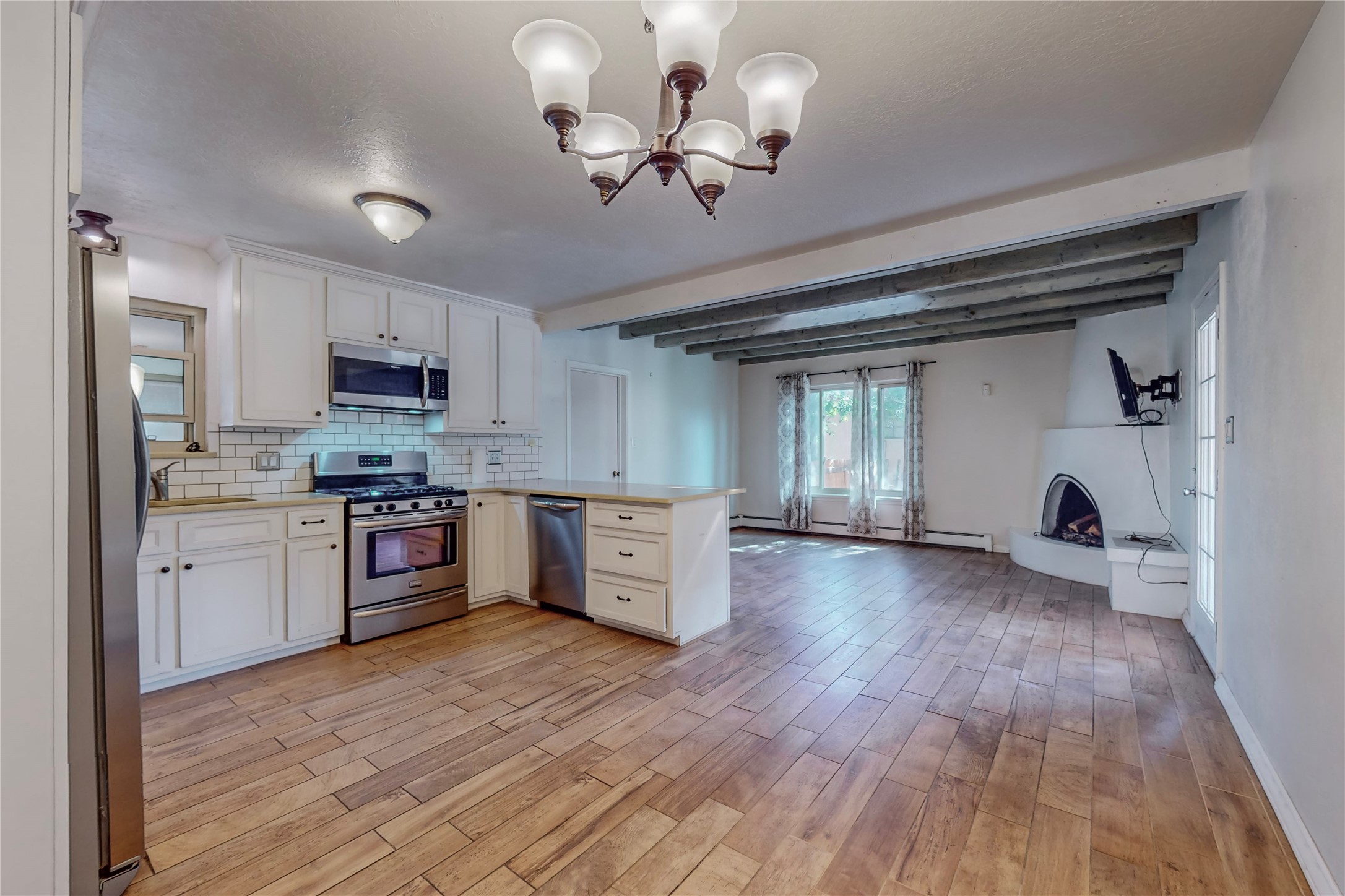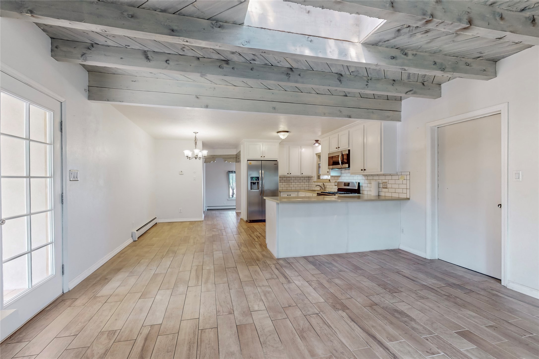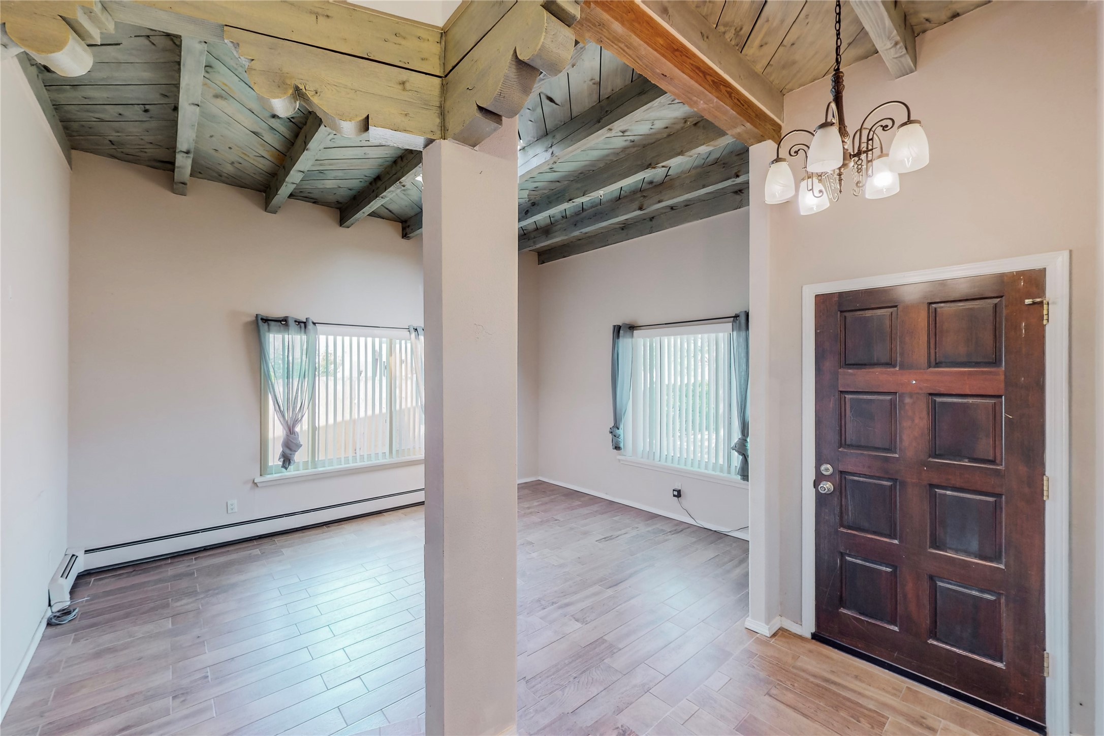 Surprisingly private location in Pueblos de Rodeo, a quiet backwater subdivision of Santa Fe. This lovely light home shaded by tall trees, has three bedrooms, two full baths with tile floors and lots of windows. There is a sunken den area separated from the main living area ideal for quiet meditation or reading. The family room with kiva fireplace for cheery winter nights is open to the kitchen and dining areas flows to an expansive deck and big privately fenced back yard. A large 2 car garage sits back off the road allowing for extra parking. It is conveniently close to recreation centers and lots of shopping areas, parks and trails.