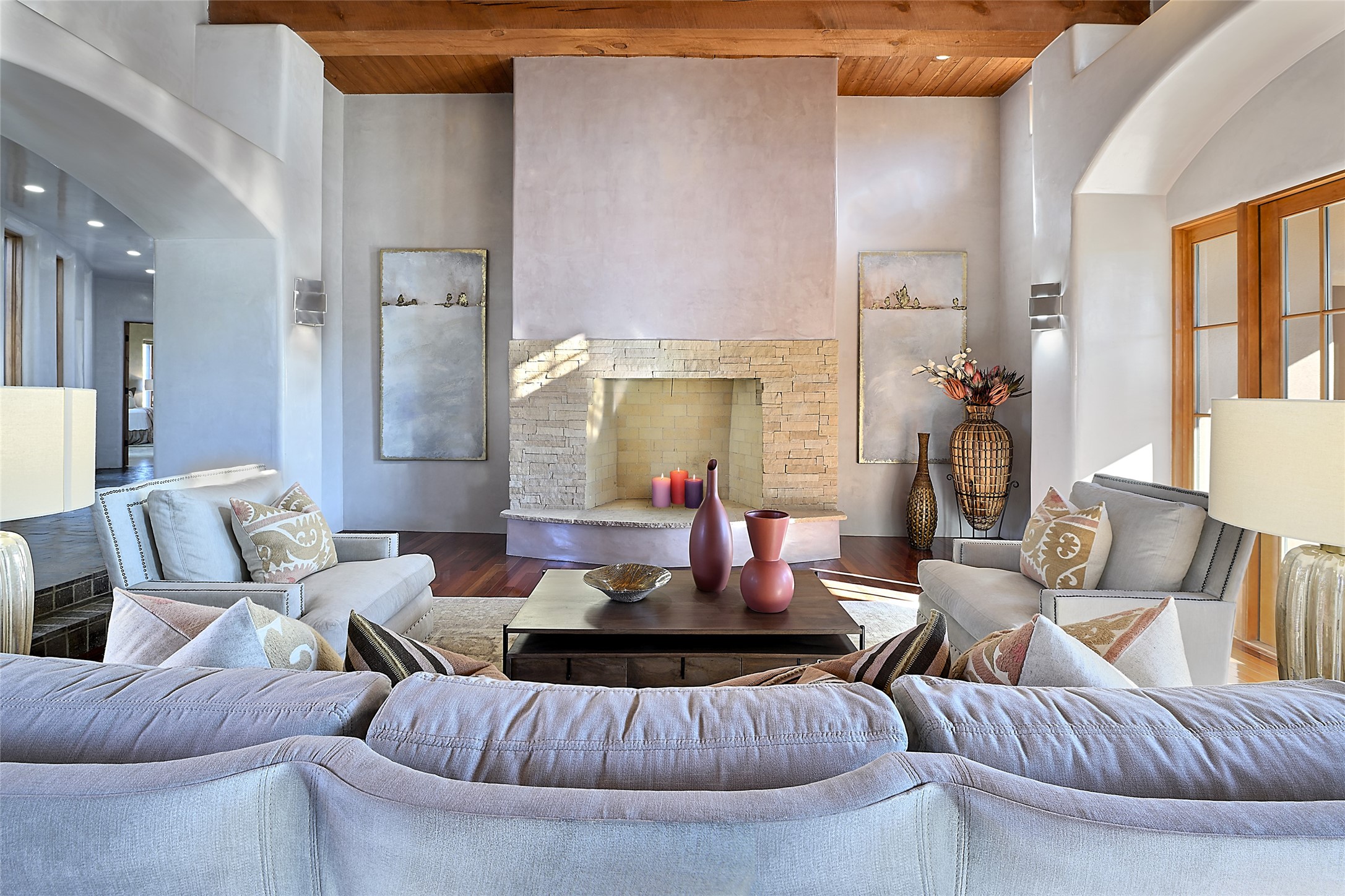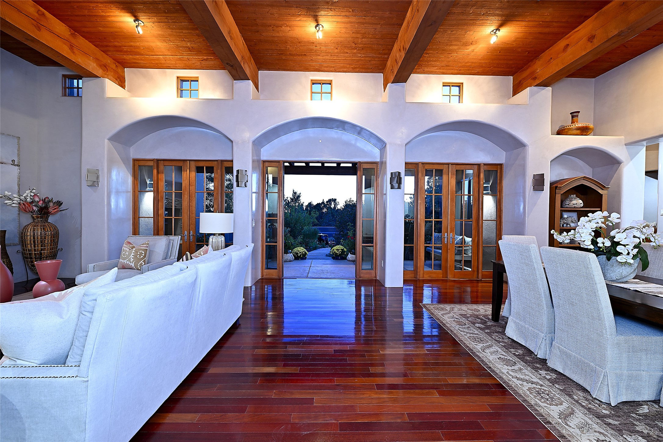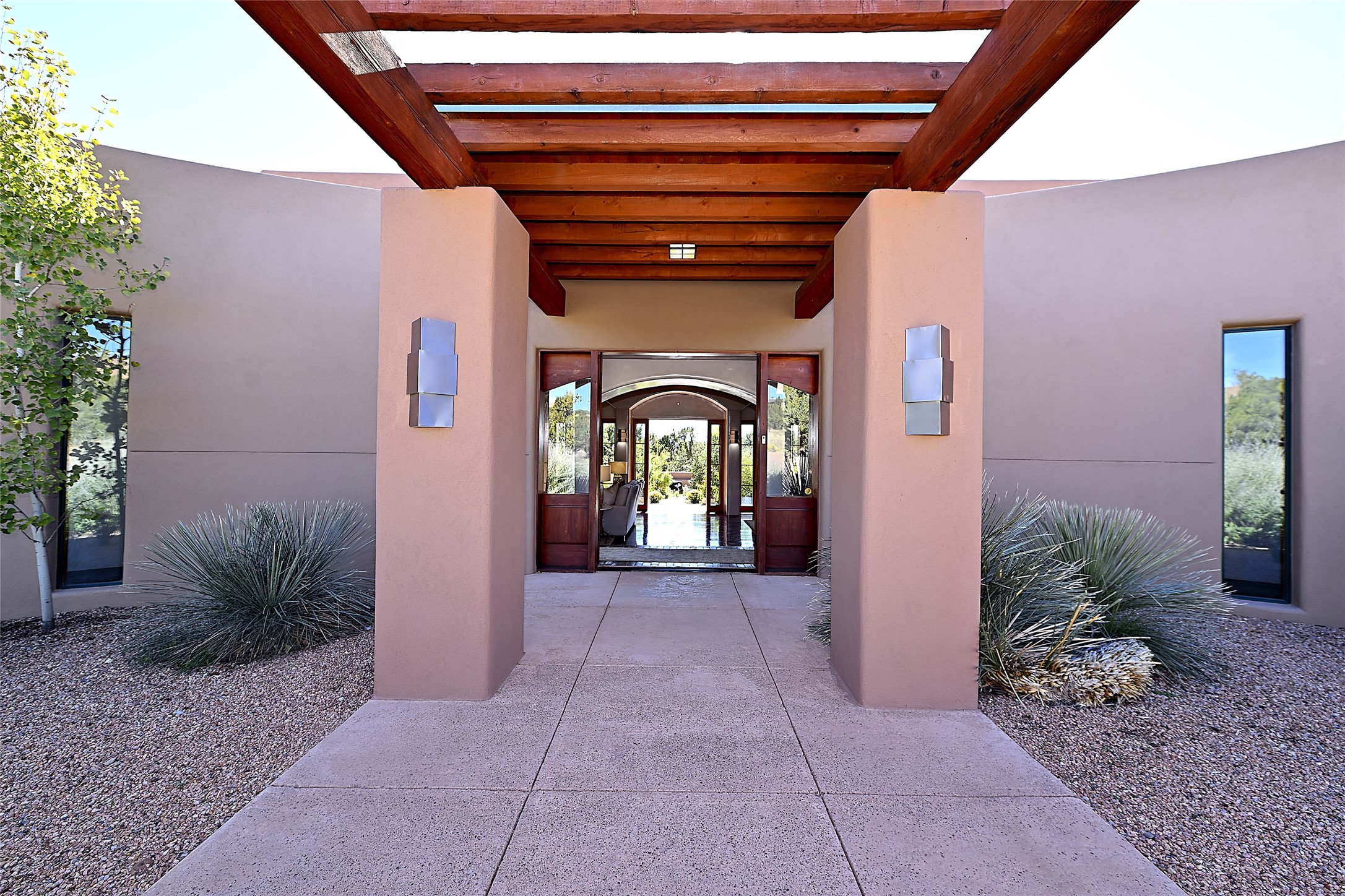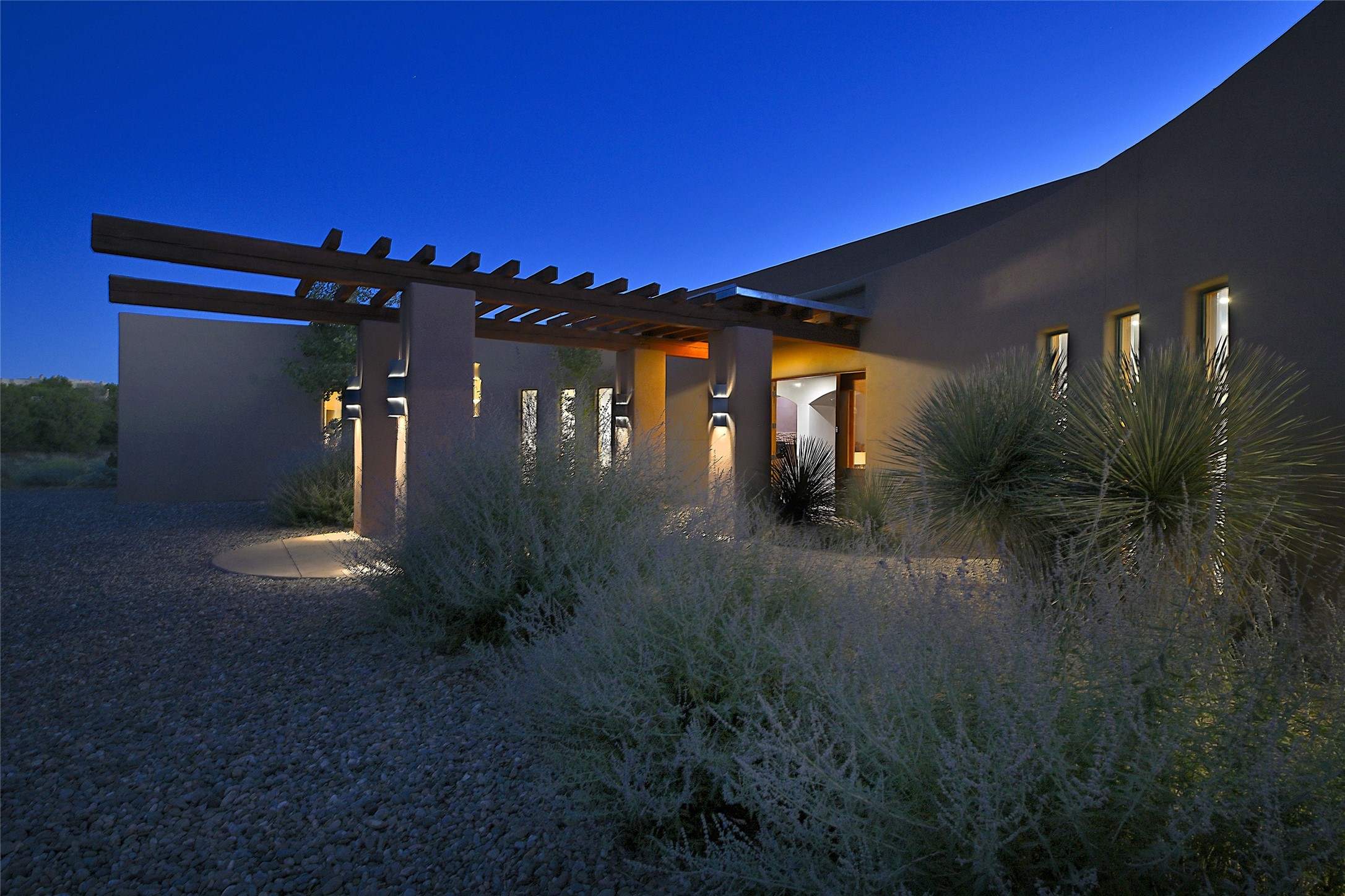 This exceptional home achieves the delicate balance between the softness of a traditional ambiance and the sleek lines of contemporary design. It welcomes residents and guests with a sense of warmth and comfort while maintaining an up-to-the-minute aesthetic. The house harmoniously fuses these two design sensibilities, ensuring that everyone who steps through its doors feels instantly at home. This thoughtfully designed home is distinguished by a great room featuring a massive fireplace that serves as a focal point. These spaces naturally flow through to incredible gardens, making it an enchanting retreat. Floor to-ceiling glass doors and windows create a continuous visual connection with nature, allowing the beauty of the outdoors to become an integral part of the living experience. To further enhance its appeal, the home is designed with three unique guest rooms, each located in separate wings for privacy. The pice de rsistance is the glorious primary suite, complete with a true walk-in shower, a soaking tub, and a custom-fitted walk-in closet. Finally, the heart of this home is the professional chef's kitchen, which opens to an adjacent informal living and eating areas, where family and friends can come together in a warm and welcoming atmosphere. Enjoy all the amenities of The Club at Las Campanas or choose to live a tranquil secluded life at home with friends and family with only a 10 minute drive to the famous galleries and restaurants of downtown Santa Fe.