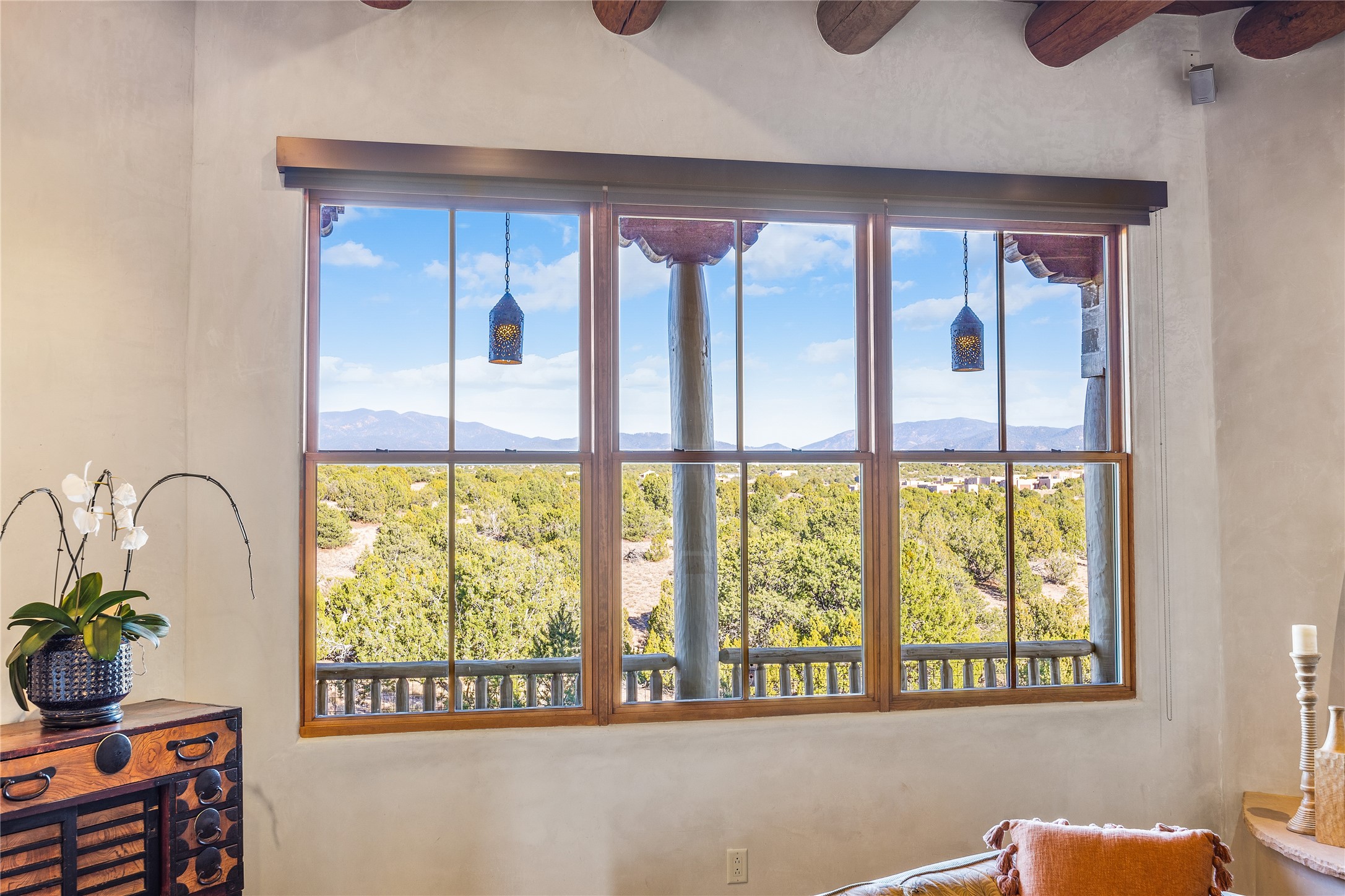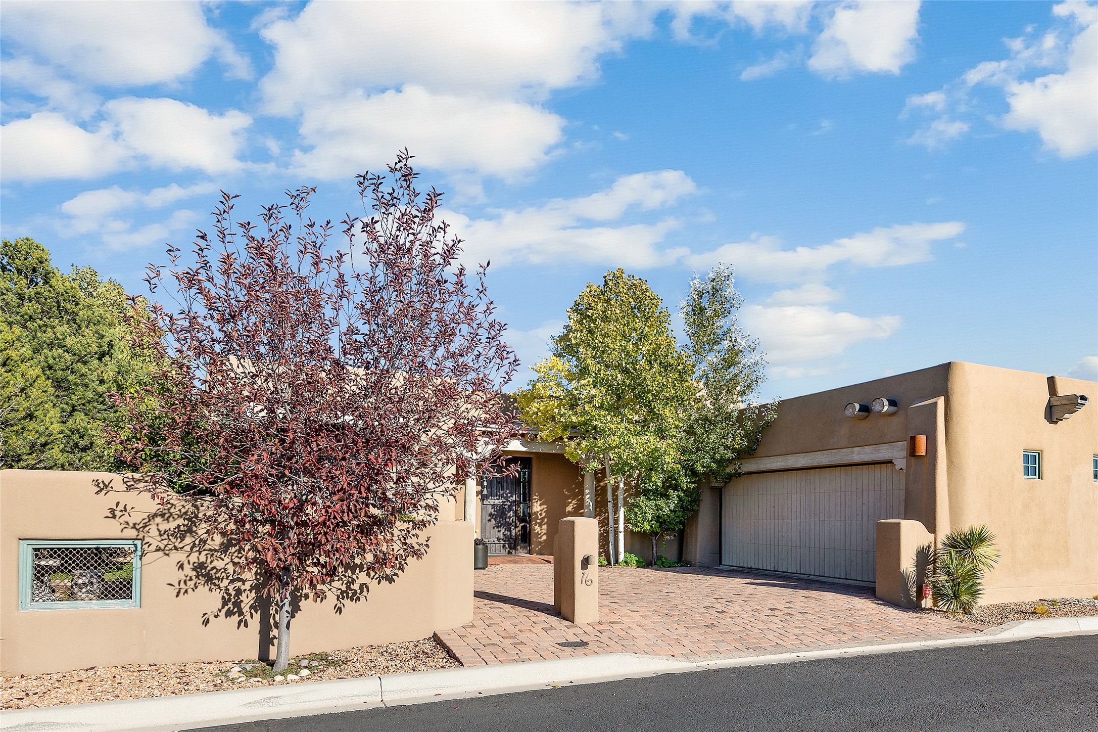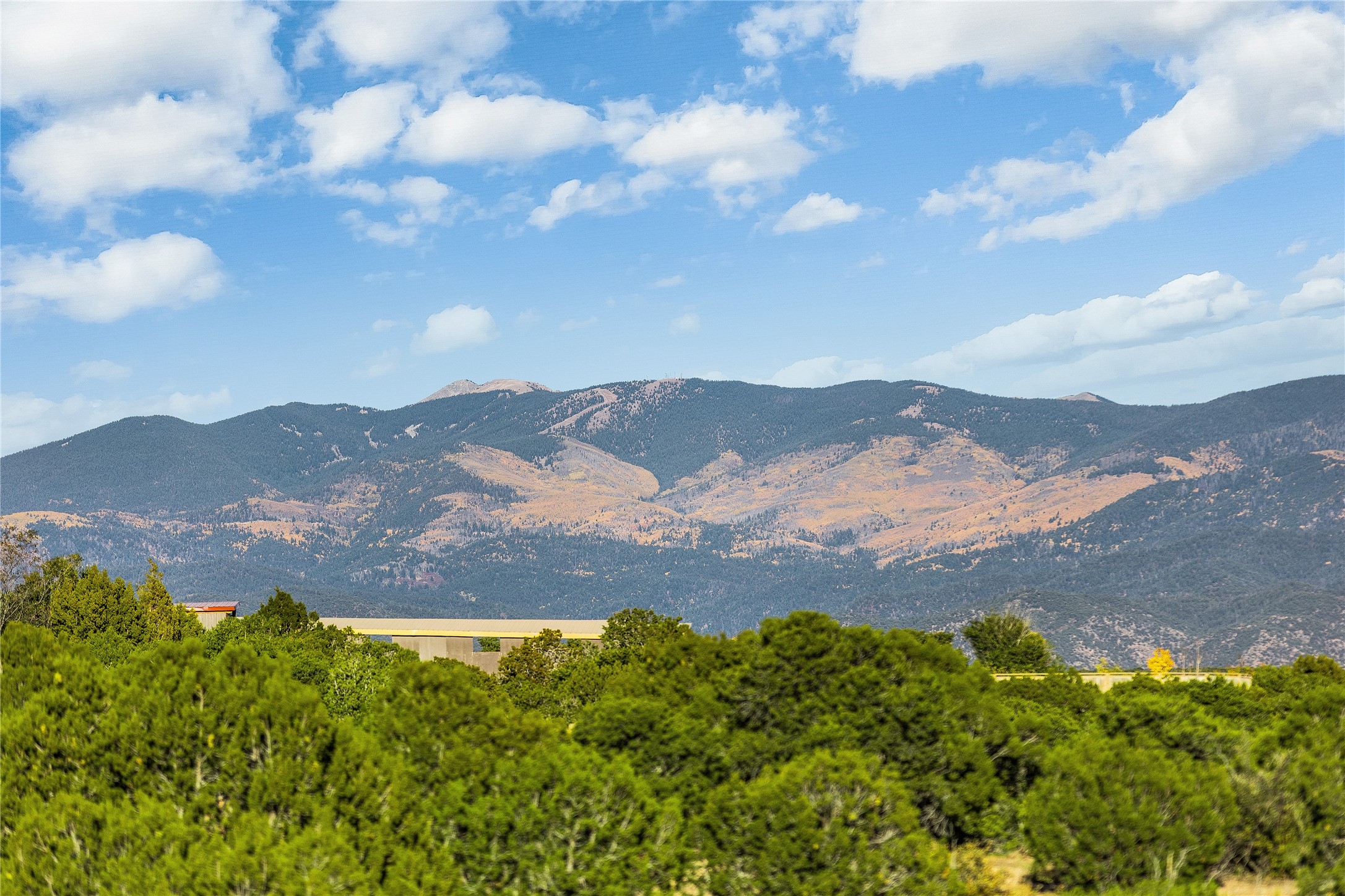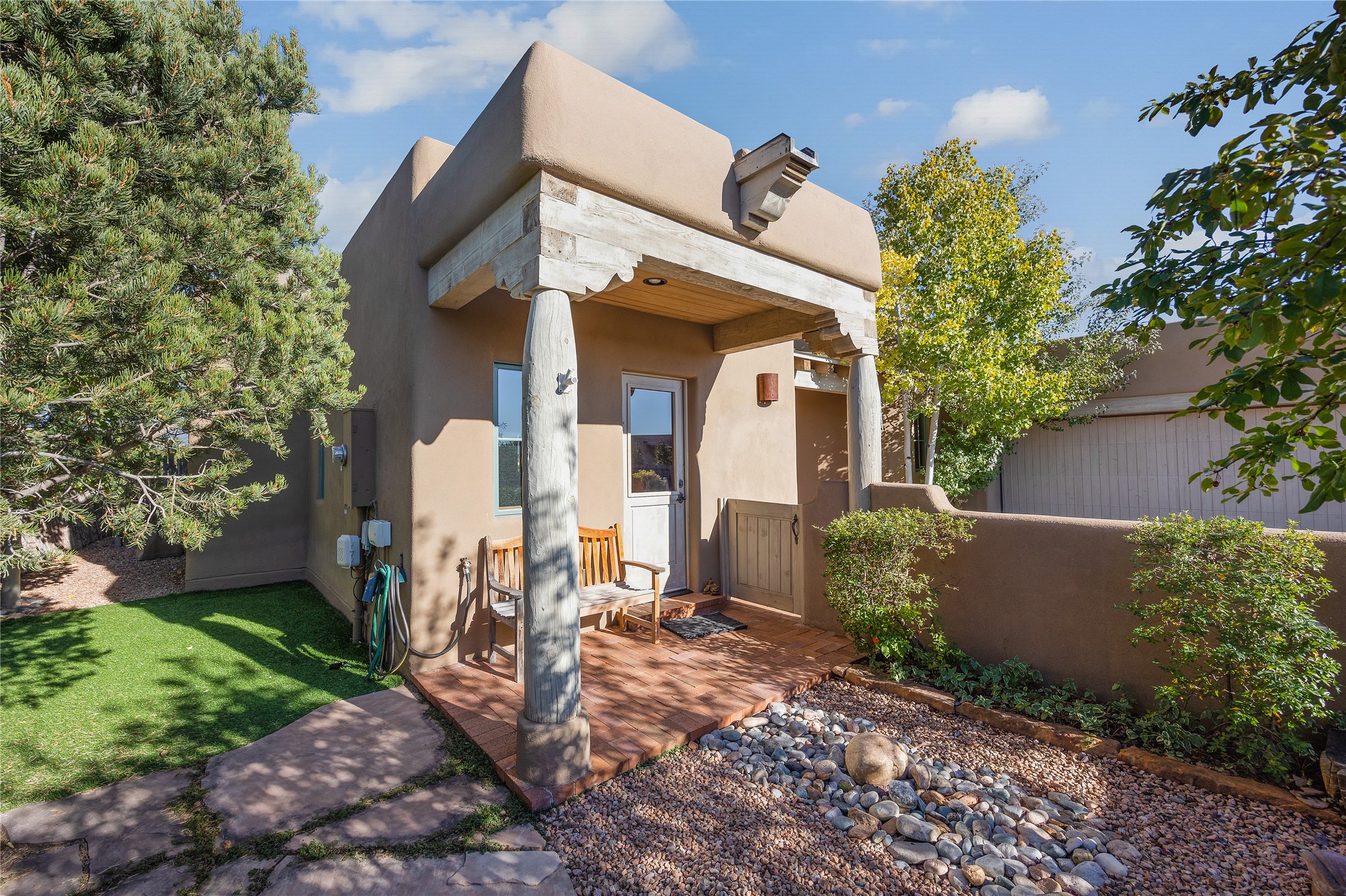 Vast views of the Sangre de Cristo Mountains are showcased throughout this single-level, one-owner, custom home. The gracious flow of the floor plan revolves around the open living spaces and provides separation between the primary and guest suites both with mountain views. The spacious & efficient kitchen enjoys warm wood cabinetry, a dedicated pantry and center island and other thoughtful details such as a raised dishwasher. Distinctive architectural finishes include arched doorways and nichos, wide hallways, plaster walls, beamed ceilings, and skylights. The primary suite includes a gas fireplace, dual vanity, walk-in shower, soaking tub, and large walk-in closet conveniently attached to the laundry room. The office/den functions as an overflow guest or third bedroom with its own private entrance and adjacent 3/4 bath. Delightful, low maintenance outdoor spaces encompass a west-facing landscaped courtyard, a view portal with a kiva fireplace, and an enclosed side yard for pets and gardening. A quiet, peaceful location within the wonderful community of Aldea offering tennis, pickle ball and basketball courts, along with miles of hiking trails through 200 acres of open space.