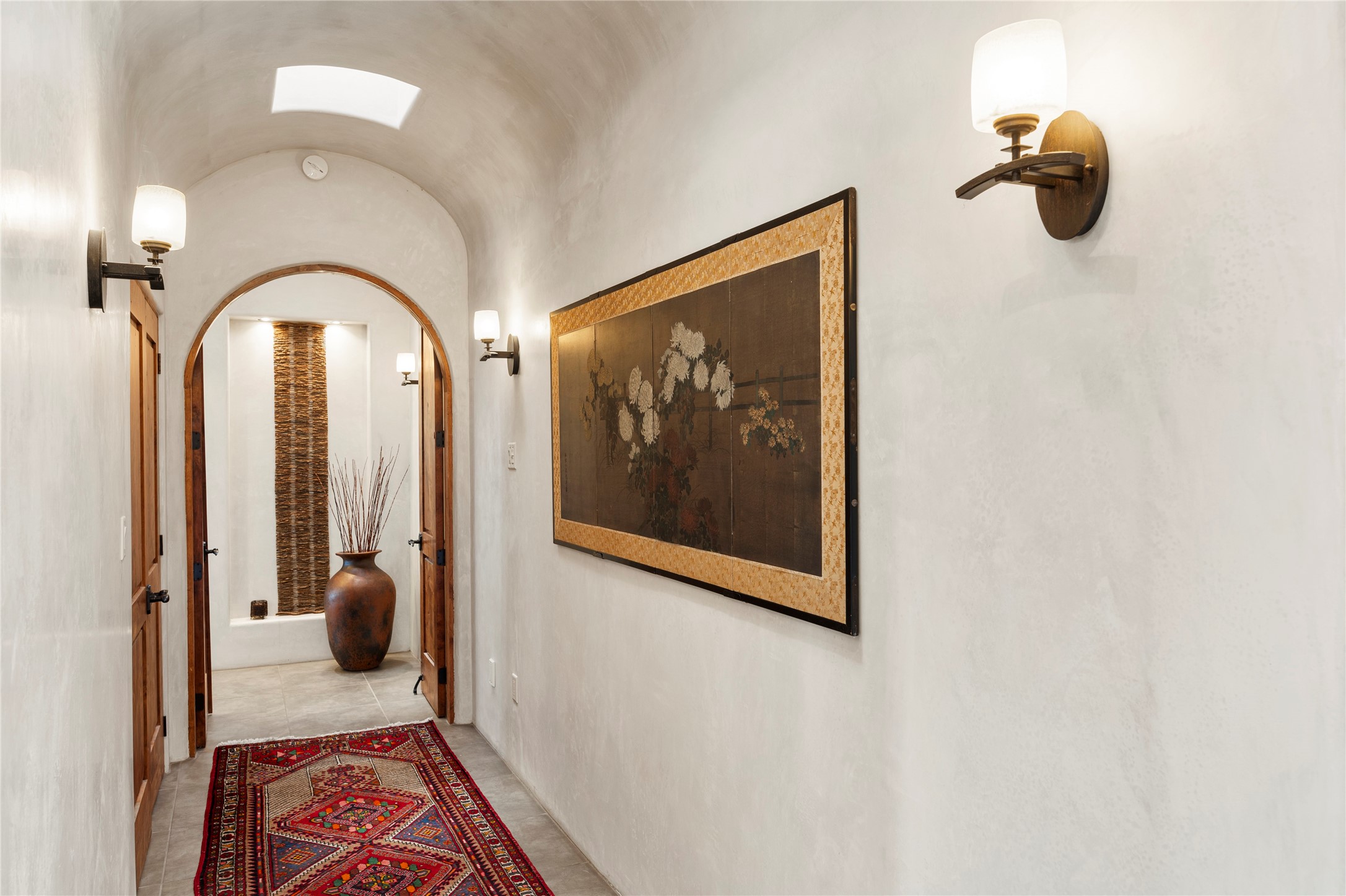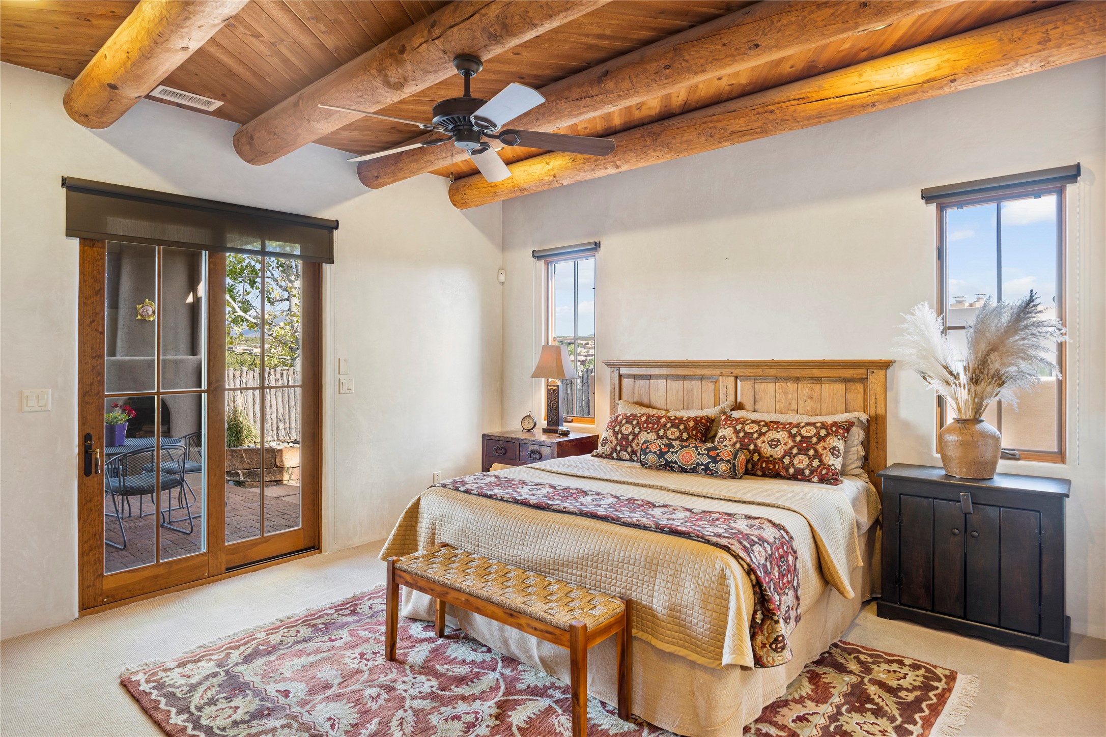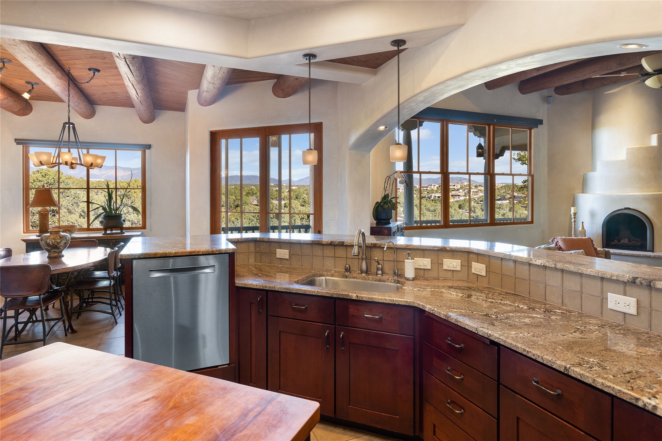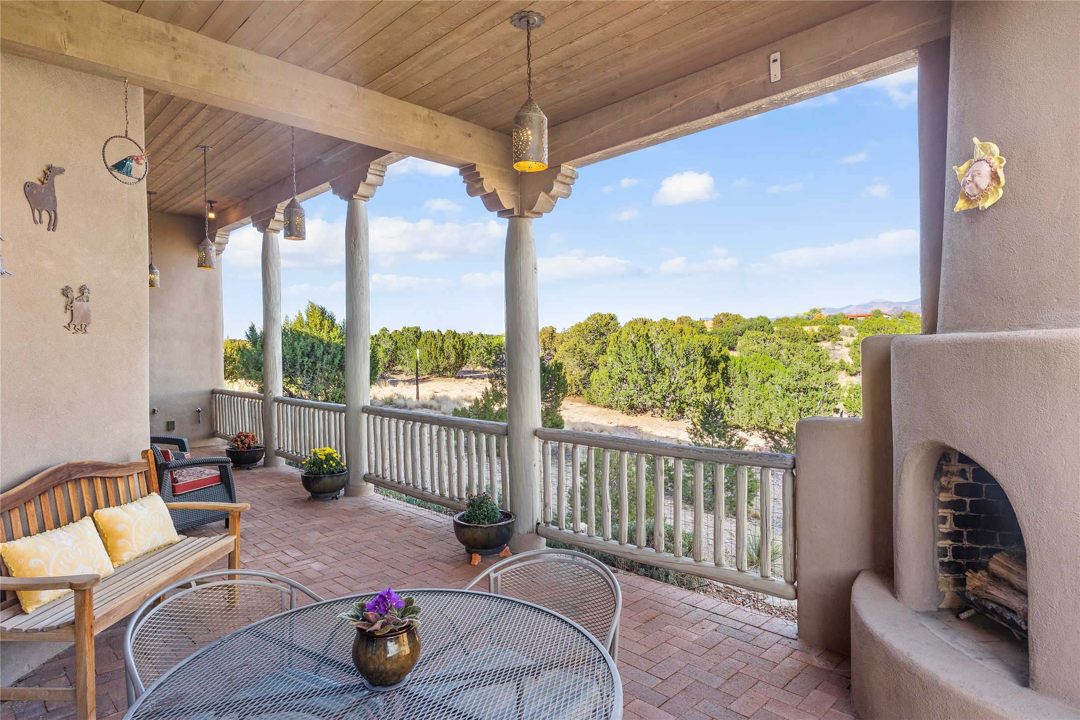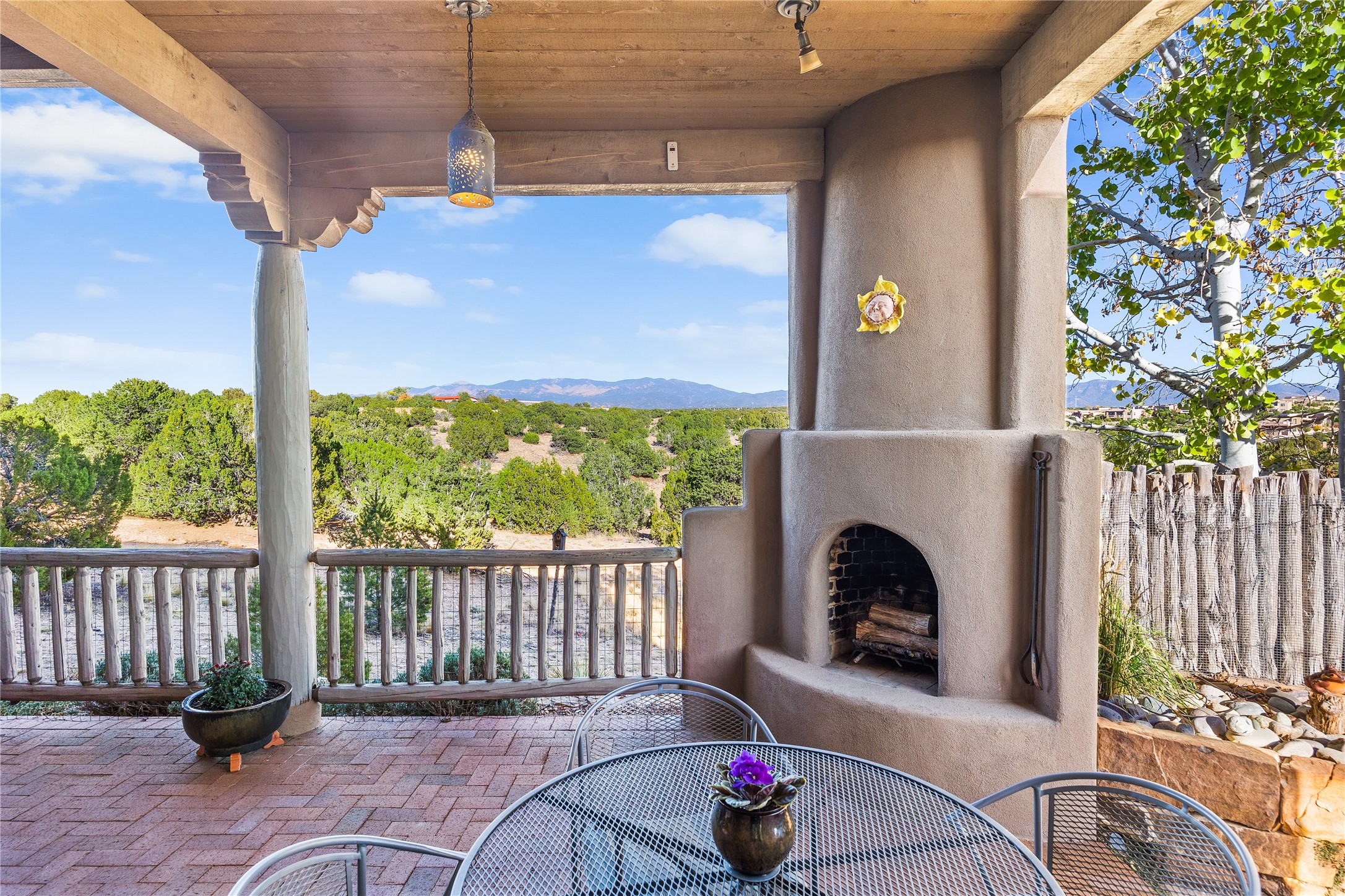 Vast views of the Sangre de Cristo Mountains are showcased throughout this single-level, one-owner, custom home. The gracious flow of the floor plan revolves around the open living spaces and provides separation between the primary and guest suites both with mountain views. The spacious & efficient kitchen enjoys warm wood cabinetry, a dedicated pantry and center island and other thoughtful details such as a raised dishwasher. Distinctive architectural finishes include arched doorways and nichos, wide hallways, plaster walls, beamed ceilings, and skylights. The primary suite includes a gas fireplace, dual vanity, walk-in shower, soaking tub, and large walk-in closet conveniently attached to the laundry room. The office/den functions as an overflow guest or third bedroom with its own private entrance and adjacent 3/4 bath. Delightful, low maintenance outdoor spaces encompass a west-facing landscaped courtyard, a view portal with a kiva fireplace, and an enclosed side yard for pets and gardening. A quiet, peaceful location within the wonderful community of Aldea offering tennis, pickle ball and basketball courts, along with miles of hiking trails through 200 acres of open space.