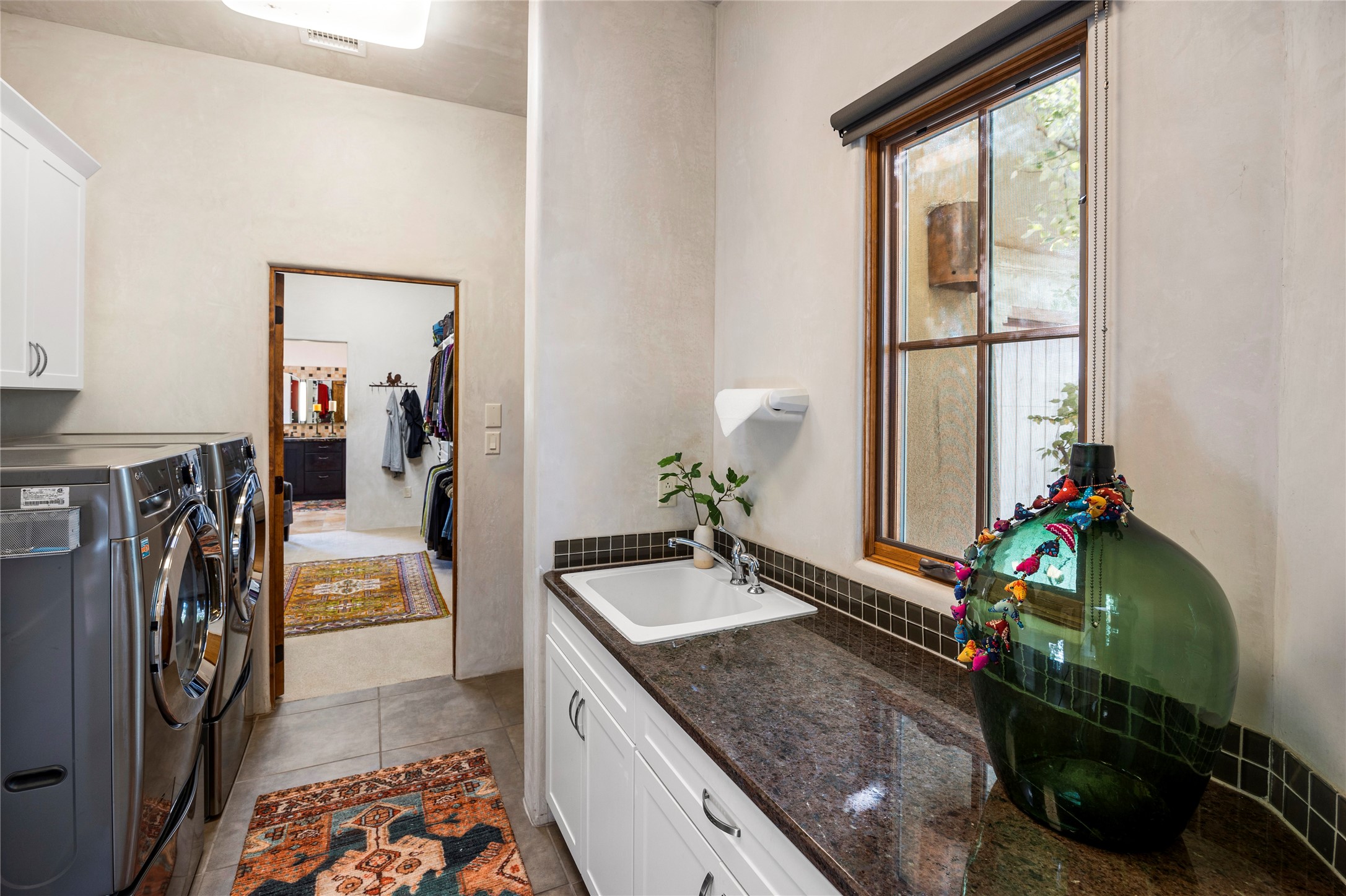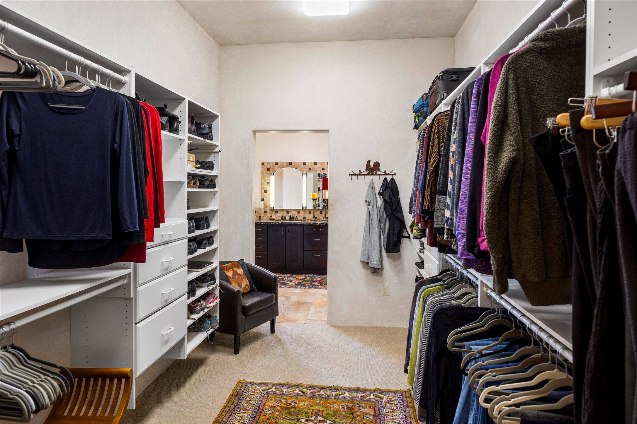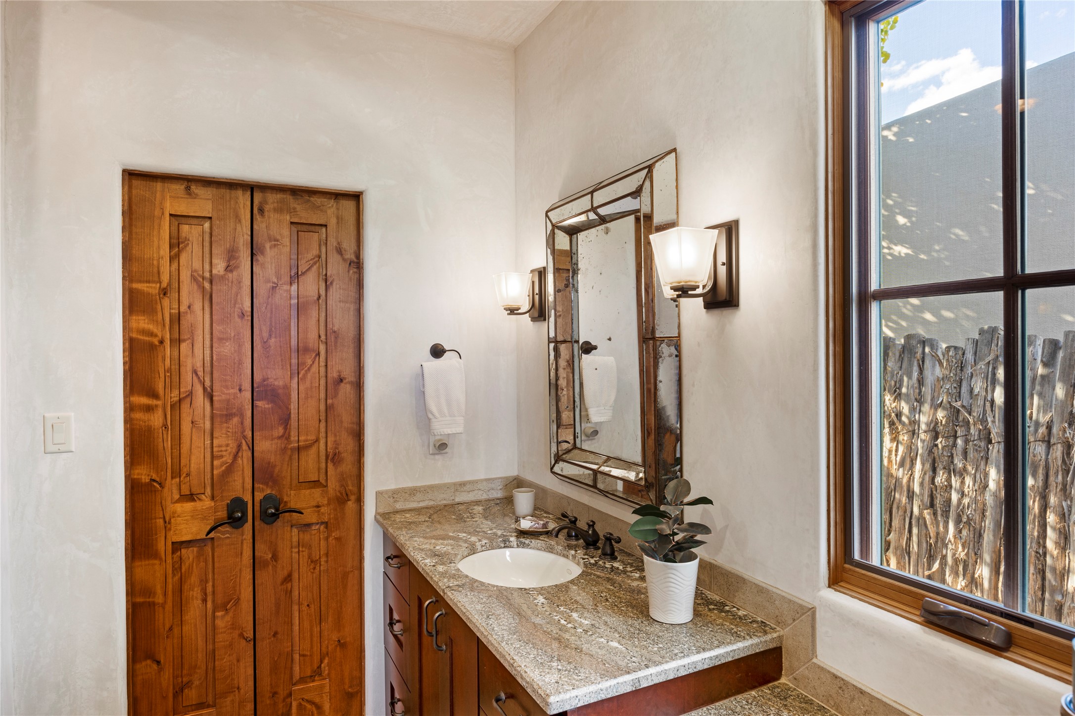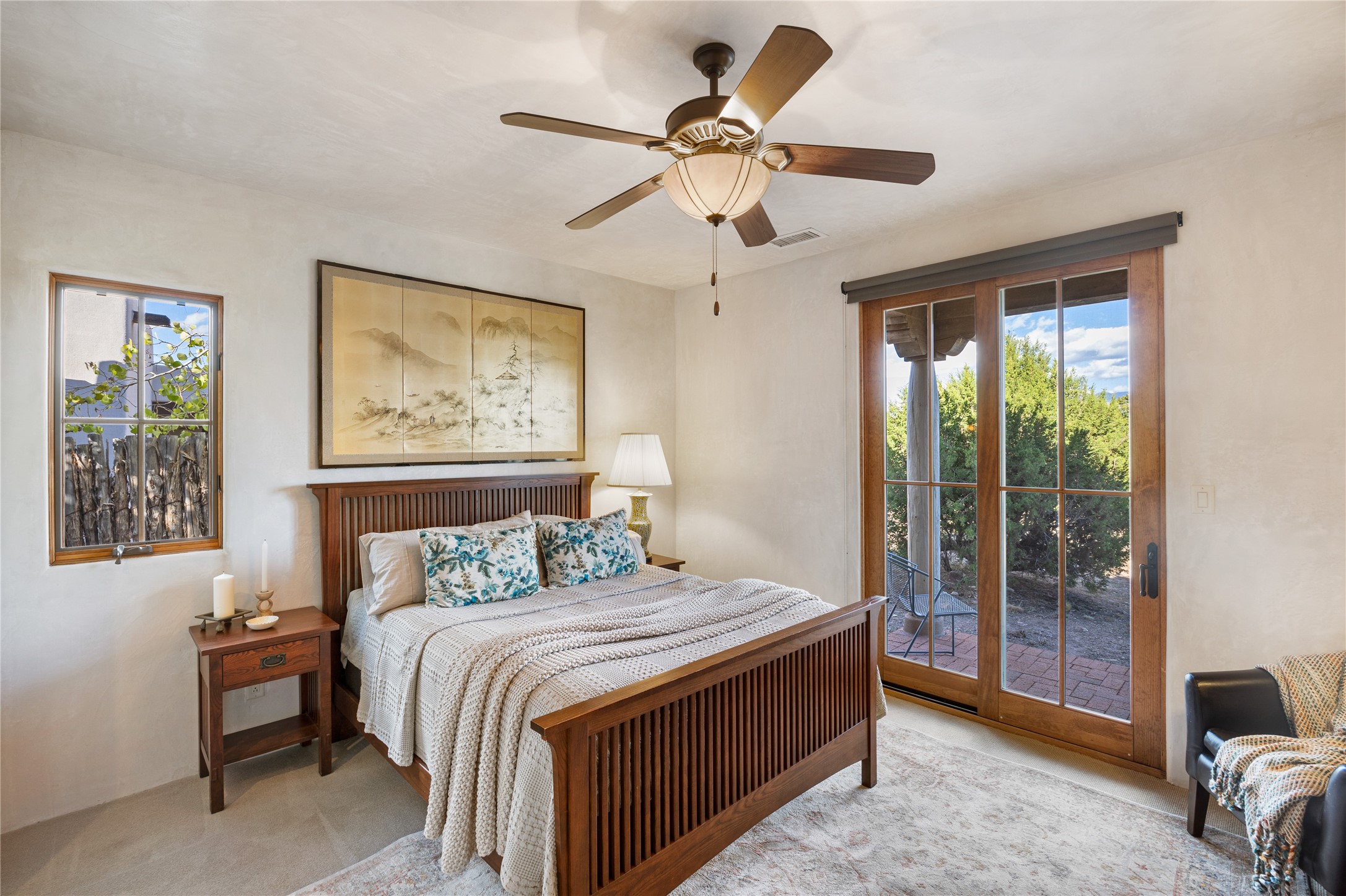 Vast views of the Sangre de Cristo Mountains are showcased throughout this single-level, one-owner, custom home. The gracious flow of the floor plan revolves around the open living spaces and provides separation between the primary and guest suites both with mountain views. The spacious & efficient kitchen enjoys warm wood cabinetry, a dedicated pantry and center island and other thoughtful details such as a raised dishwasher. Distinctive architectural finishes include arched doorways and nichos, wide hallways, plaster walls, beamed ceilings, and skylights. The primary suite includes a gas fireplace, dual vanity, walk-in shower, soaking tub, and large walk-in closet conveniently attached to the laundry room. The office/den functions as an overflow guest or third bedroom with its own private entrance and adjacent 3/4 bath. Delightful, low maintenance outdoor spaces encompass a west-facing landscaped courtyard, a view portal with a kiva fireplace, and an enclosed side yard for pets and gardening. A quiet, peaceful location within the wonderful community of Aldea offering tennis, pickle ball and basketball courts, along with miles of hiking trails through 200 acres of open space.