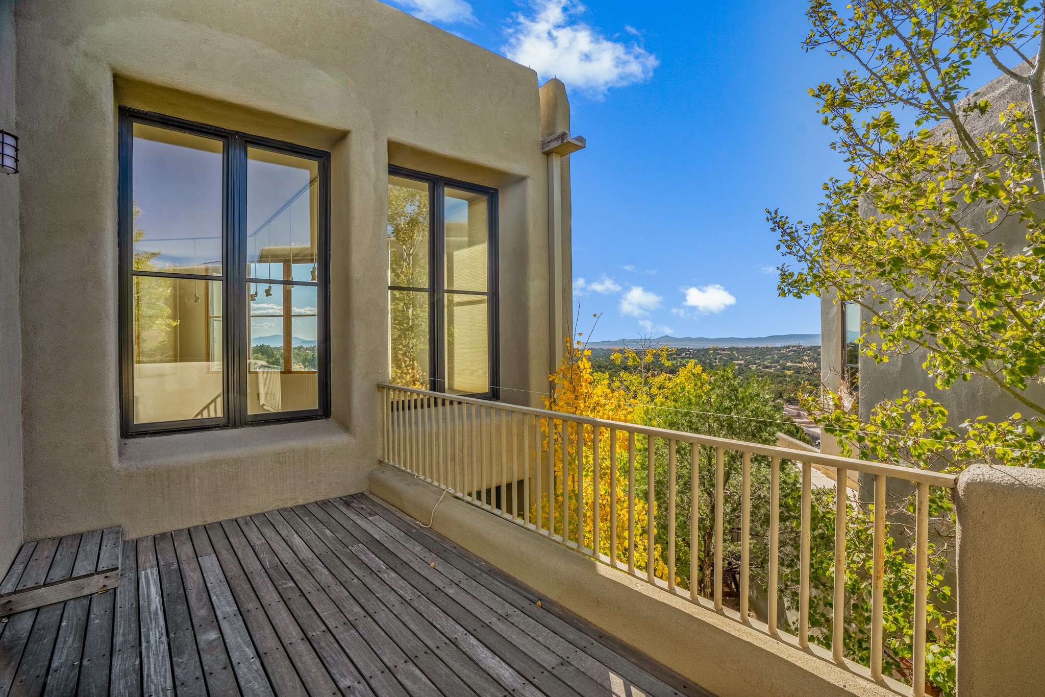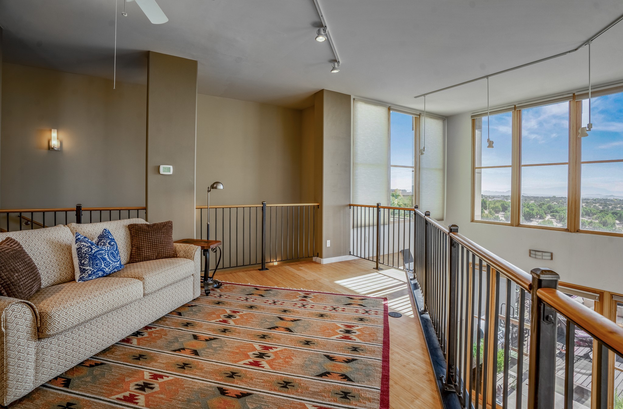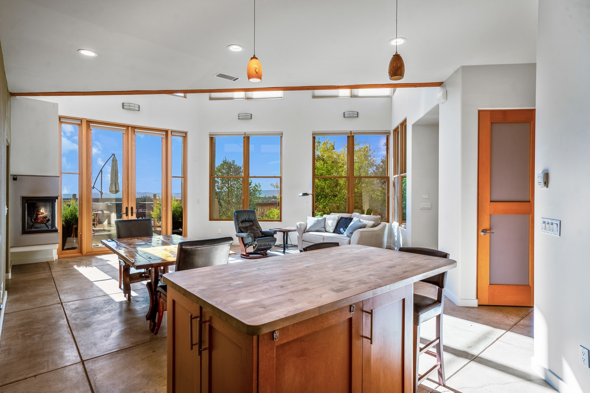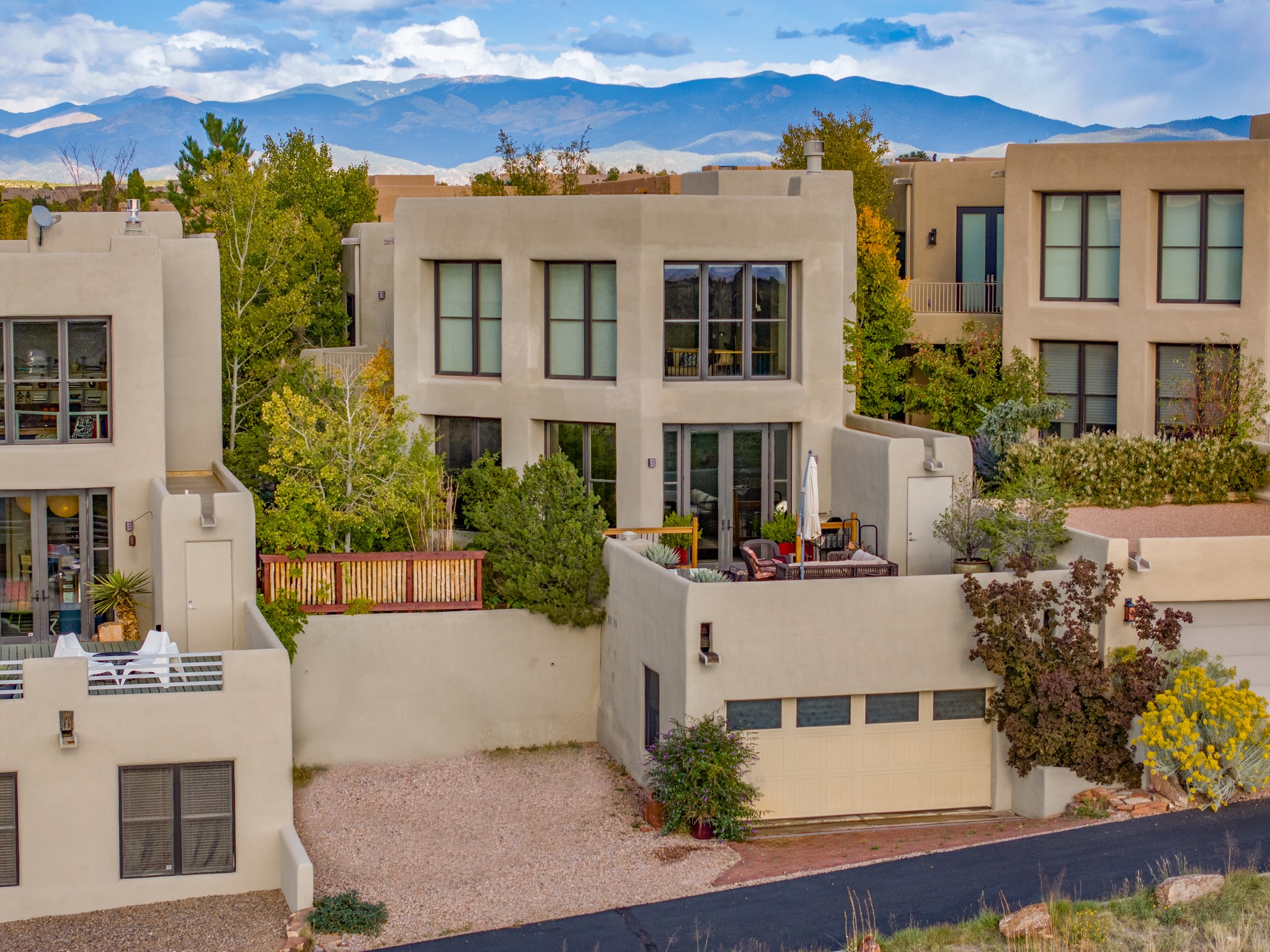 Located within the serene and picturesque community of Aldea De Santa Fe. This captivating residence offers unobstructed sunset views. The open-concept living space boasts soaring 20-foot ceilings, captivating the very best of a contemporary design. Earthy yet modern finishes throughout. Including, stone, bamboo and concrete floors and a gas burning fireplace. There are custom wood cabinets in the bathrooms that resemble a basket weave and floor to ceiling tile in the showers. The abundance of windows that allows for the New Mexico sun to pour in, creating a warm and inviting atmosphere. The living area is adjacent dining area and perfectly sized kitchen with Wolf range provide the perfect setting for culinary adventures. There is a Primary bedroom suite on the main floor with bamboo floors and a tasteful en-suite bathroom. The upstairs bedroom is generously sized with an en-suite bathroom and a loft area for relaxing and taking in Santa Fe's amazing desert views. In addition to the stylish interior, the home also offers outdoor spaces that are equally inviting. Enter from the street onto a private enclosed courtyard and you can enjoy entertaining on the deck off of the living room with those in your face views. The 2-car garage offers convenience and storage space, while the radiant heating and central air conditioning ensure year-round comfort. Aldea De Santa Fe offers a community center, parks, 13 miles of walking trails, and a strong sense of community. Enjoy the best of both worlds, with easy access to Santa Fe's vibrant cultural scene, shopping, dining, and outdoor recreation. Experience the harmony of modern living in a Southwestern setting. Don't miss the opportunity to make 87 Avenida Frijoles your new Santa Fe retreat.