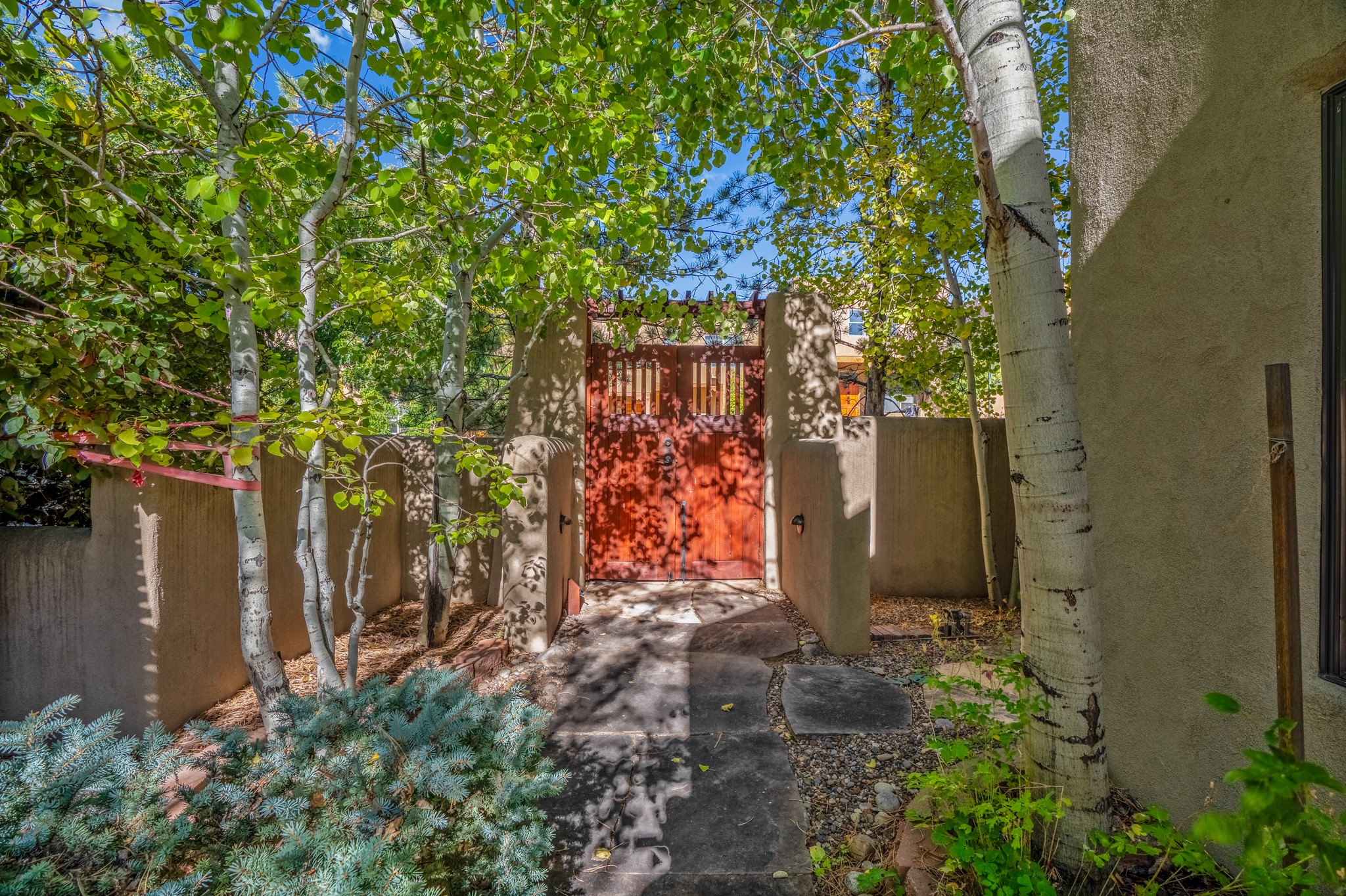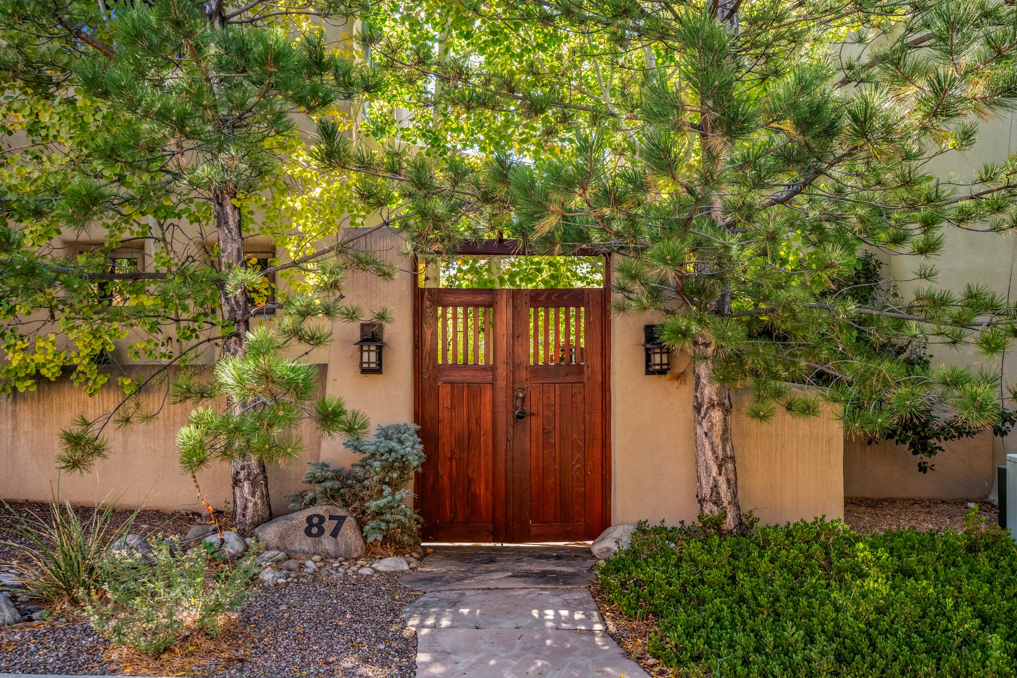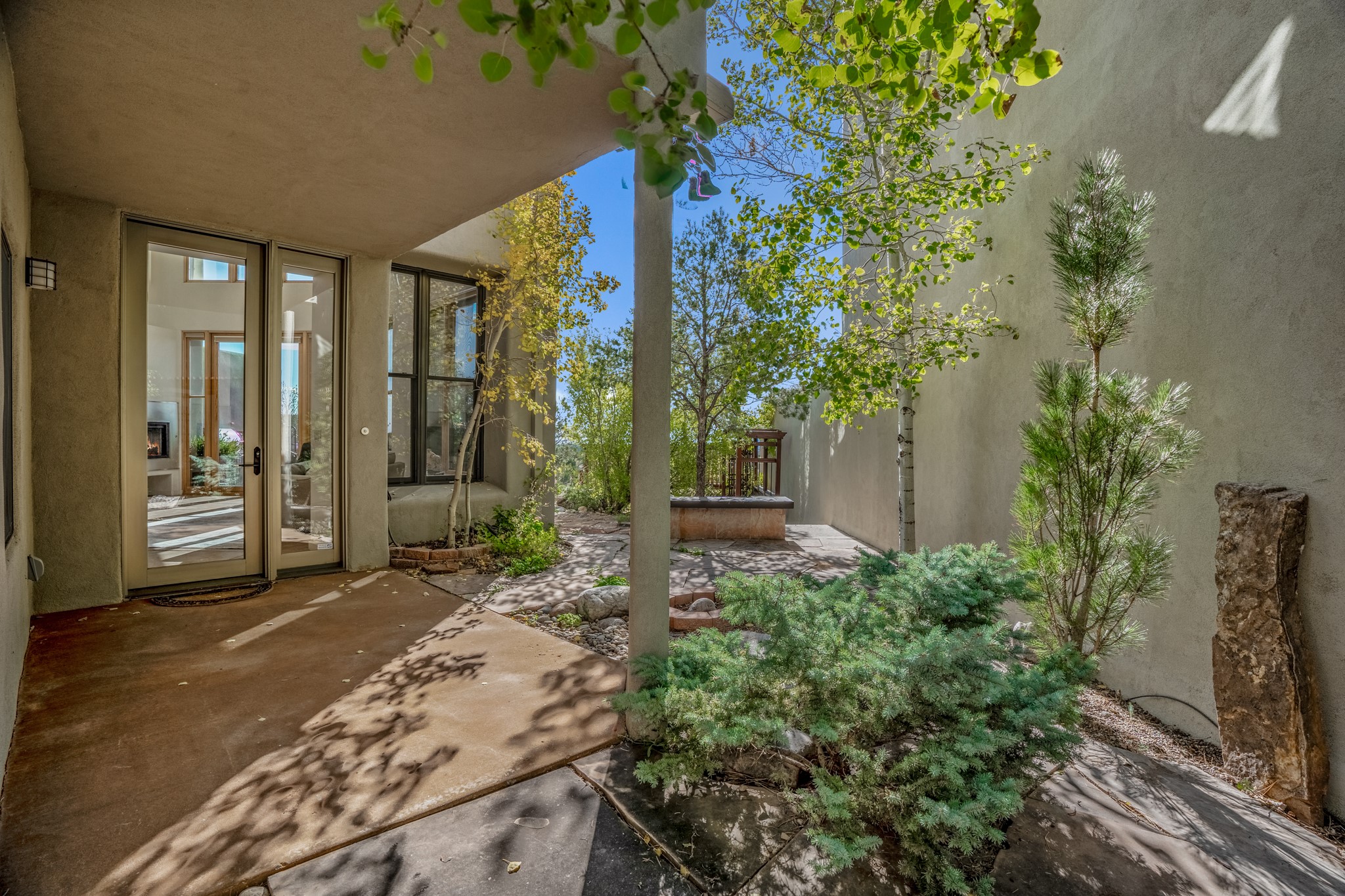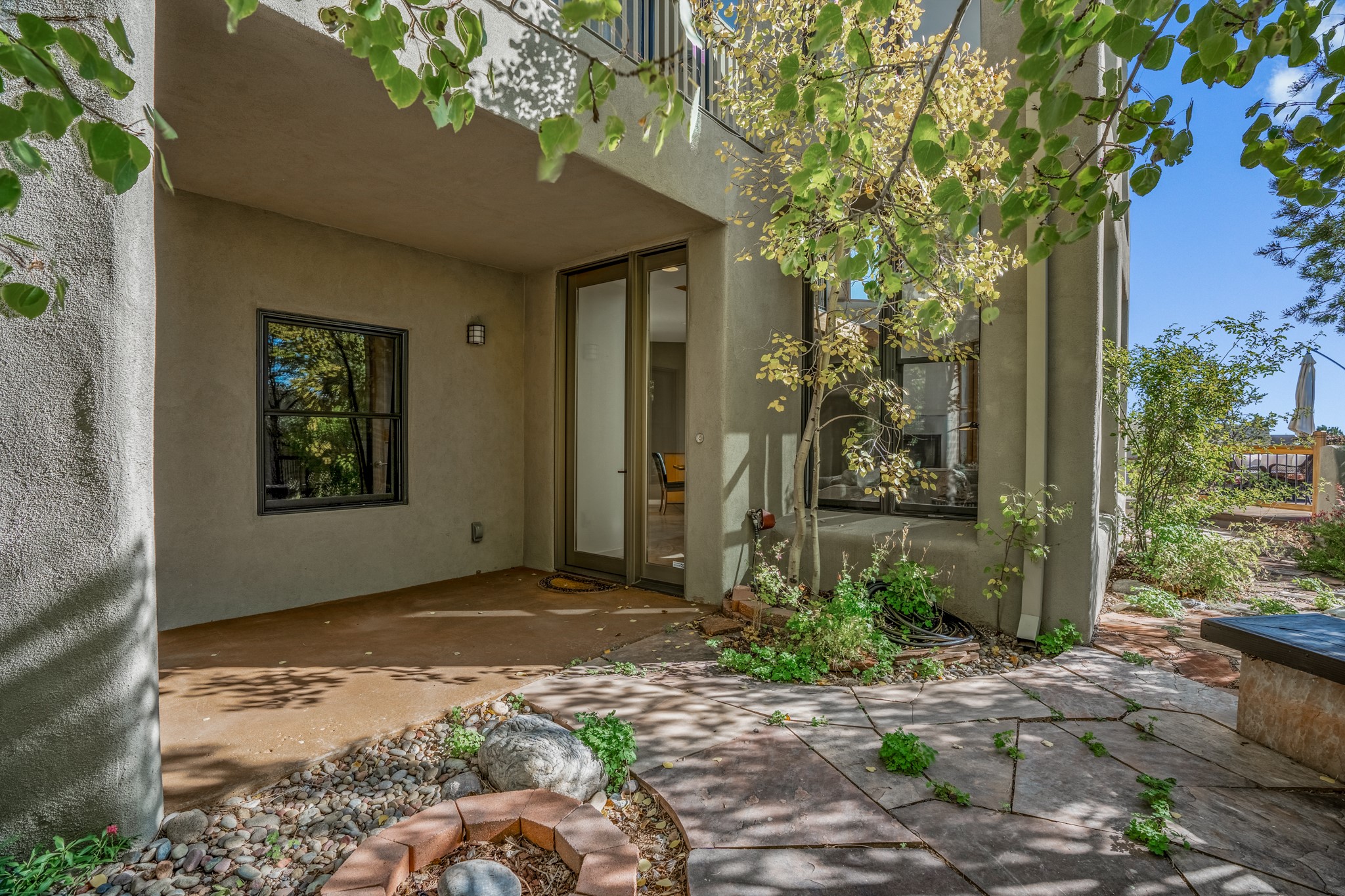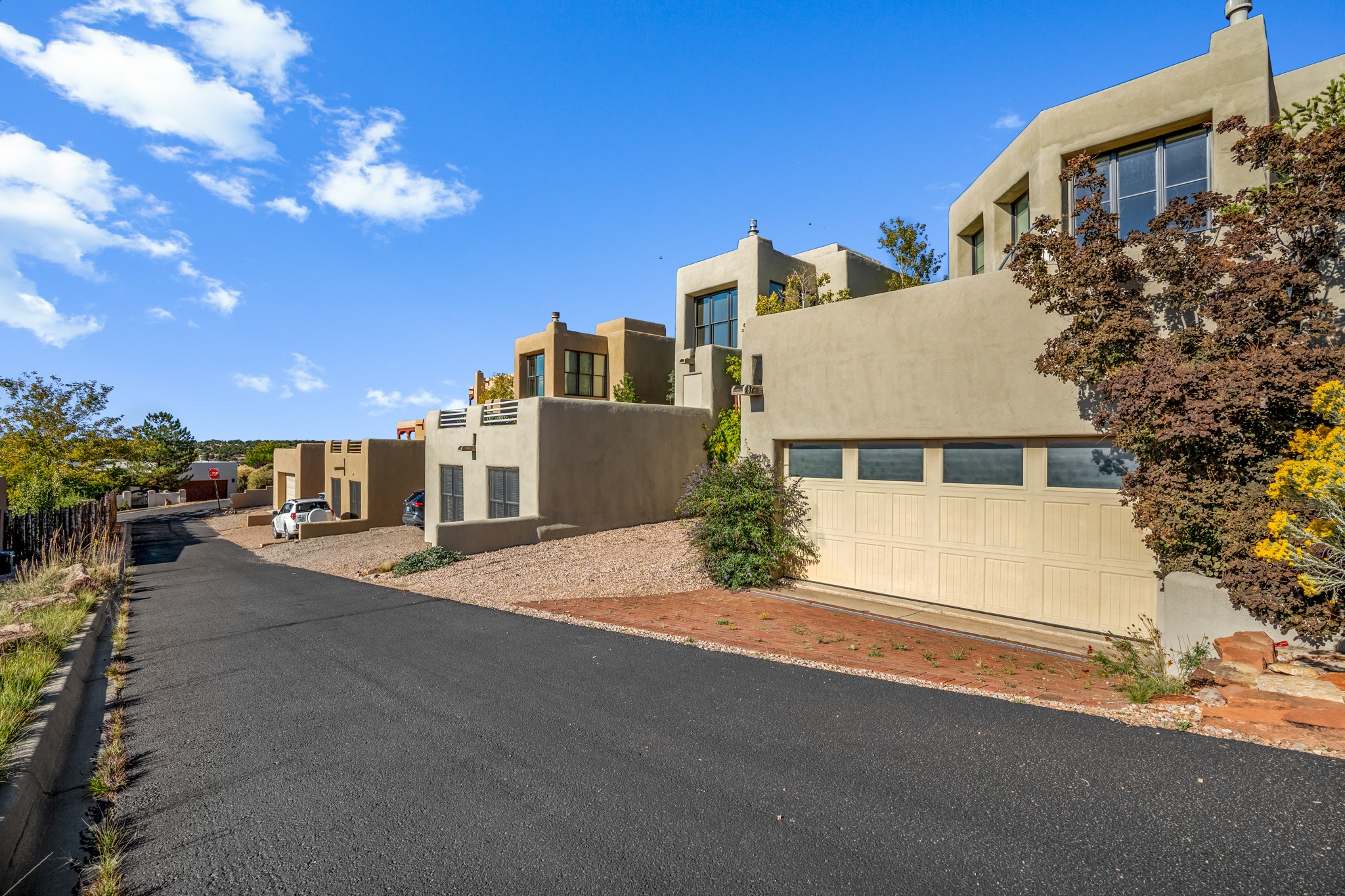 Located within the serene and picturesque community of Aldea De Santa Fe. This captivating residence offers unobstructed sunset views. The open-concept living space boasts soaring 20-foot ceilings, captivating the very best of a contemporary design. Earthy yet modern finishes throughout. Including, stone, bamboo and concrete floors and a gas burning fireplace. There are custom wood cabinets in the bathrooms that resemble a basket weave and floor to ceiling tile in the showers. The abundance of windows that allows for the New Mexico sun to pour in, creating a warm and inviting atmosphere. The living area is adjacent dining area and perfectly sized kitchen with Wolf range provide the perfect setting for culinary adventures. There is a Primary bedroom suite on the main floor with bamboo floors and a tasteful en-suite bathroom. The upstairs bedroom is generously sized with an en-suite bathroom and a loft area for relaxing and taking in Santa Fe's amazing desert views. In addition to the stylish interior, the home also offers outdoor spaces that are equally inviting. Enter from the street onto a private enclosed courtyard and you can enjoy entertaining on the deck off of the living room with those in your face views. The 2-car garage offers convenience and storage space, while the radiant heating and central air conditioning ensure year-round comfort. Aldea De Santa Fe offers a community center, parks, 13 miles of walking trails, and a strong sense of community. Enjoy the best of both worlds, with easy access to Santa Fe's vibrant cultural scene, shopping, dining, and outdoor recreation. Experience the harmony of modern living in a Southwestern setting. Don't miss the opportunity to make 87 Avenida Frijoles your new Santa Fe retreat.